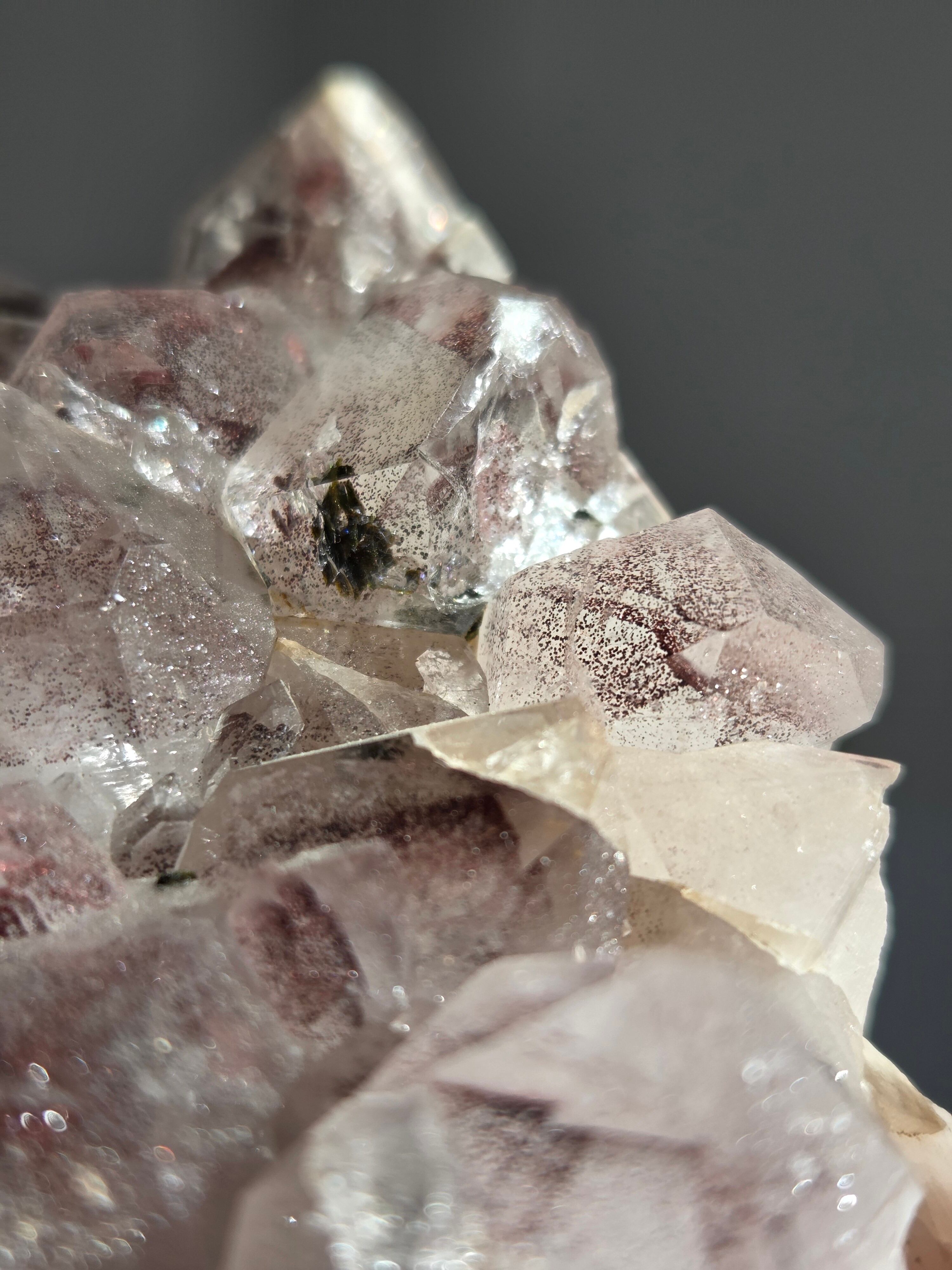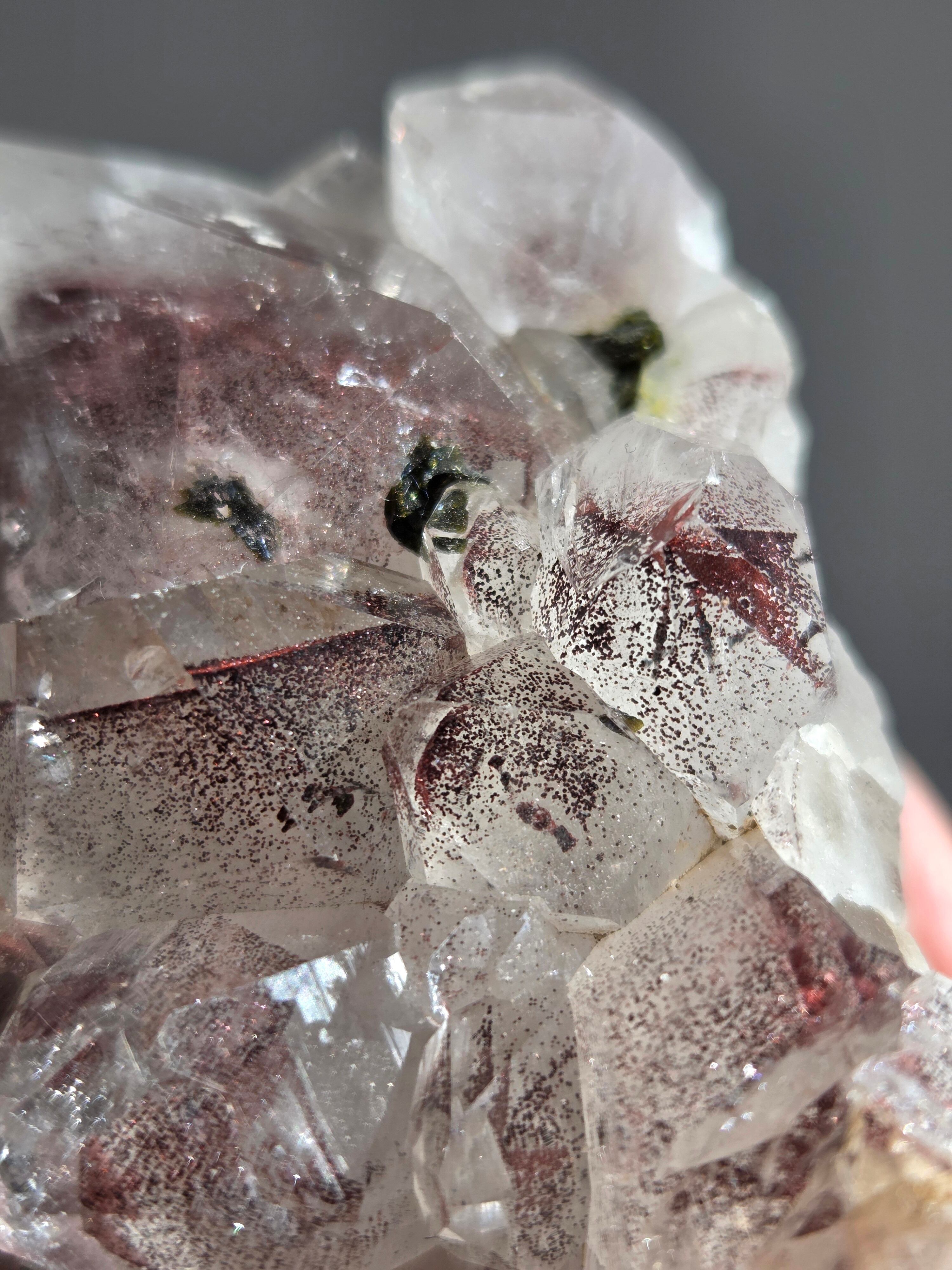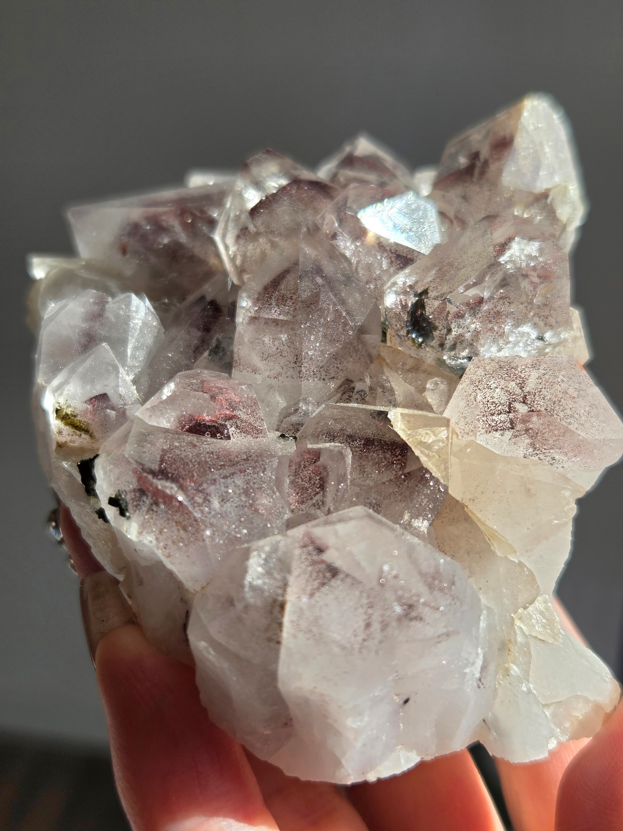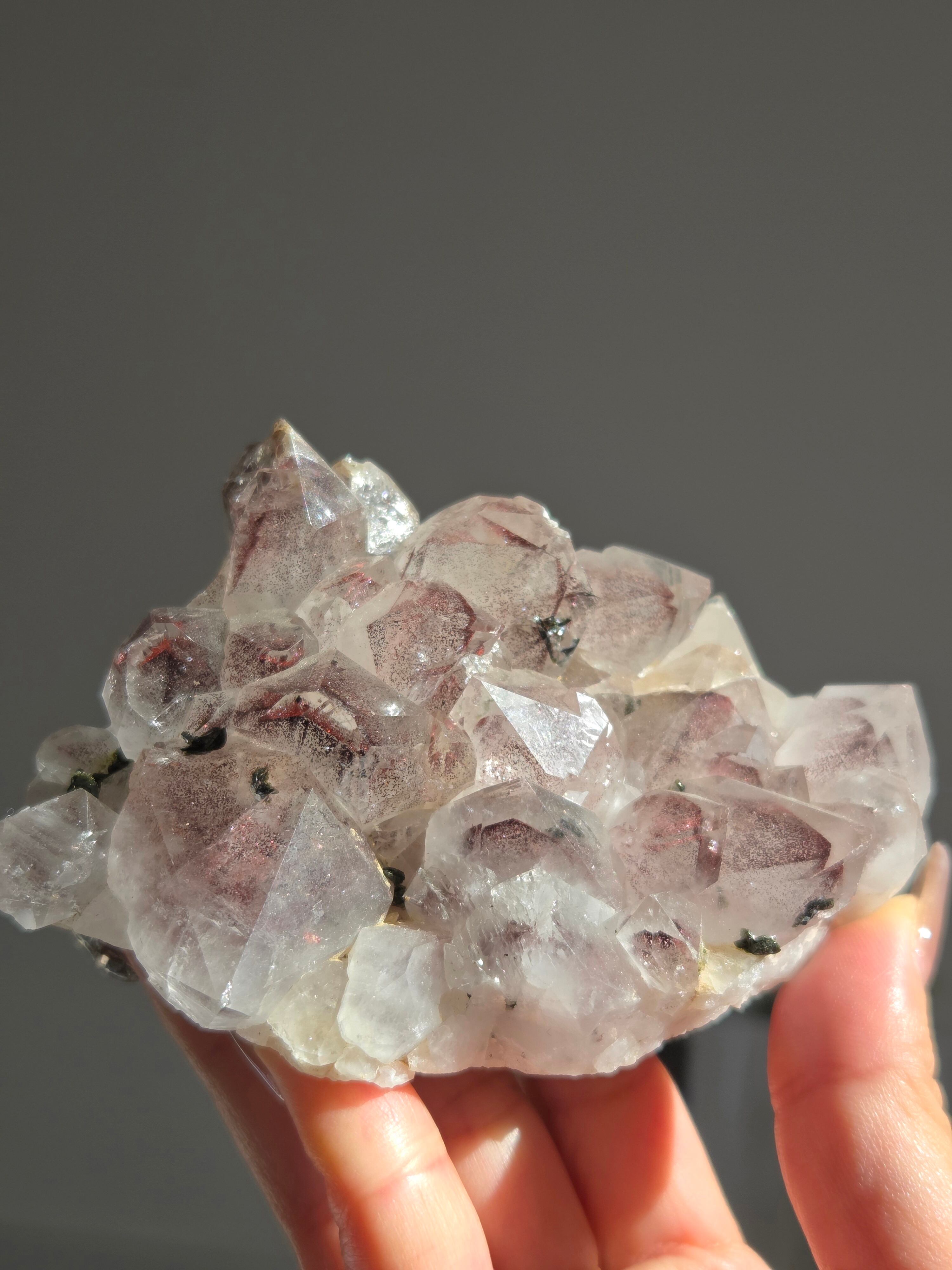 「レッドファントムクォーツ」とは、水晶の成長過程でヘマタイト(赤鉄鉱)が覆い被さり、その後再成長することで水晶と水晶の間に “山の形に閉じ込められ形成” された幻想的で希少な天然石です。