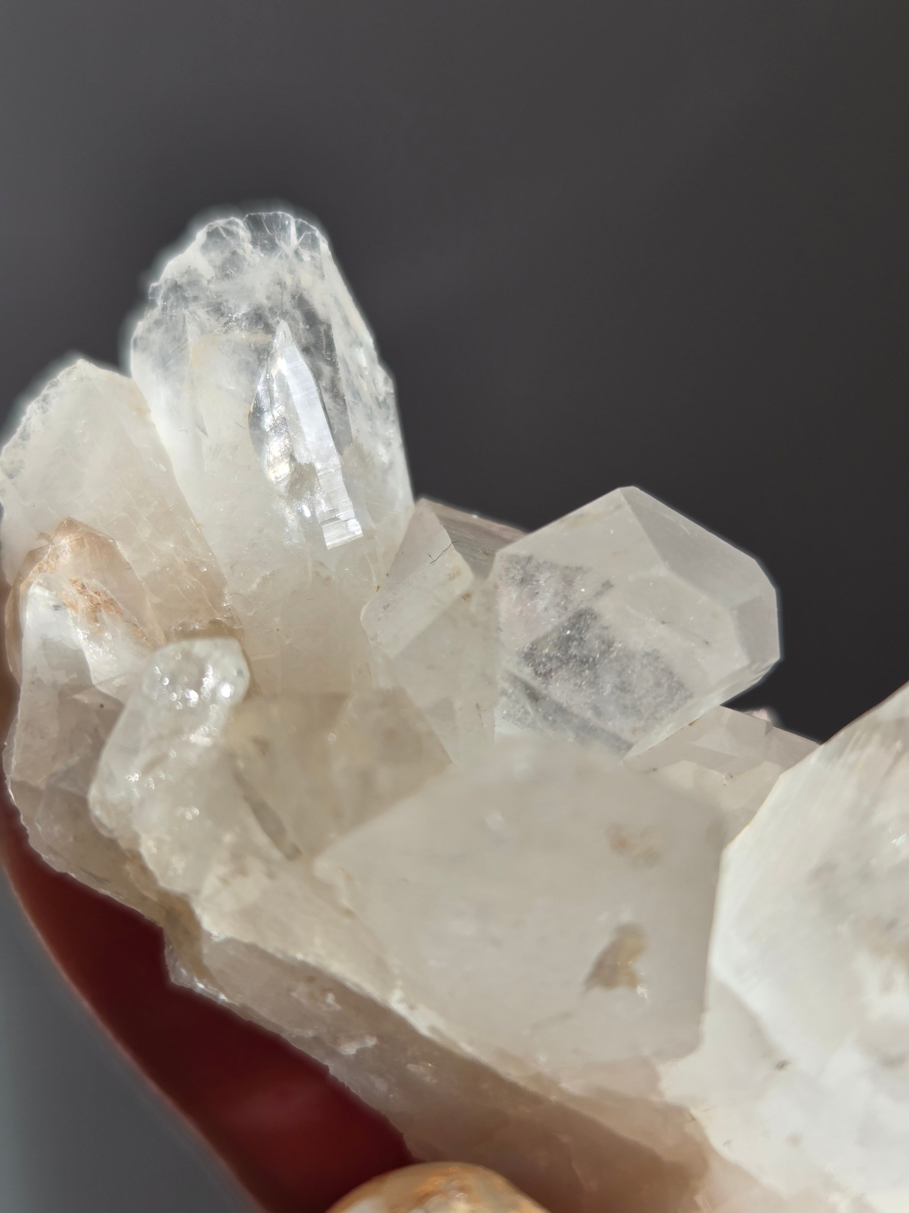 透明度高い大小異なる結晶が育つ繊細な水晶クラスター。母岩表層から水晶内部を通してオレンジ色に彩られたディテールが、光に反射してキラキラと輝き出します。