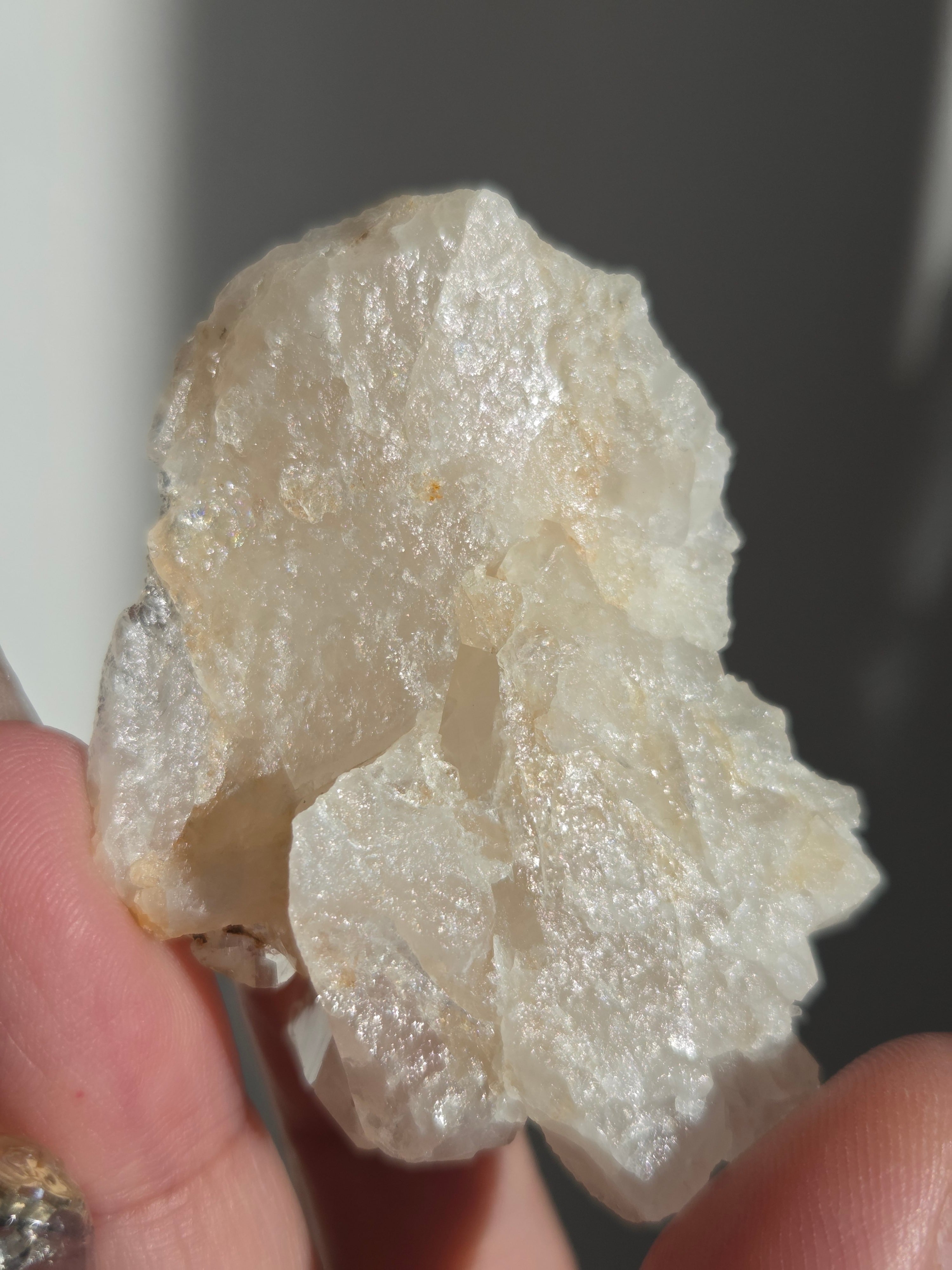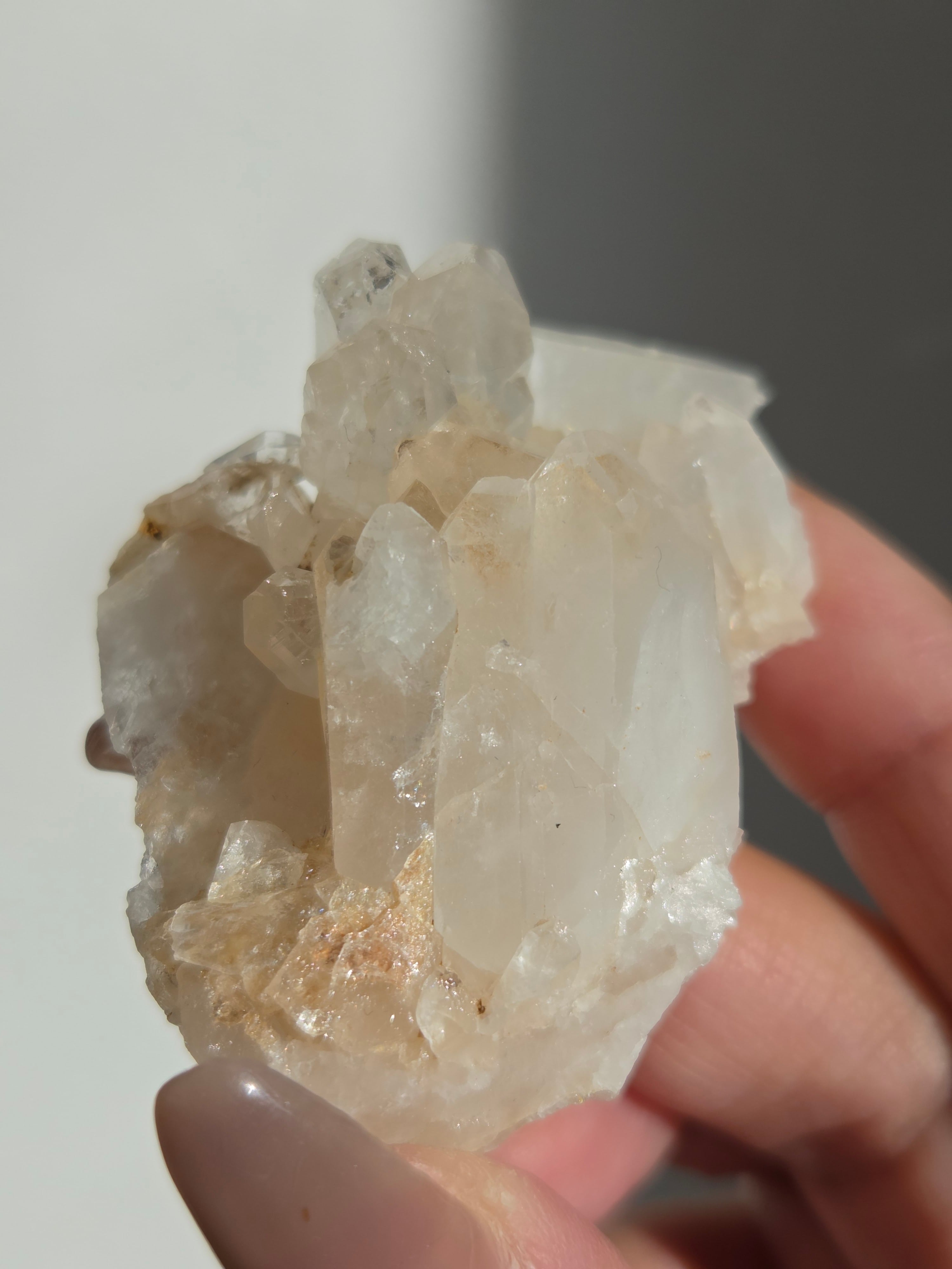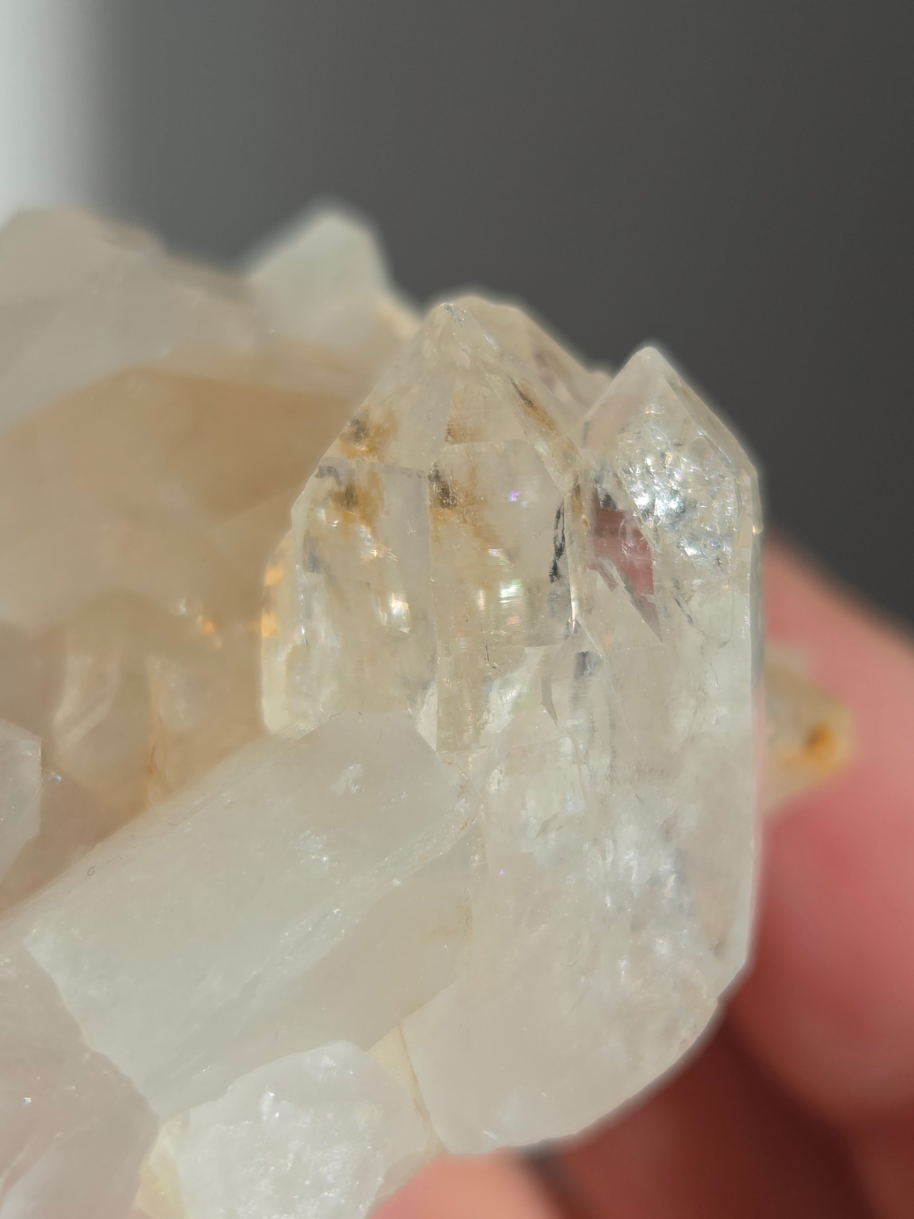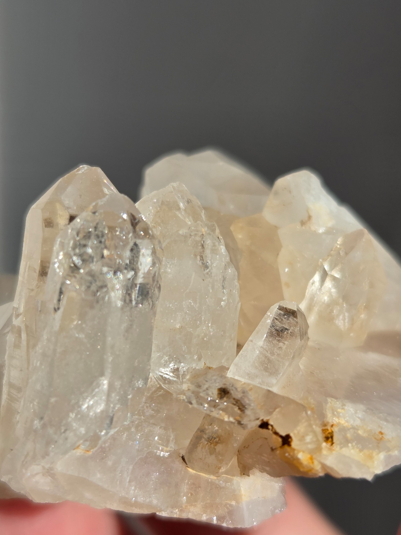 透明度高い大小異なる結晶が育つ繊細な水晶クラスター。母岩表層から水晶内部を通してオレンジ色に彩られたディテールが、光に反射してキラキラと輝き出します。