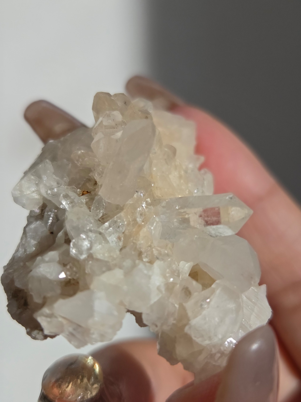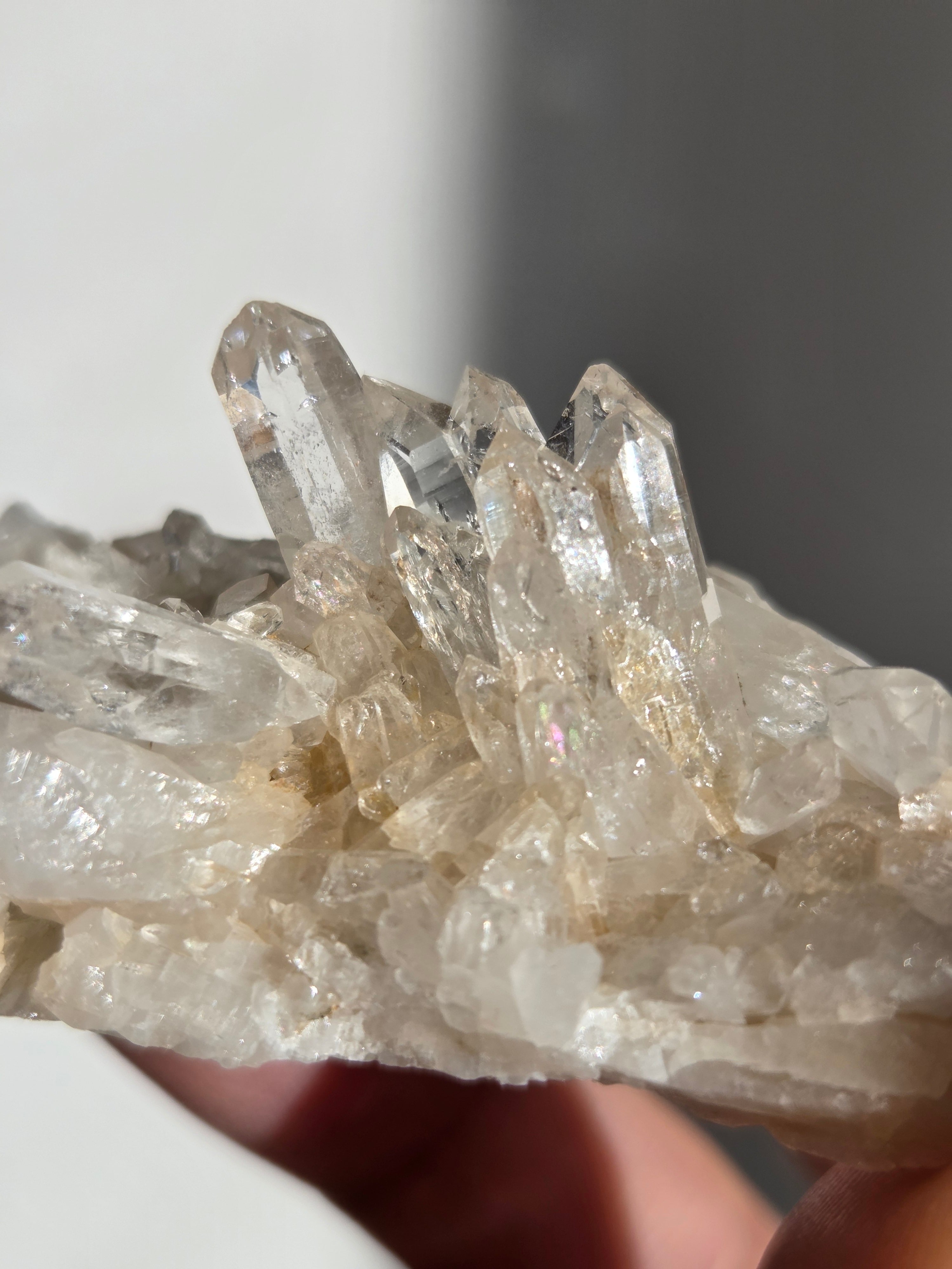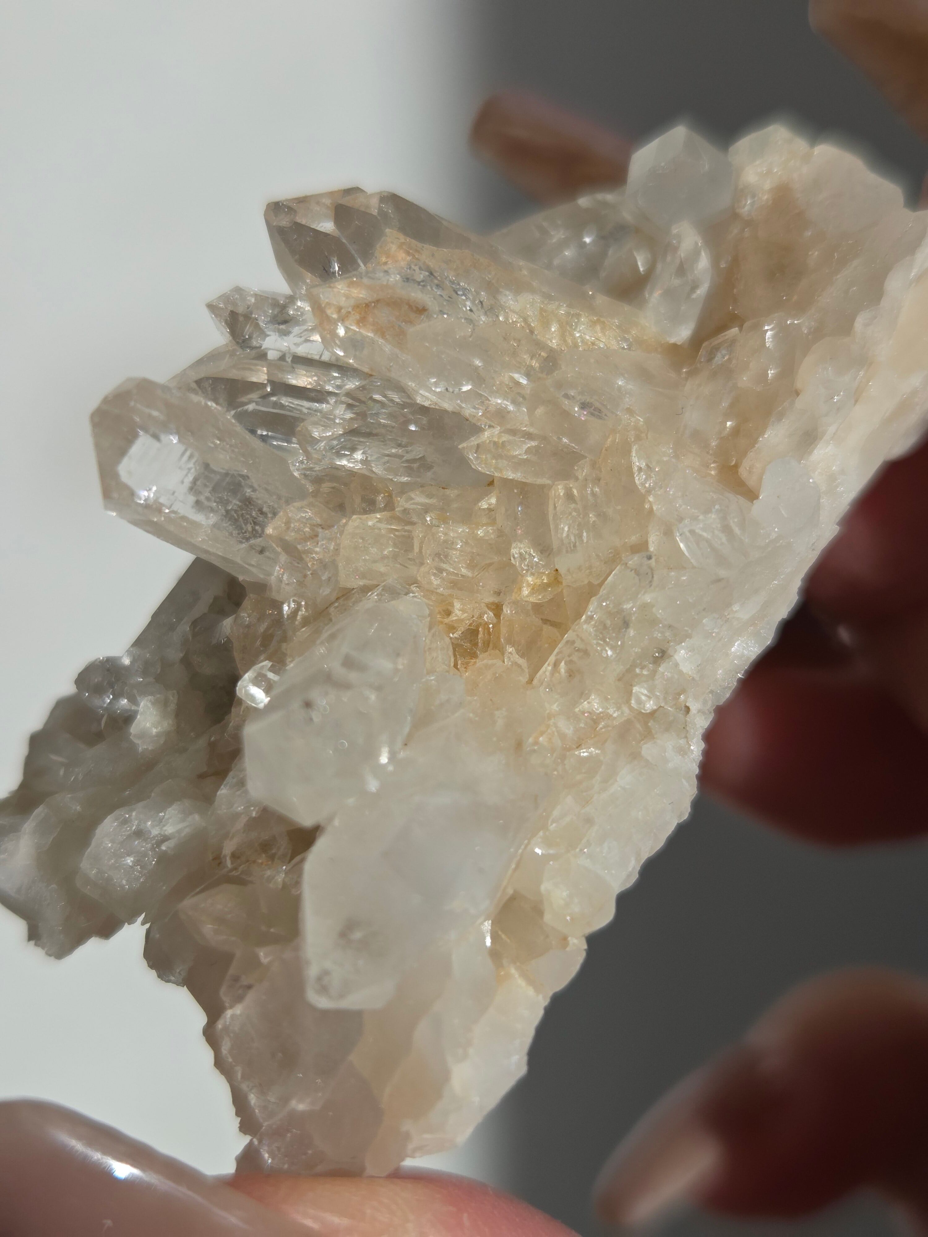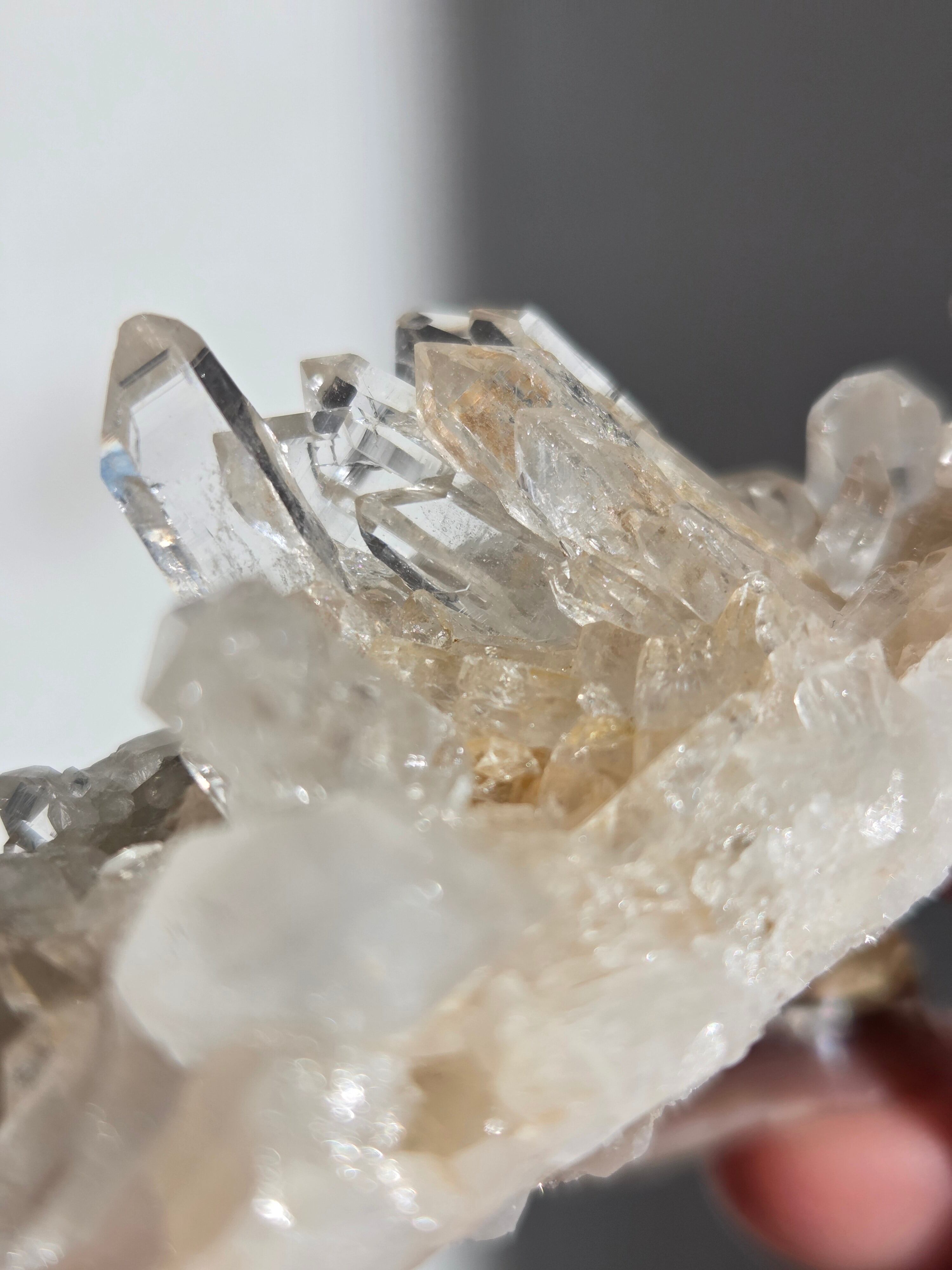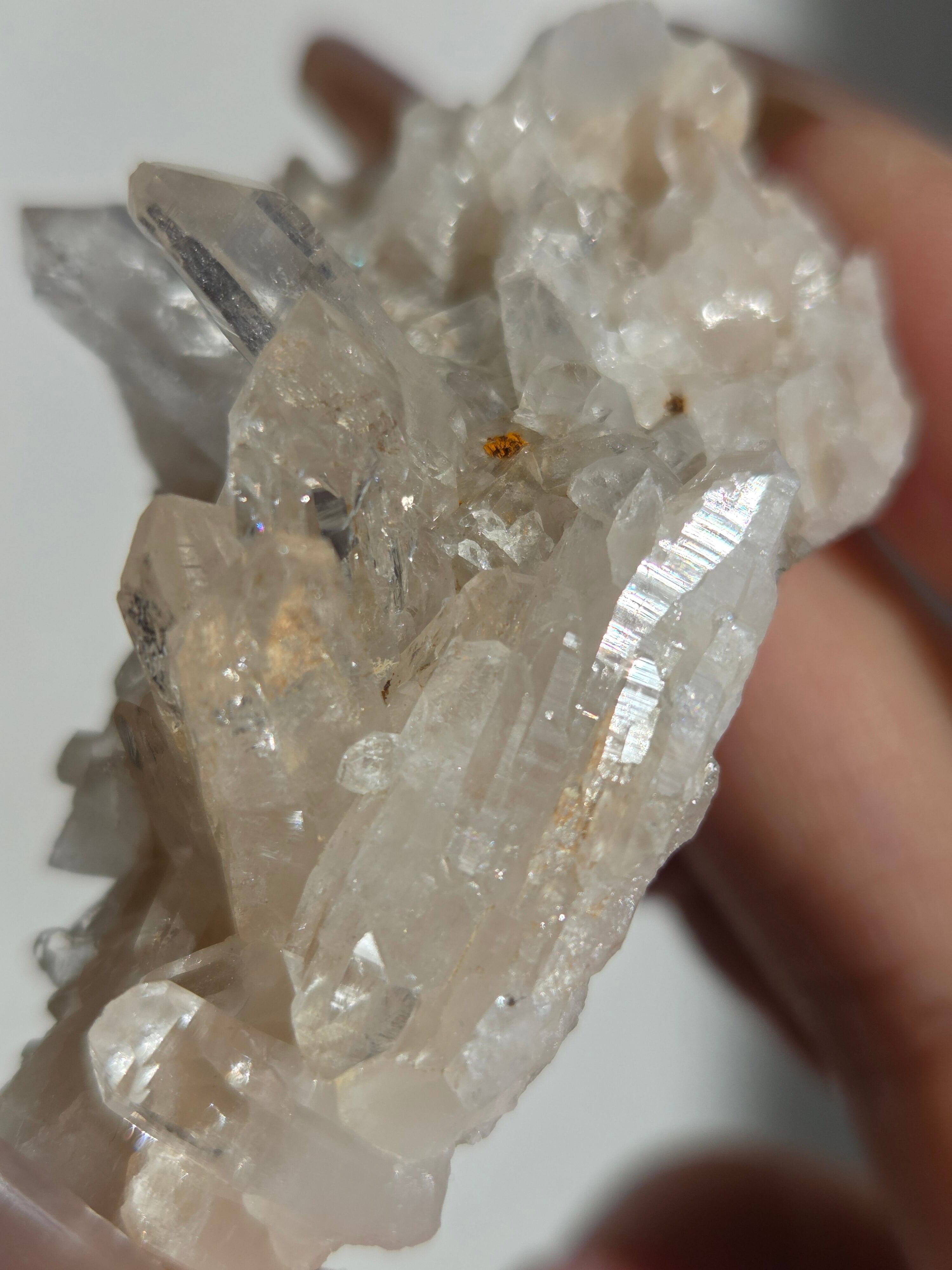 透明度高い大小異なる結晶が育つ繊細な水晶クラスター。母岩表層から水晶内部を通してオレンジ色に彩られたディテールが、光に反射してキラキラと輝き出します。