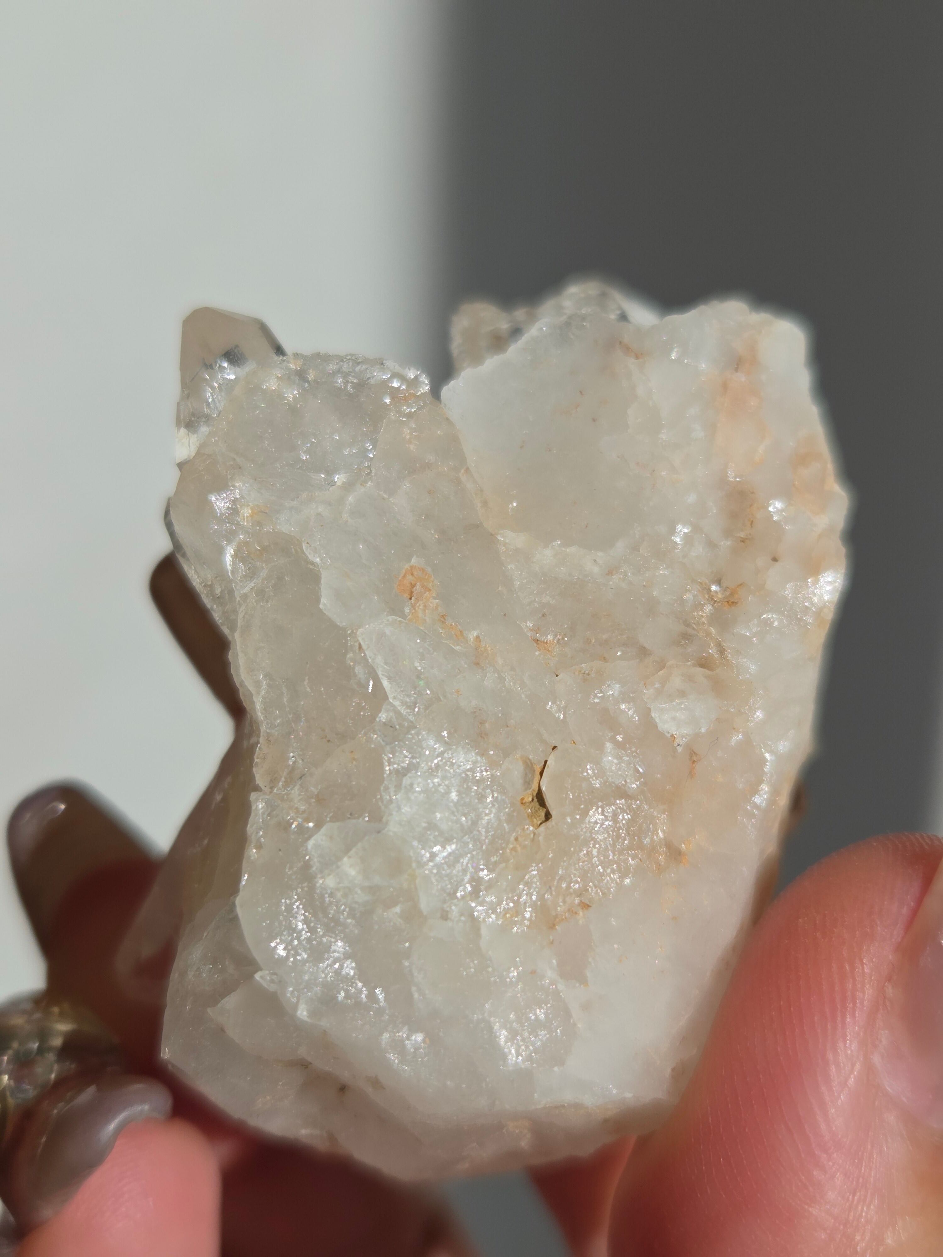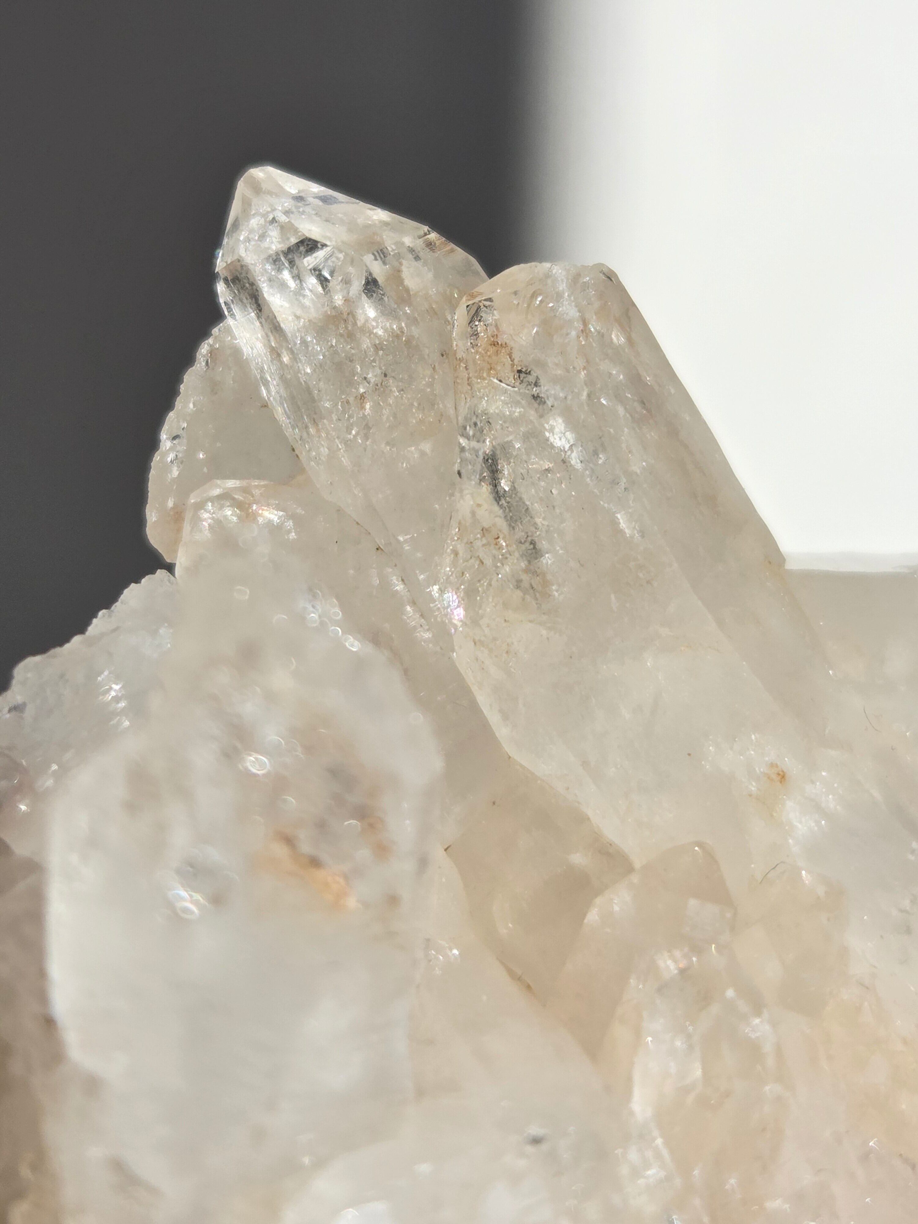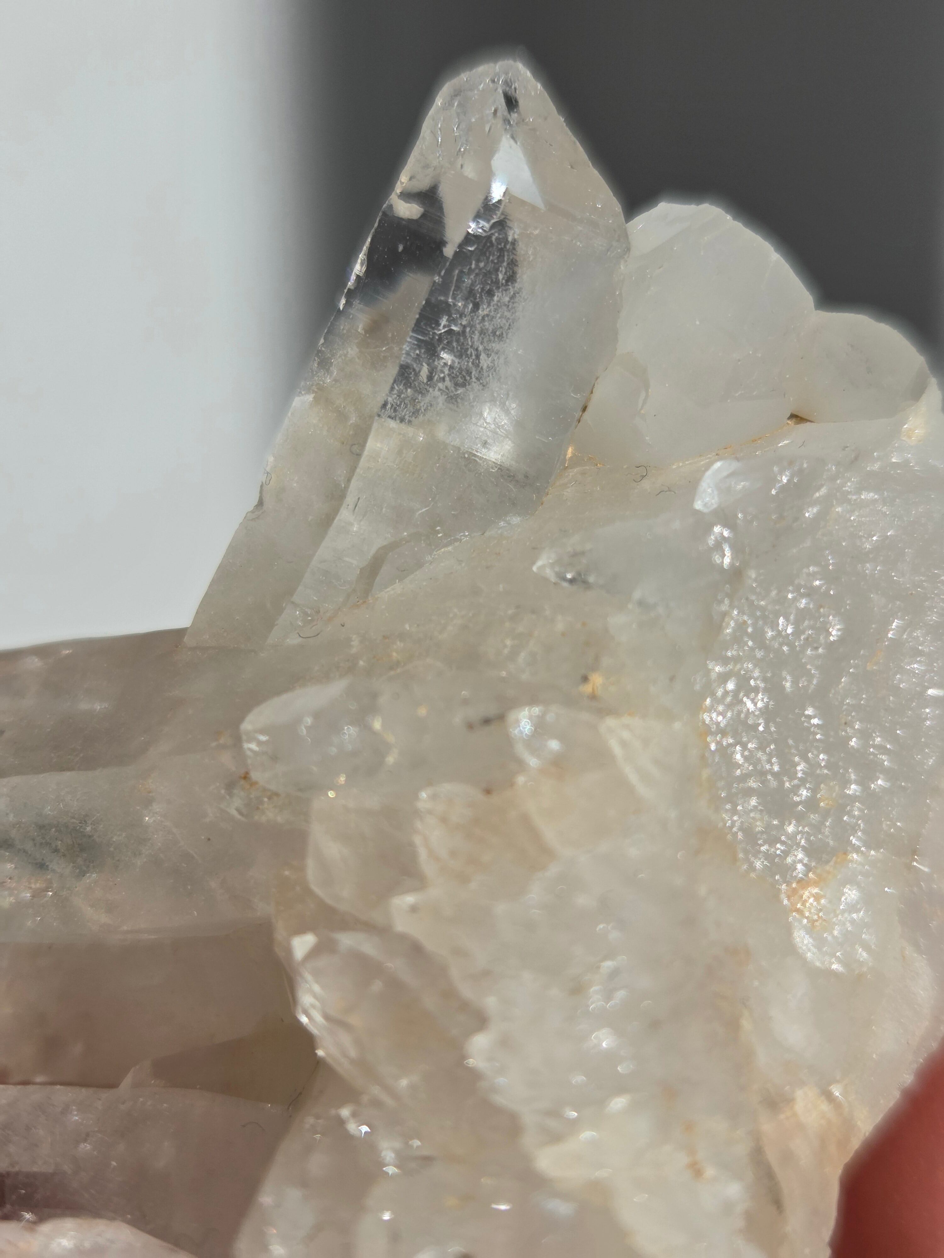 透明度高い大小異なる結晶が育つ繊細な水晶クラスター。母岩表層から水晶内部を通してオレンジ色に彩られたディテールが、光に反射してキラキラと輝き出します。
