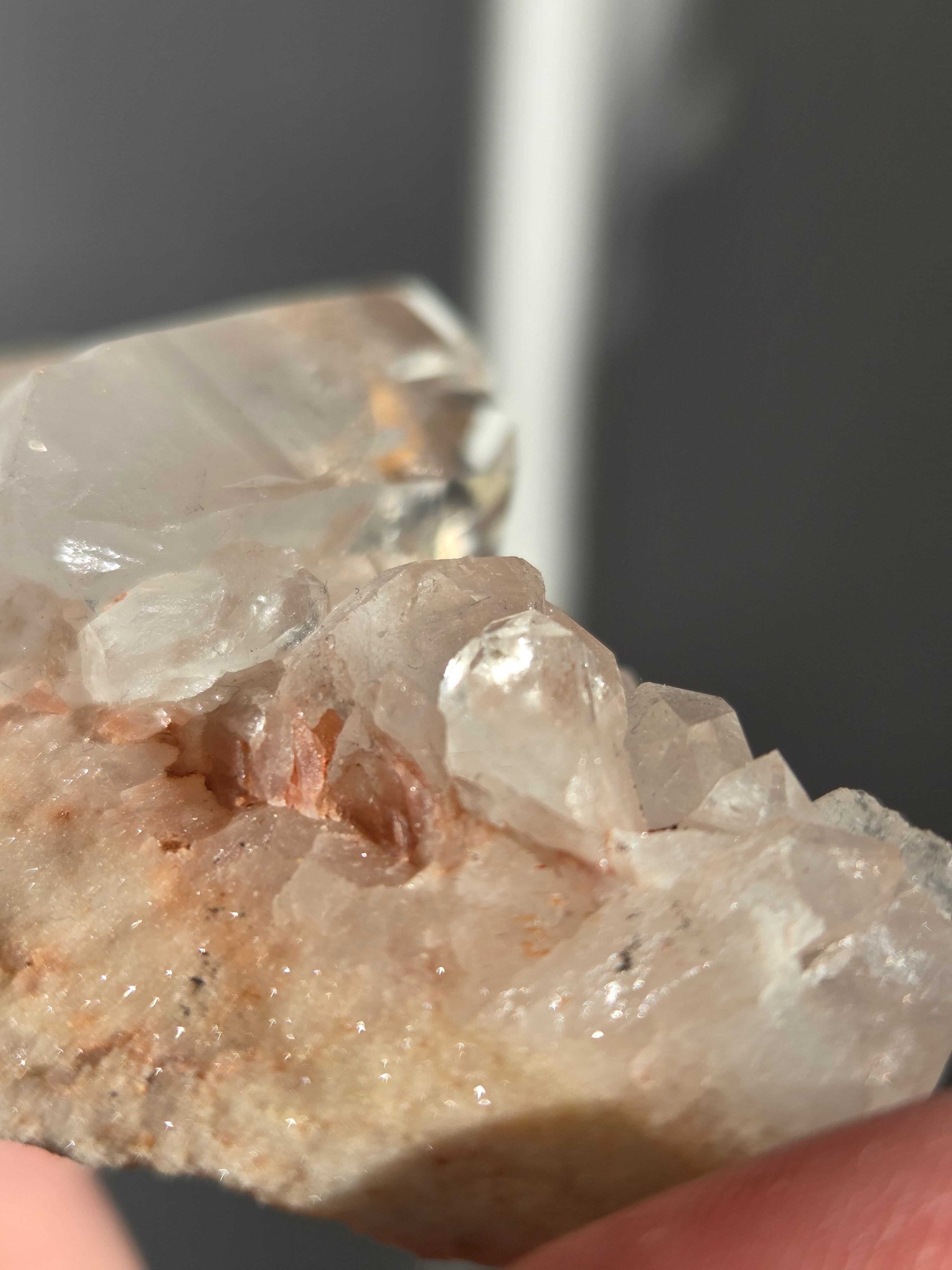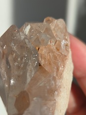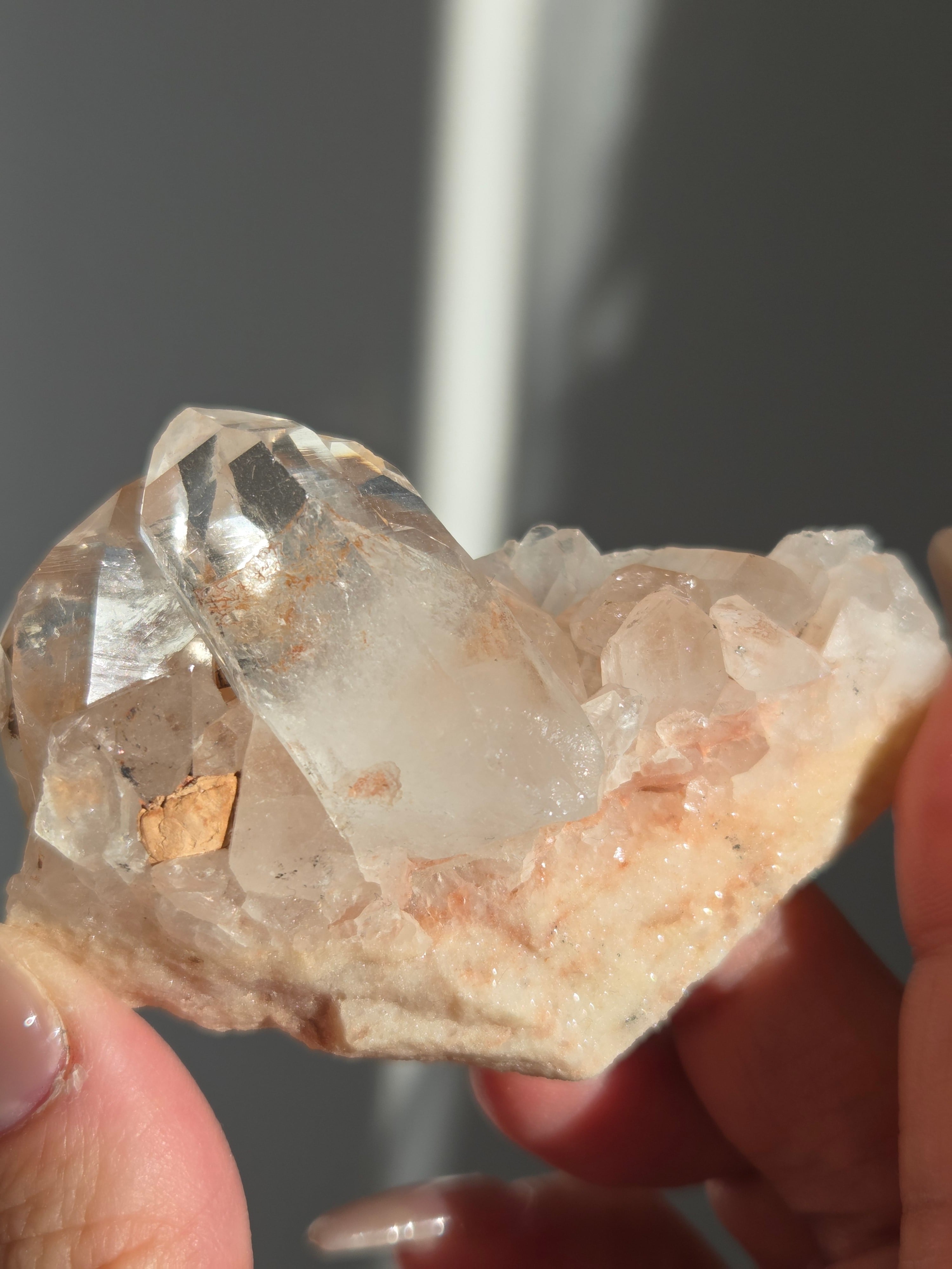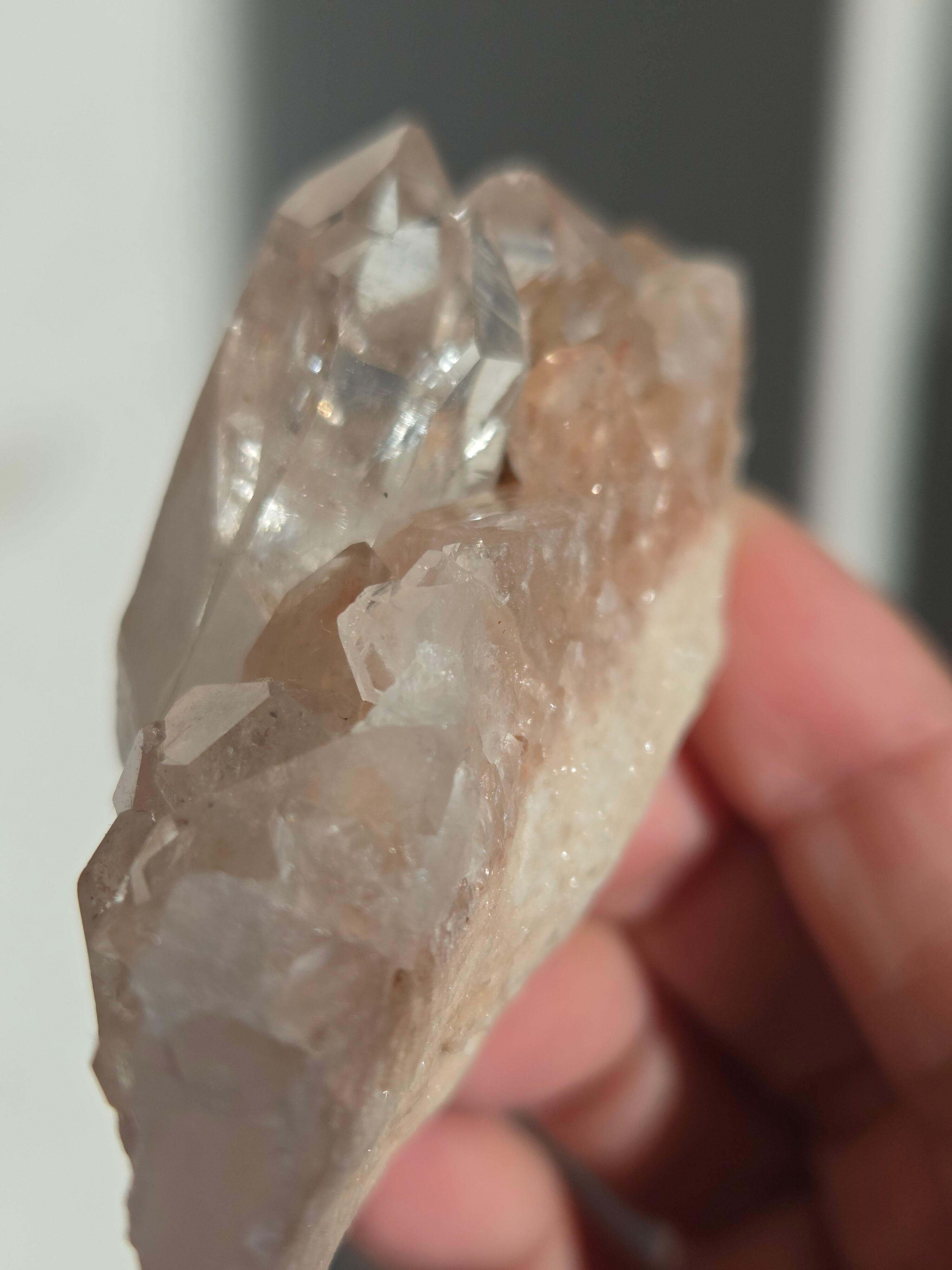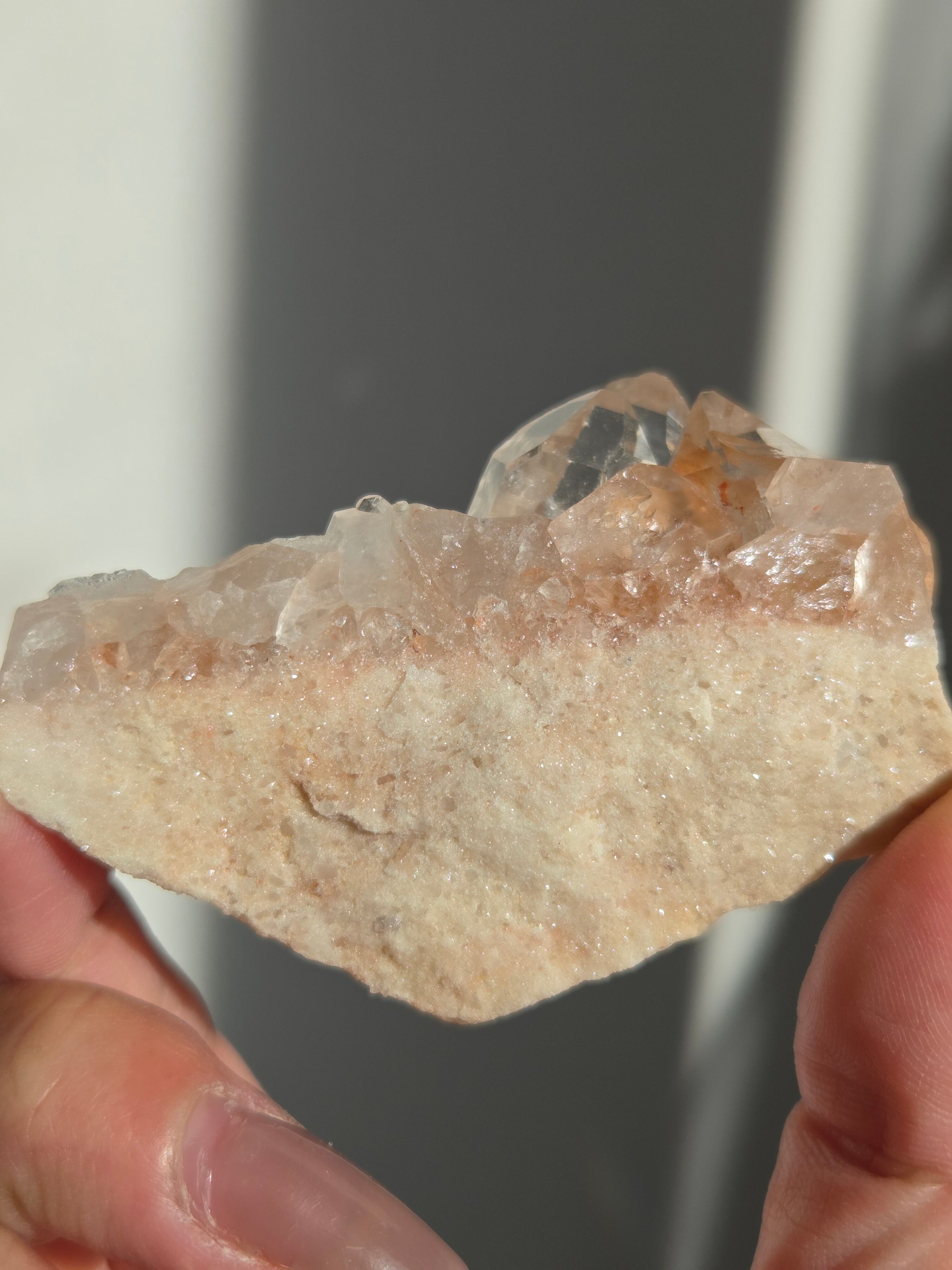 水晶と同じく二酸化ケイ素の鉱物で、6面体の結晶構造と尖った末端を持っていて、透明感のあるピンク色の結晶が集まって形作られています。