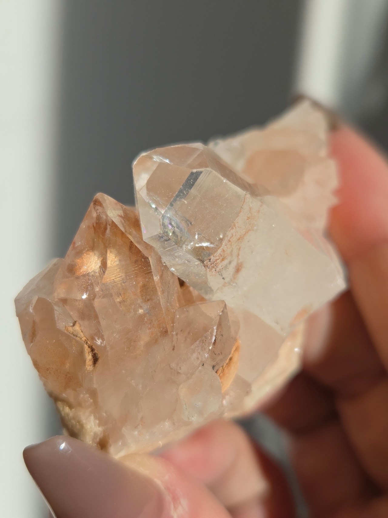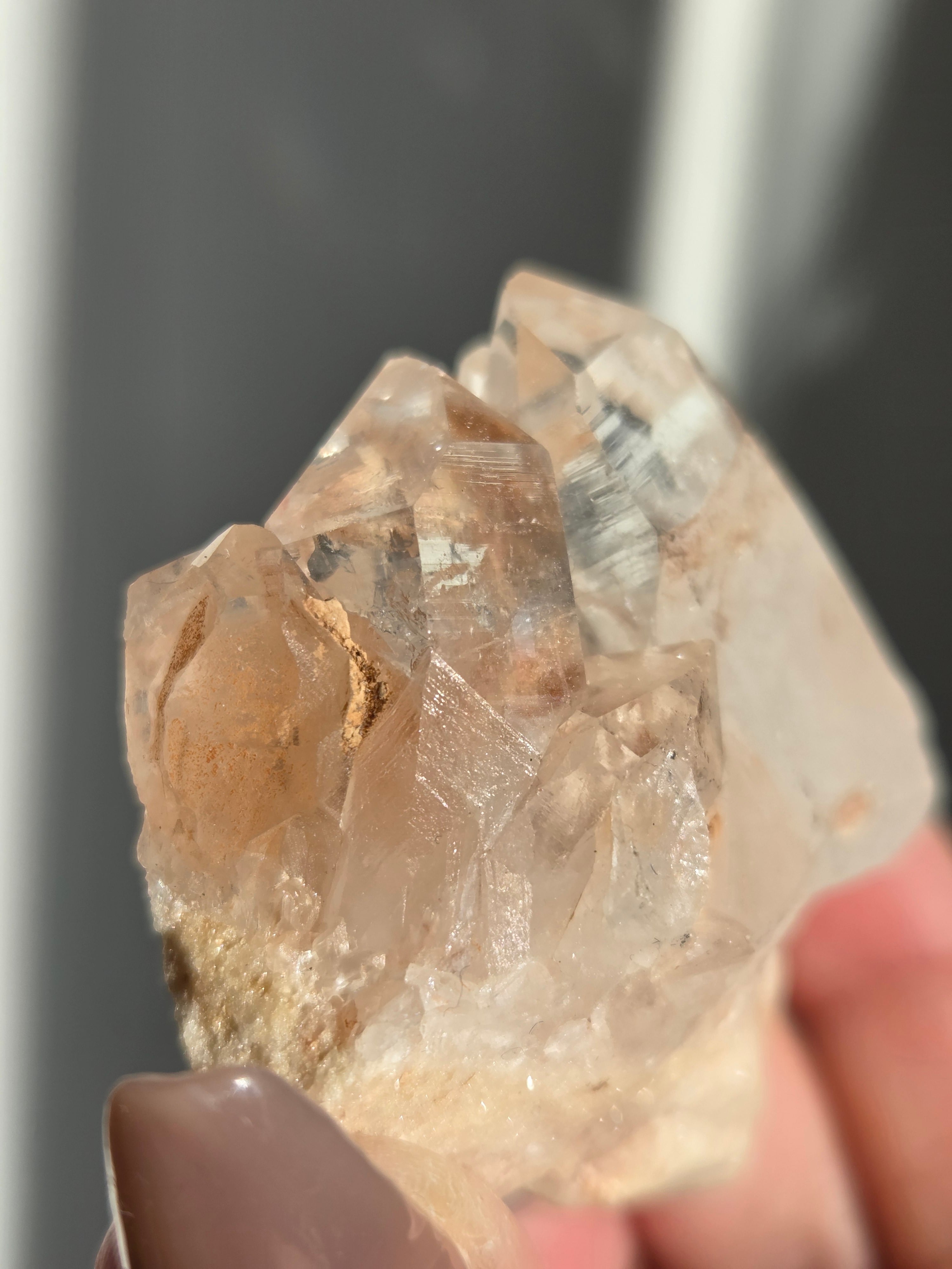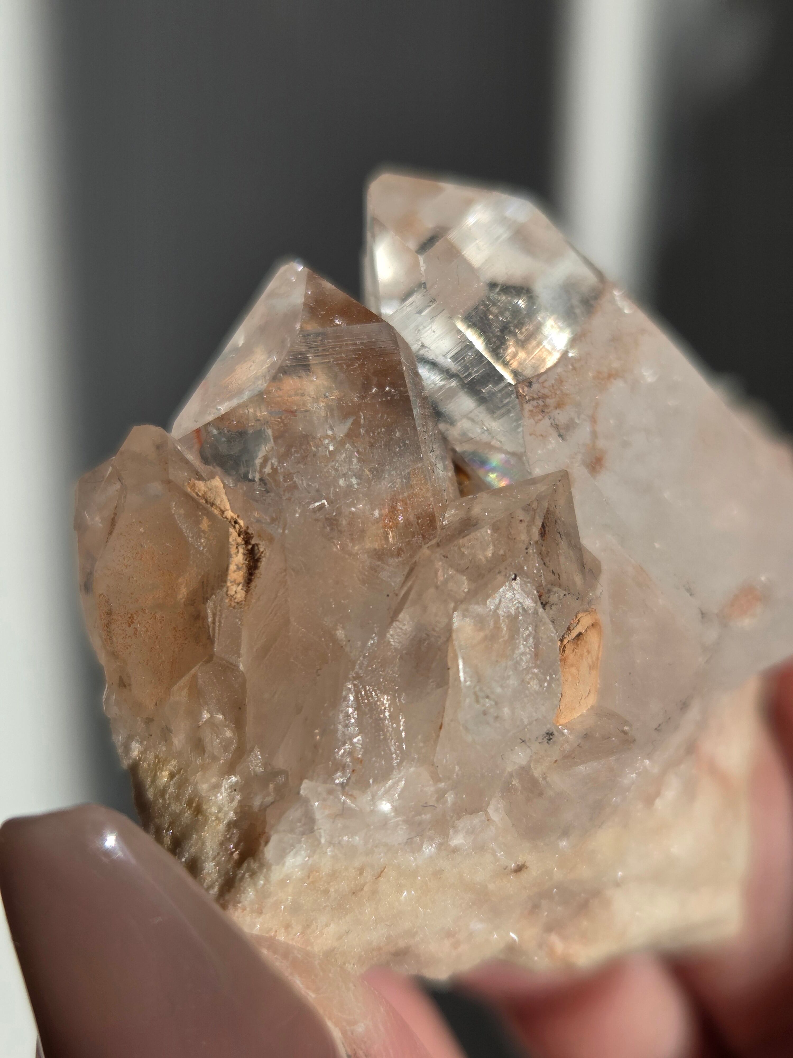 水晶と同じく二酸化ケイ素の鉱物で、6面体の結晶構造と尖った末端を持っていて、透明感のあるピンク色の結晶が集まって形作られています。