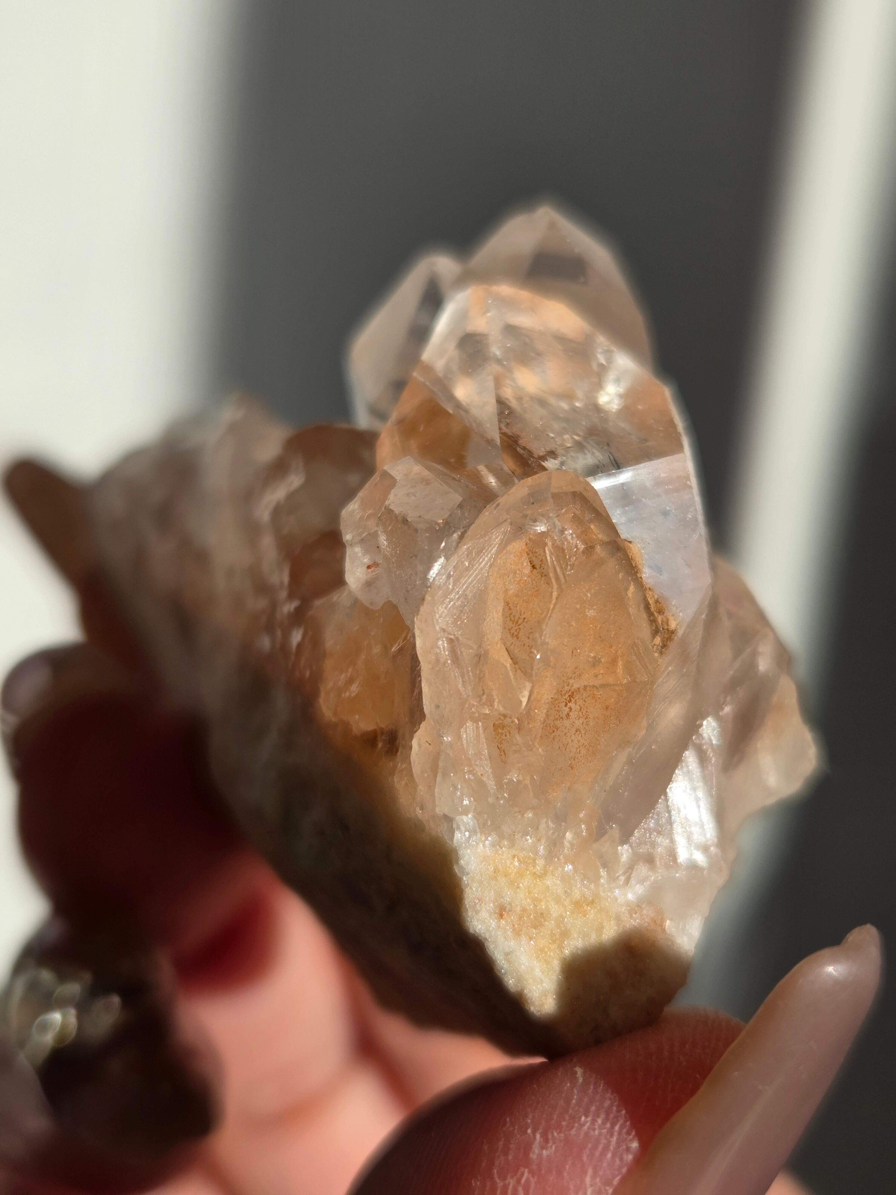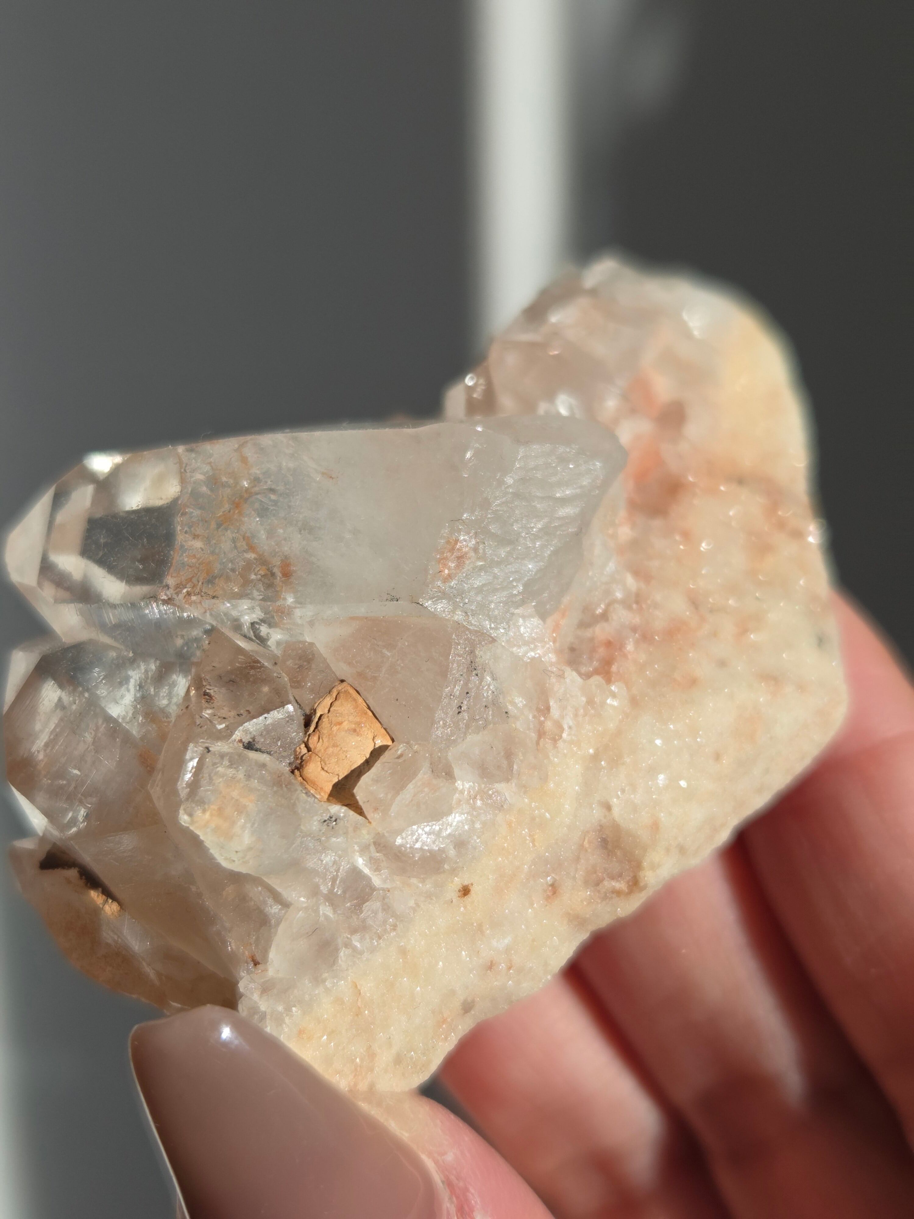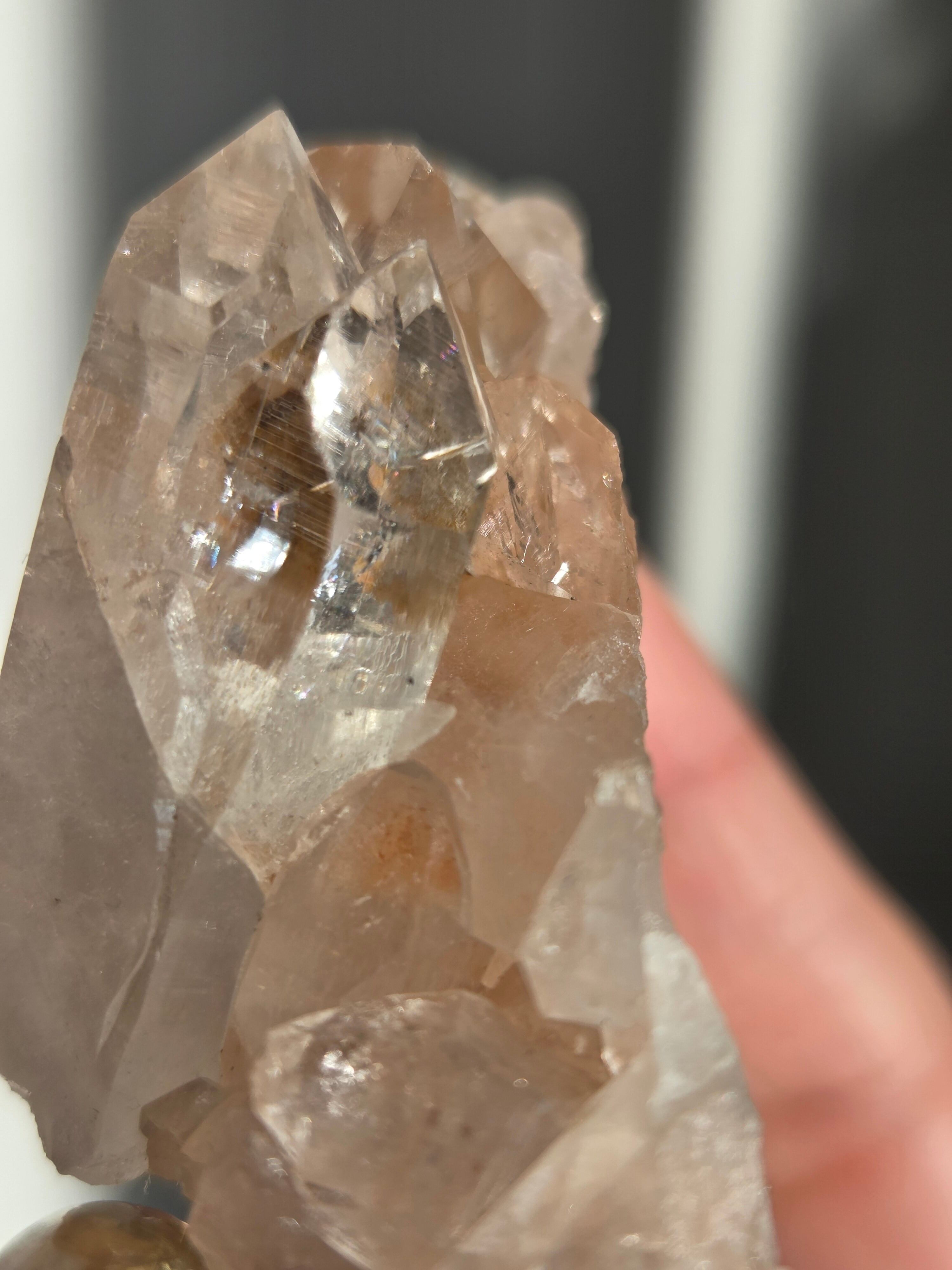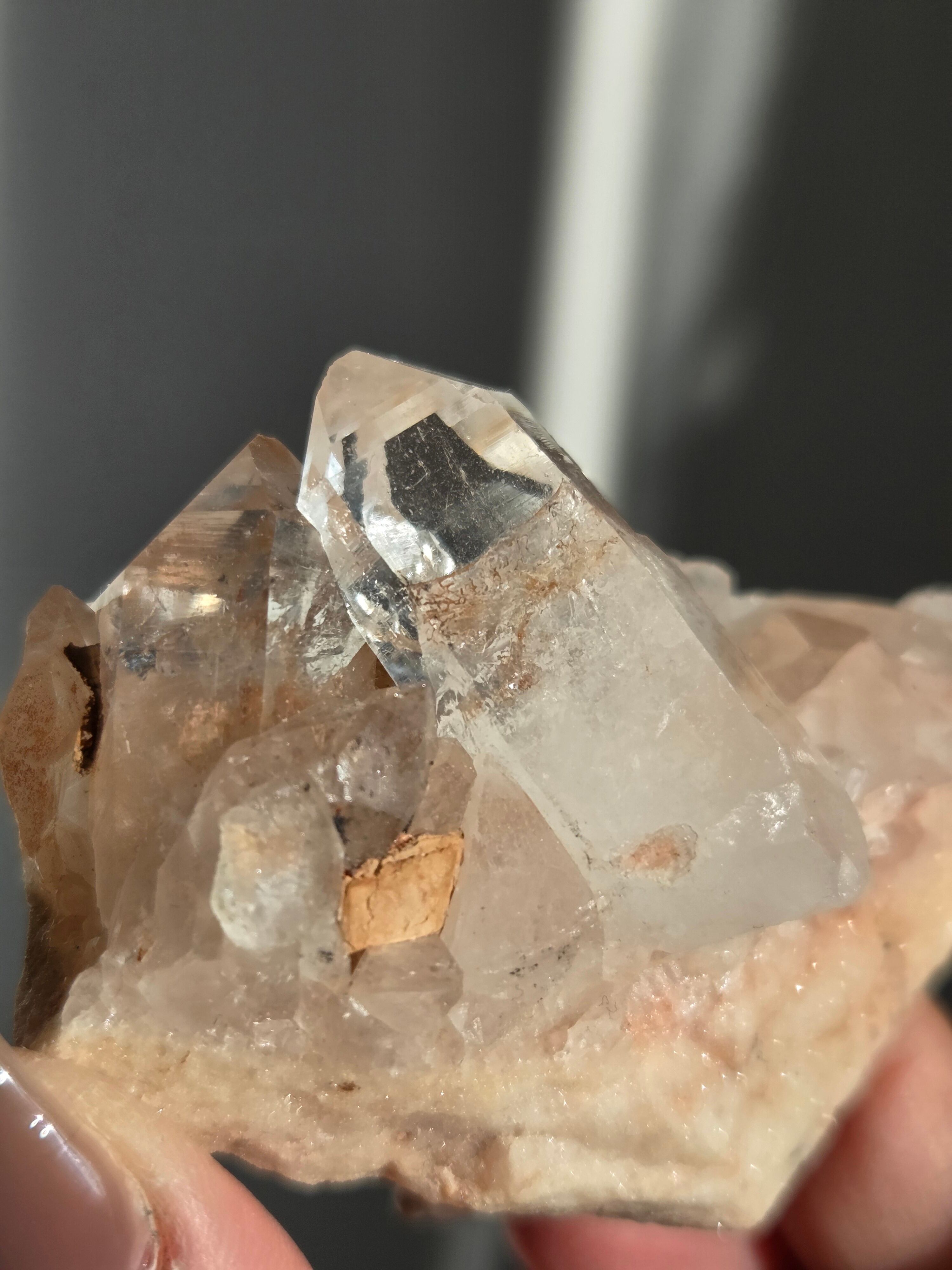 水晶と同じく二酸化ケイ素の鉱物で、6面体の結晶構造と尖った末端を持っていて、透明感のあるピンク色の結晶が集まって形作られています。