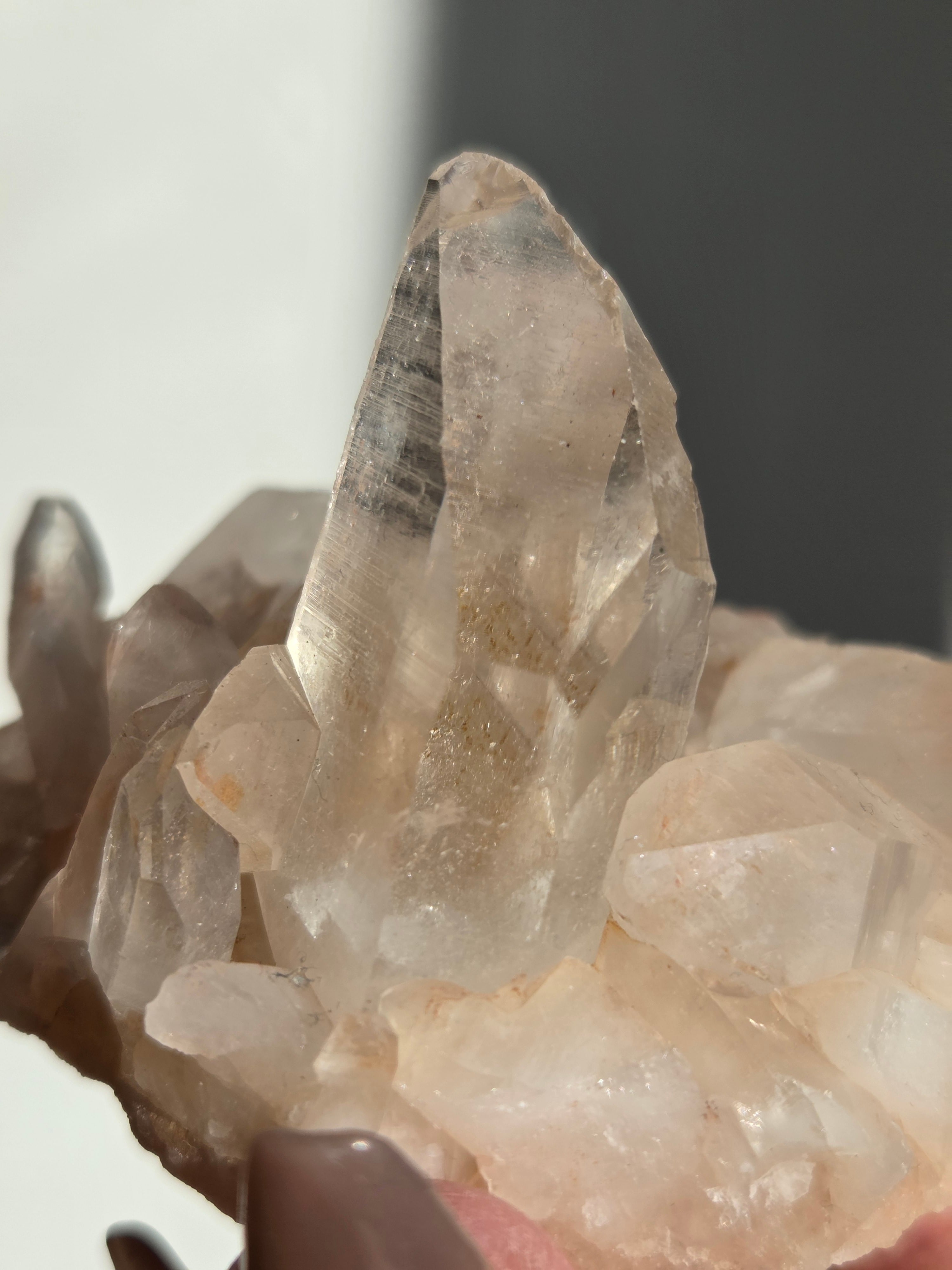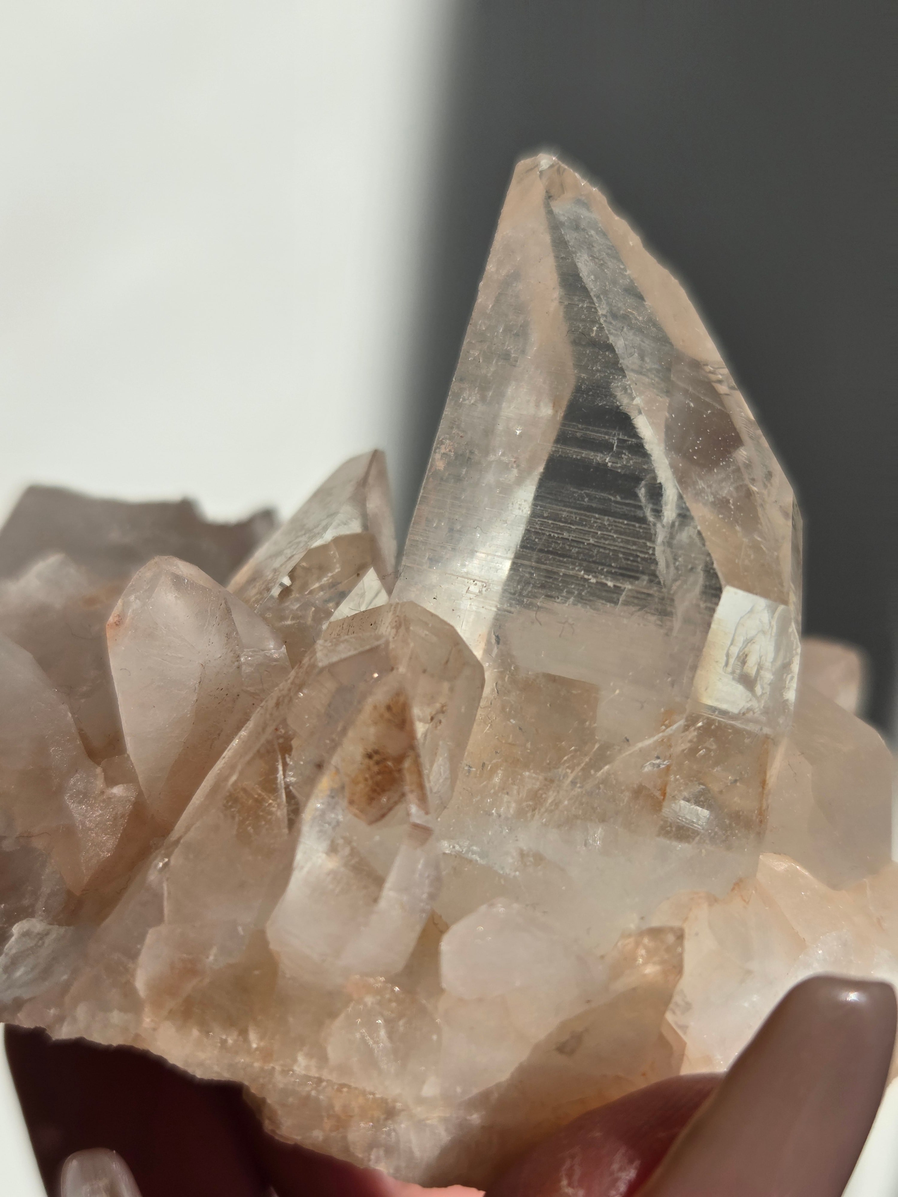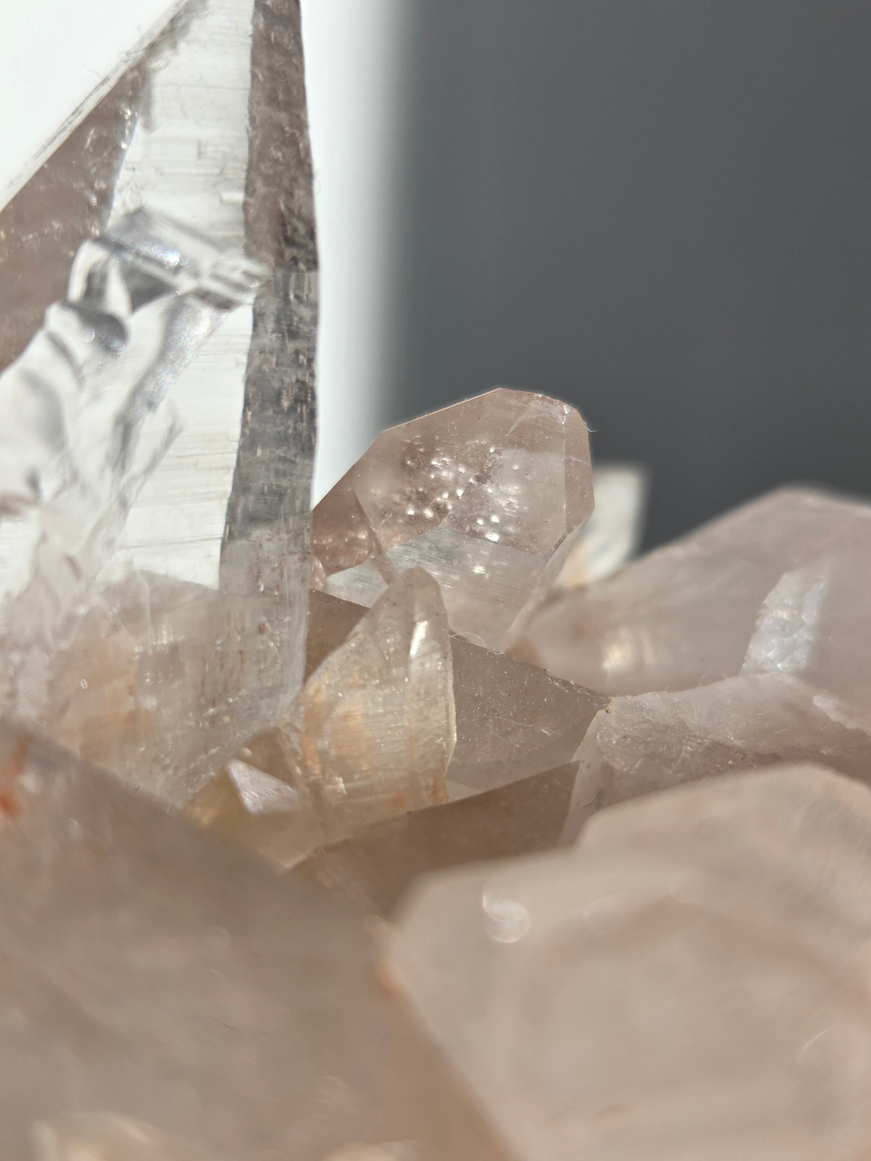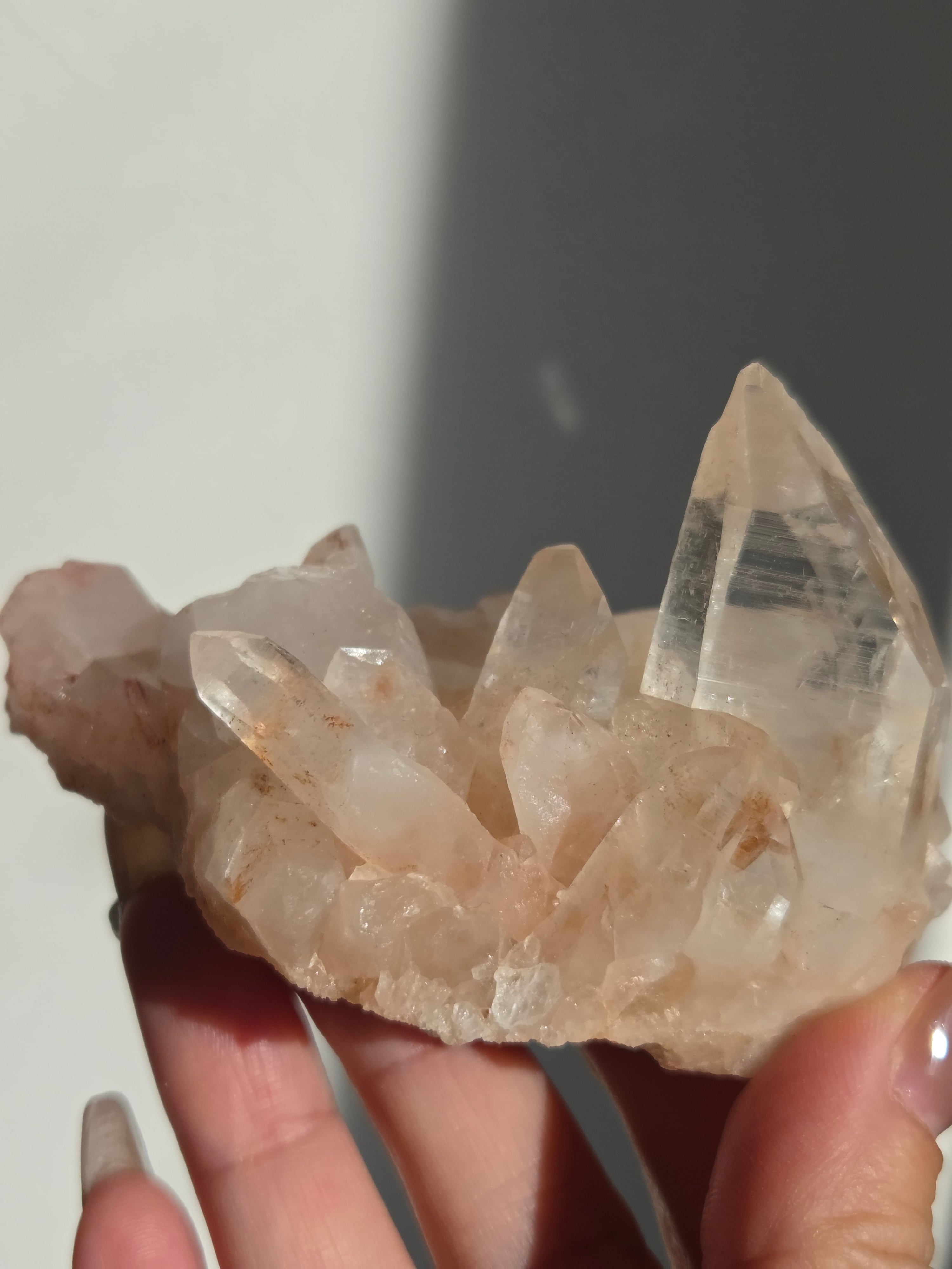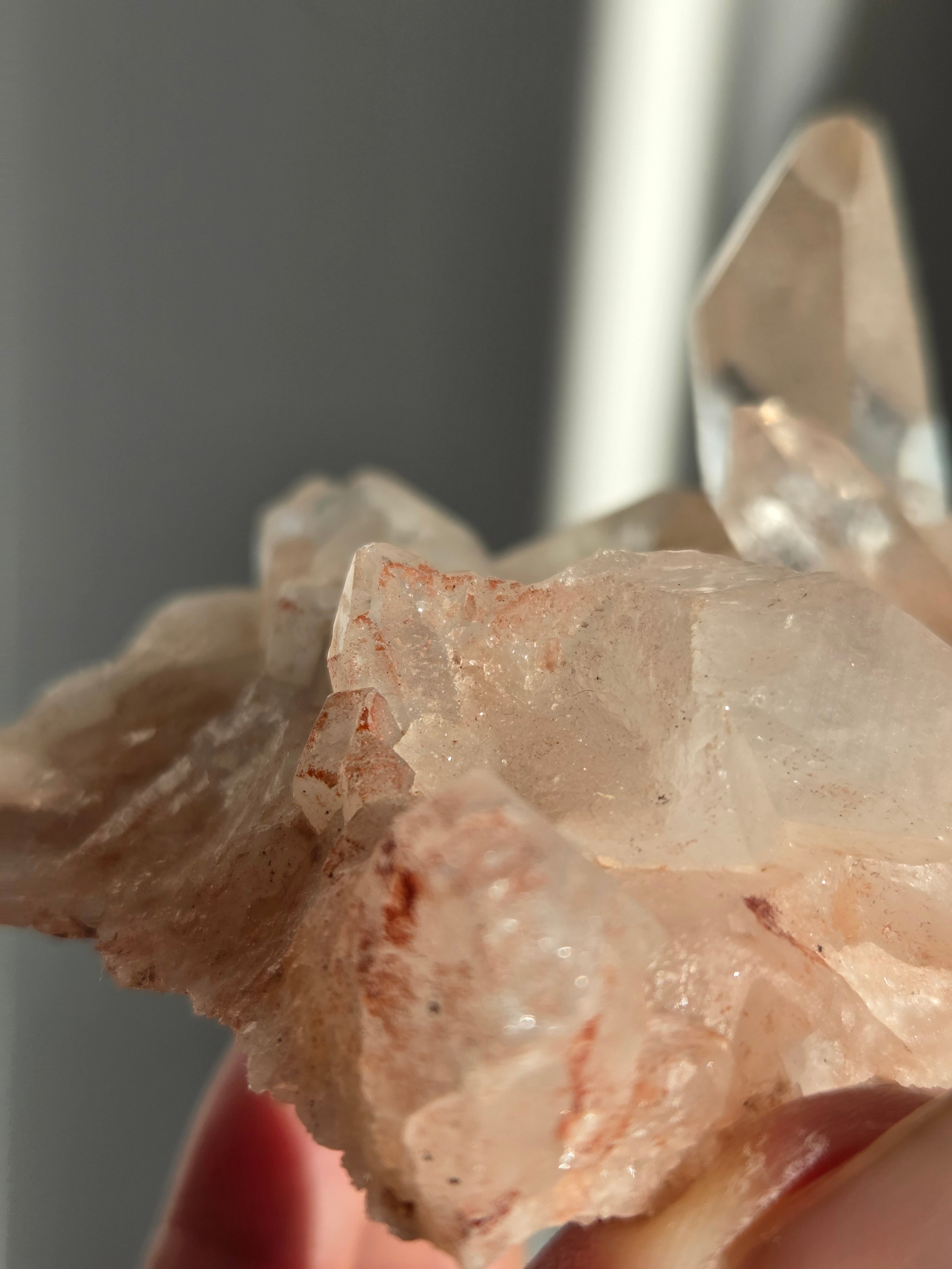水晶と同じく二酸化ケイ素の鉱物で、6面体の結晶構造と尖った末端を持っていて、透明感のあるピンク色の結晶が集まって形作られています。