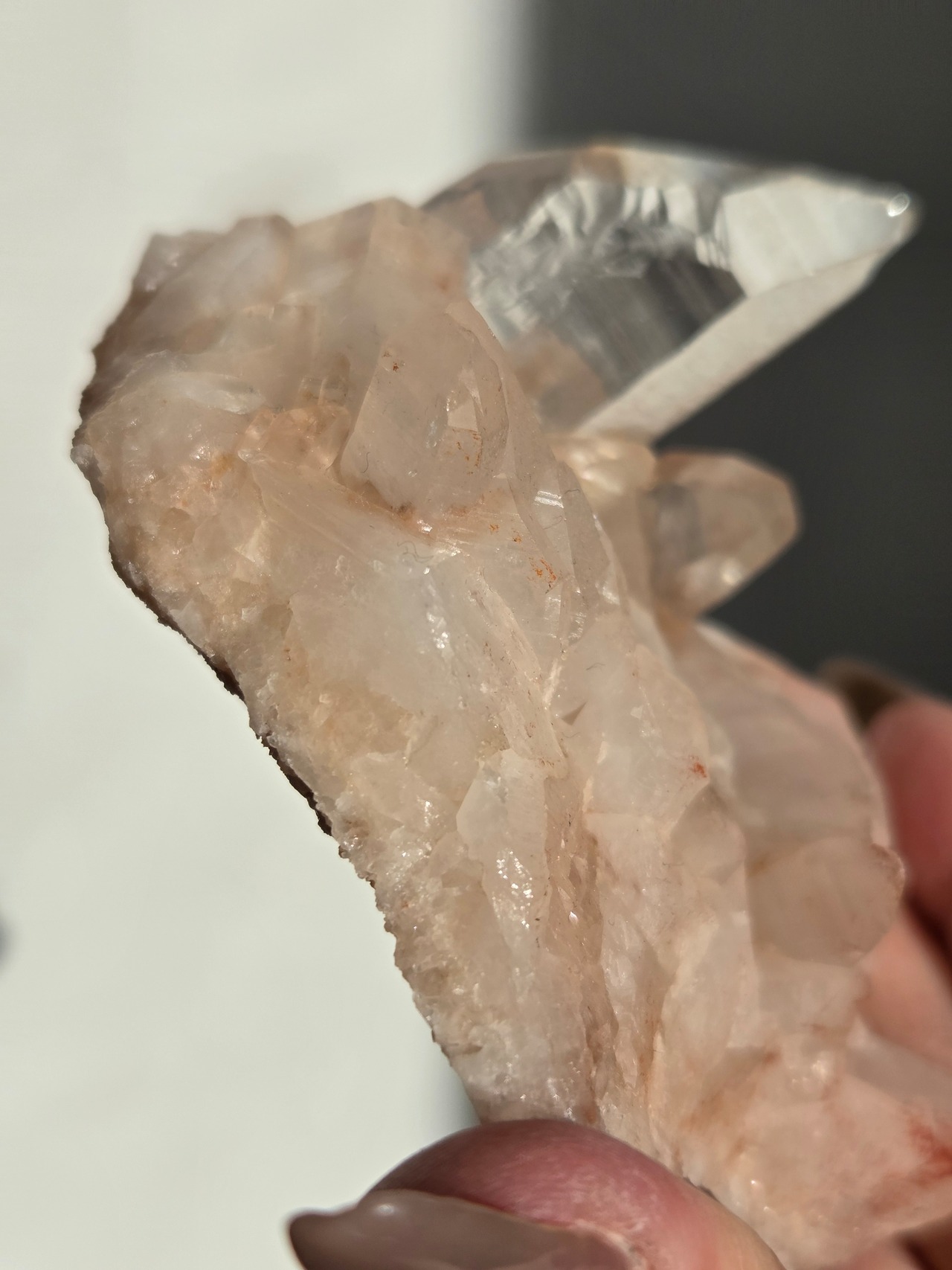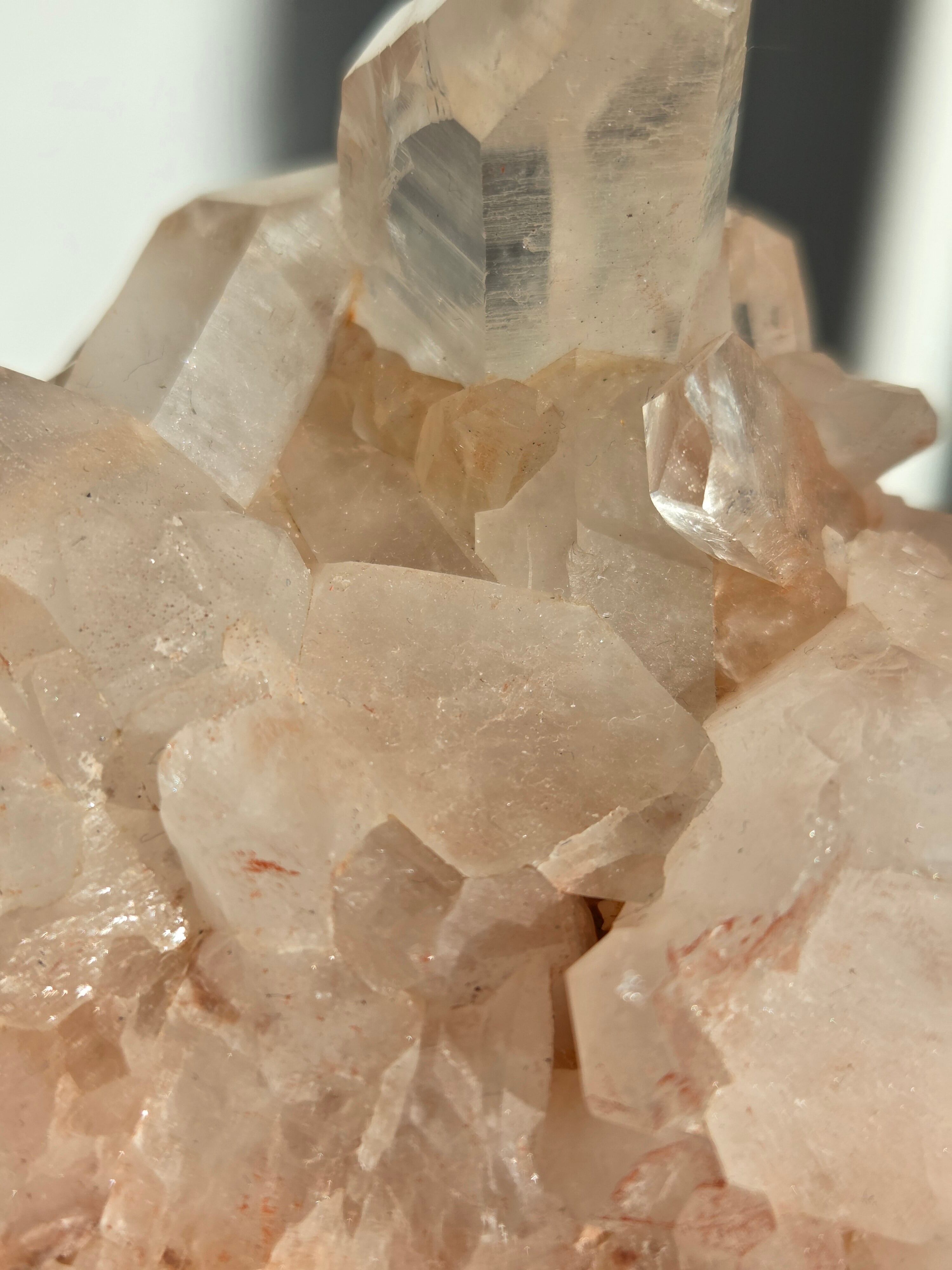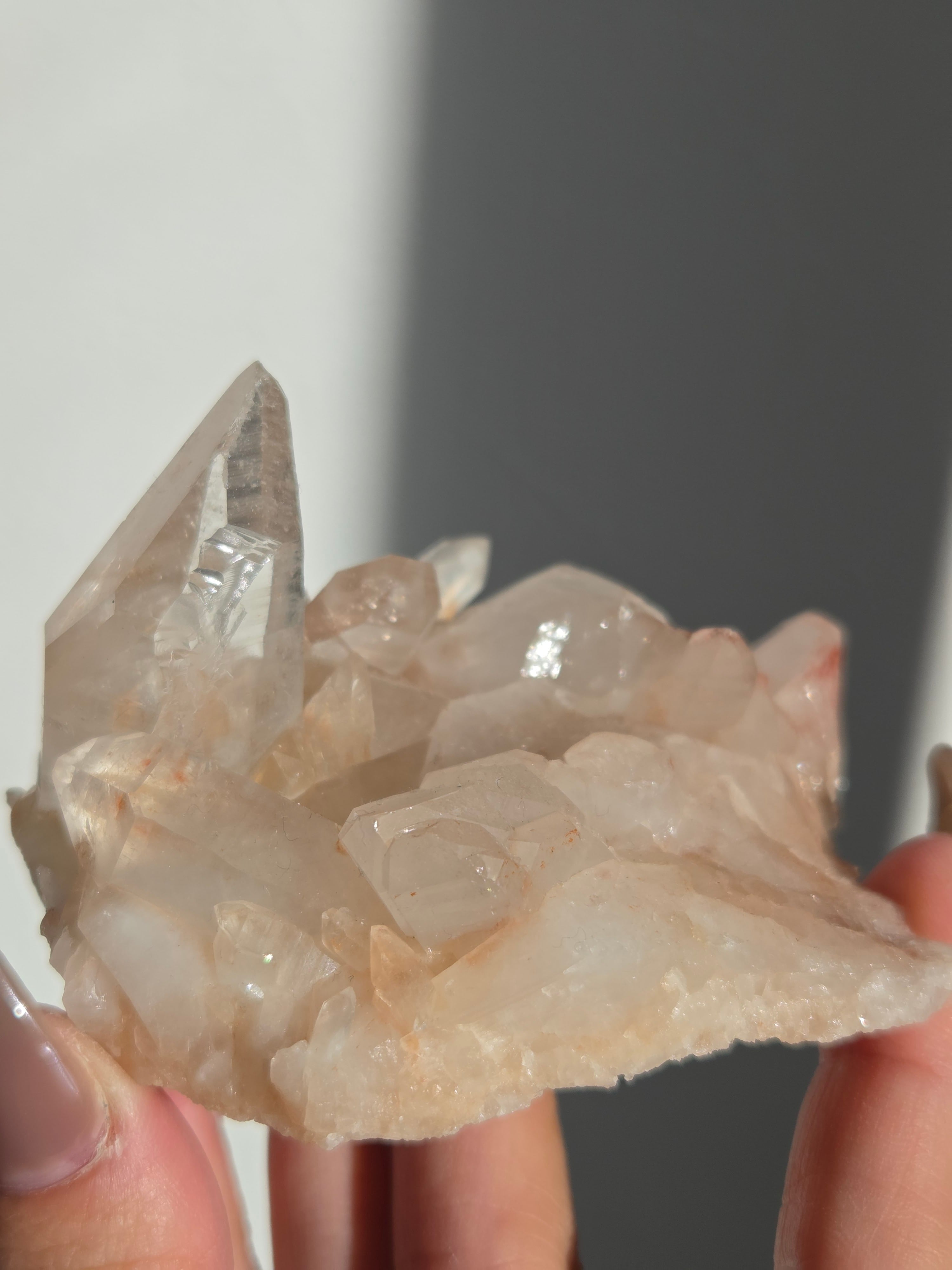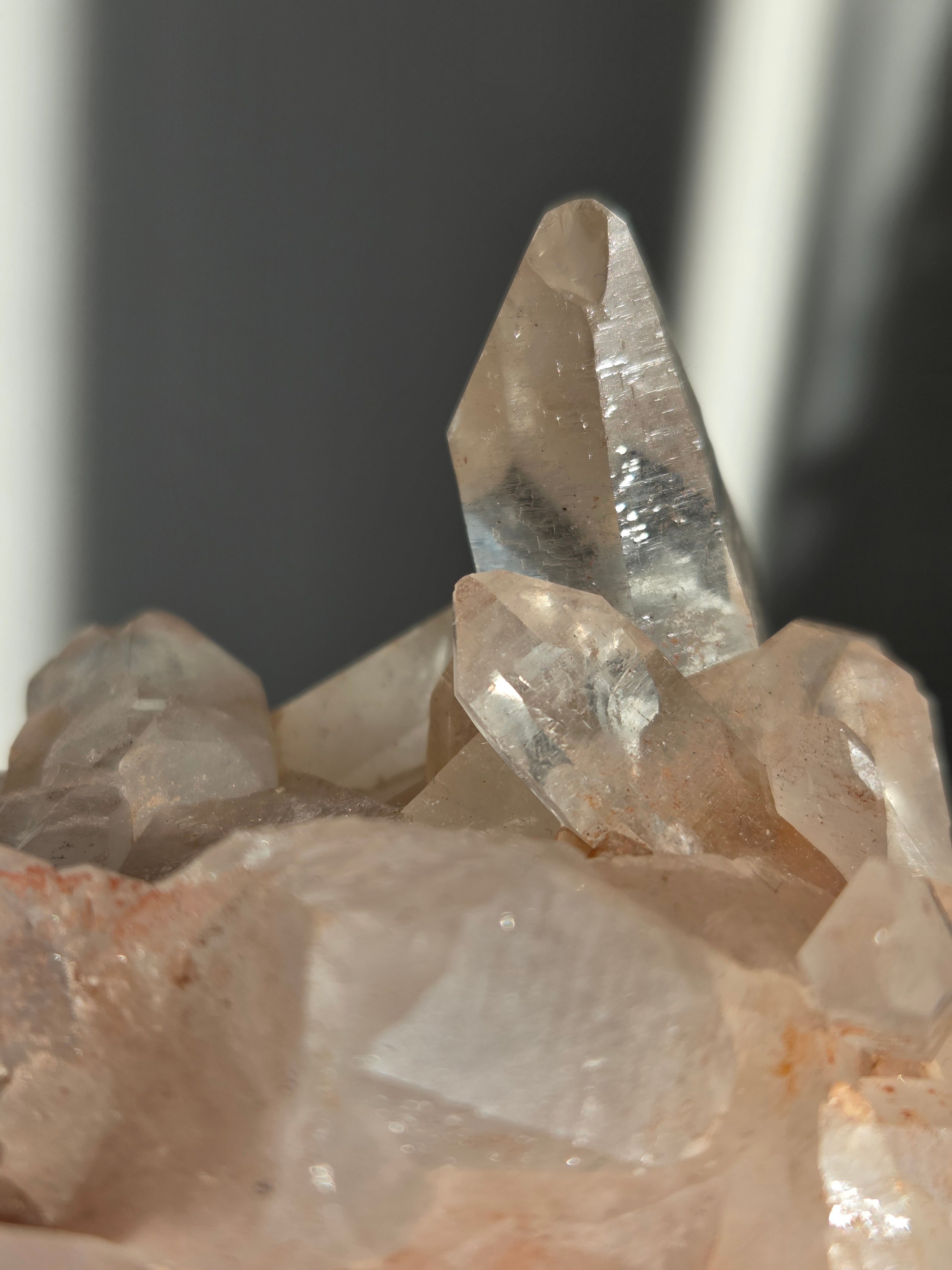 水晶と同じく二酸化ケイ素の鉱物で、6面体の結晶構造と尖った末端を持っていて、透明感のあるピンク色の結晶が集まって形作られています。