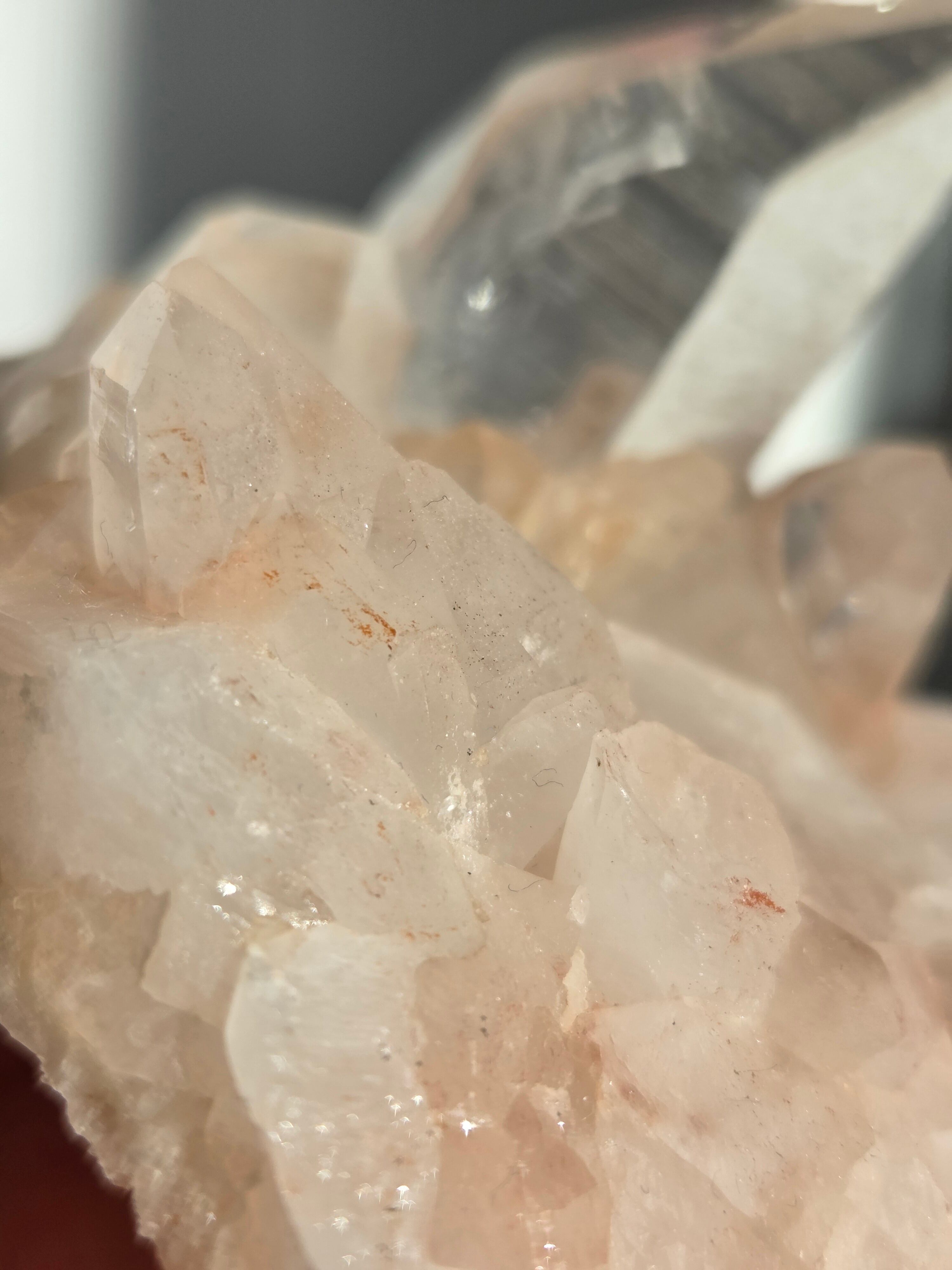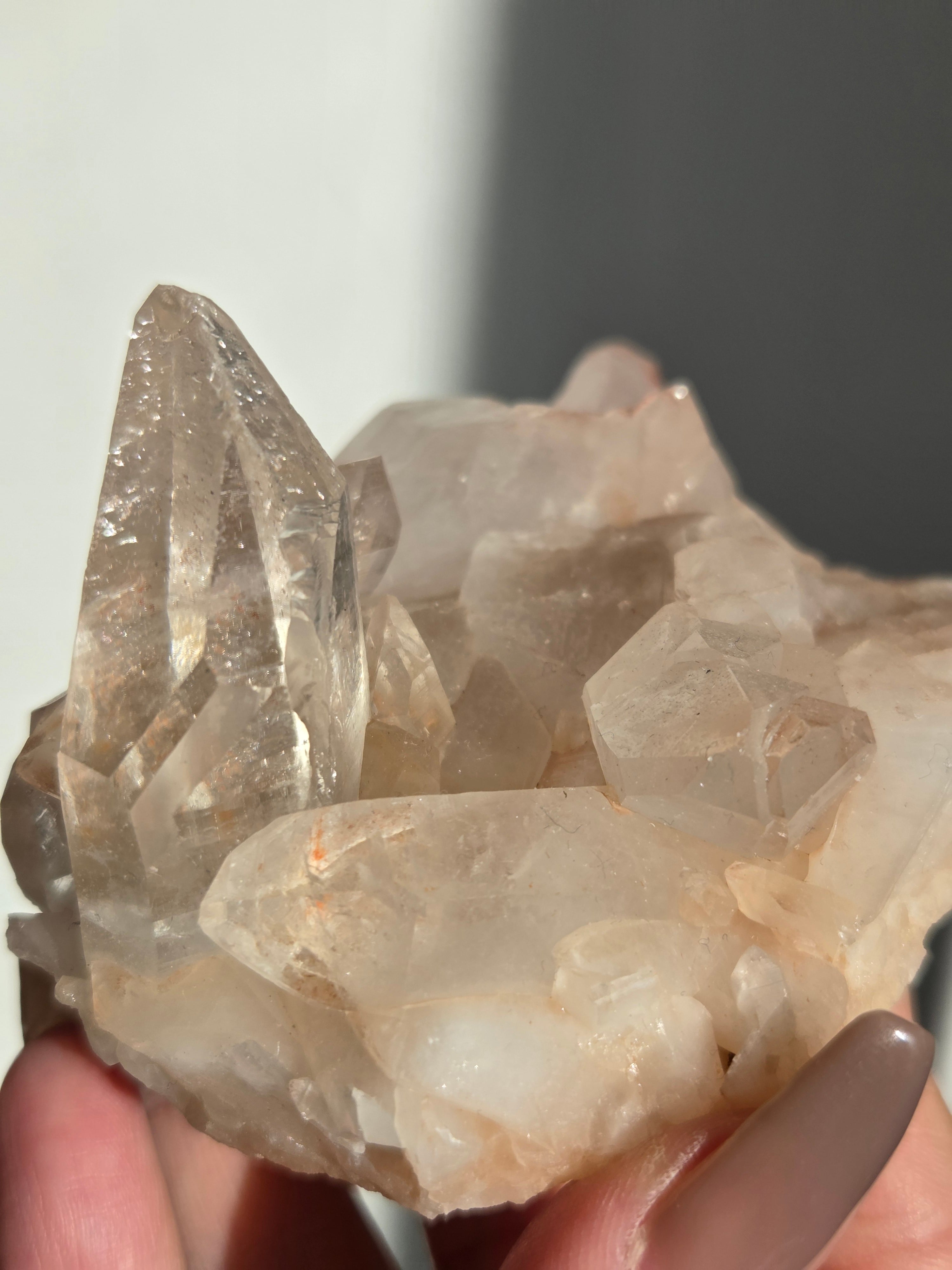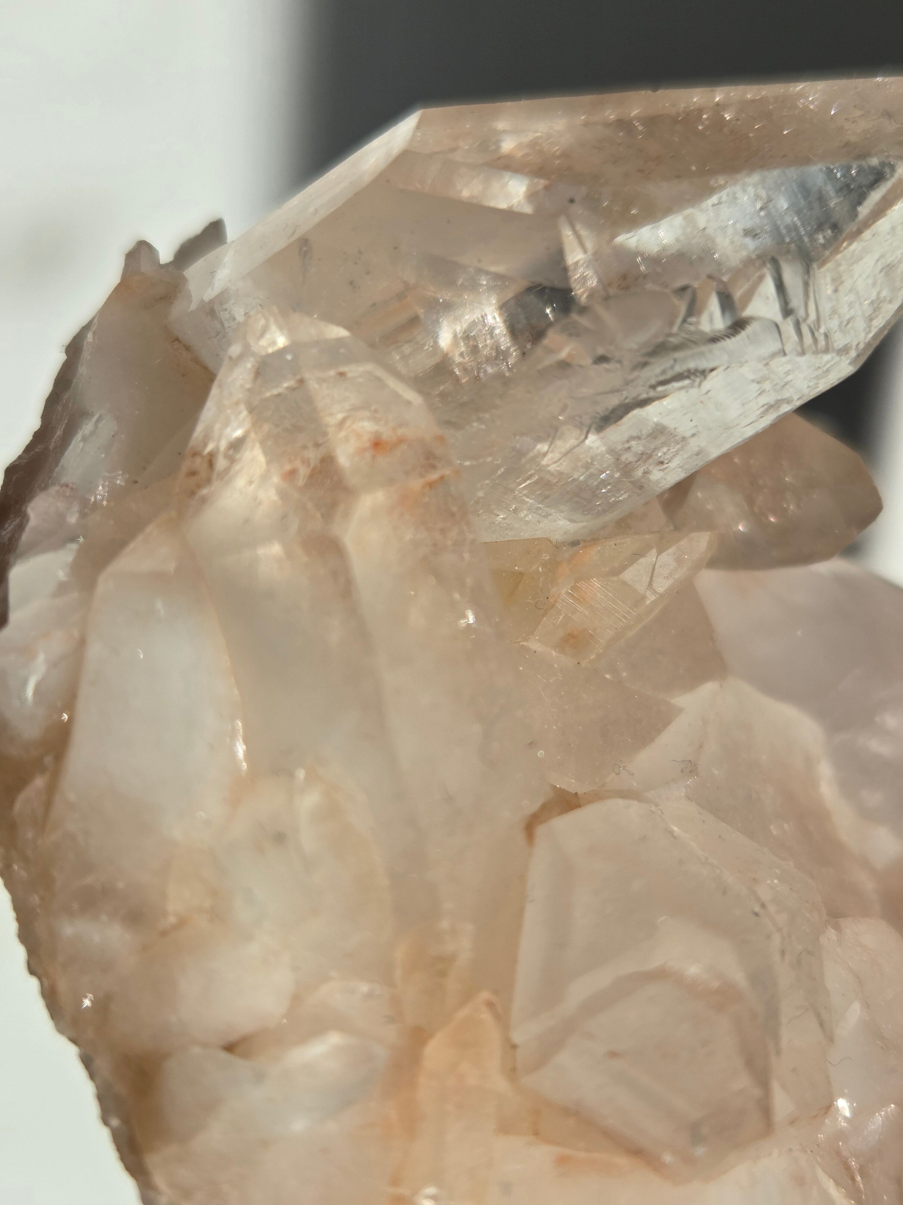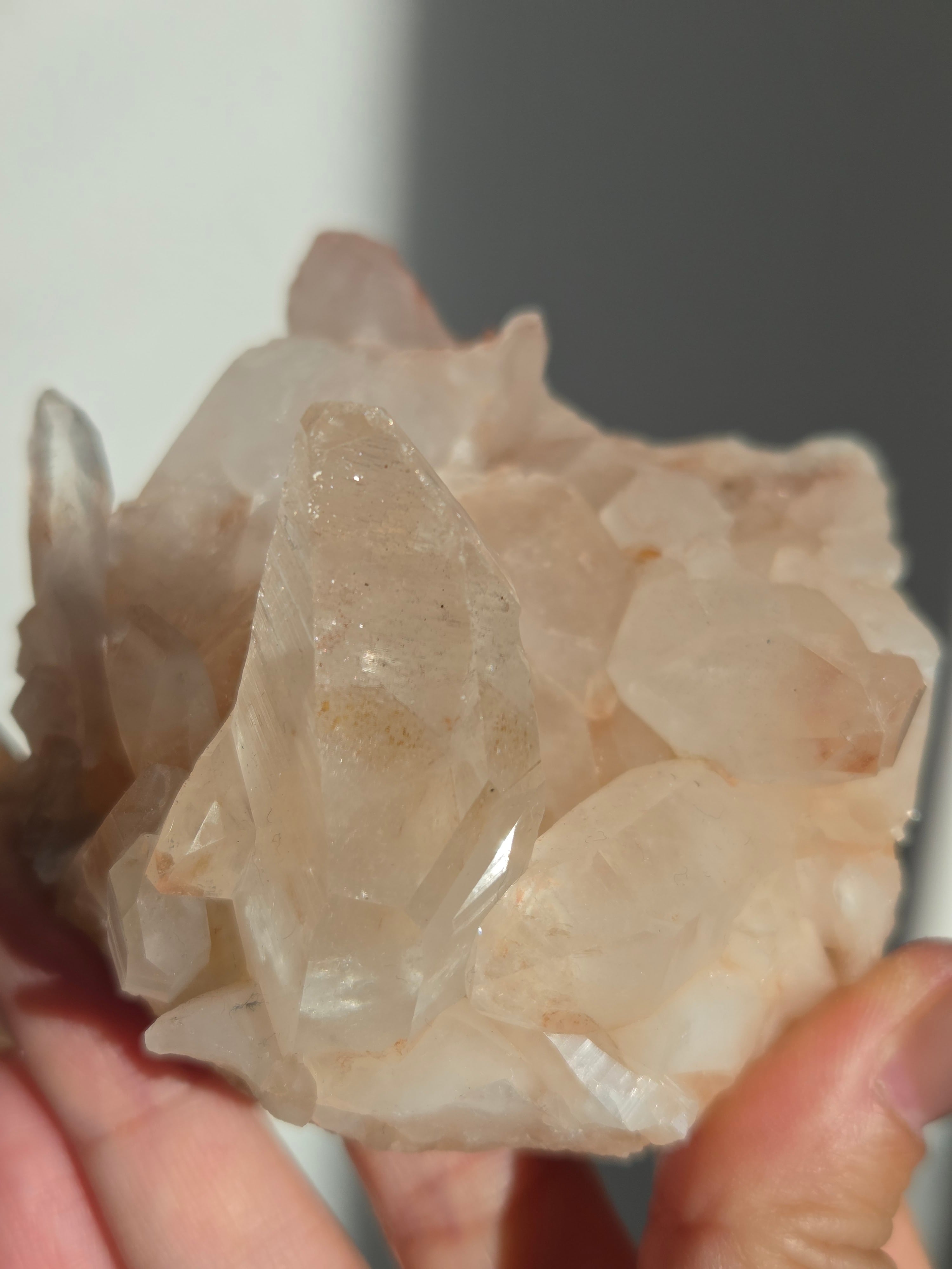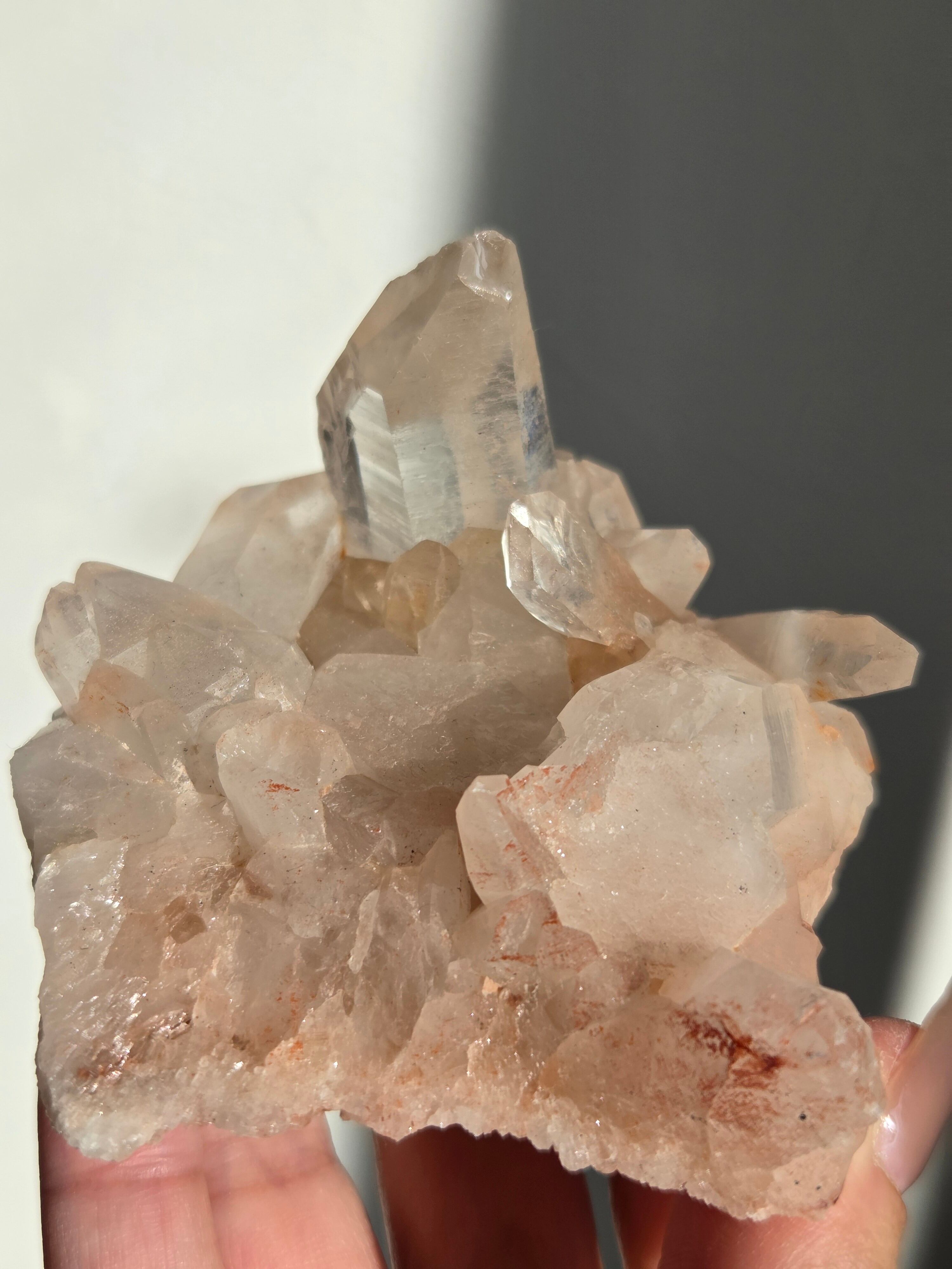 水晶と同じく二酸化ケイ素の鉱物で、6面体の結晶構造と尖った末端を持っていて、透明感のあるピンク色の結晶が集まって形作られています。