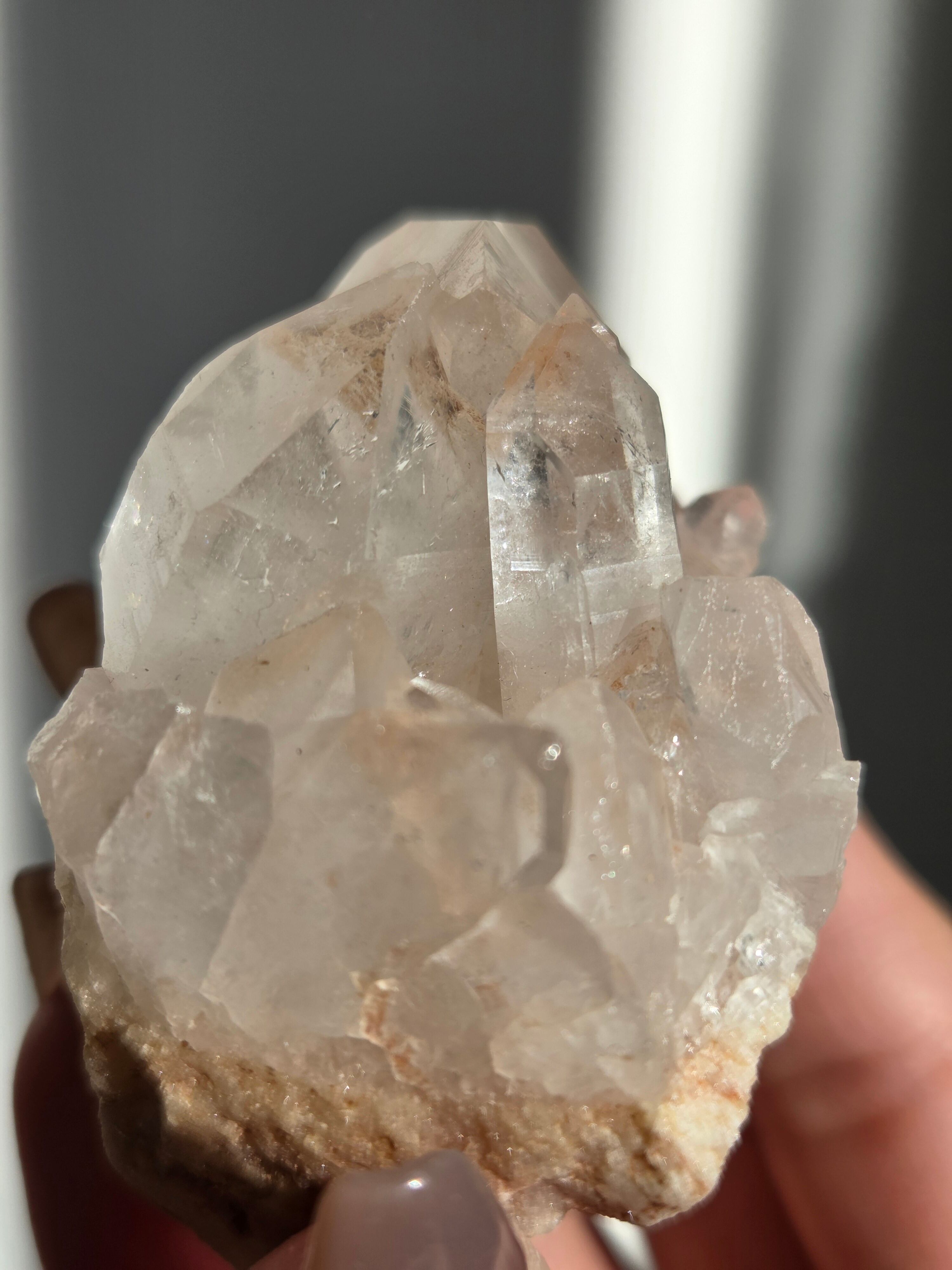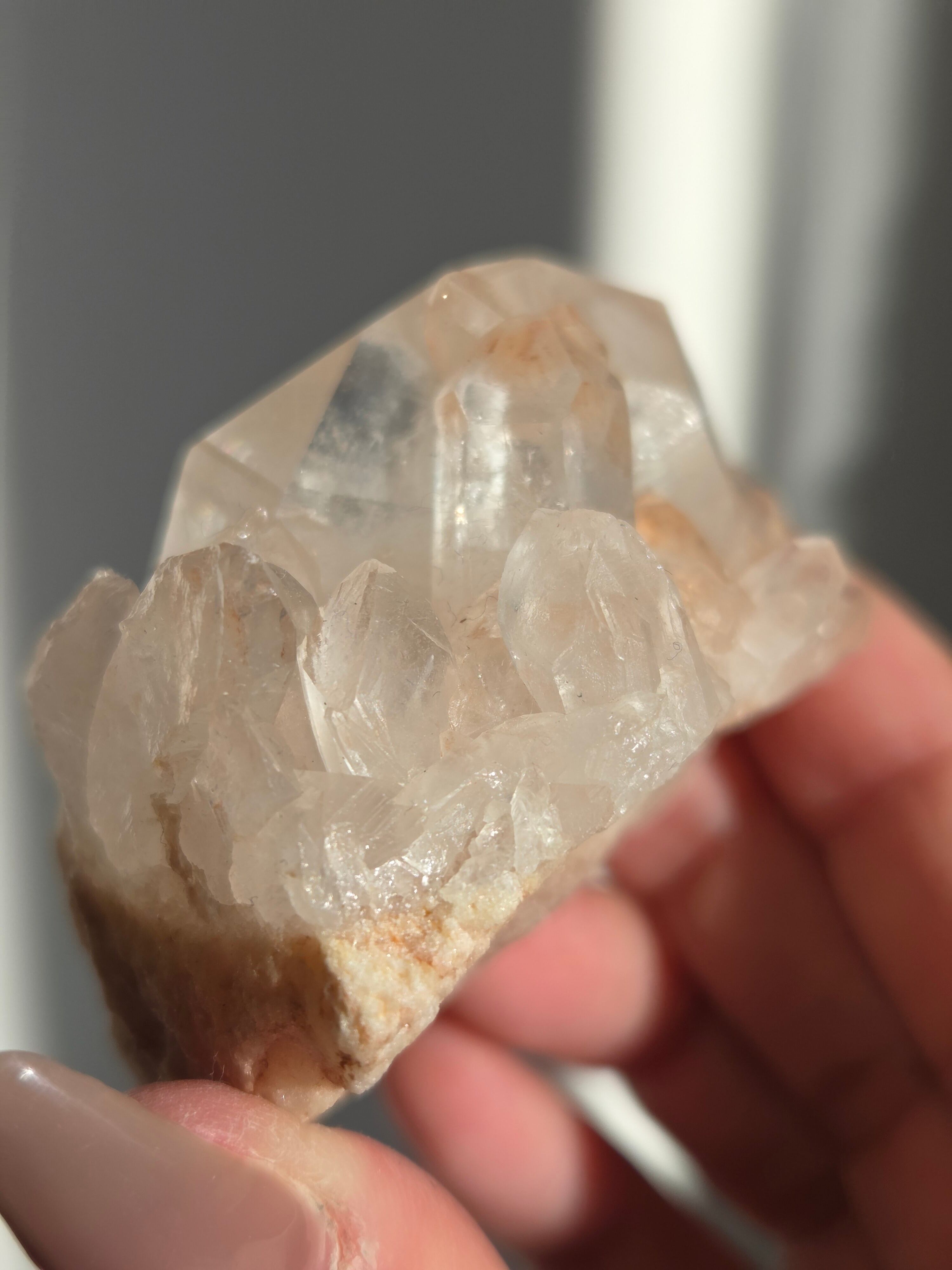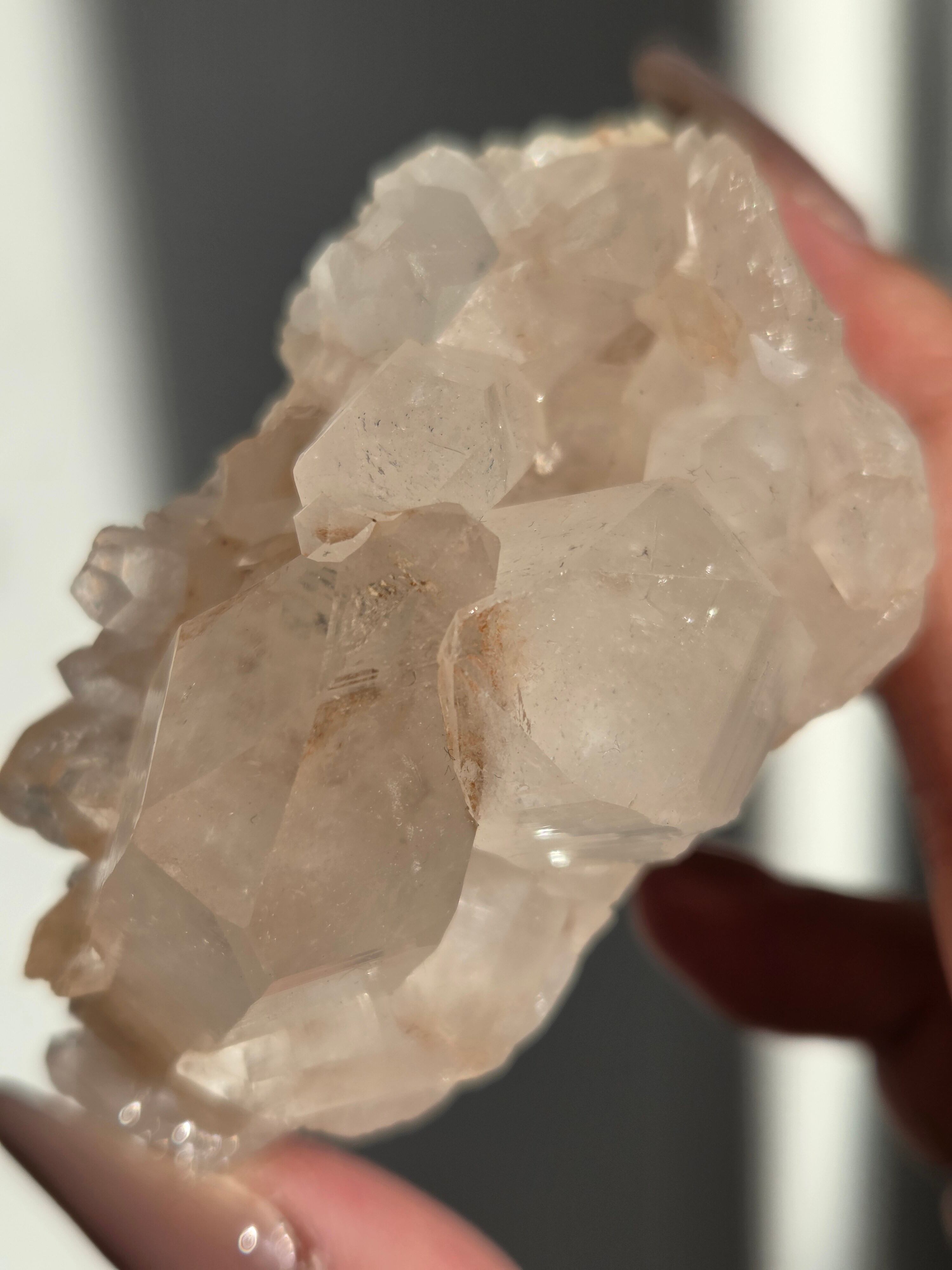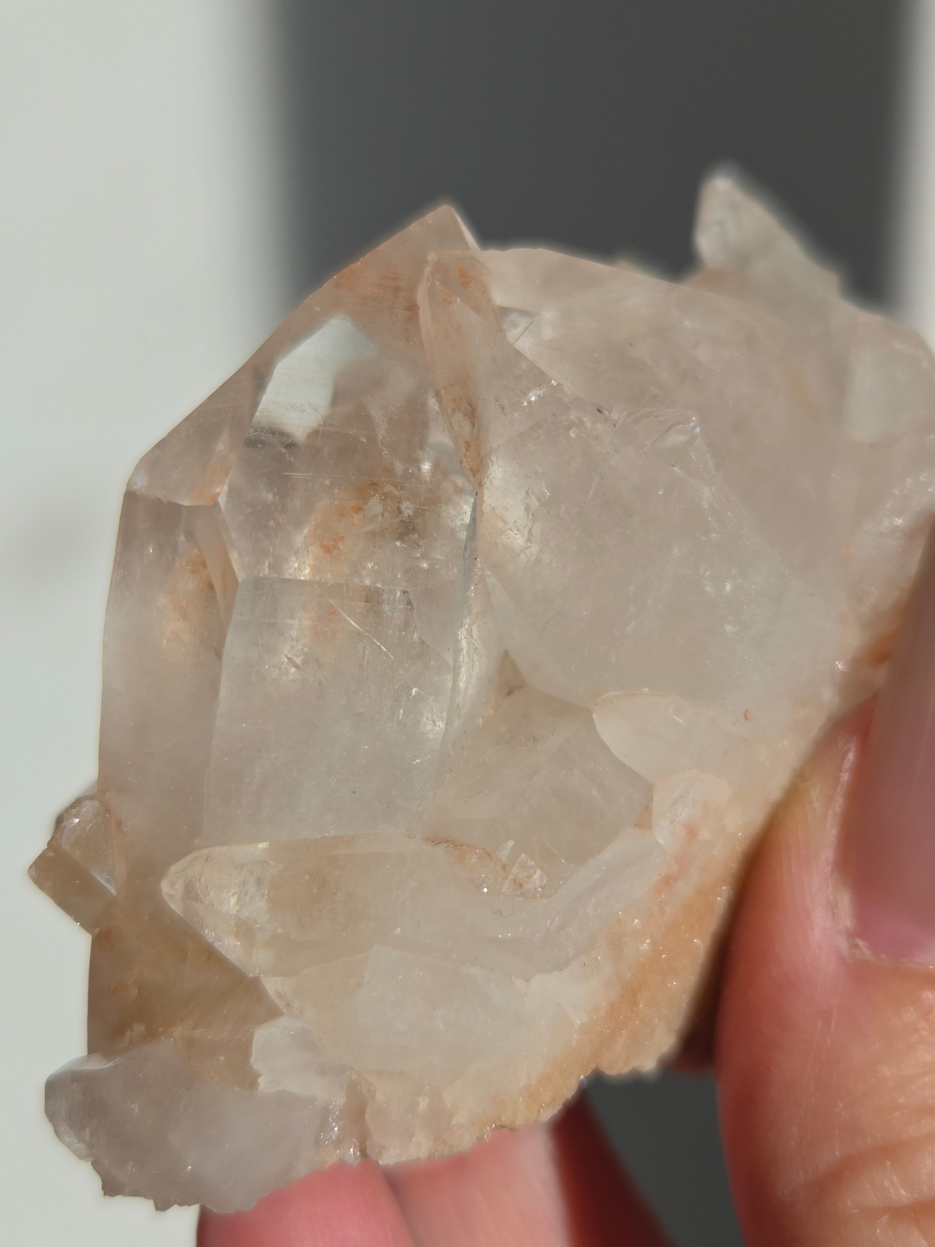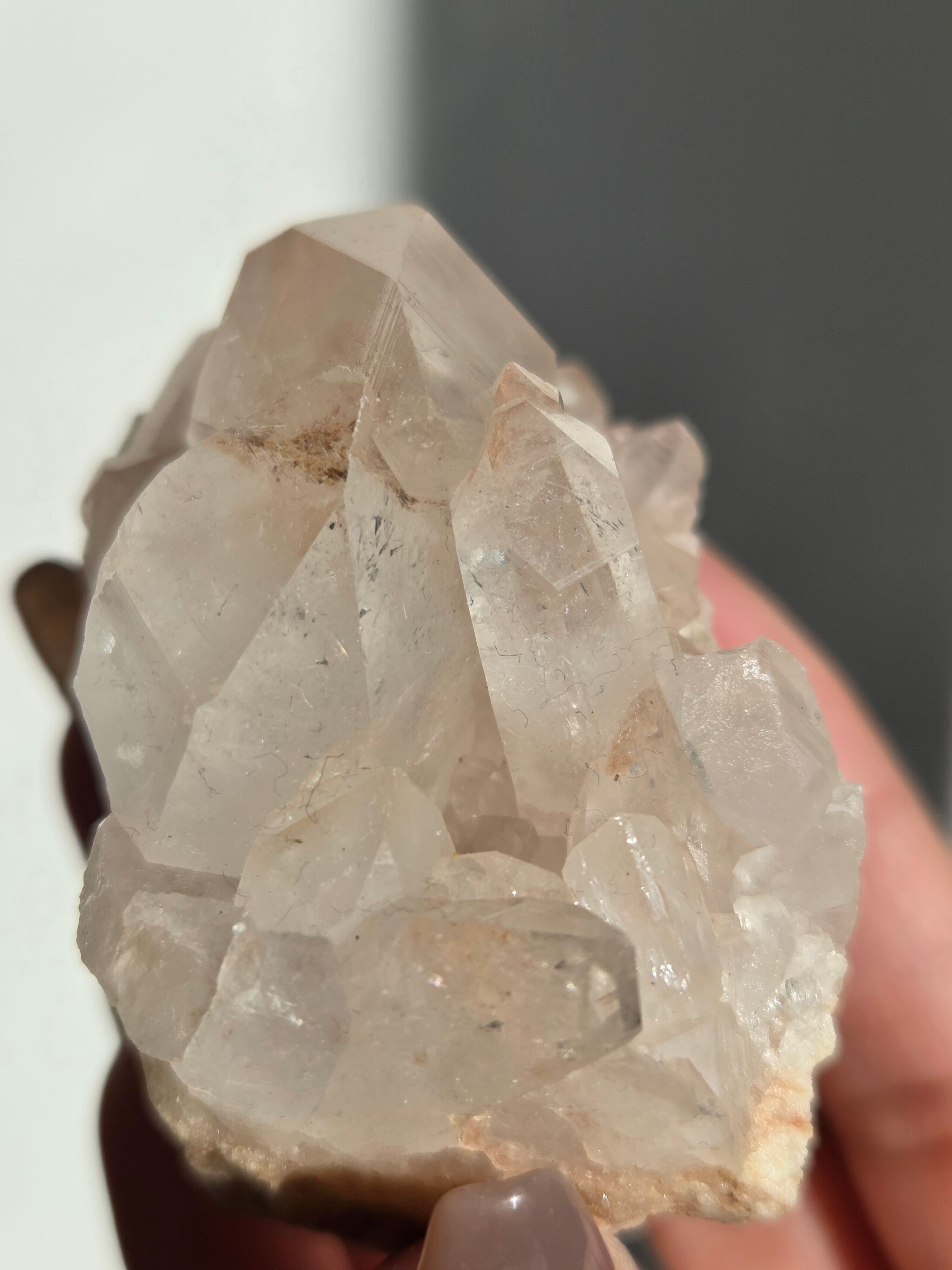 水晶と同じく二酸化ケイ素の鉱物で、6面体の結晶構造と尖った末端を持っていて、透明感のあるピンク色の結晶が集まって形作られています。