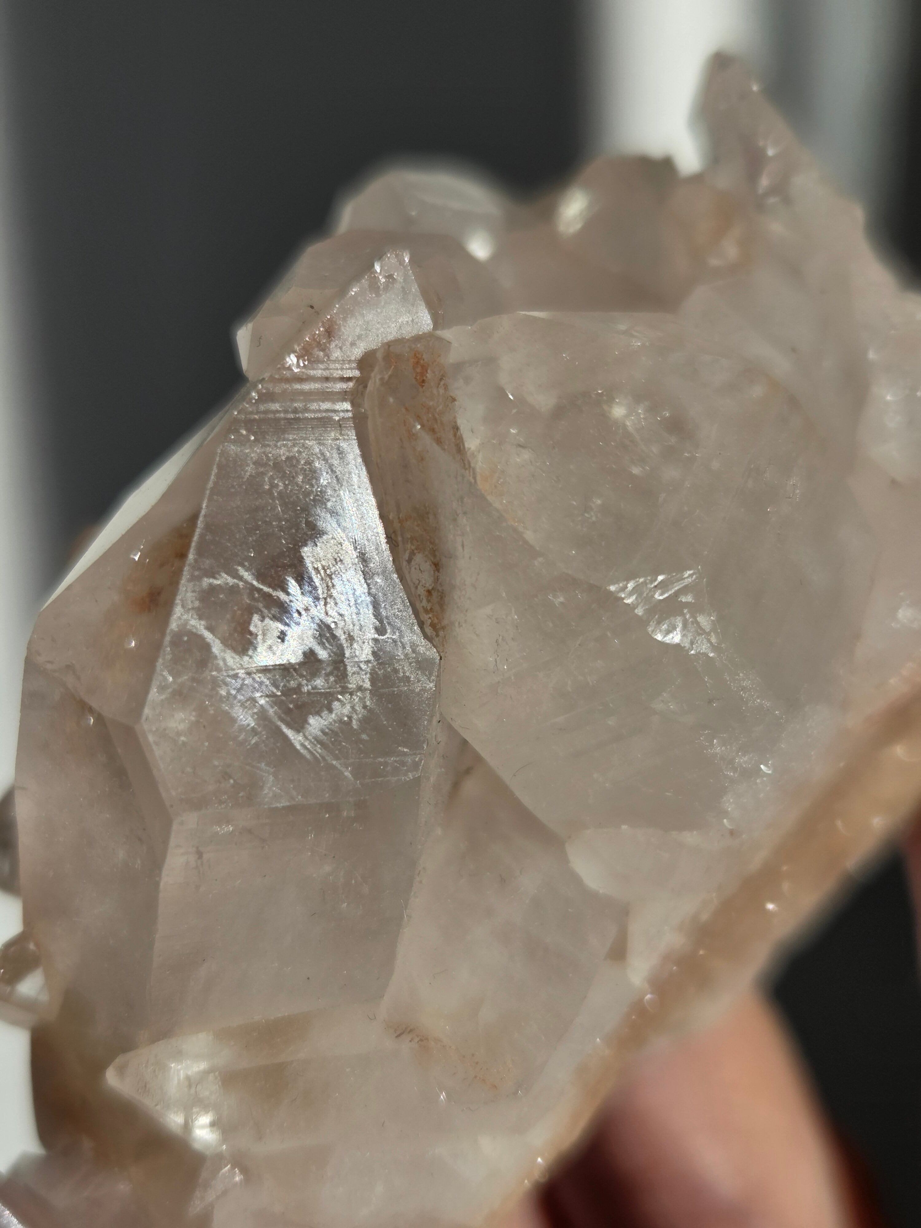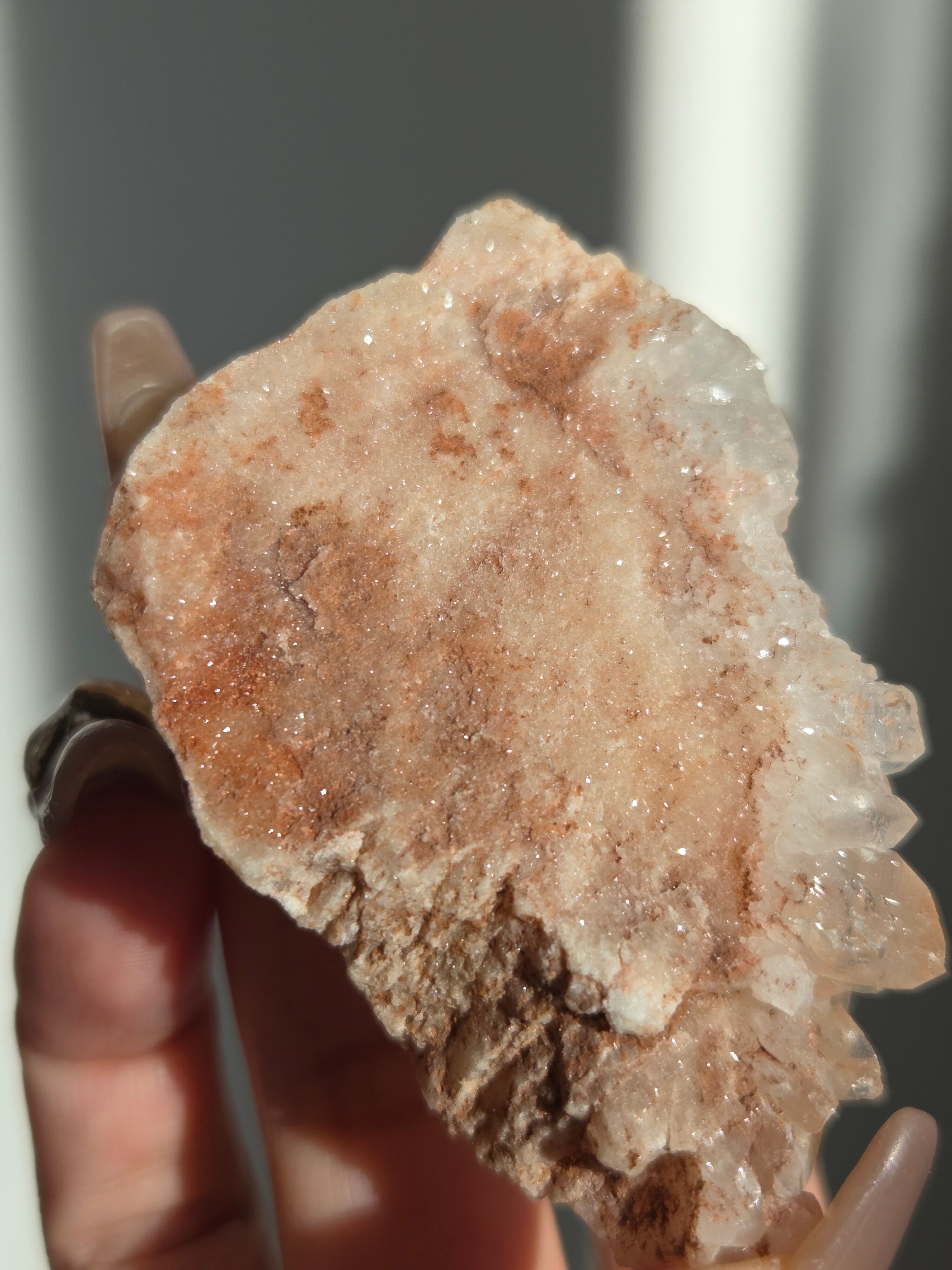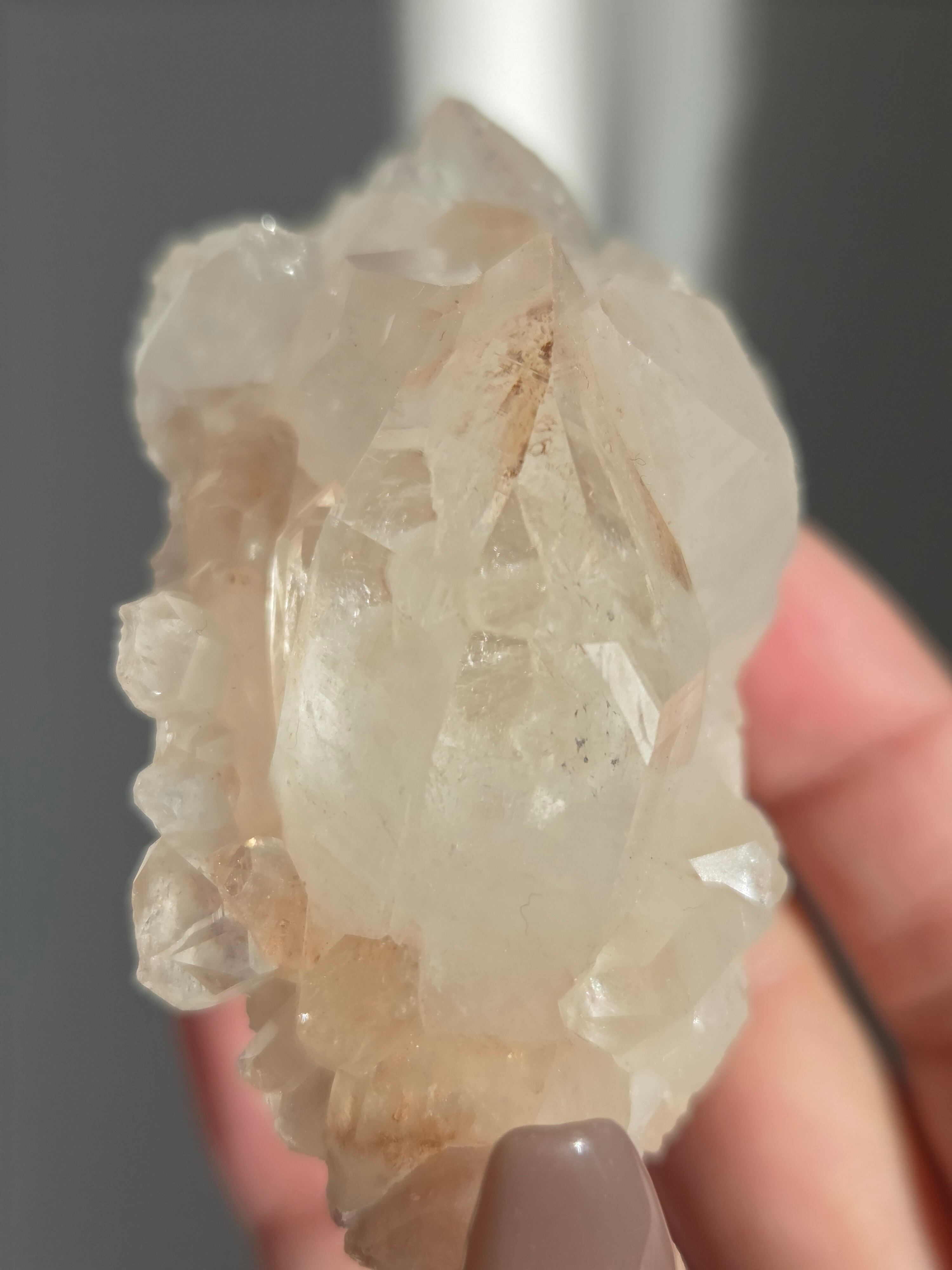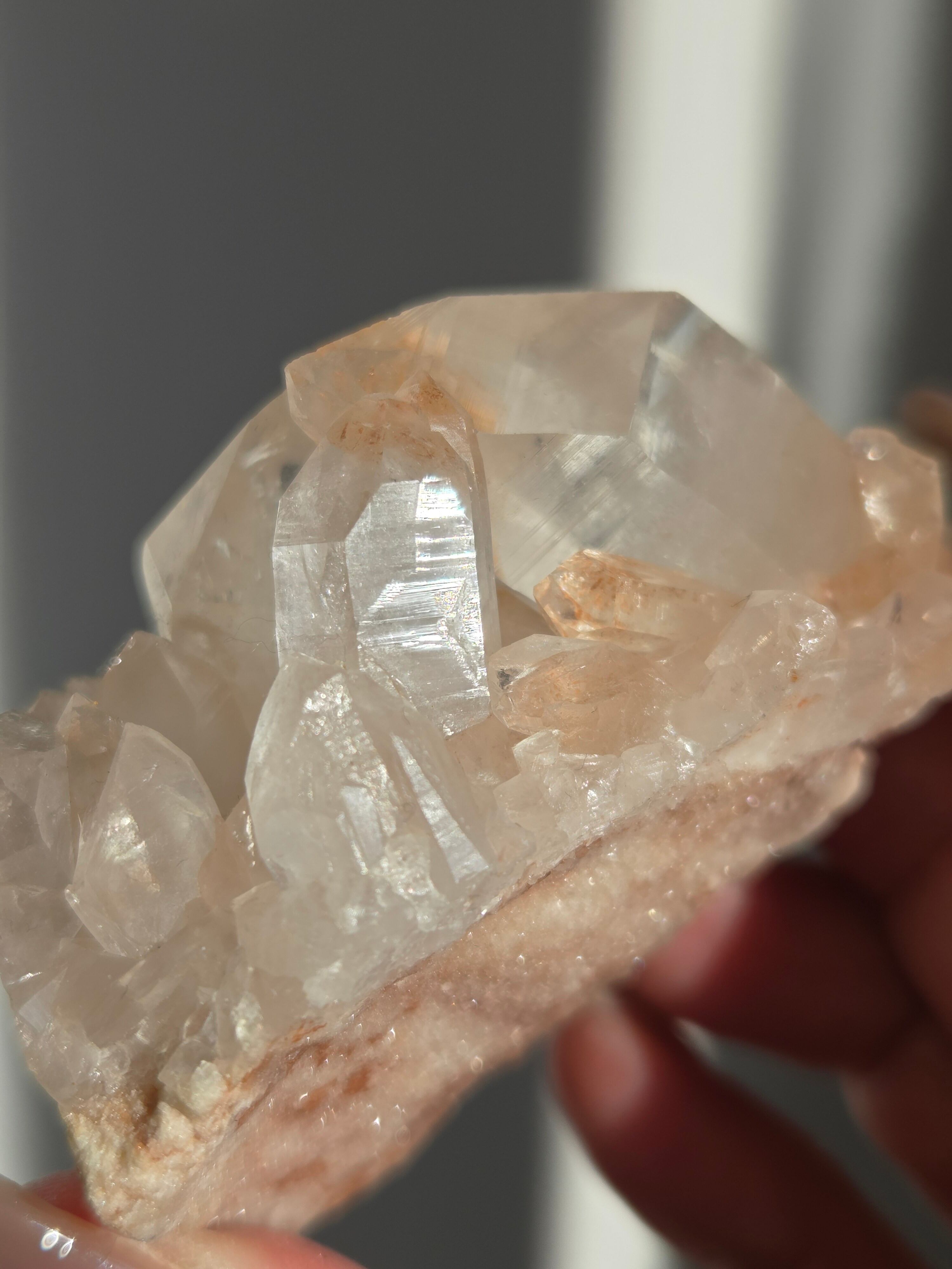 水晶と同じく二酸化ケイ素の鉱物で、6面体の結晶構造と尖った末端を持っていて、透明感のあるピンク色の結晶が集まって形作られています。