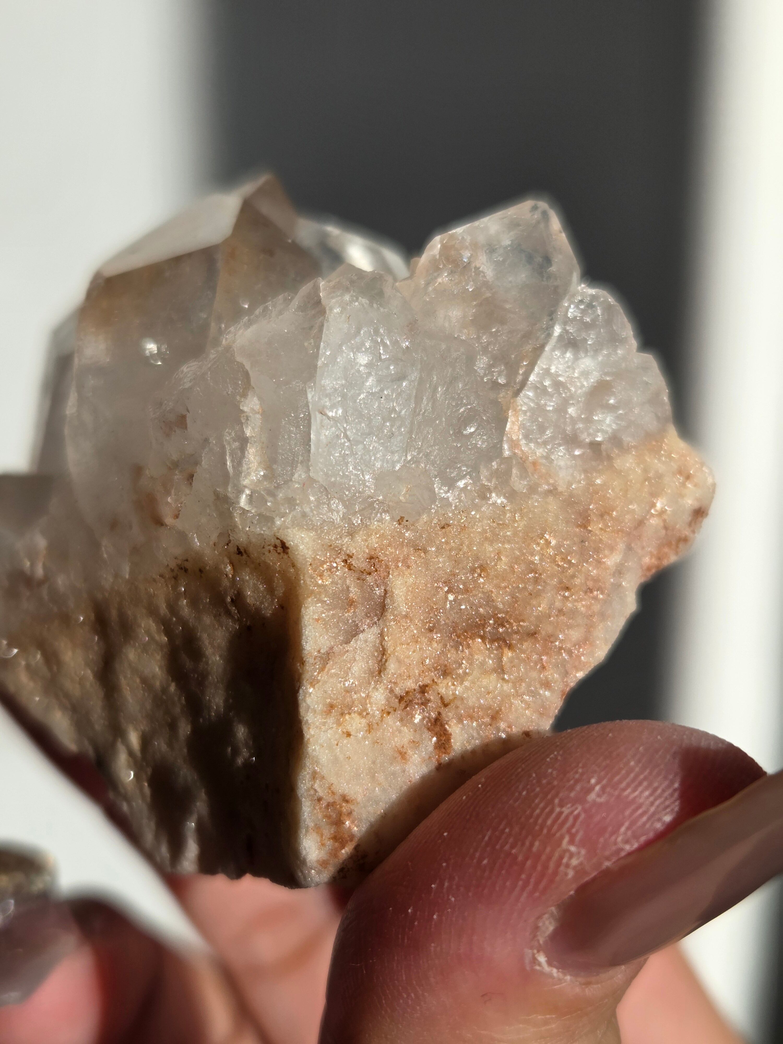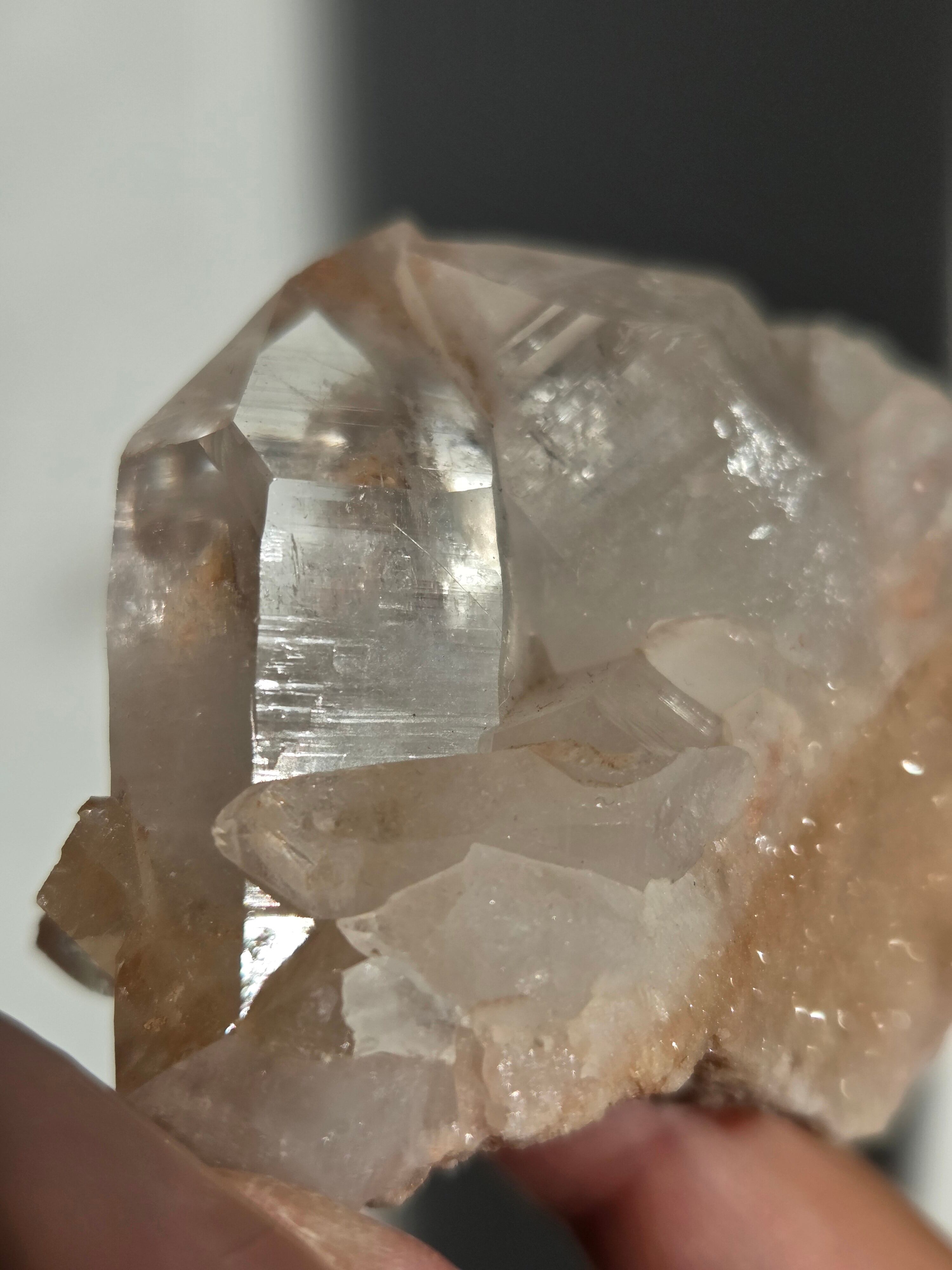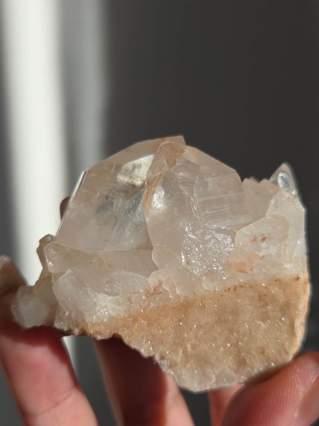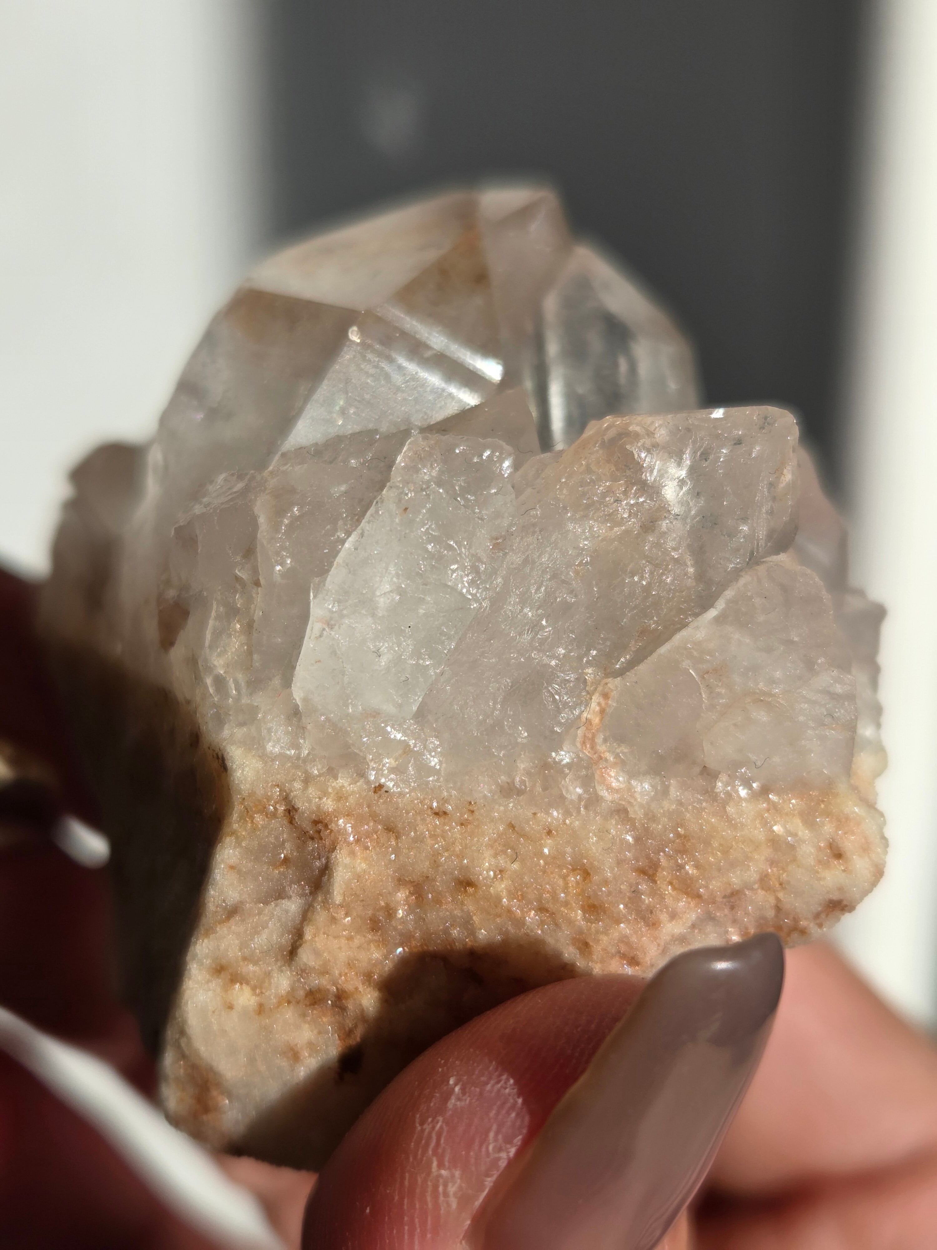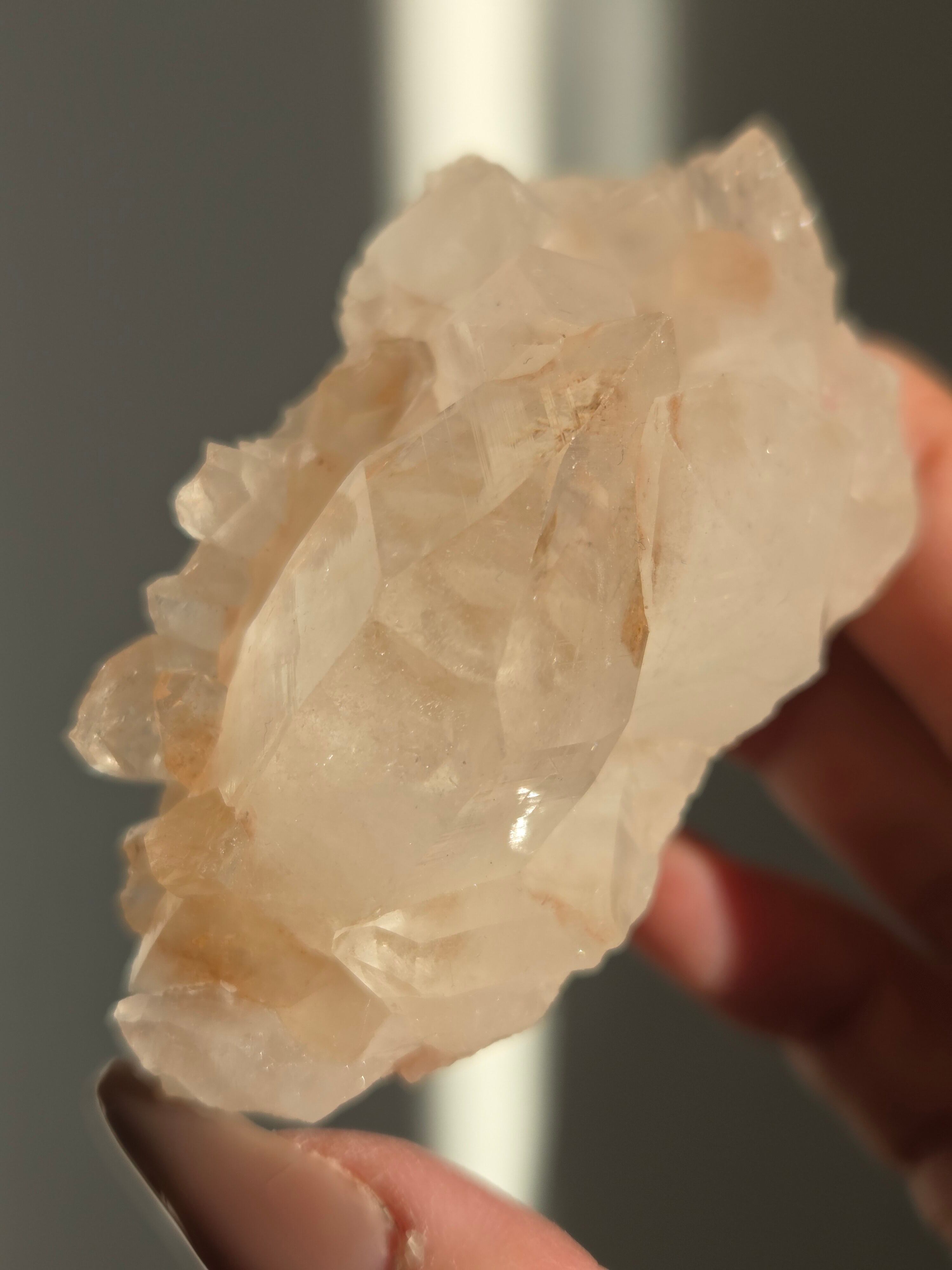 水晶と同じく二酸化ケイ素の鉱物で、6面体の結晶構造と尖った末端を持っていて、透明感のあるピンク色の結晶が集まって形作られています。