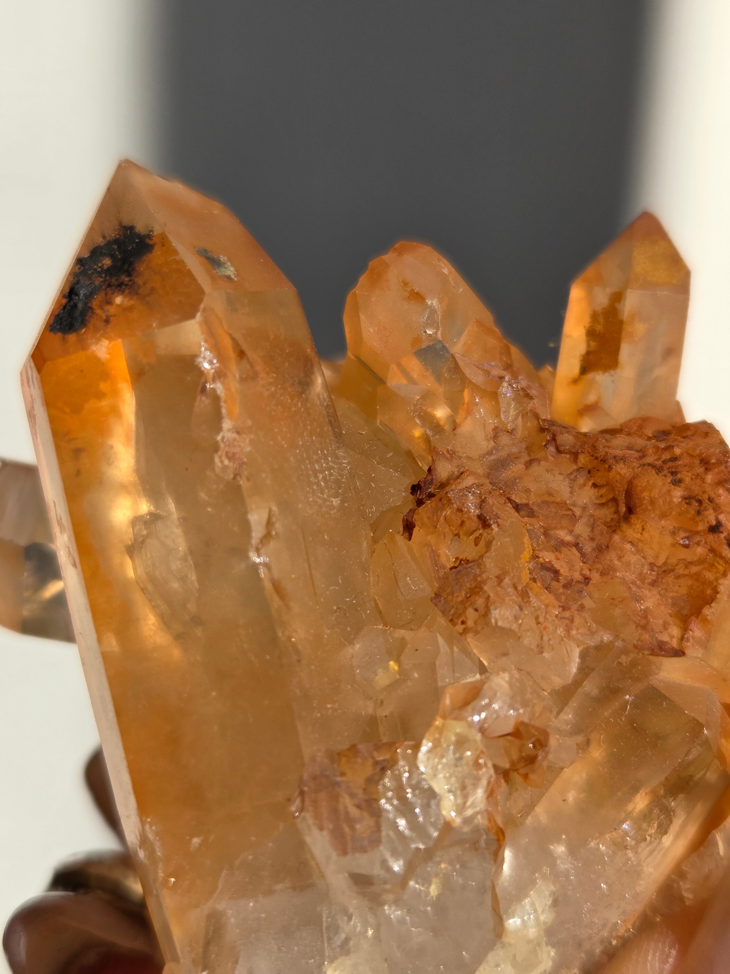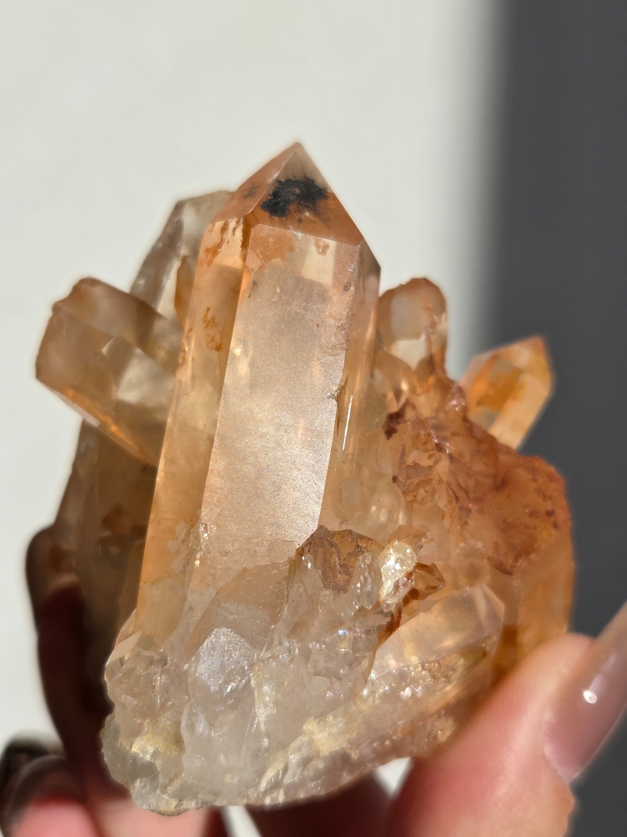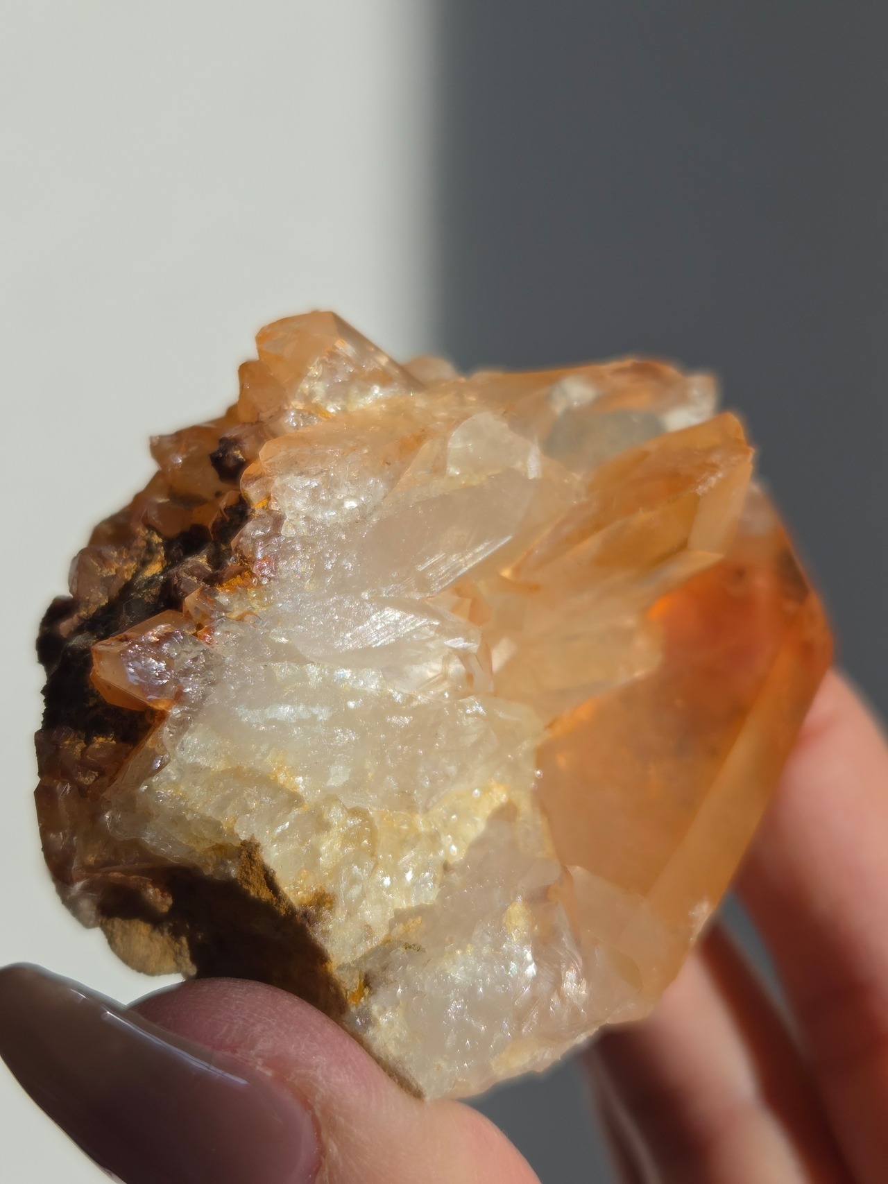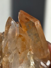 タンジェリンクォーツは、表面にヘマタイト成分が付着し、それが酸化してオレンジ色になった水晶です。表面は美しいオレンジ色をしていますが、中身は透明な水晶です。