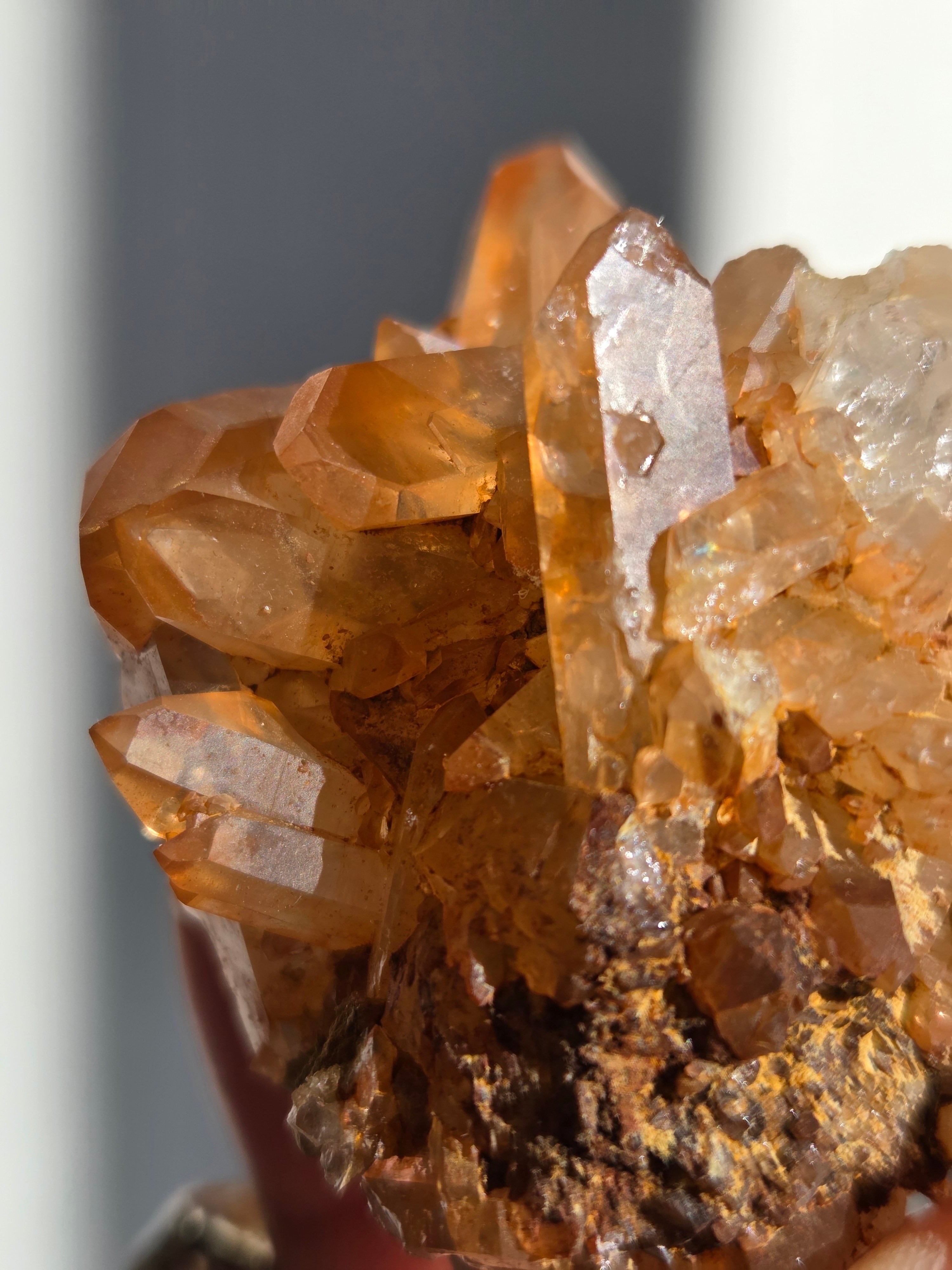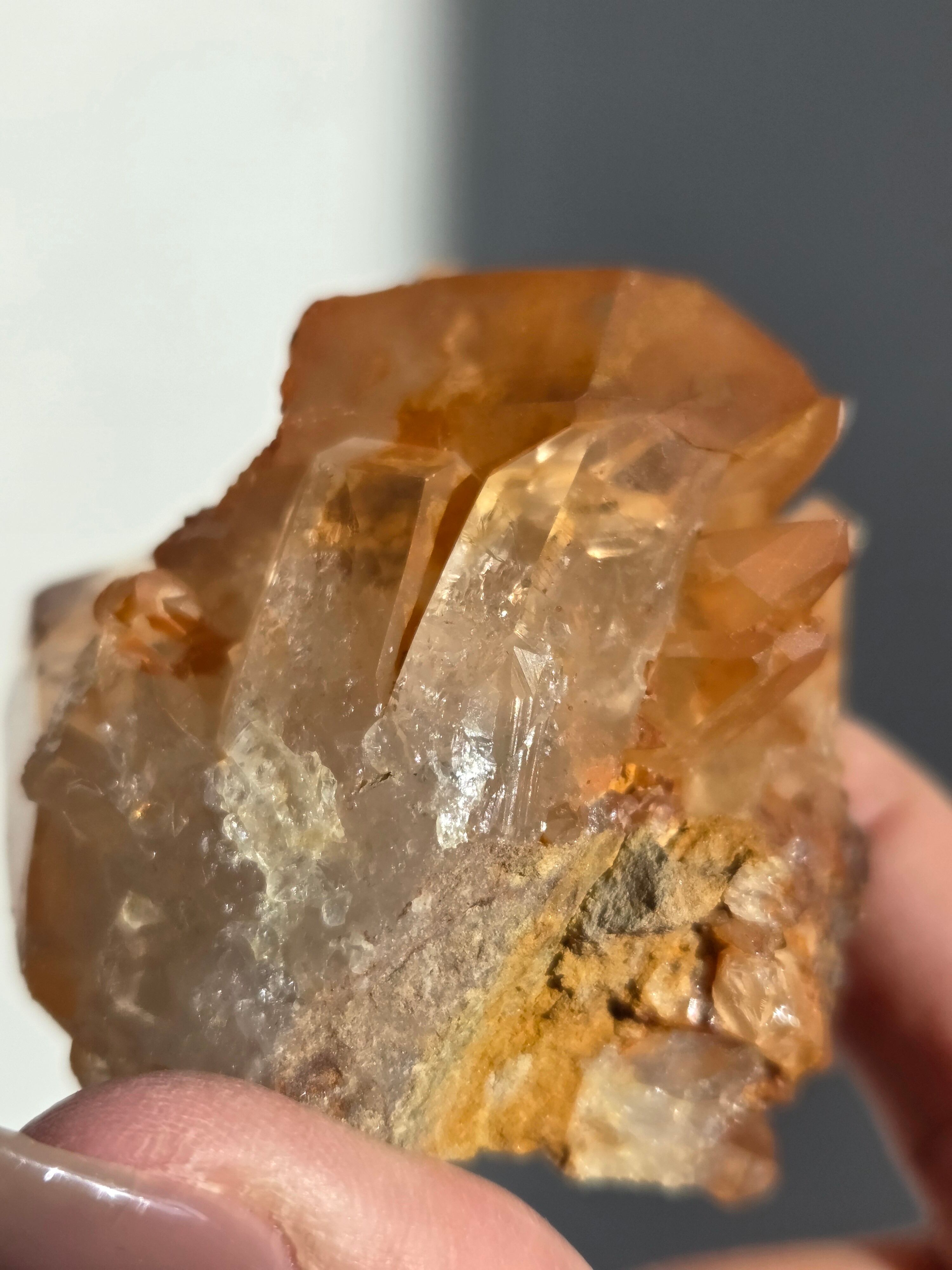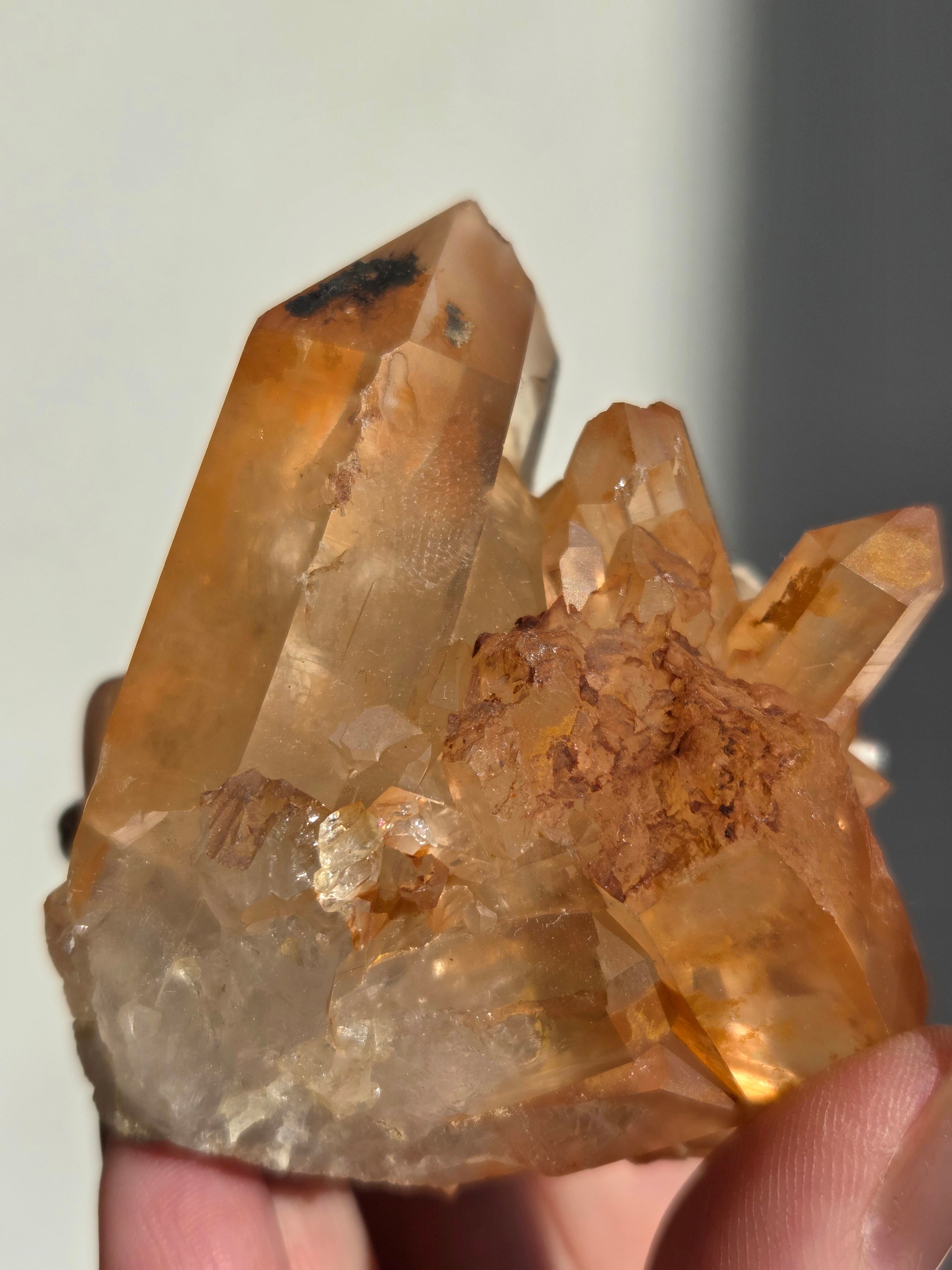 タンジェリンクォーツは、表面にヘマタイト成分が付着し、それが酸化してオレンジ色になった水晶です。表面は美しいオレンジ色をしていますが、中身は透明な水晶です。
