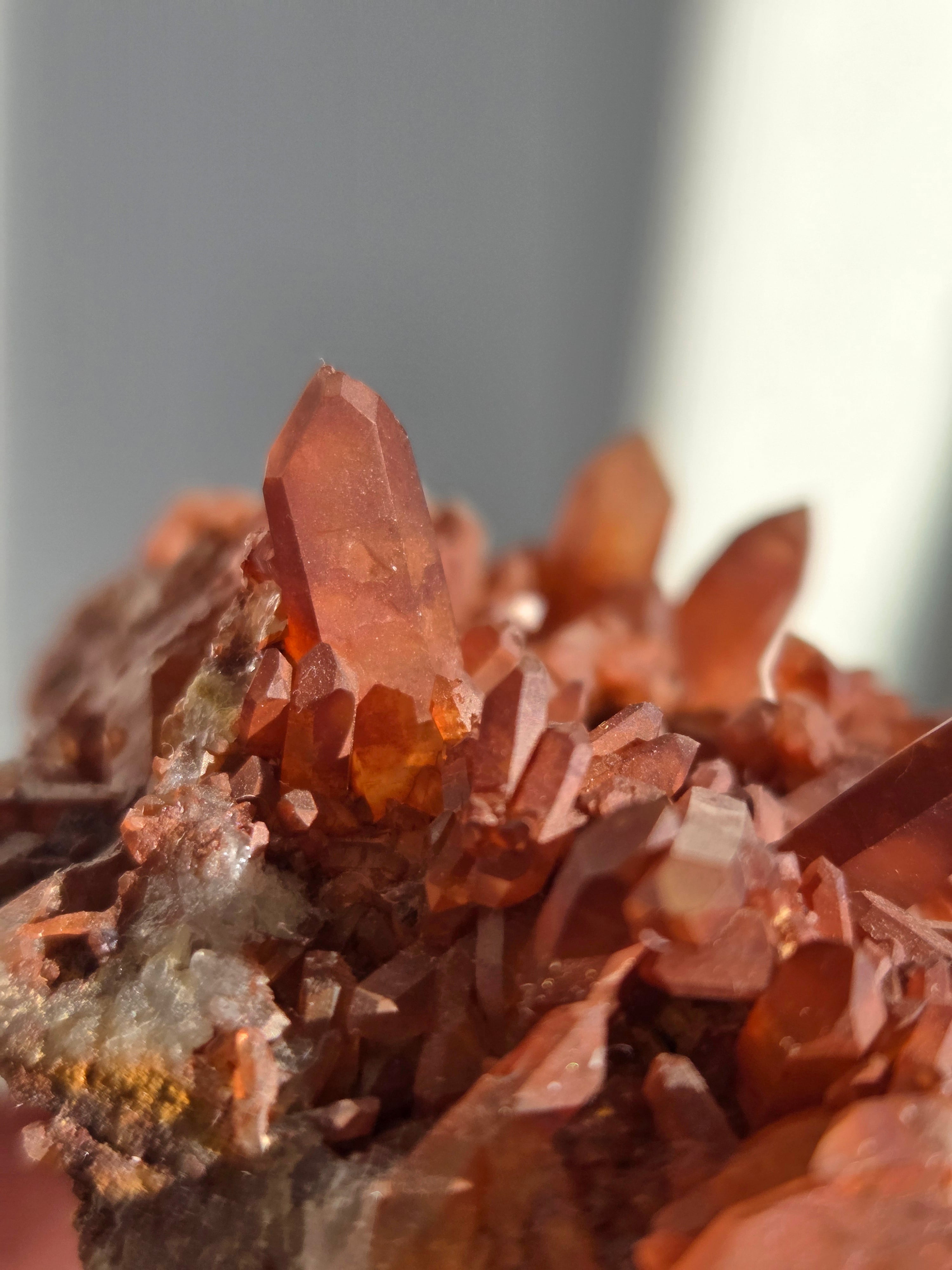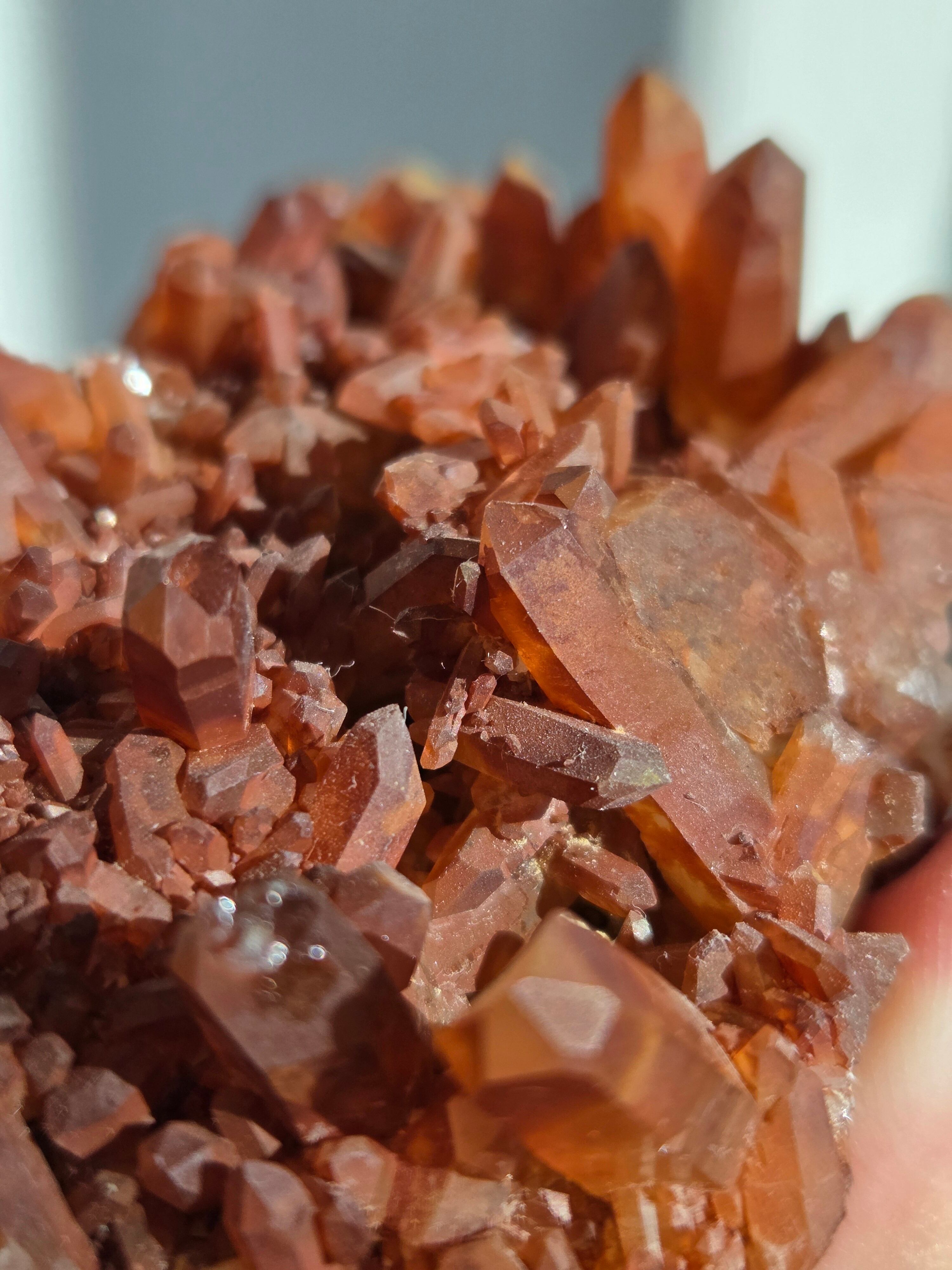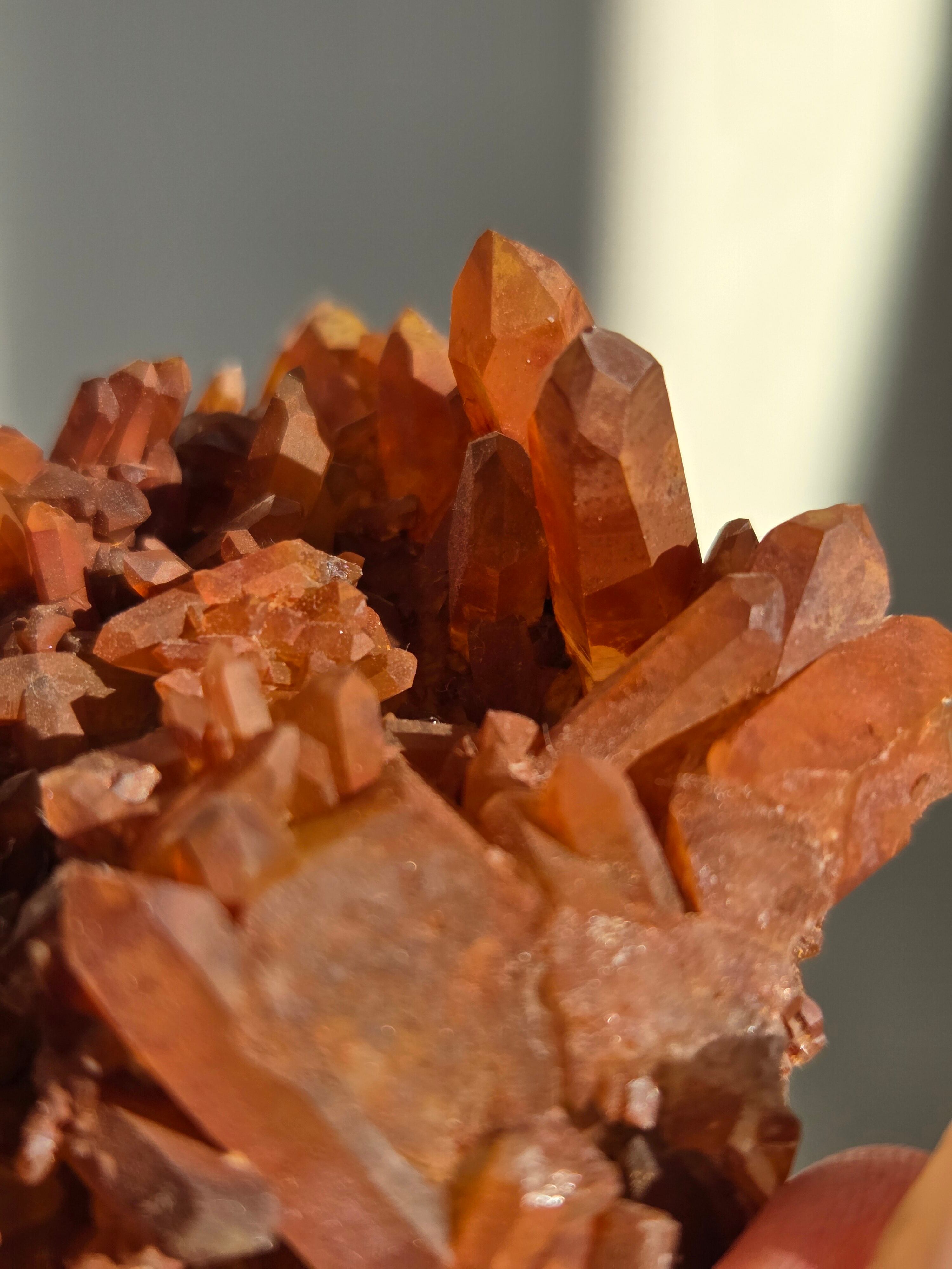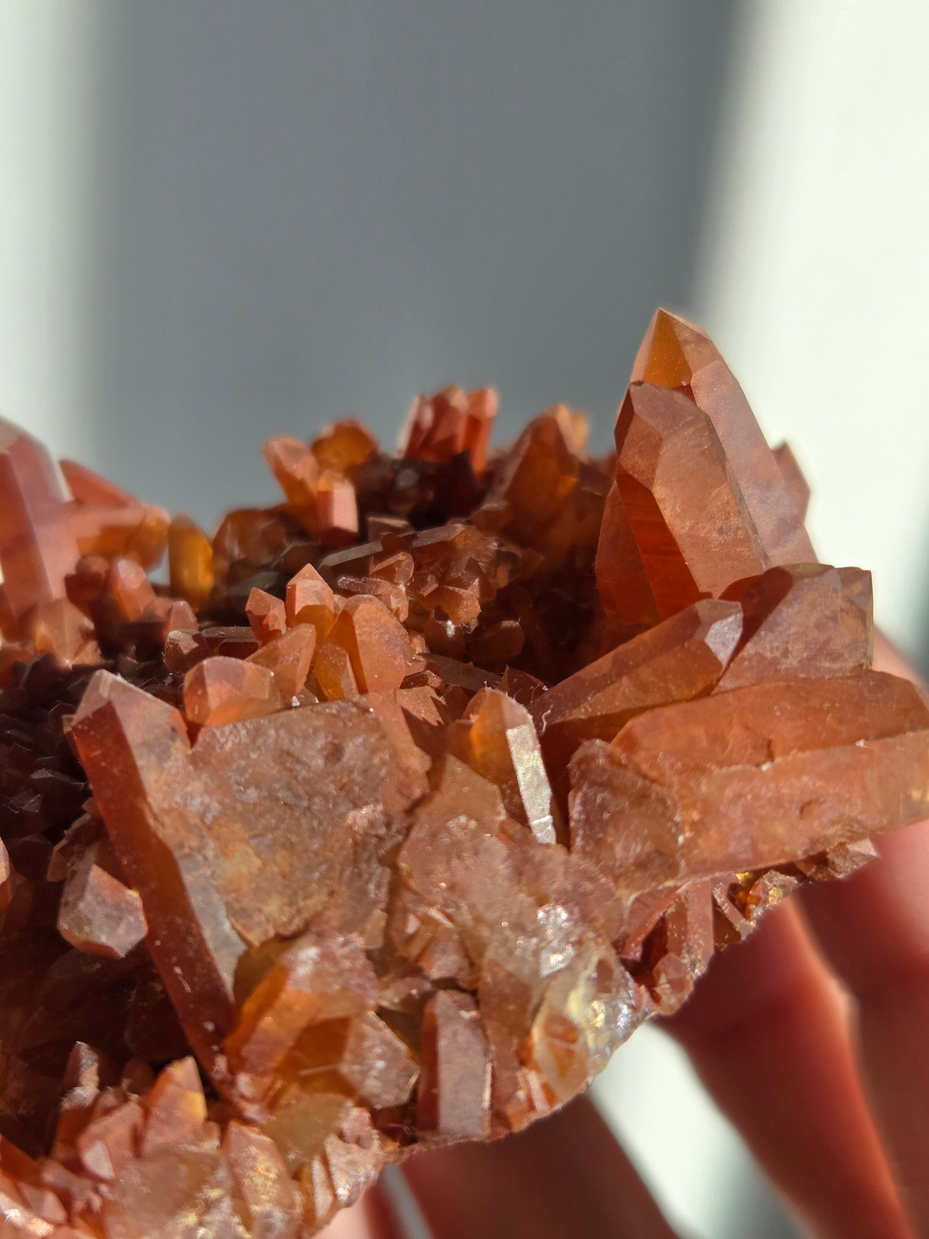 タンジェリンクォーツは、表面にヘマタイト成分が付着し、それが酸化してオレンジ色になった水晶です。表面は美しいオレンジ色をしていますが、中身は透明な水晶です。