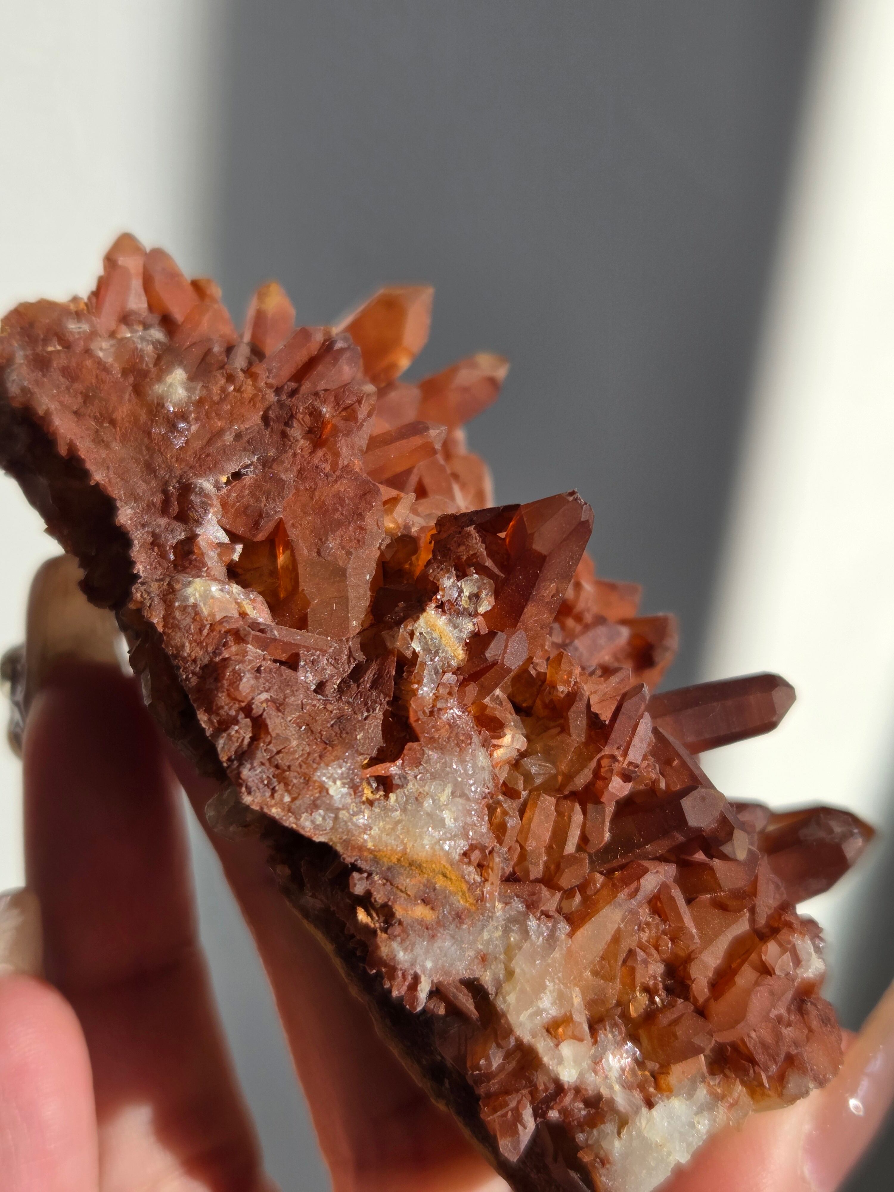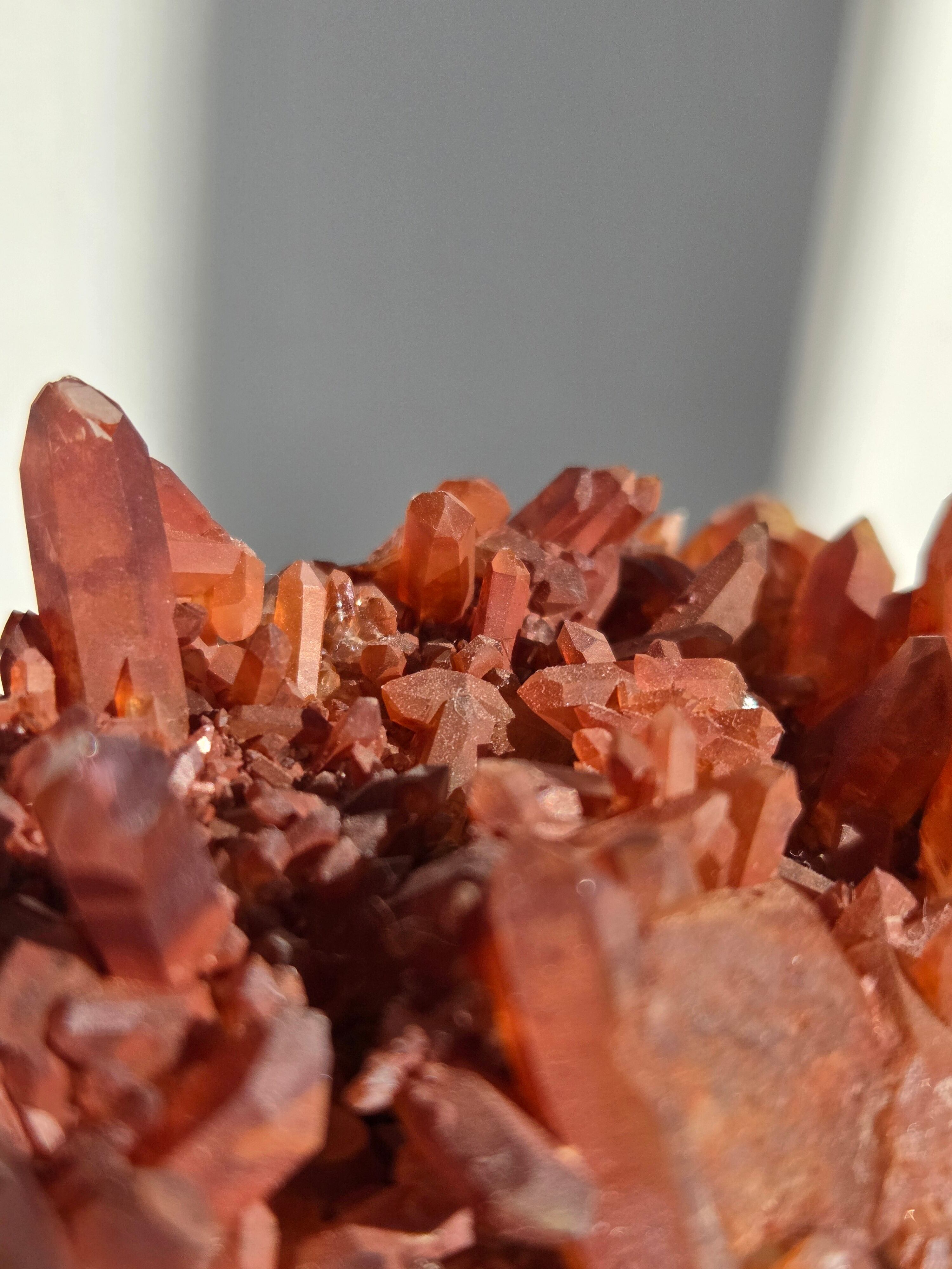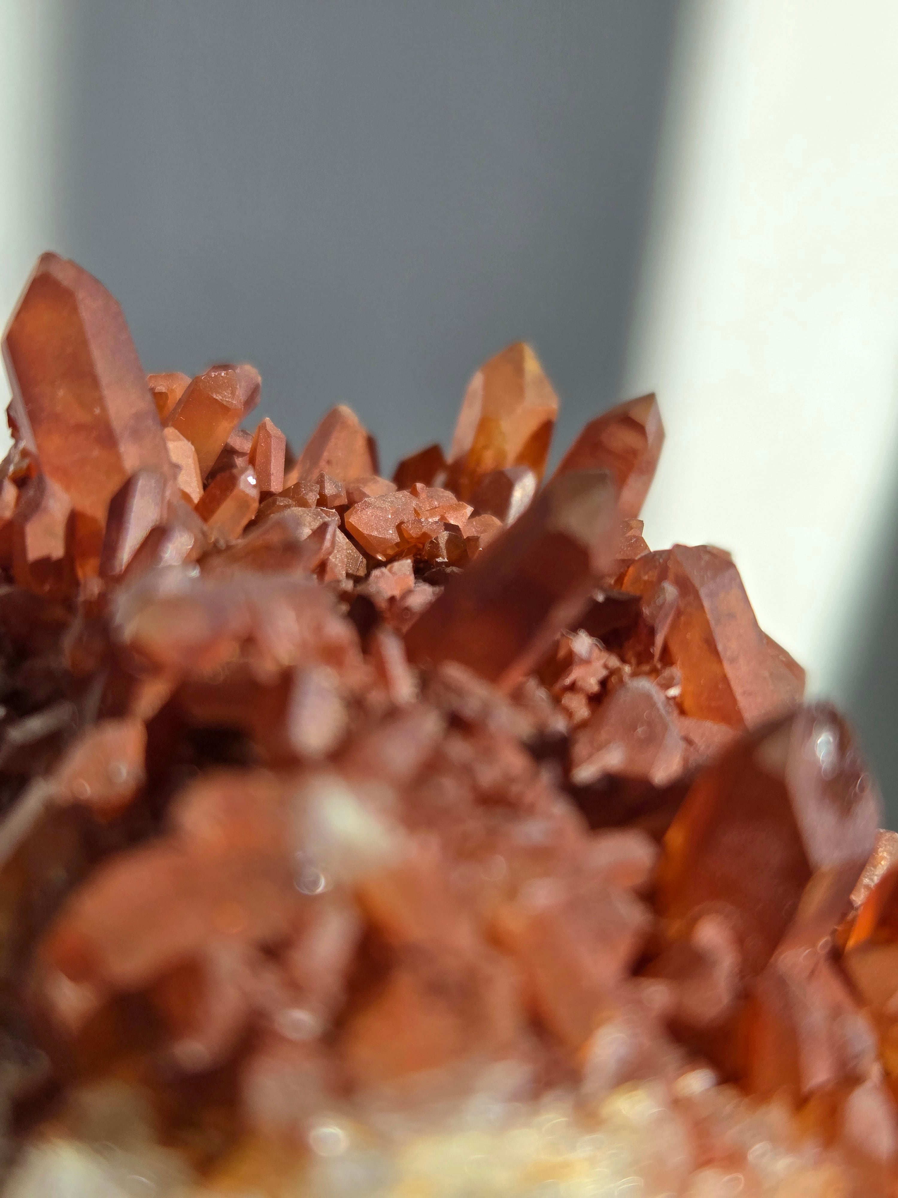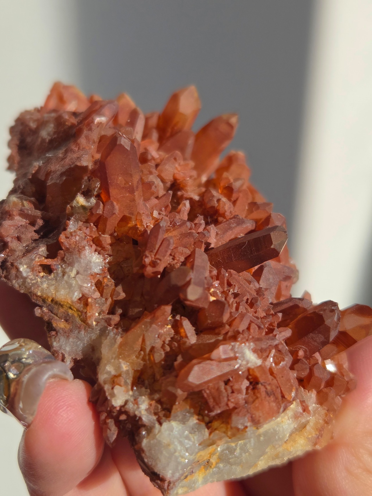 タンジェリンクォーツは、表面にヘマタイト成分が付着し、それが酸化してオレンジ色になった水晶です。表面は美しいオレンジ色をしていますが、中身は透明な水晶です。
