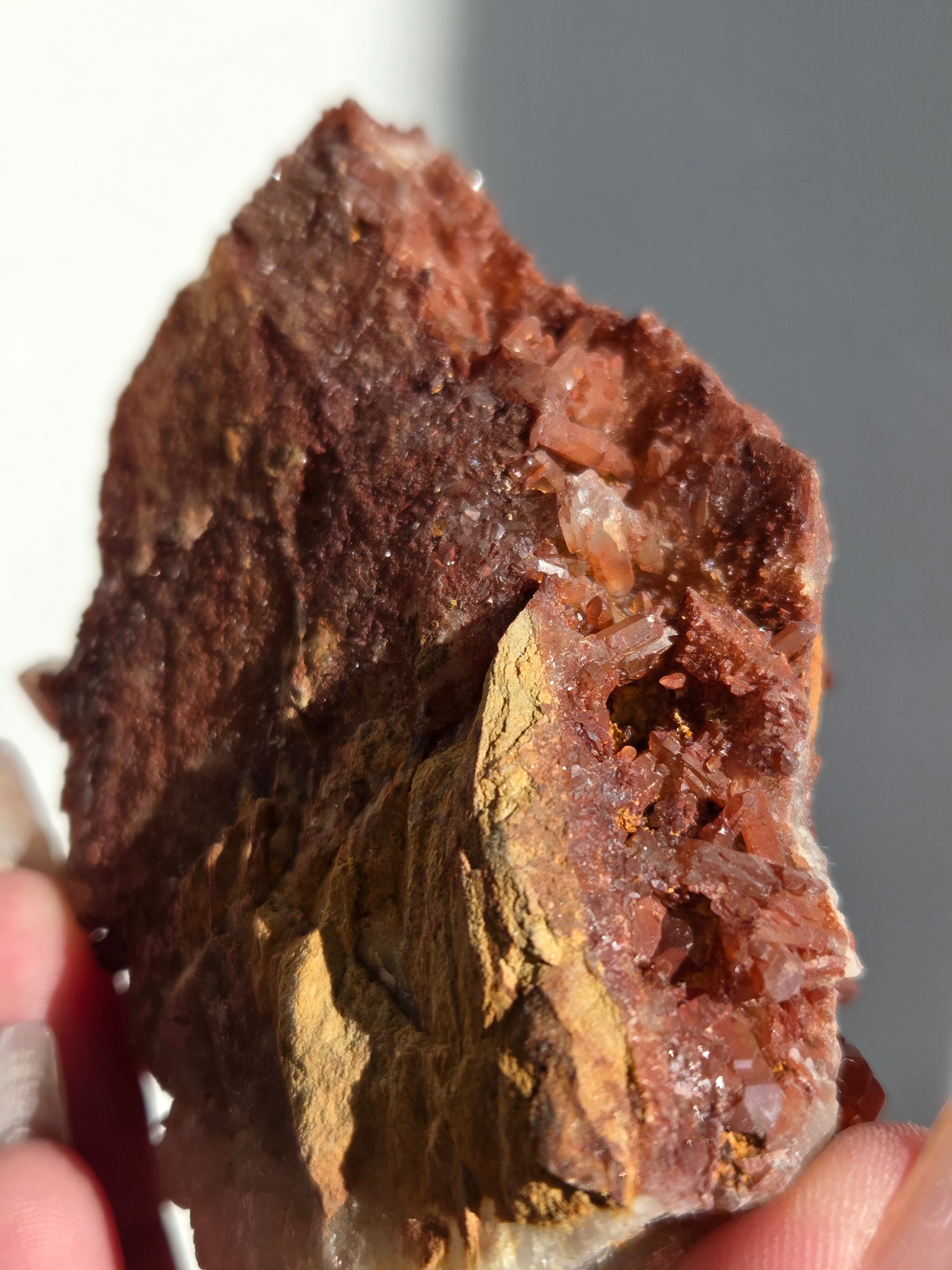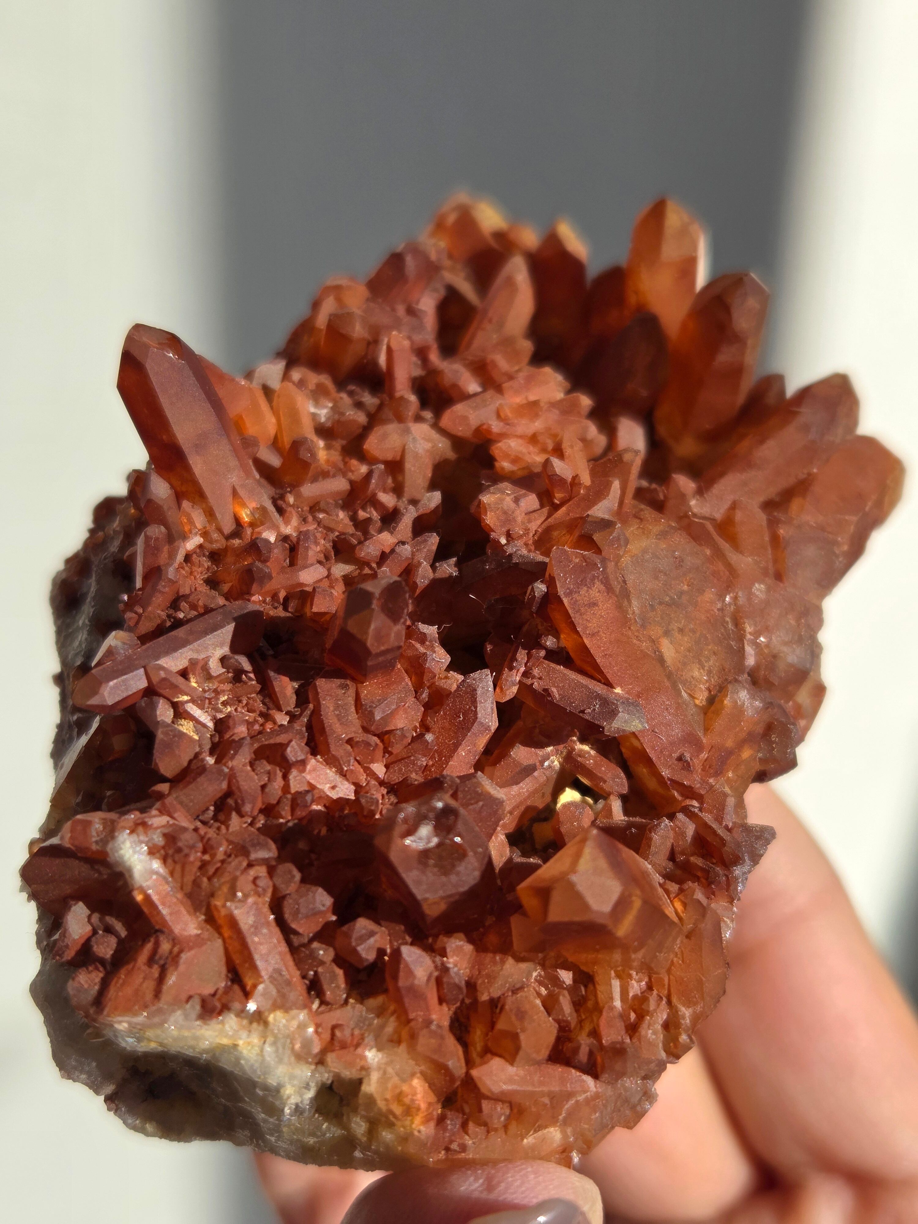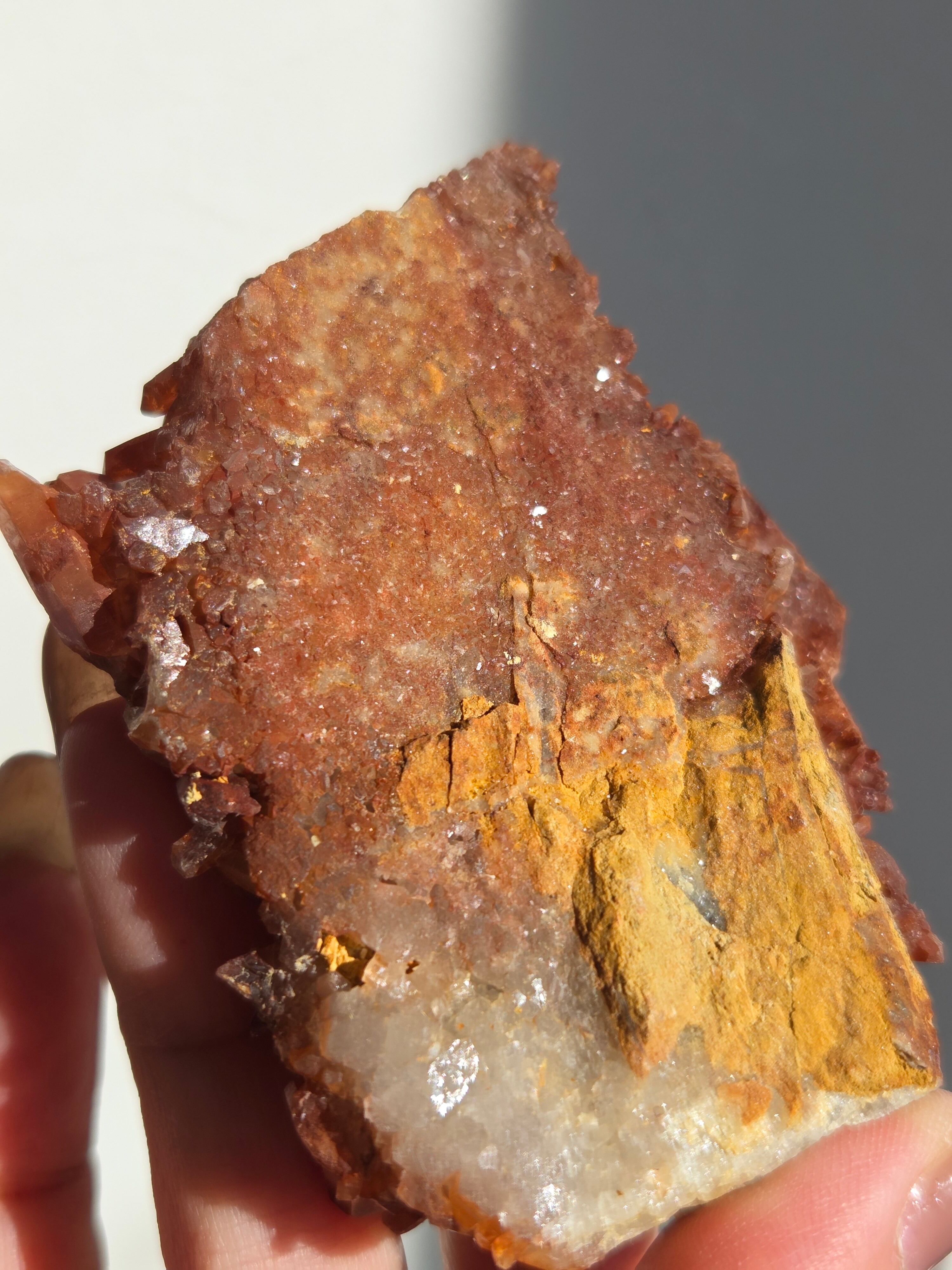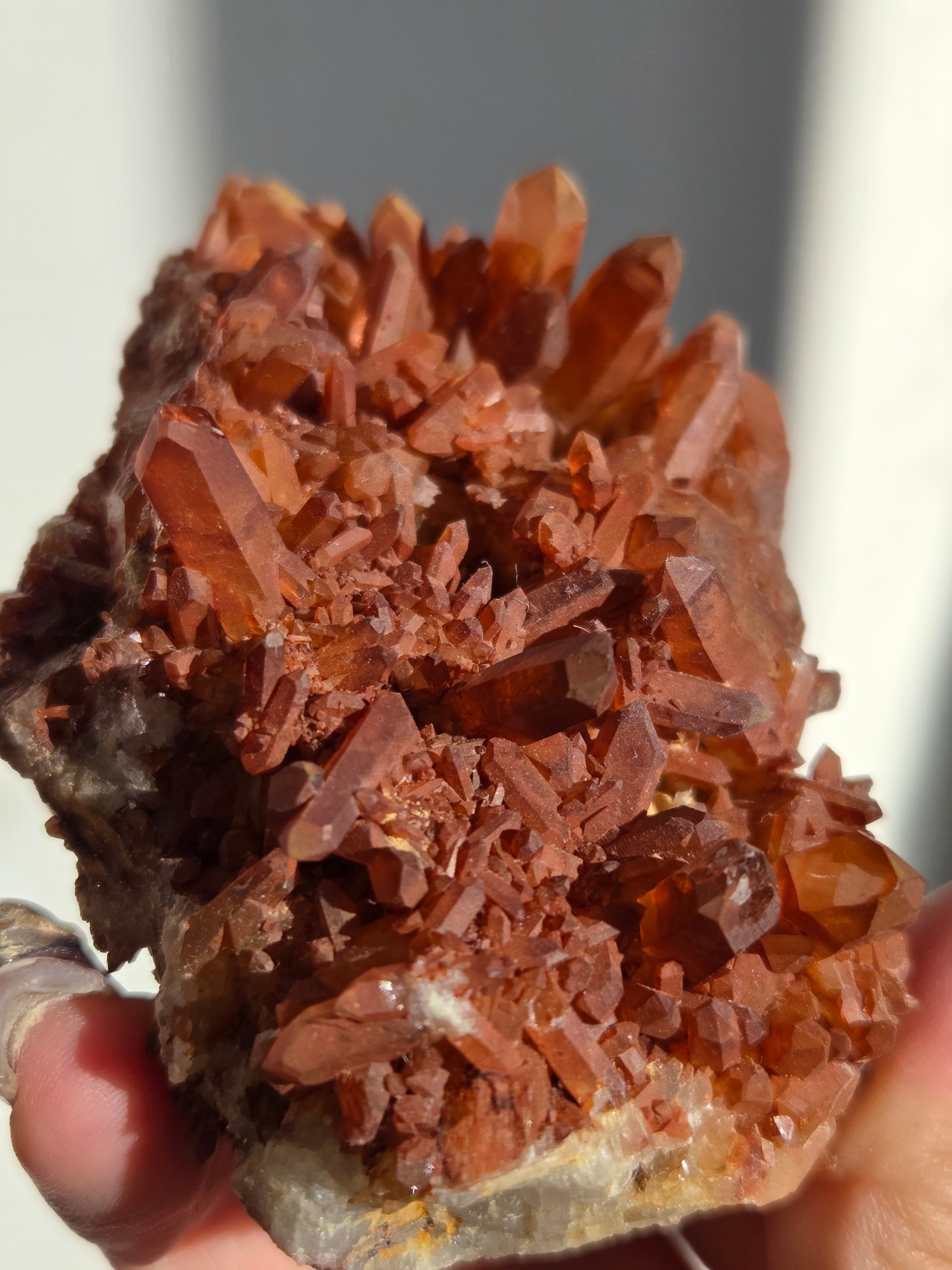 タンジェリンクォーツは、表面にヘマタイト成分が付着し、それが酸化してオレンジ色になった水晶です。表面は美しいオレンジ色をしていますが、中身は透明な水晶です。