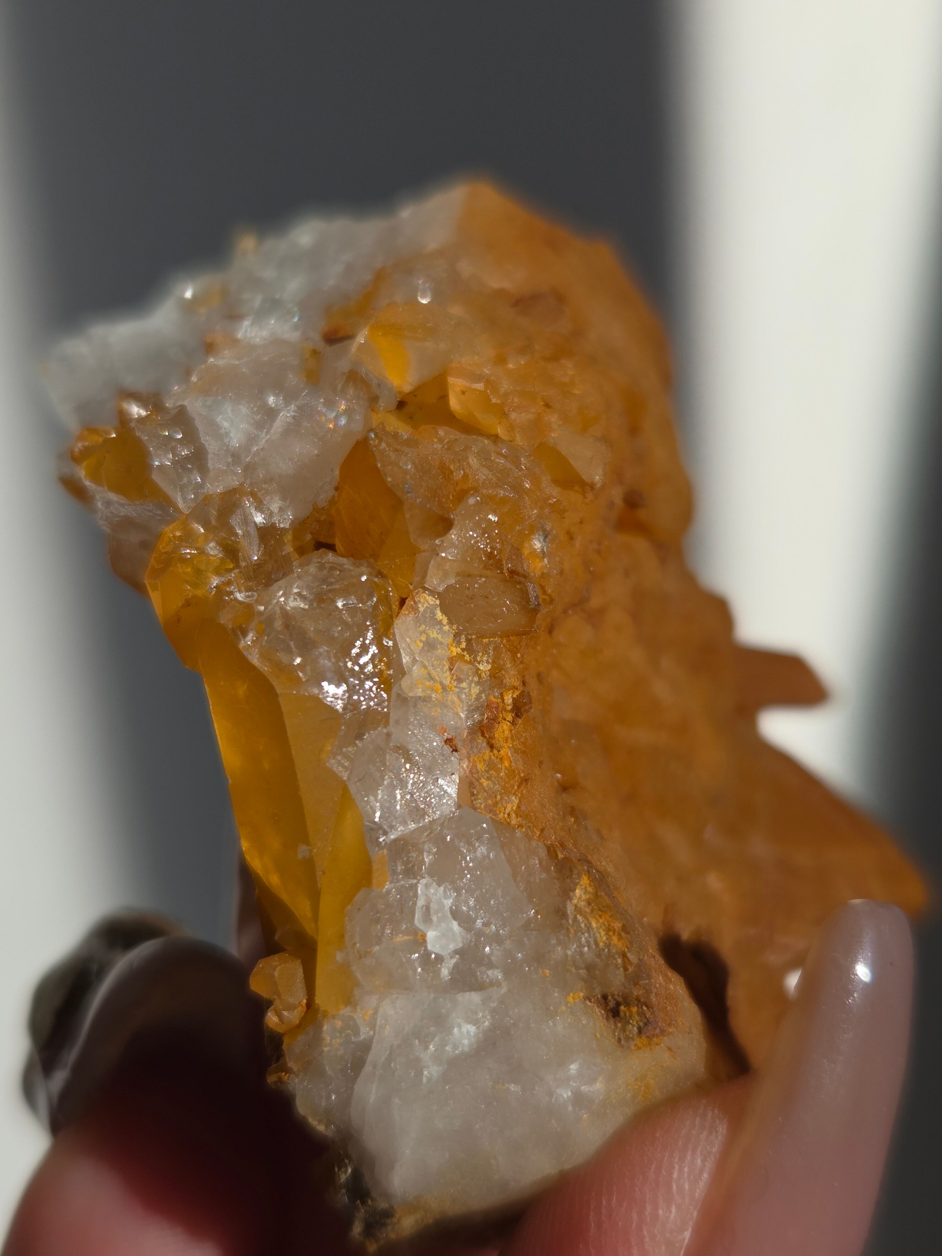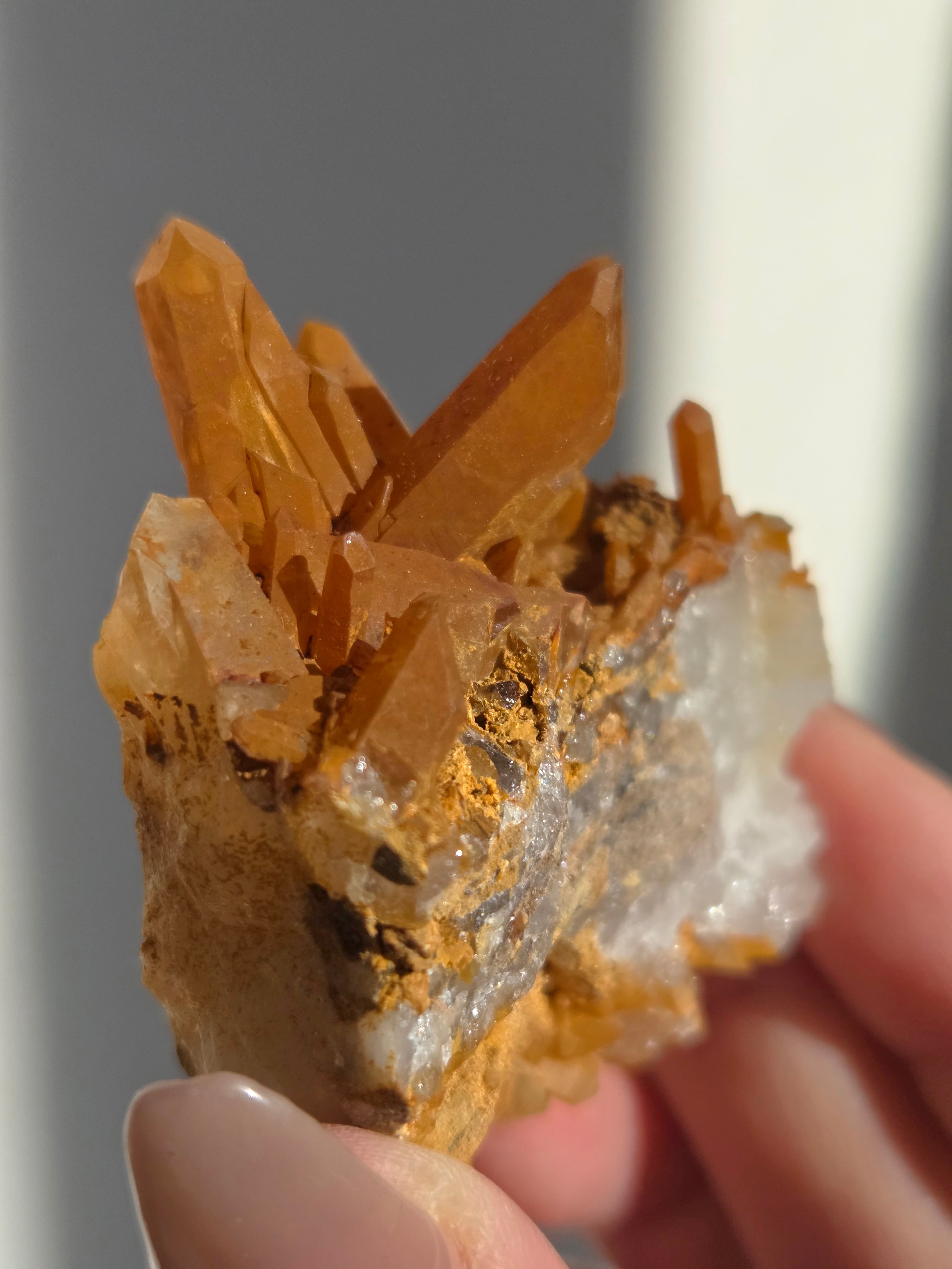 タンジェリンクォーツは、表面にヘマタイト成分が付着し、それが酸化してオレンジ色になった水晶です。表面は美しいオレンジ色をしていますが、中身は透明な水晶です。