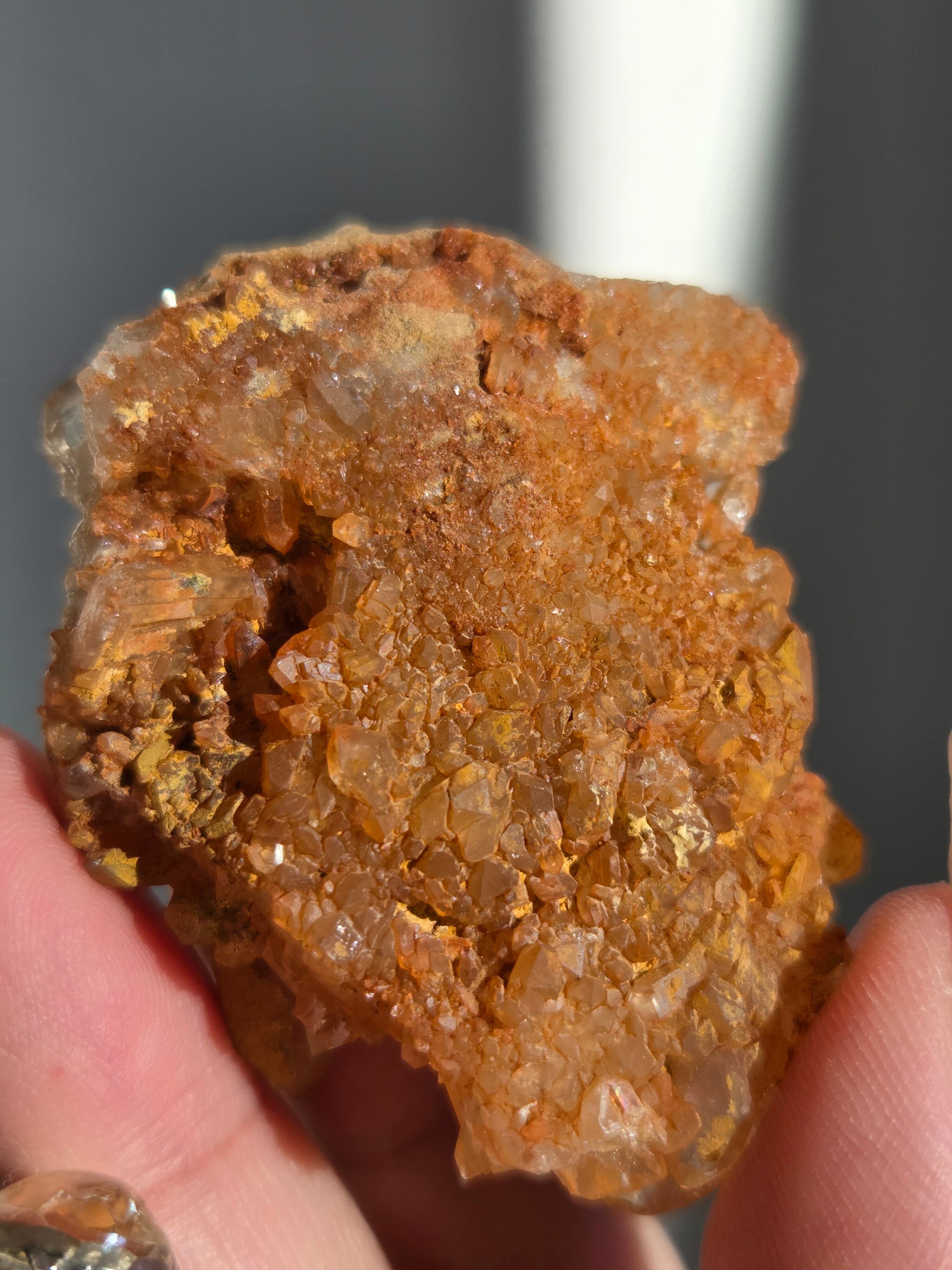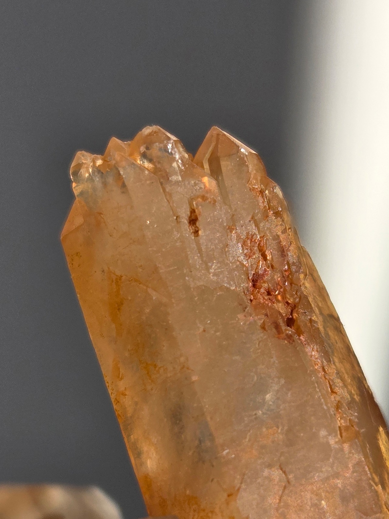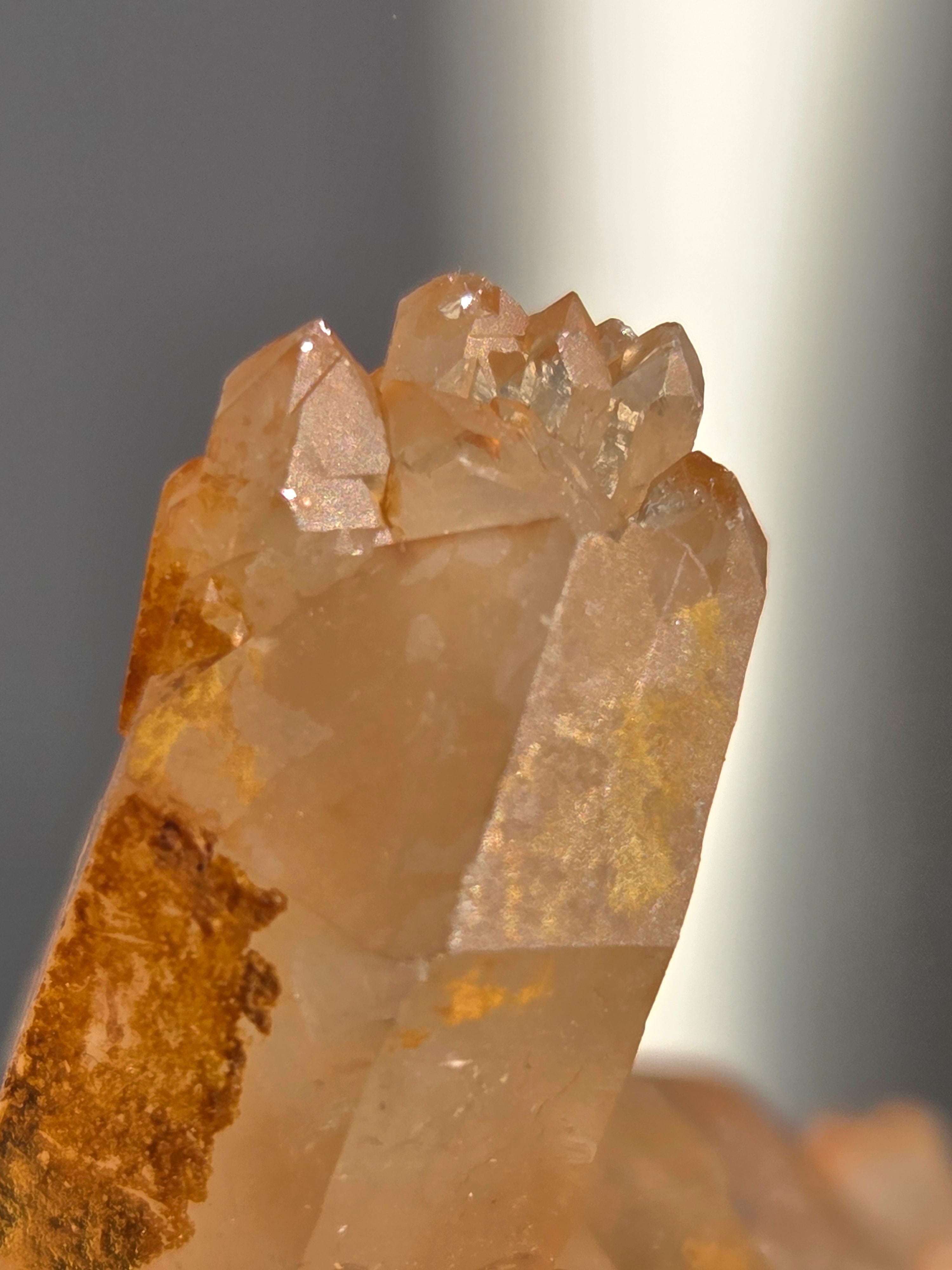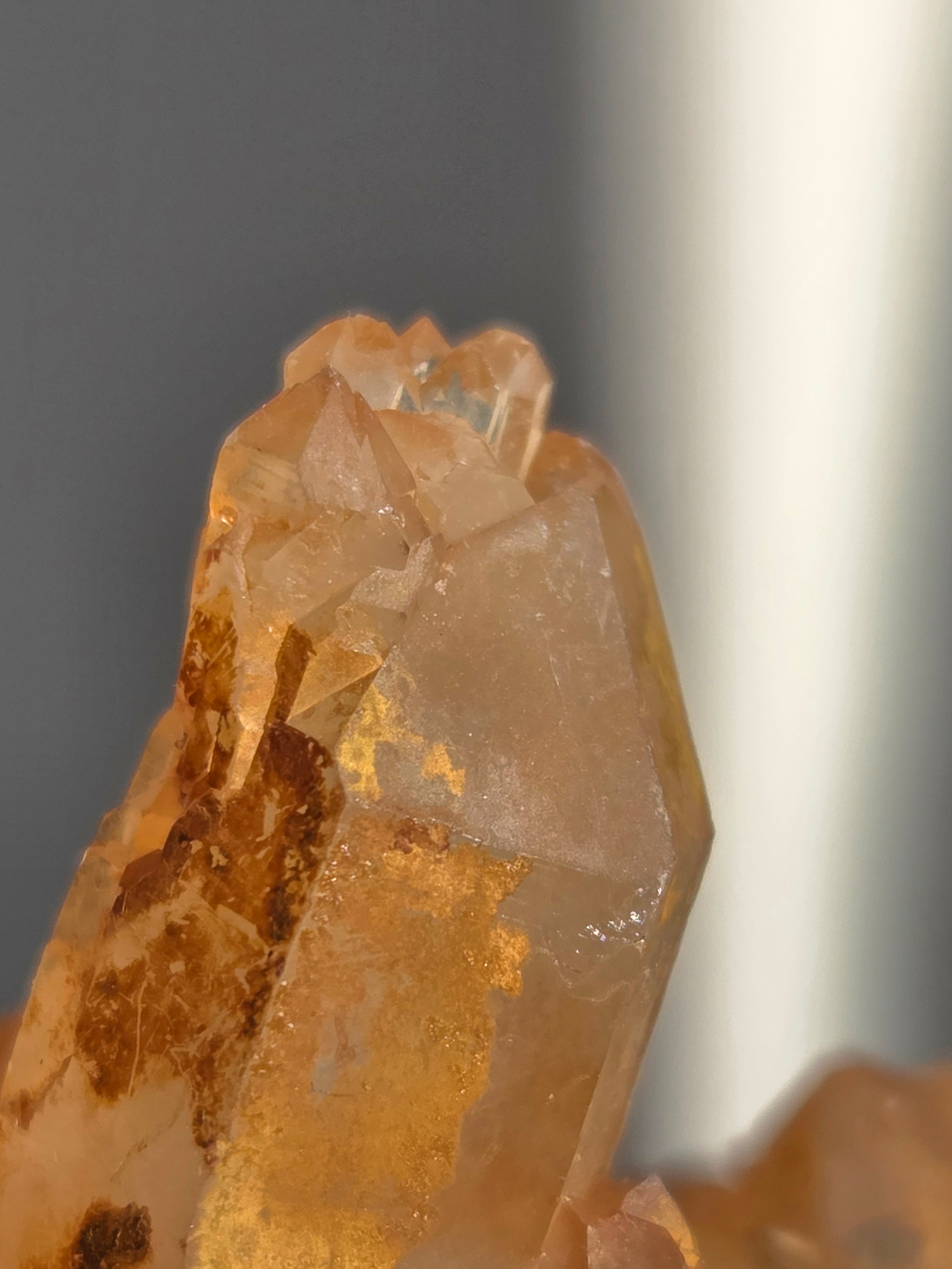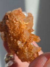 タンジェリンクォーツは、表面にヘマタイト成分が付着し、それが酸化してオレンジ色になった水晶です。表面は美しいオレンジ色をしていますが、中身は透明な水晶です。