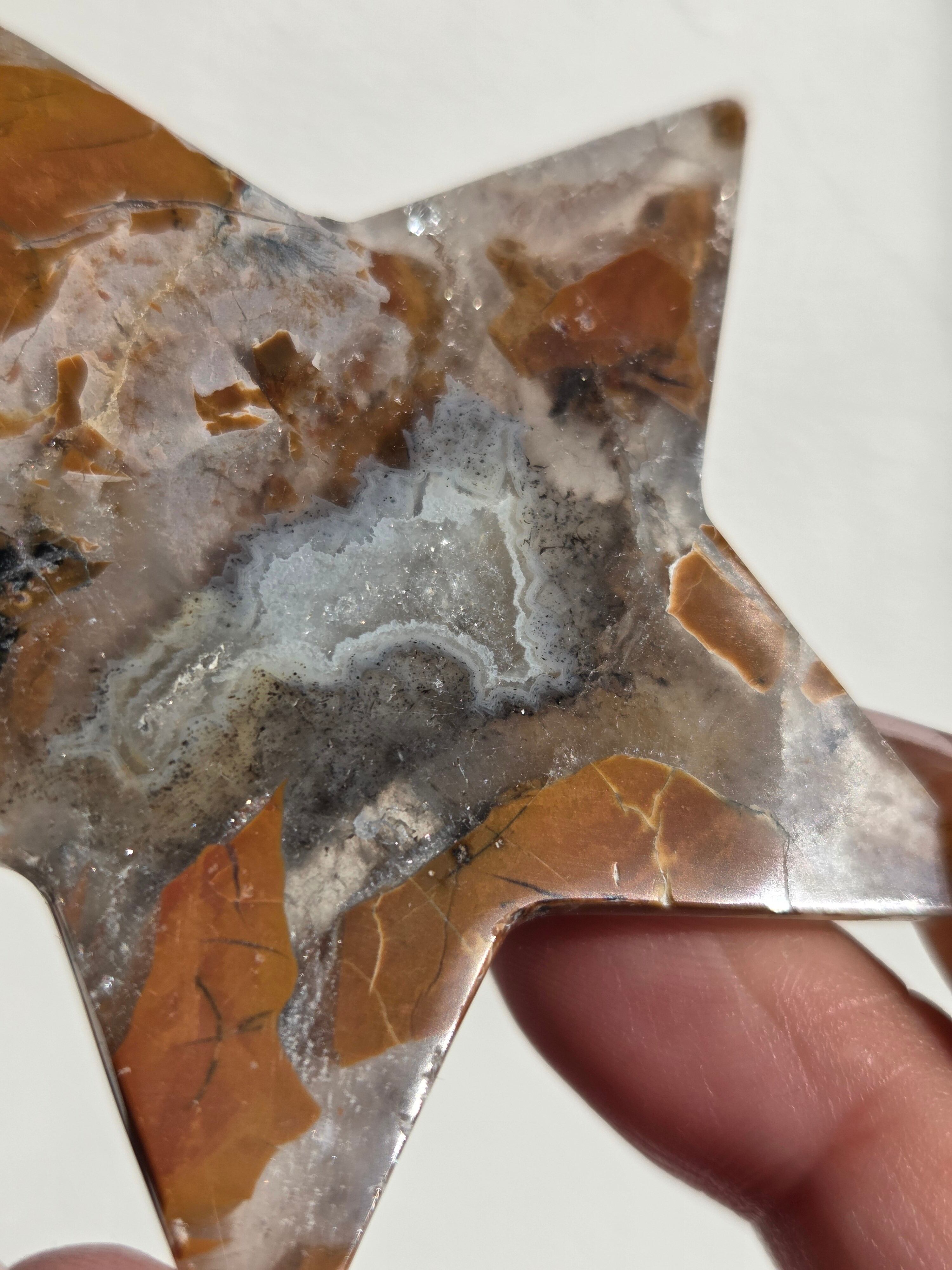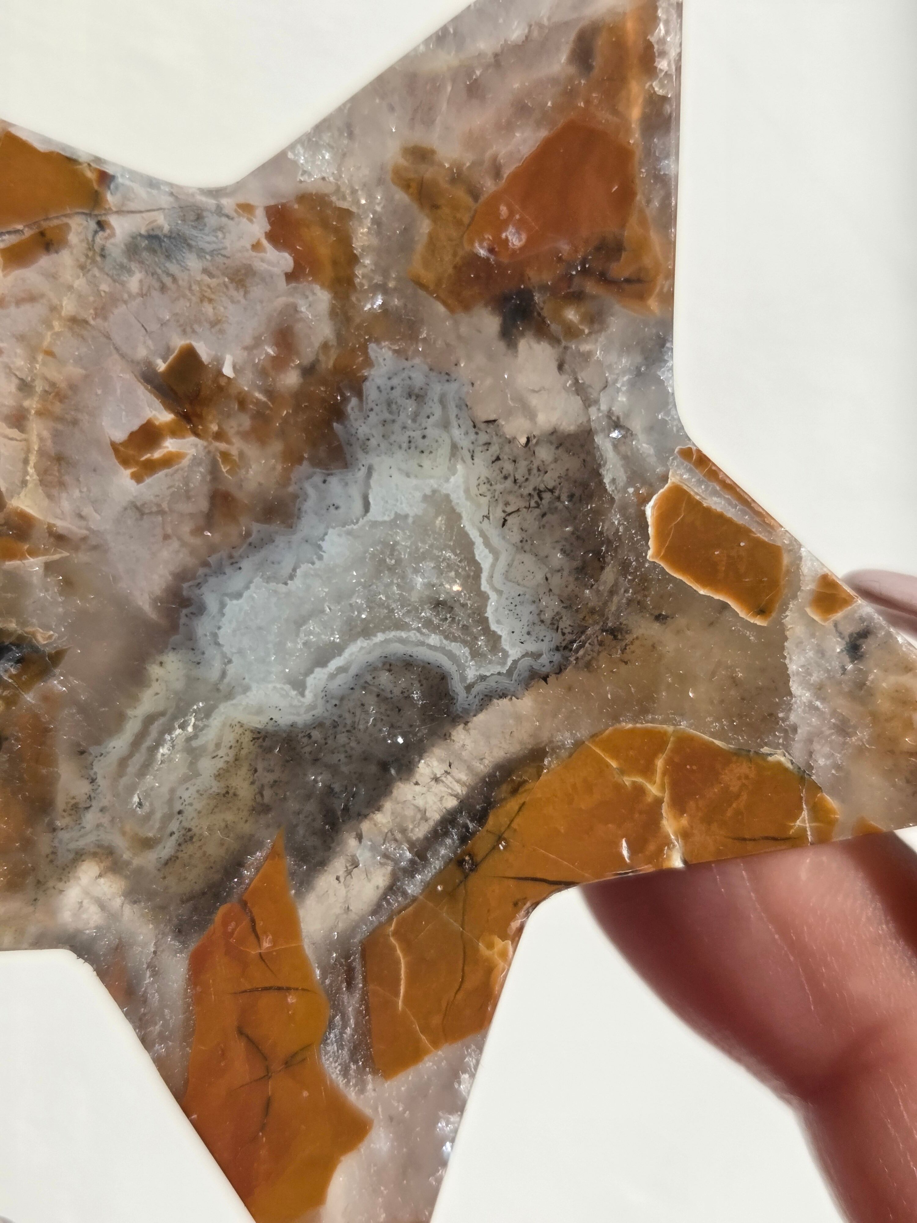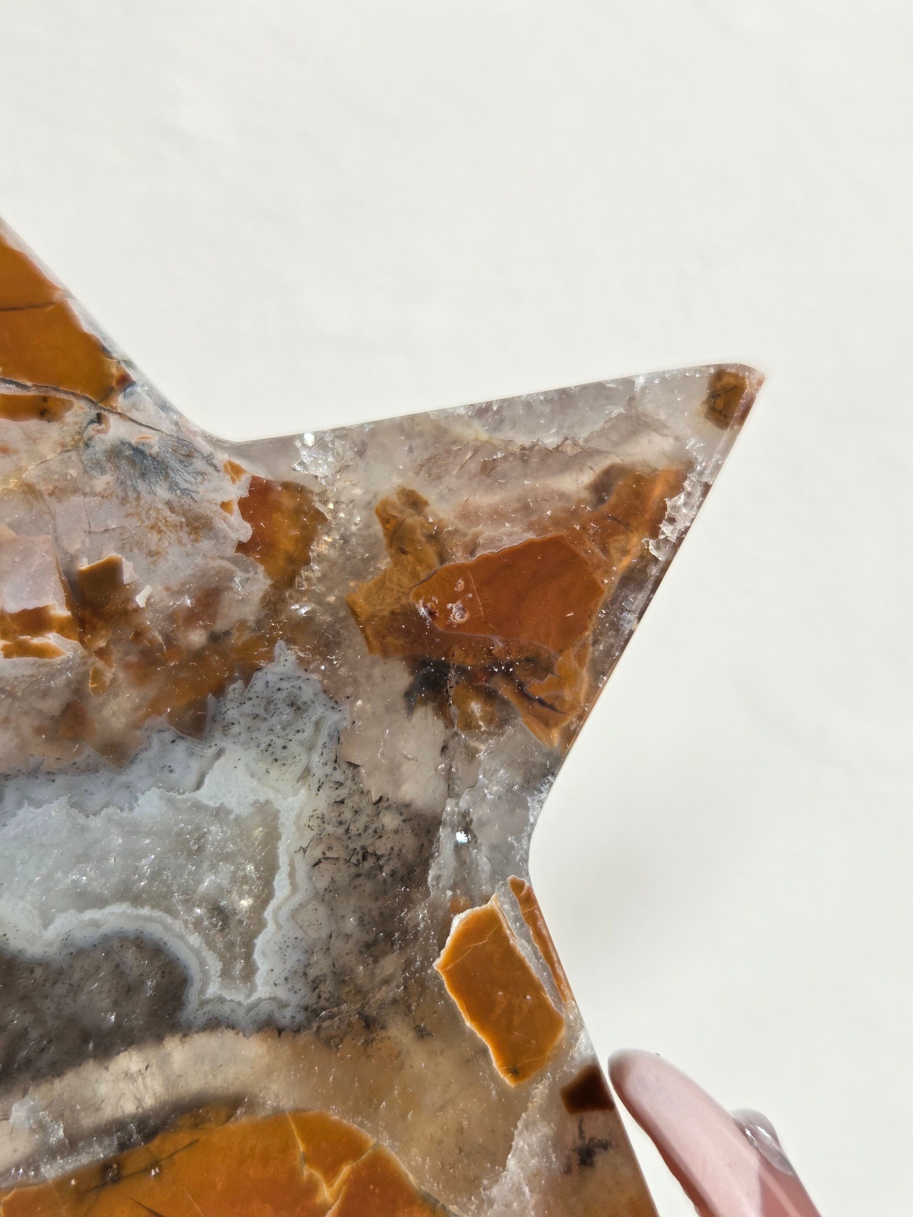 オレンジカラーをメインに、合間からクォーツの煌めきが見えるスターカービングです。