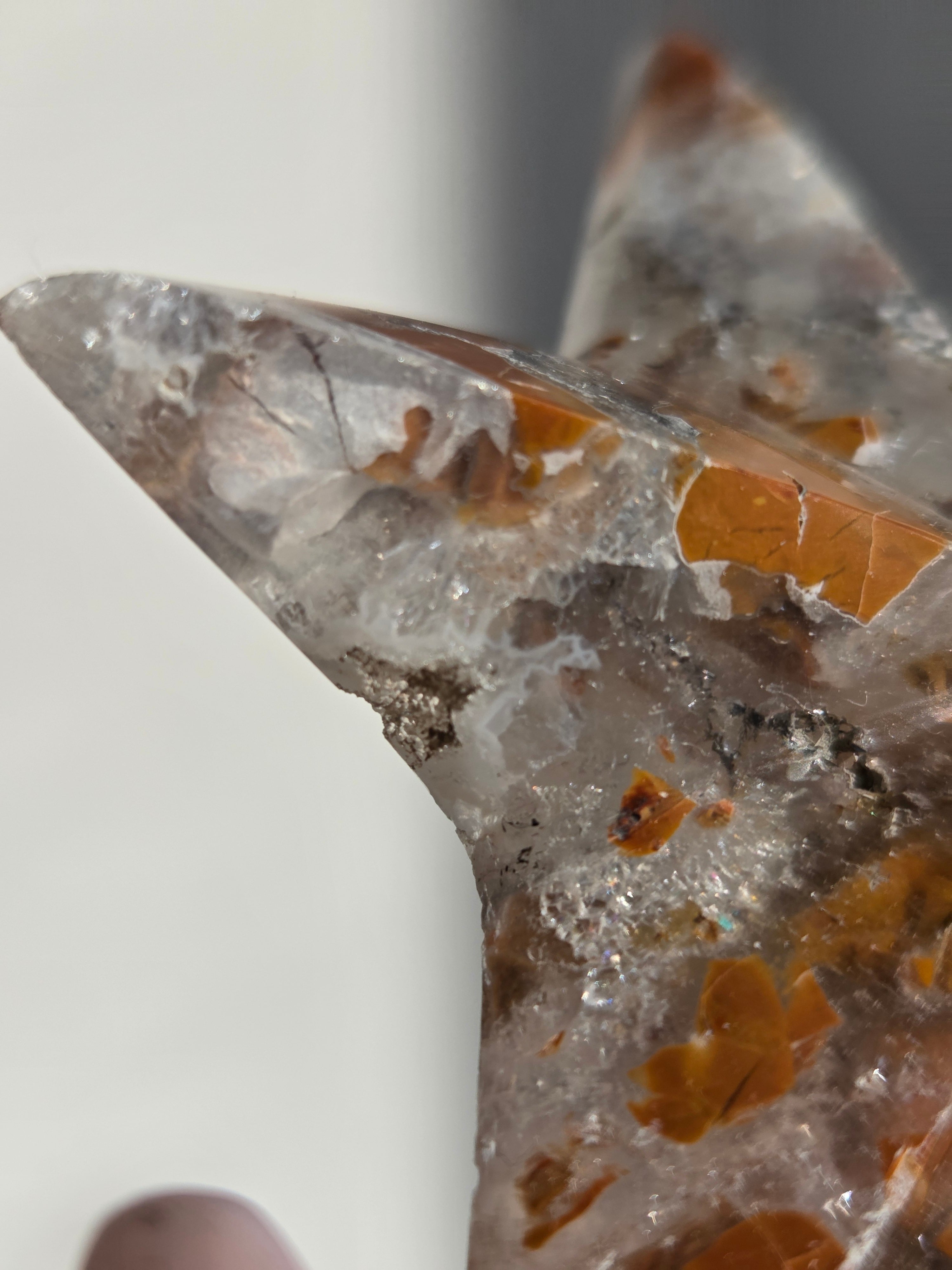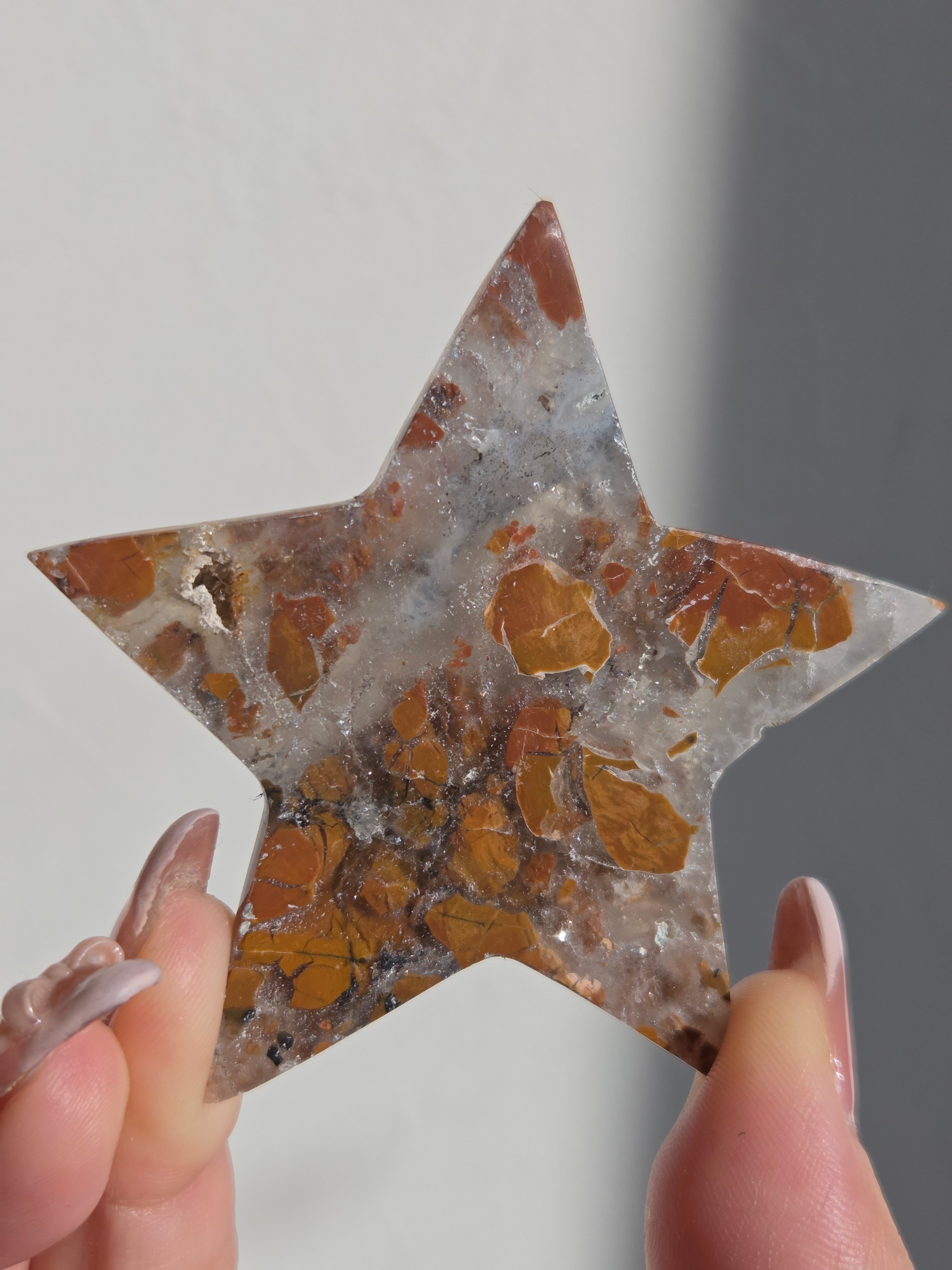 オレンジカラーをメインに、合間からクォーツの煌めきが見えるスターカービングです。