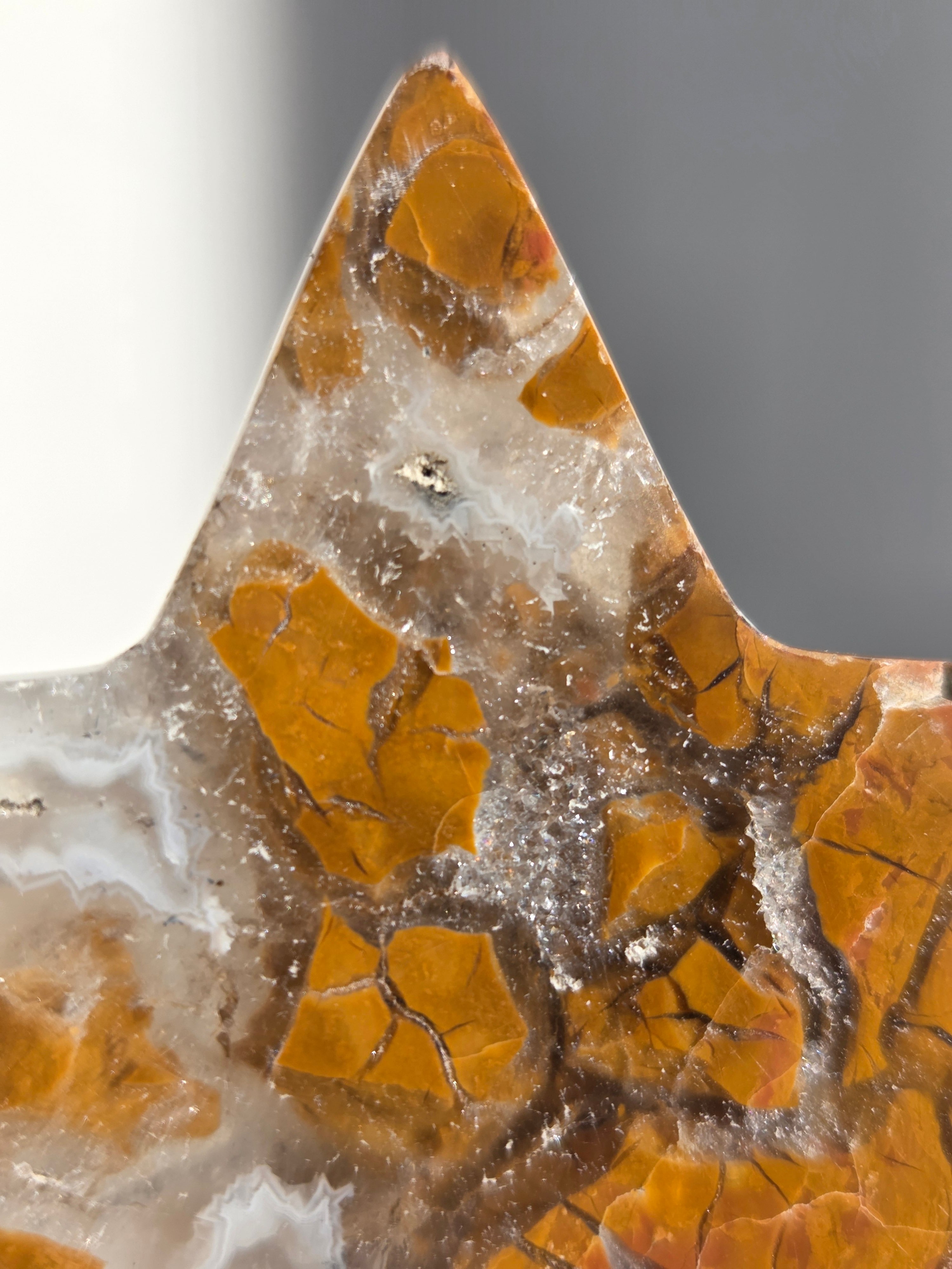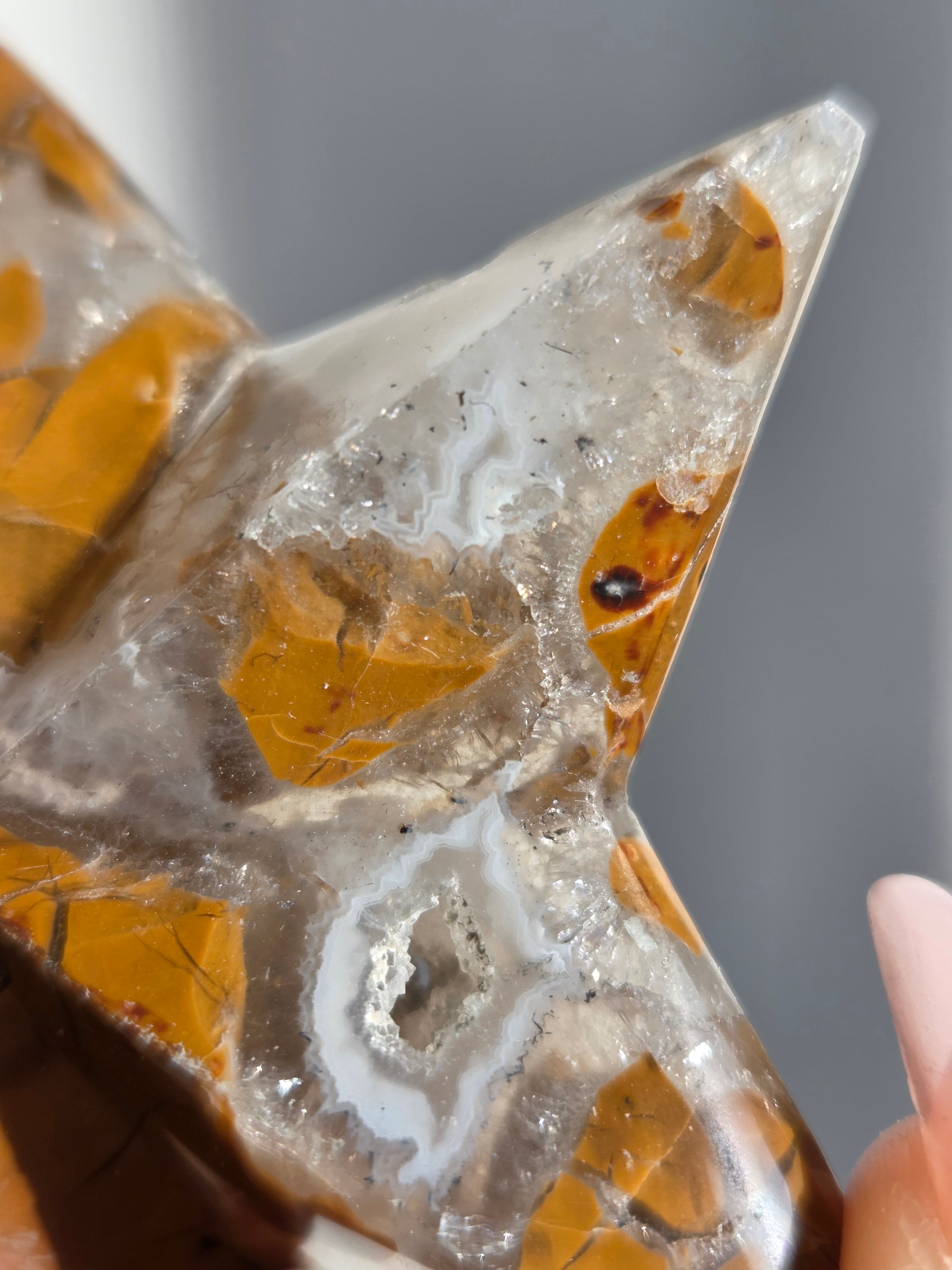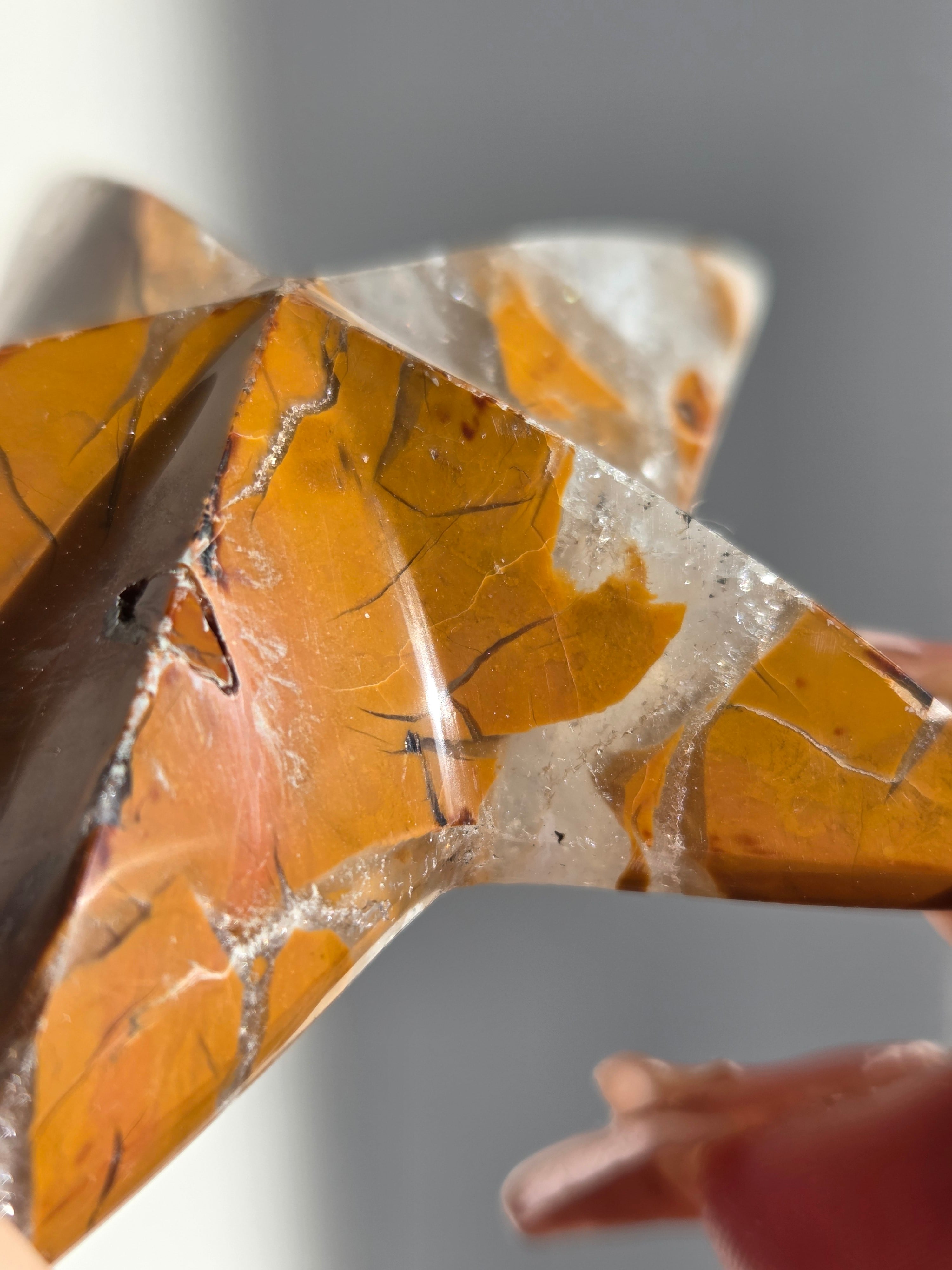 オレンジカラーをメインに、合間からクォーツの煌めきが見えるスターカービングです。
