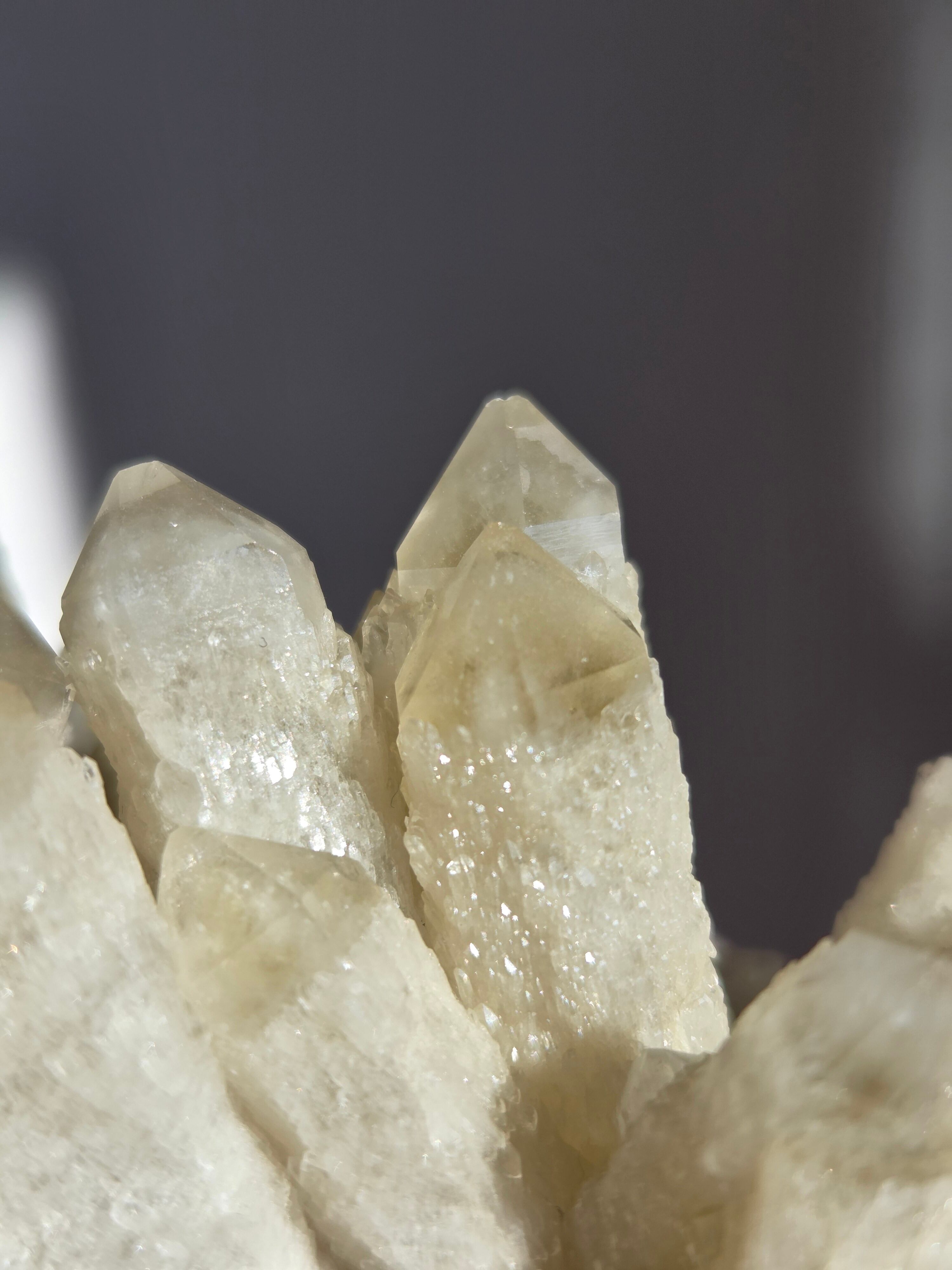 スピリットクォーツとは「精霊水晶」という意味で、その形状は独特で、1本の太い柱の表面に細かな突起を思わせる無数の結晶が生え出ています。メインとなる柱の先端だけは、細かな結晶が生えずに残っている様子もユニークです。