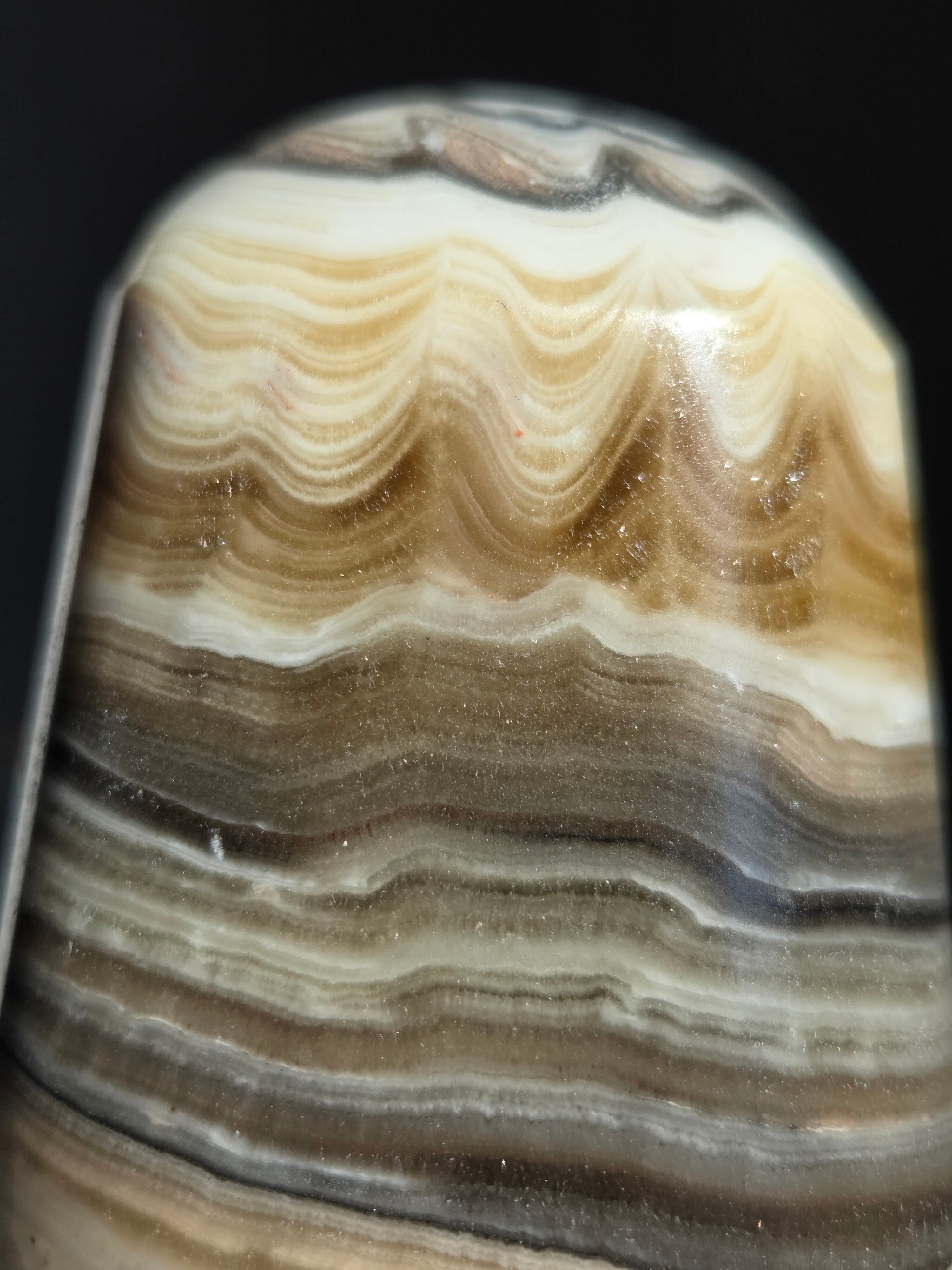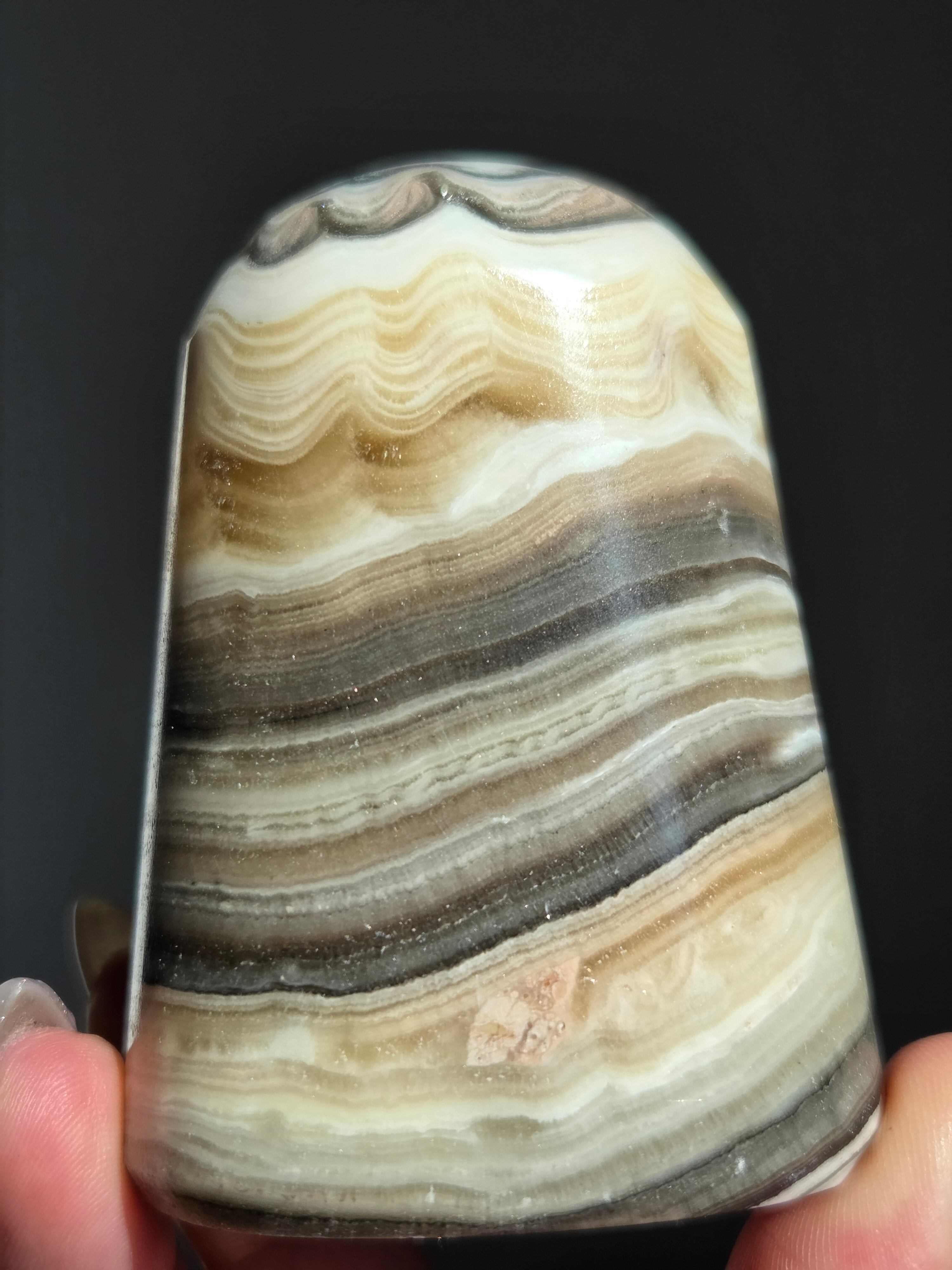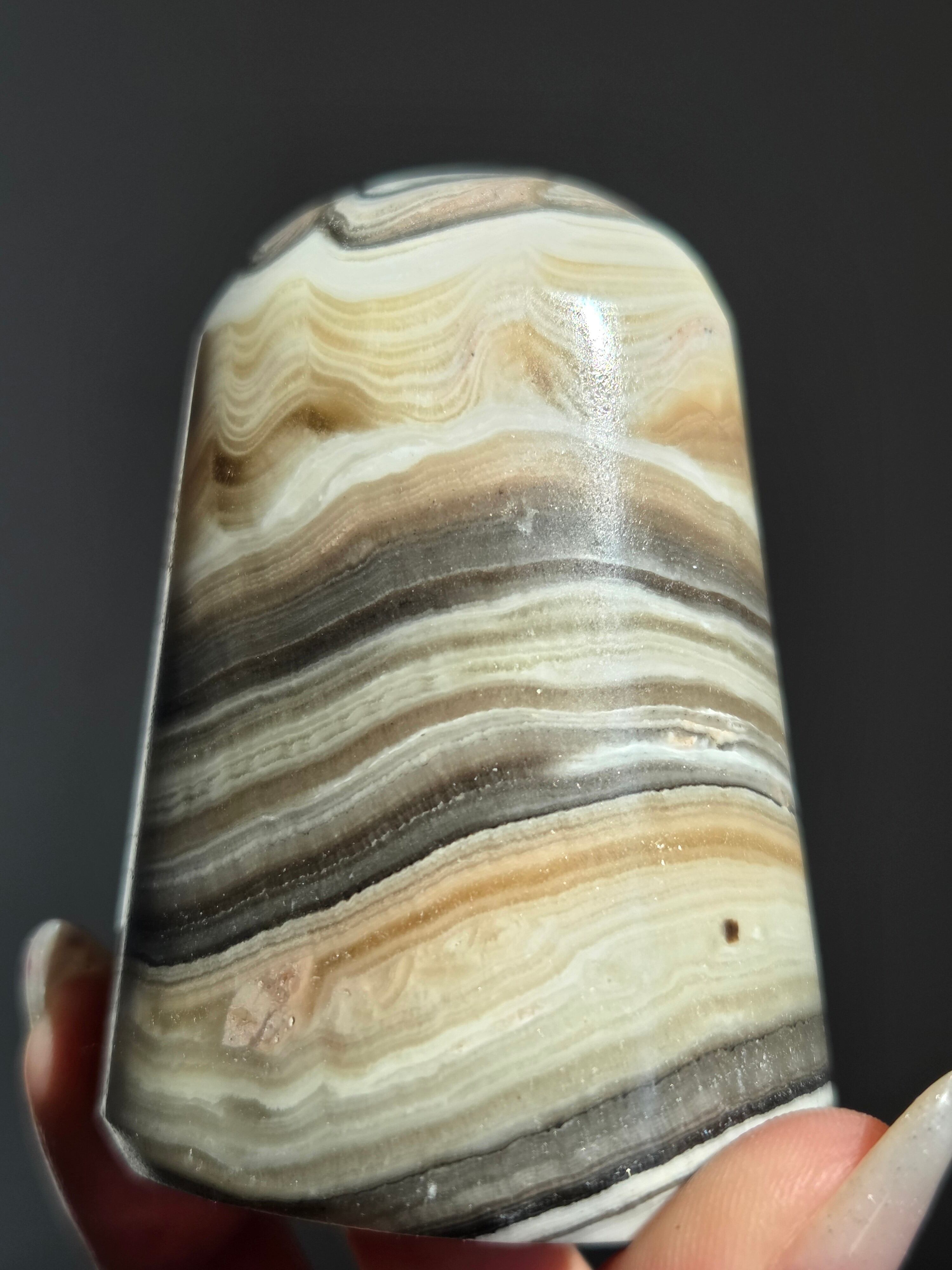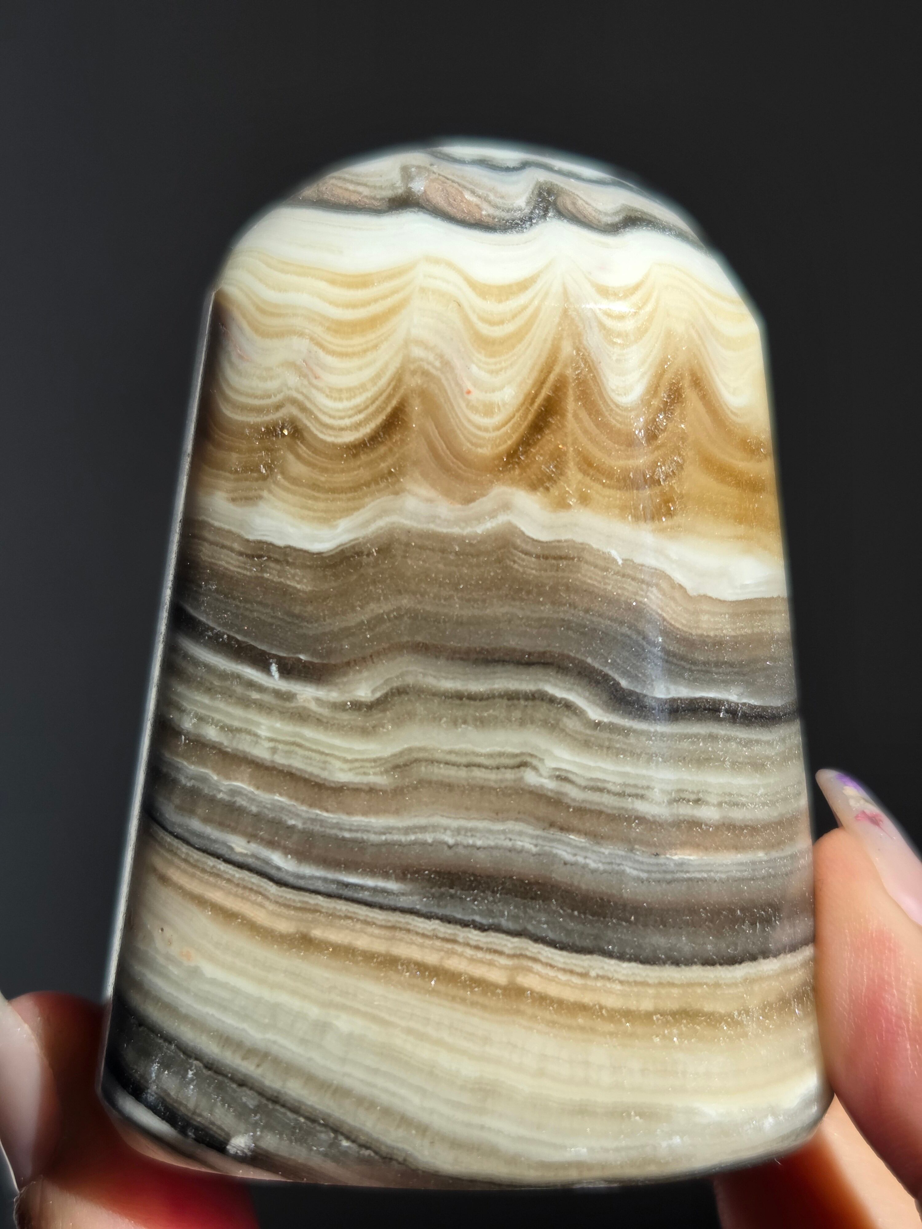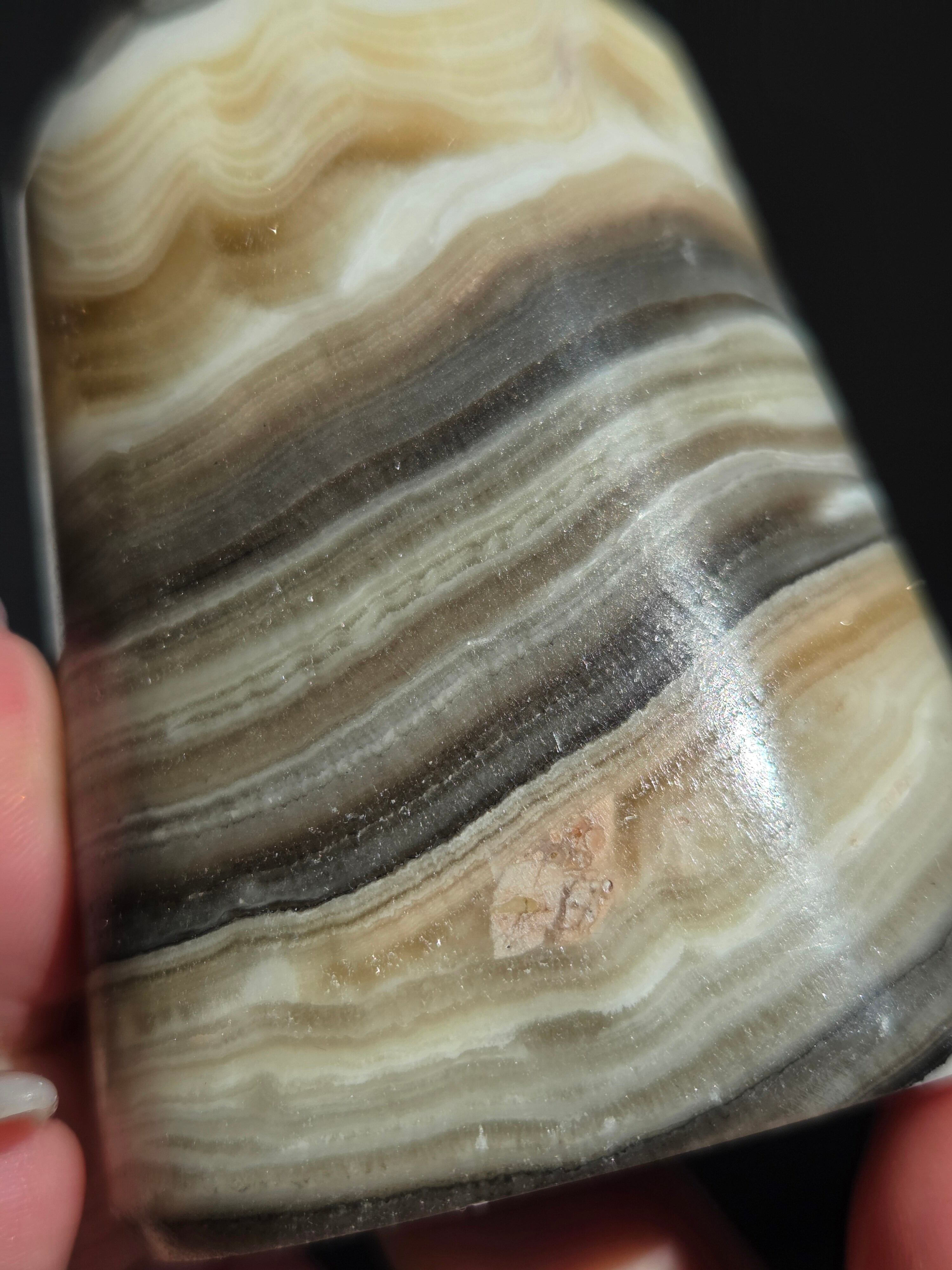 白(カルサイト)と黒(不純物)が縞模様を描く、個性的でモノトーンな表情が魅力の天然石です。