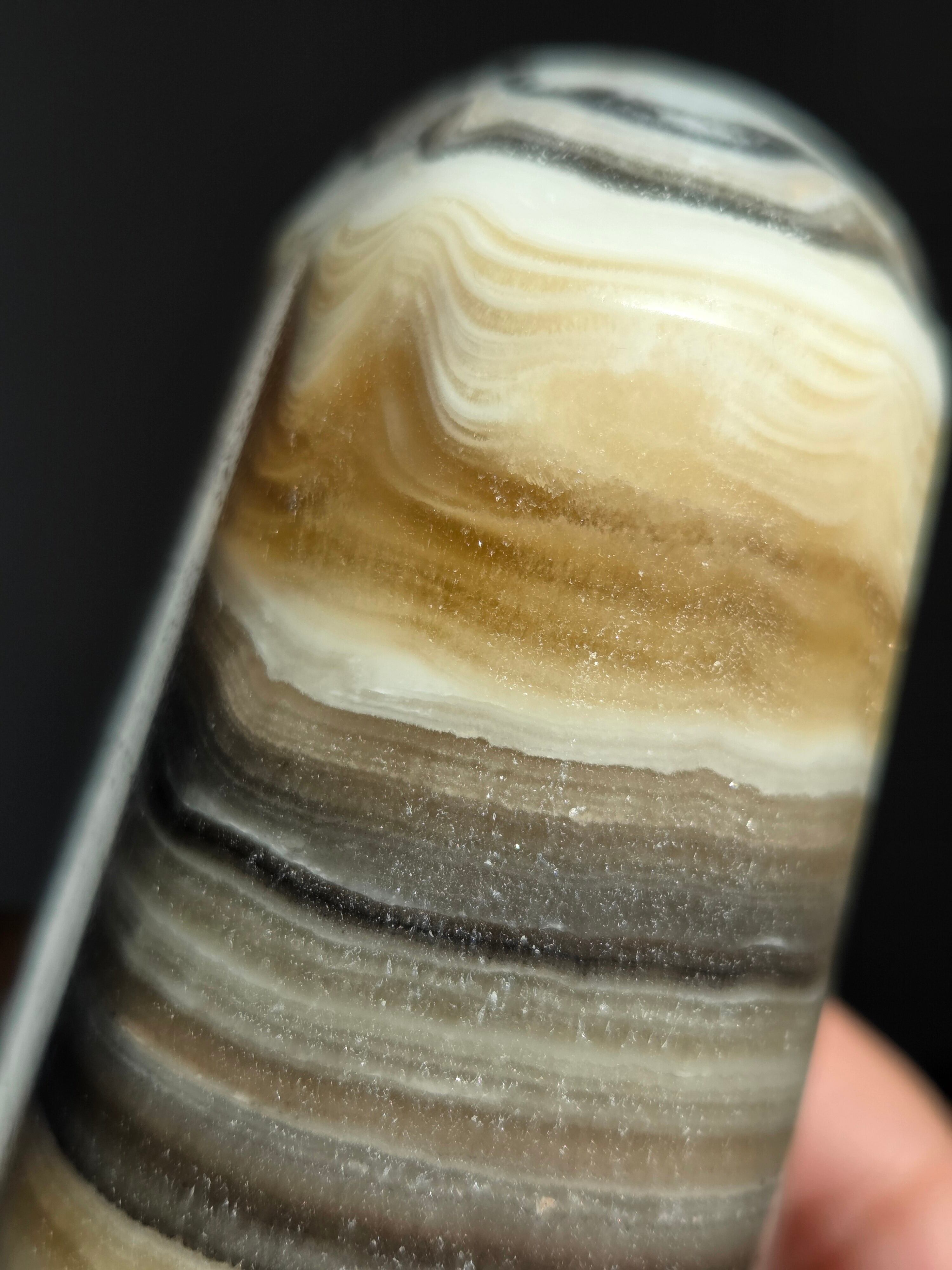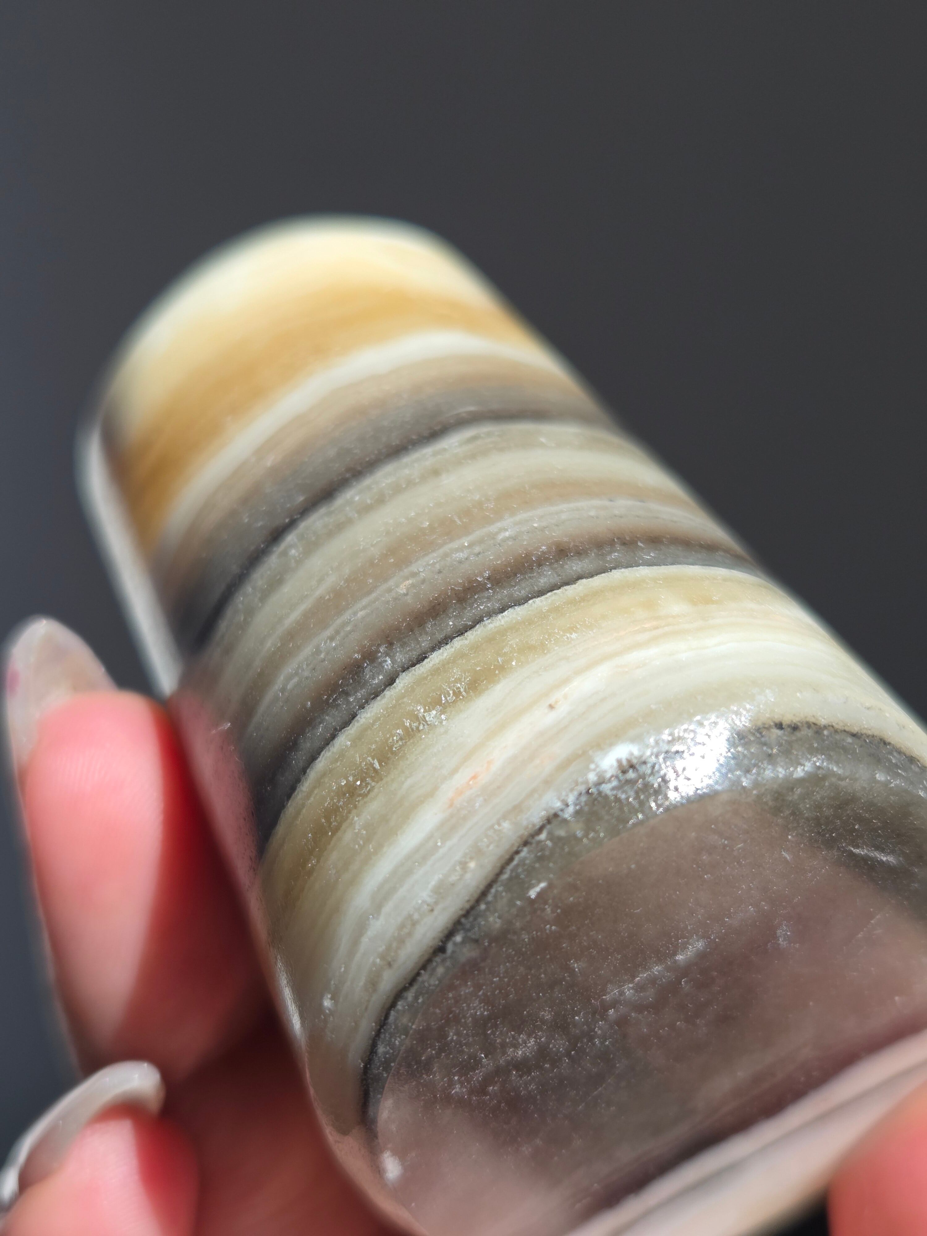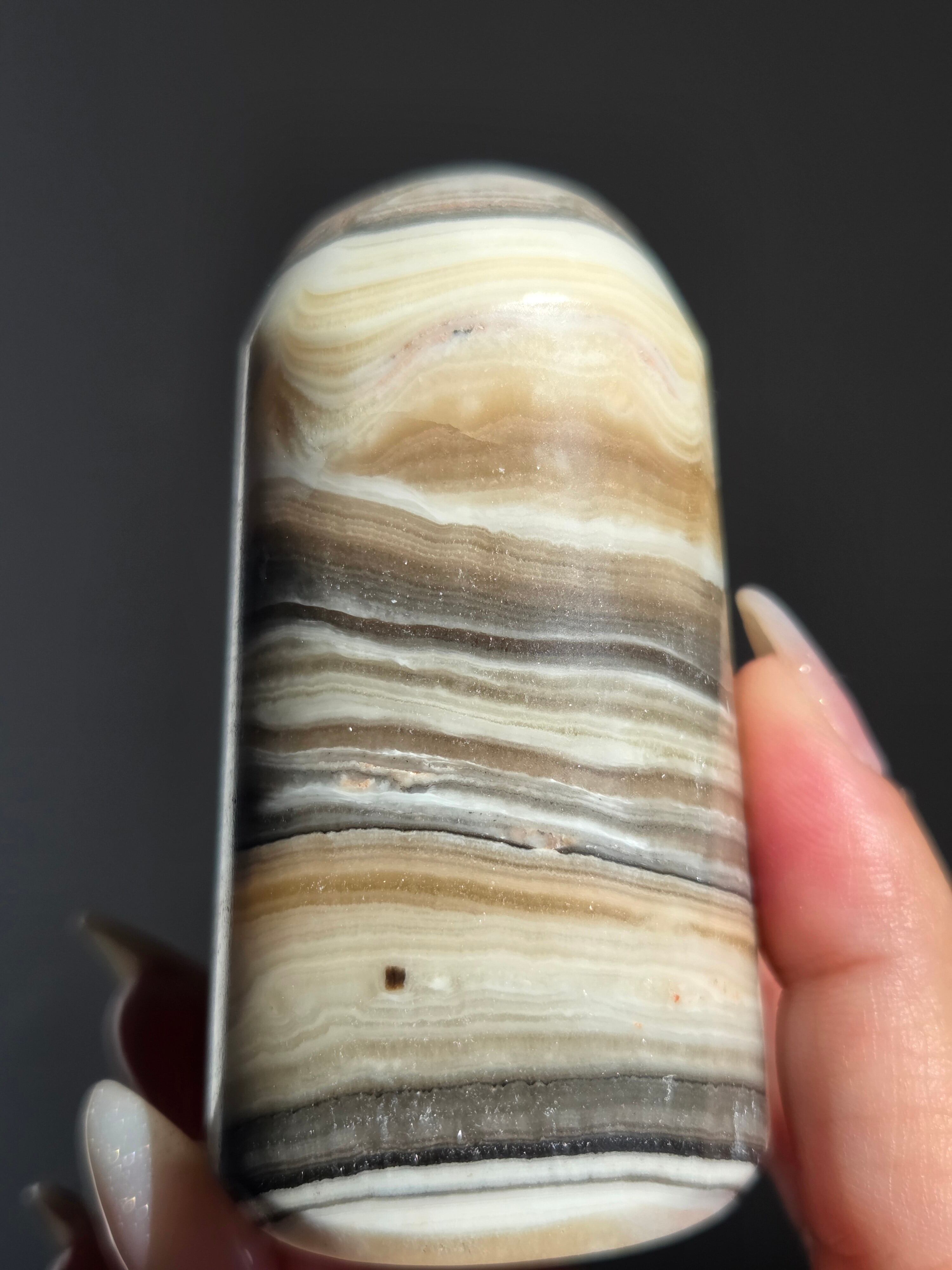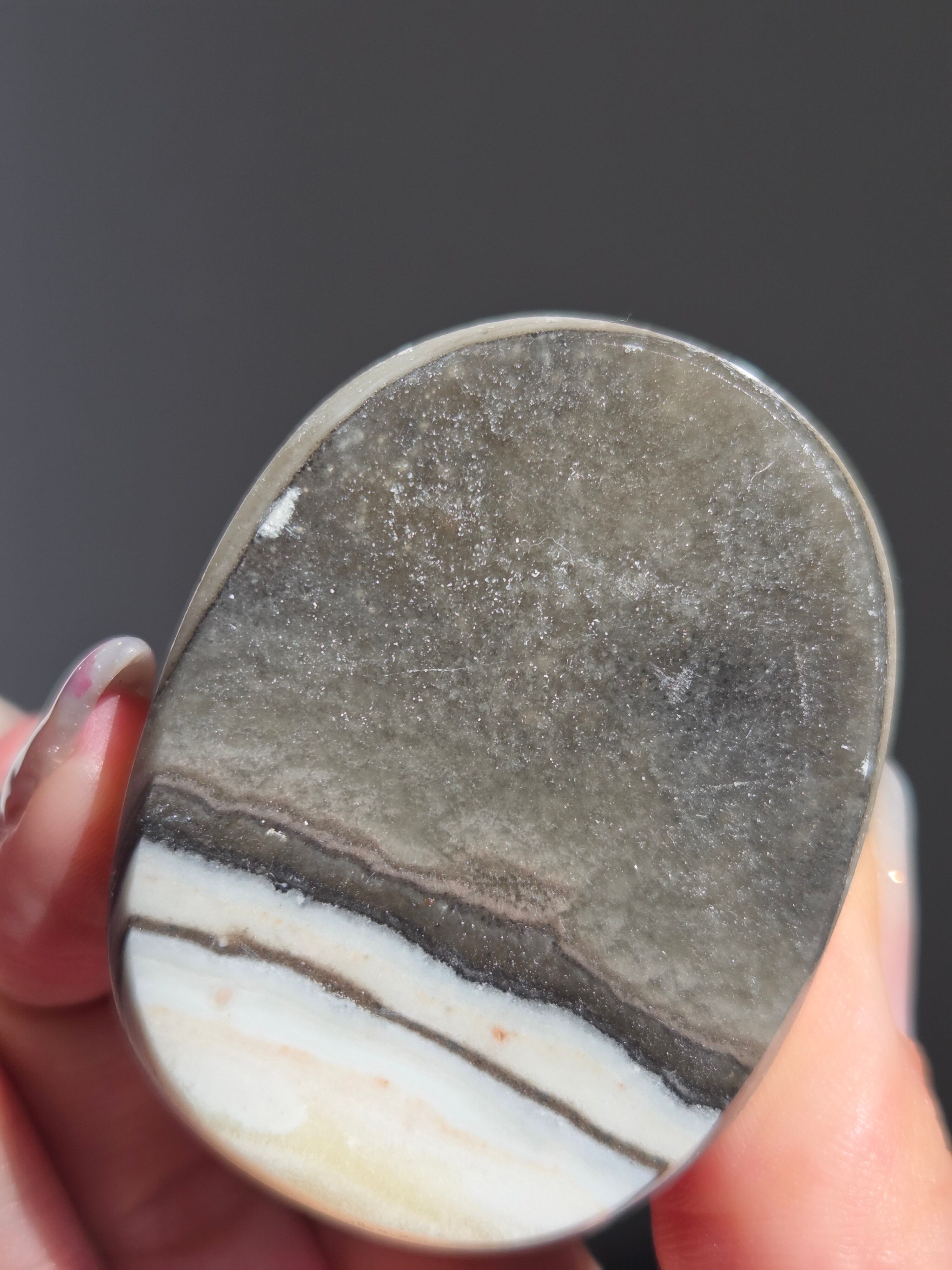 白(カルサイト)と黒(不純物)が縞模様を描く、個性的でモノトーンな表情が魅力の天然石です。