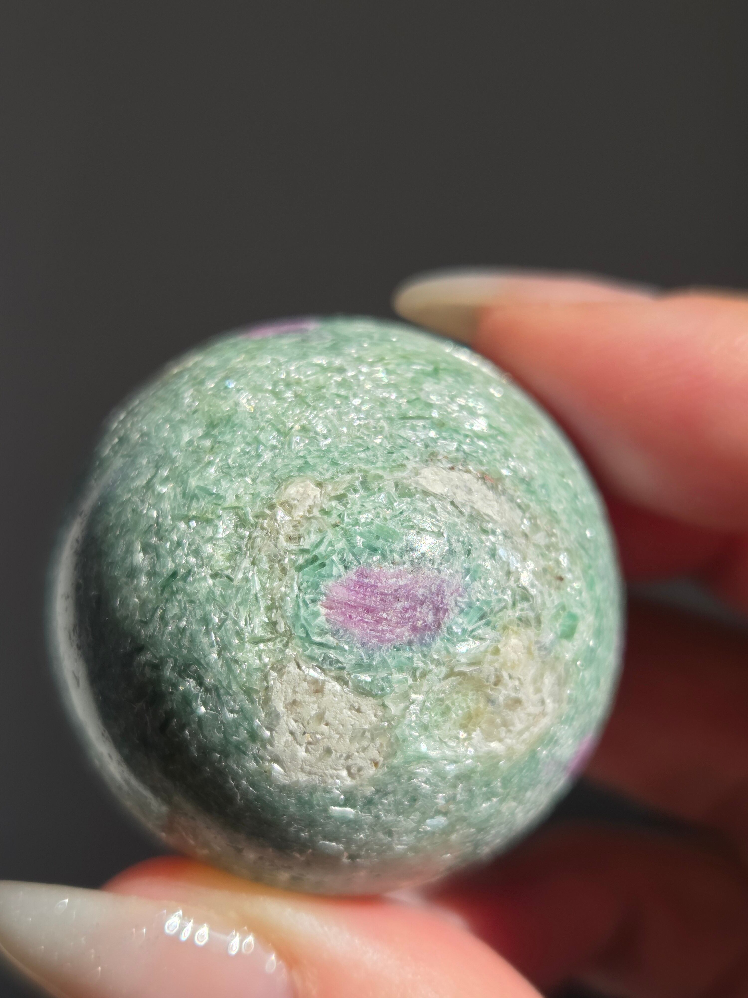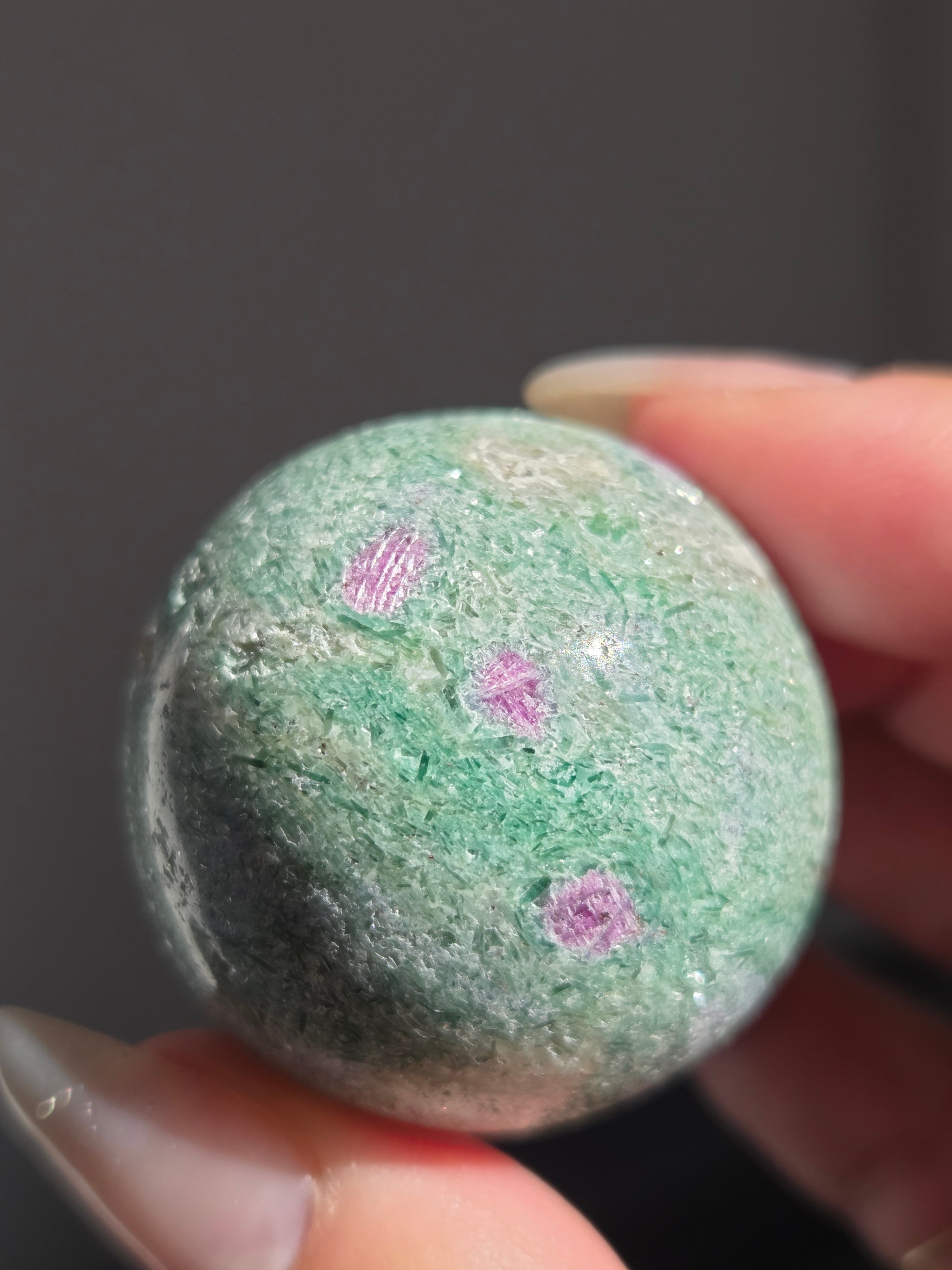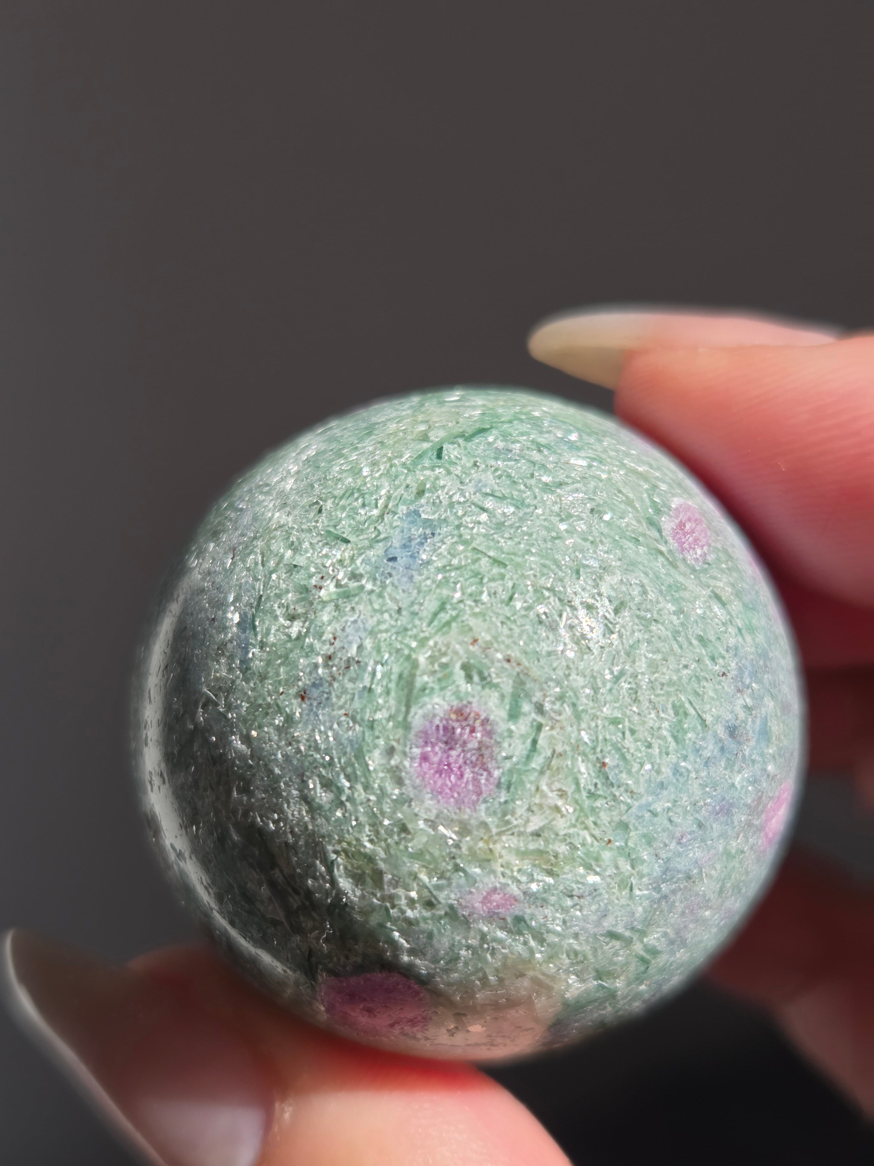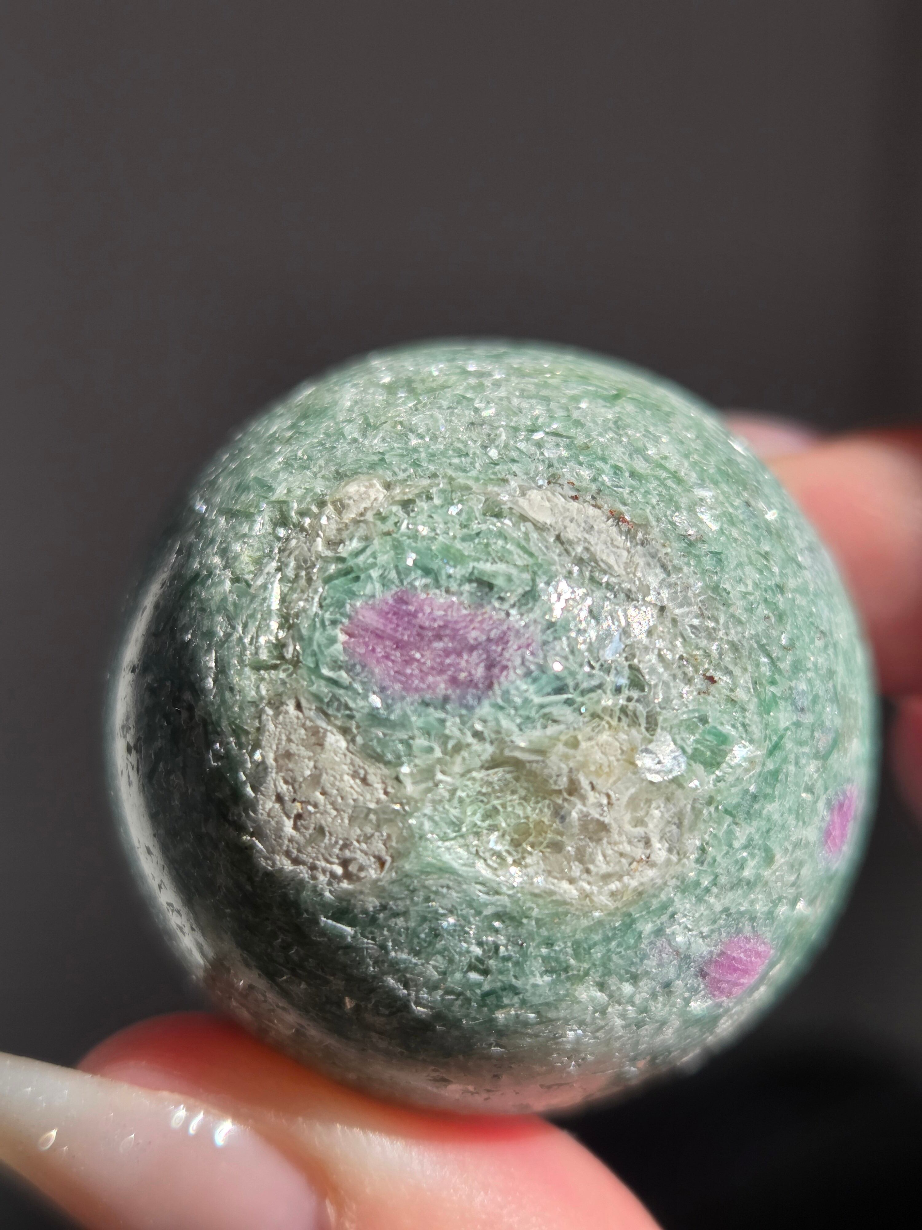 含浸処理をしていない原石スフィアです。今回のルビーインフックサイトは、マイカが多くキラキラしているぶん自然の凹み部分もあります。