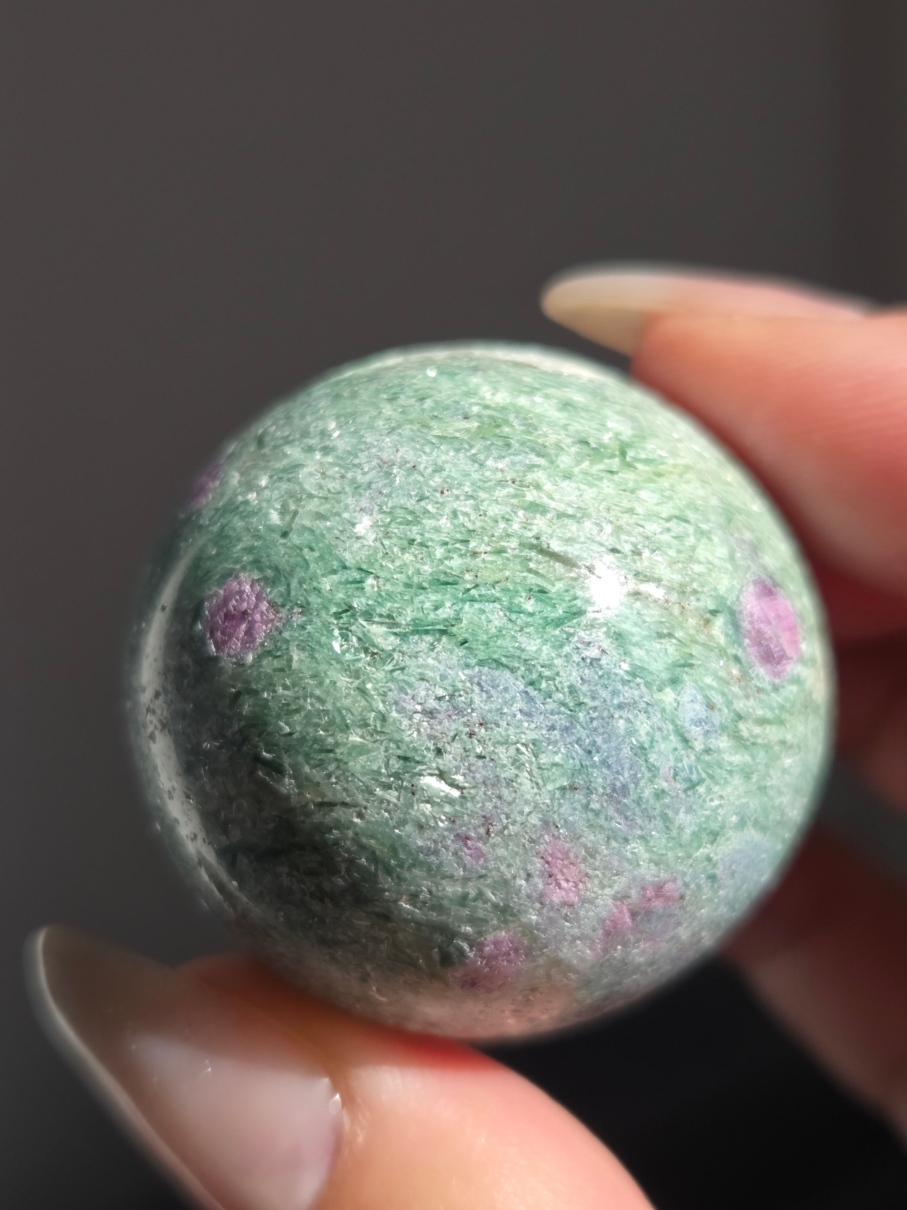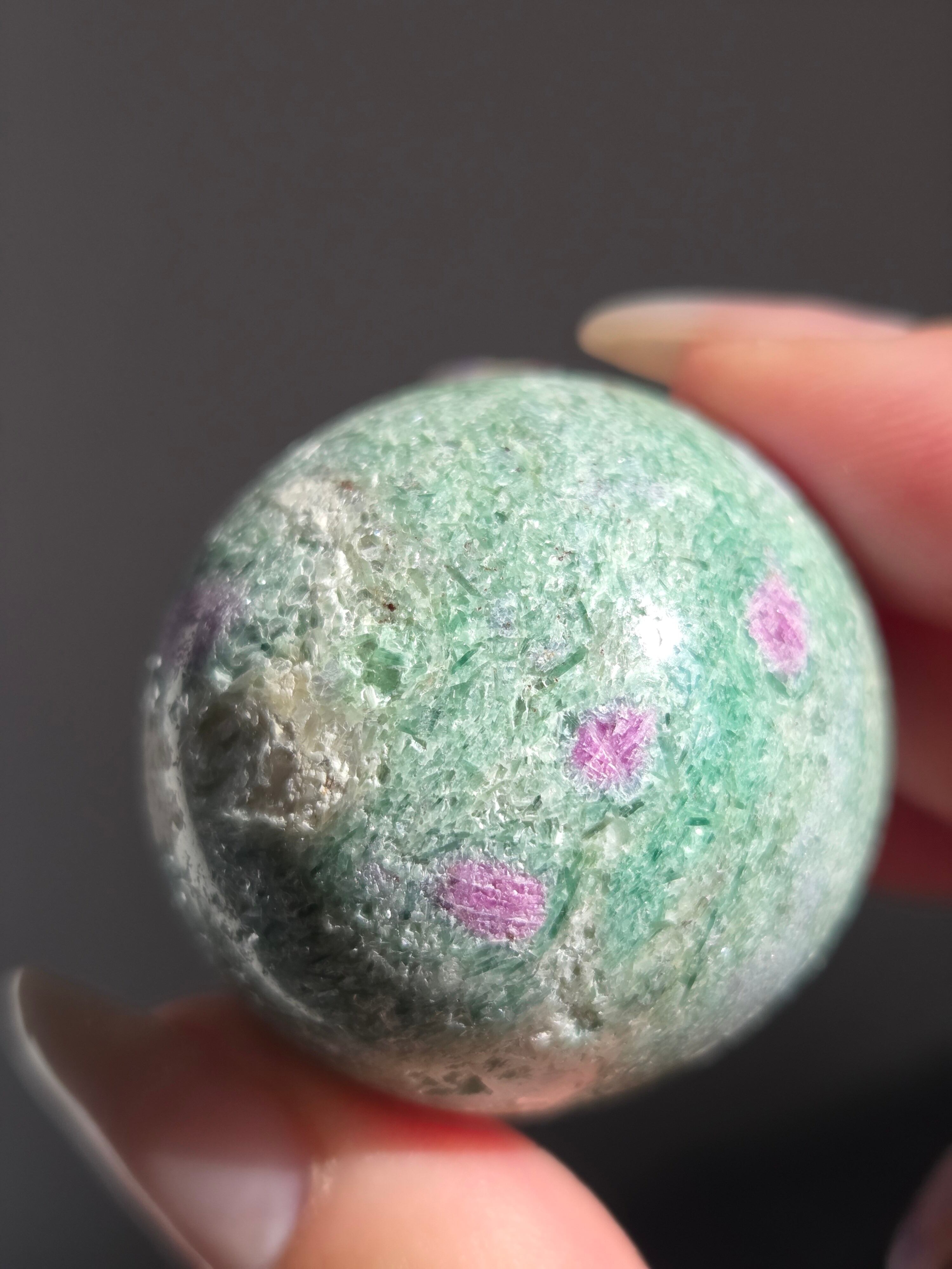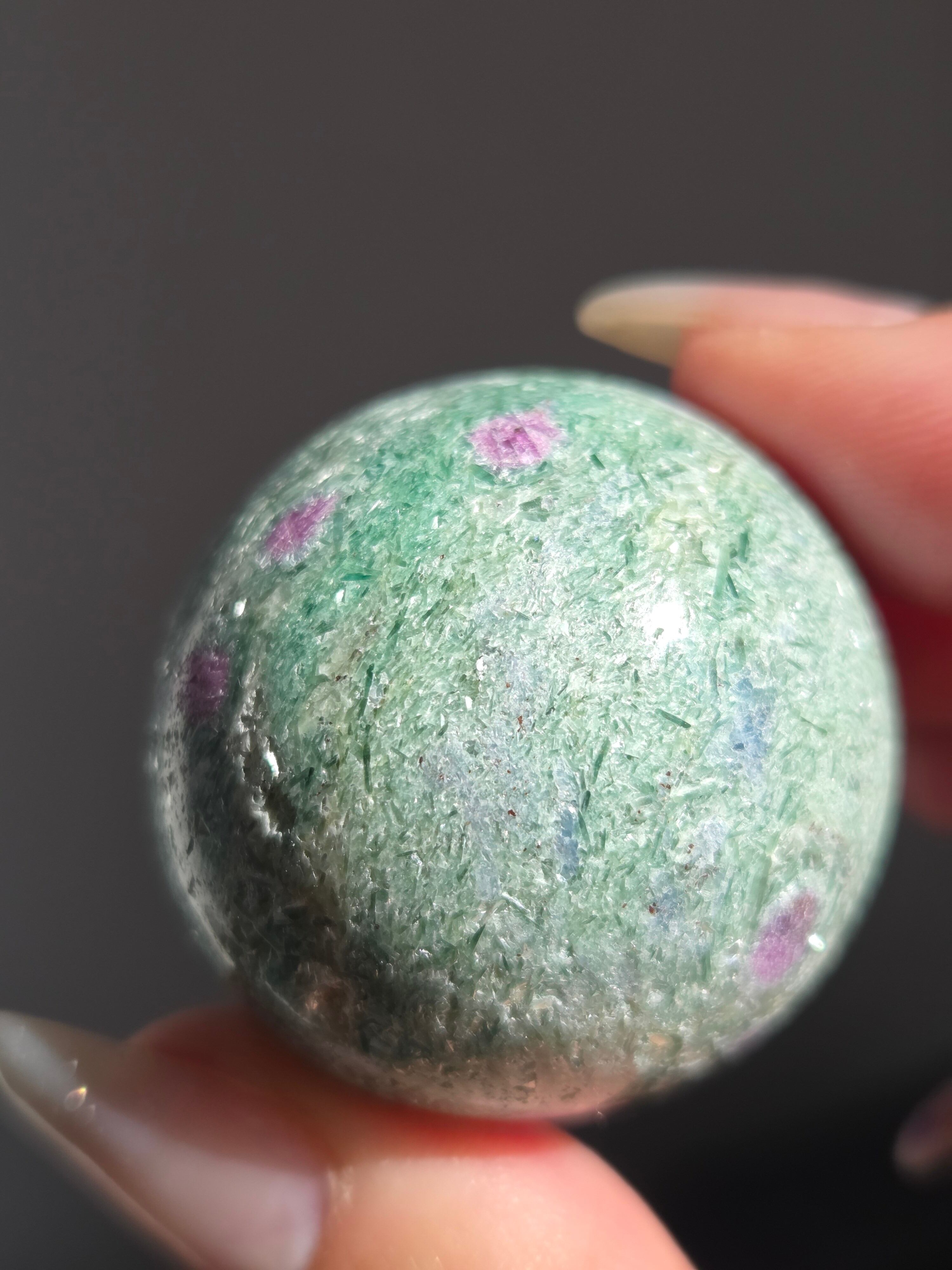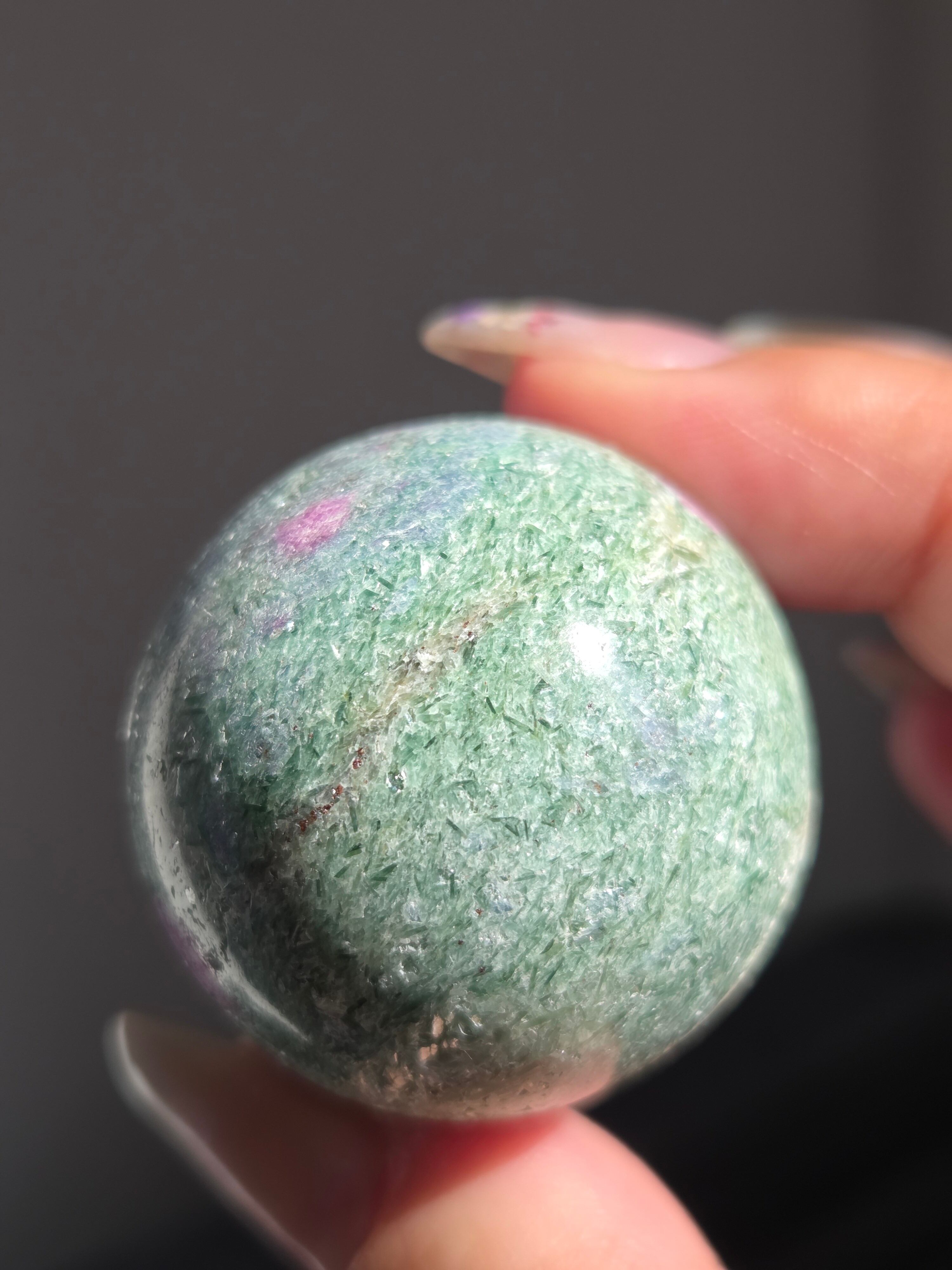 含浸処理をしていない原石スフィアです。今回のルビーインフックサイトは、マイカが多くキラキラしているぶん自然の凹み部分もあります。