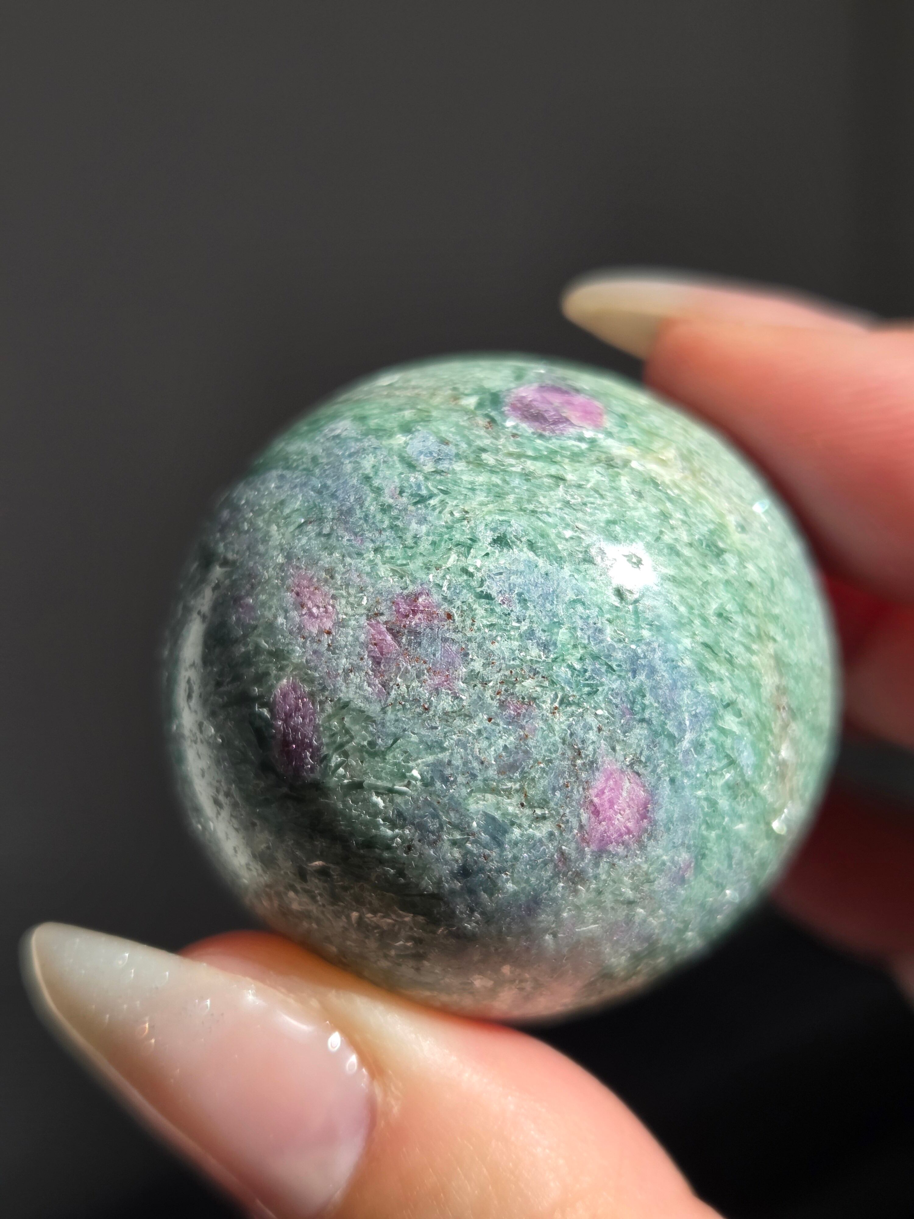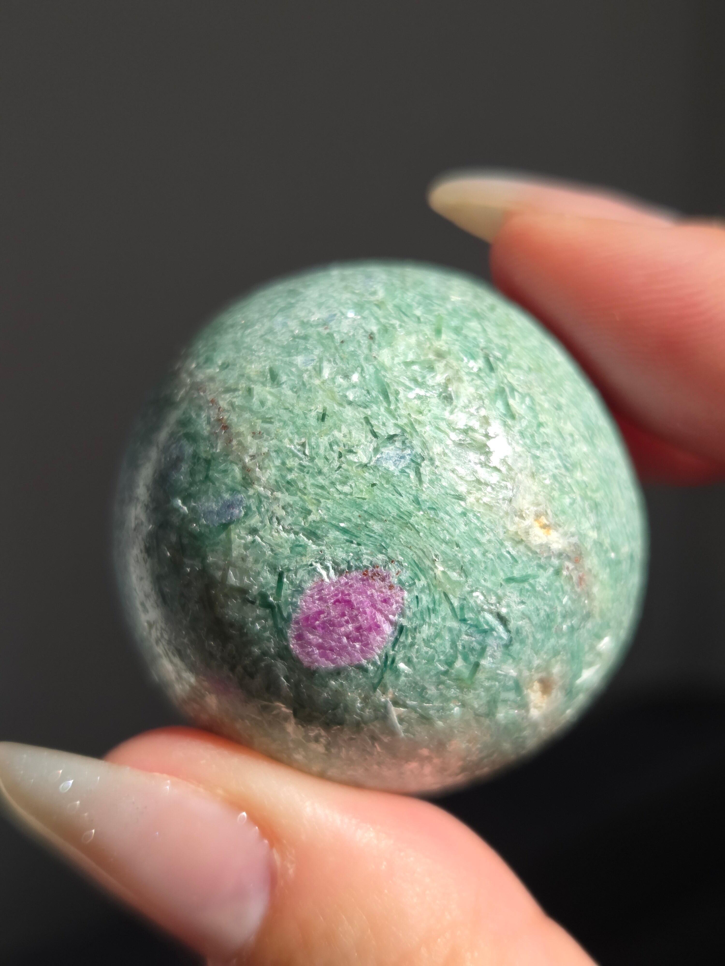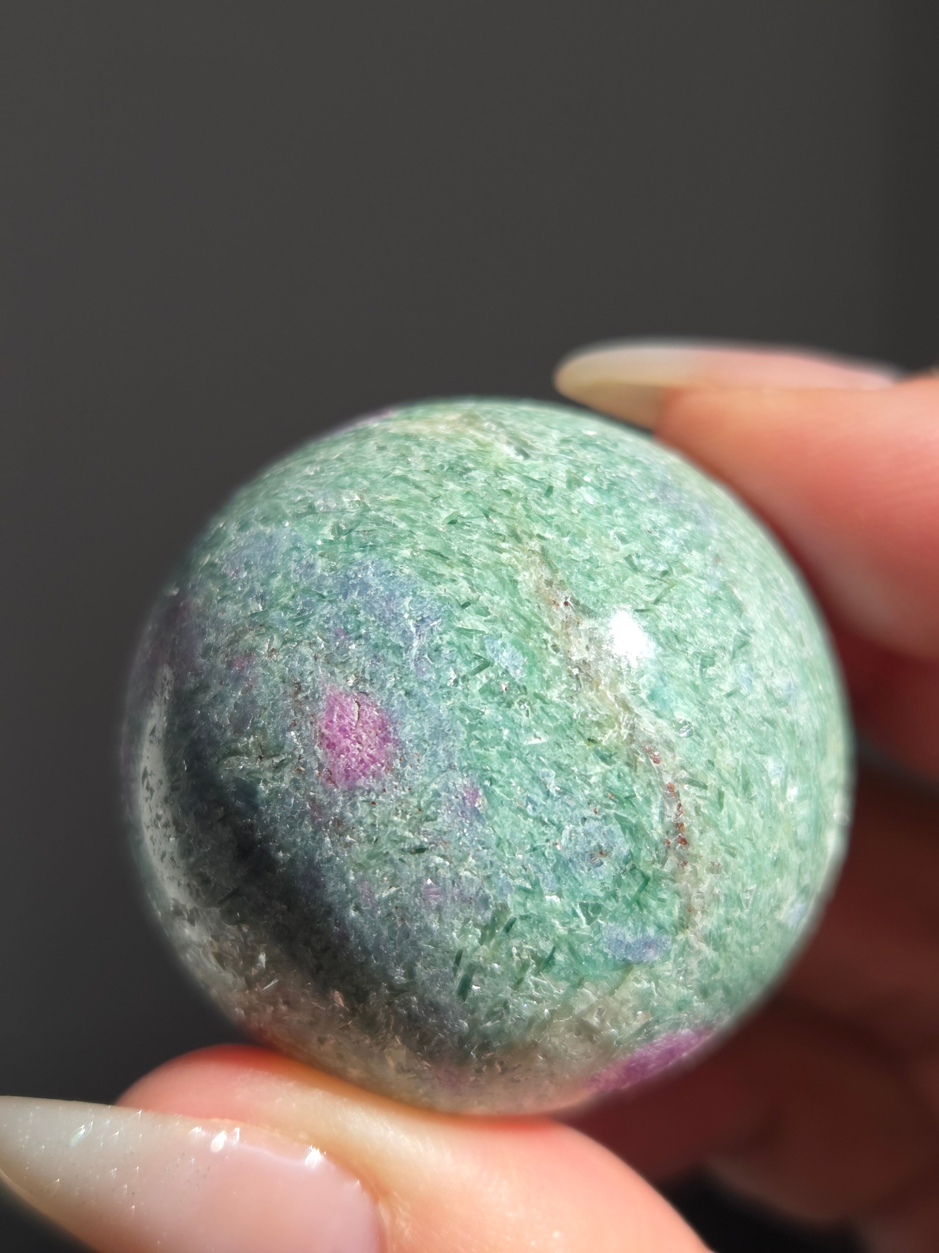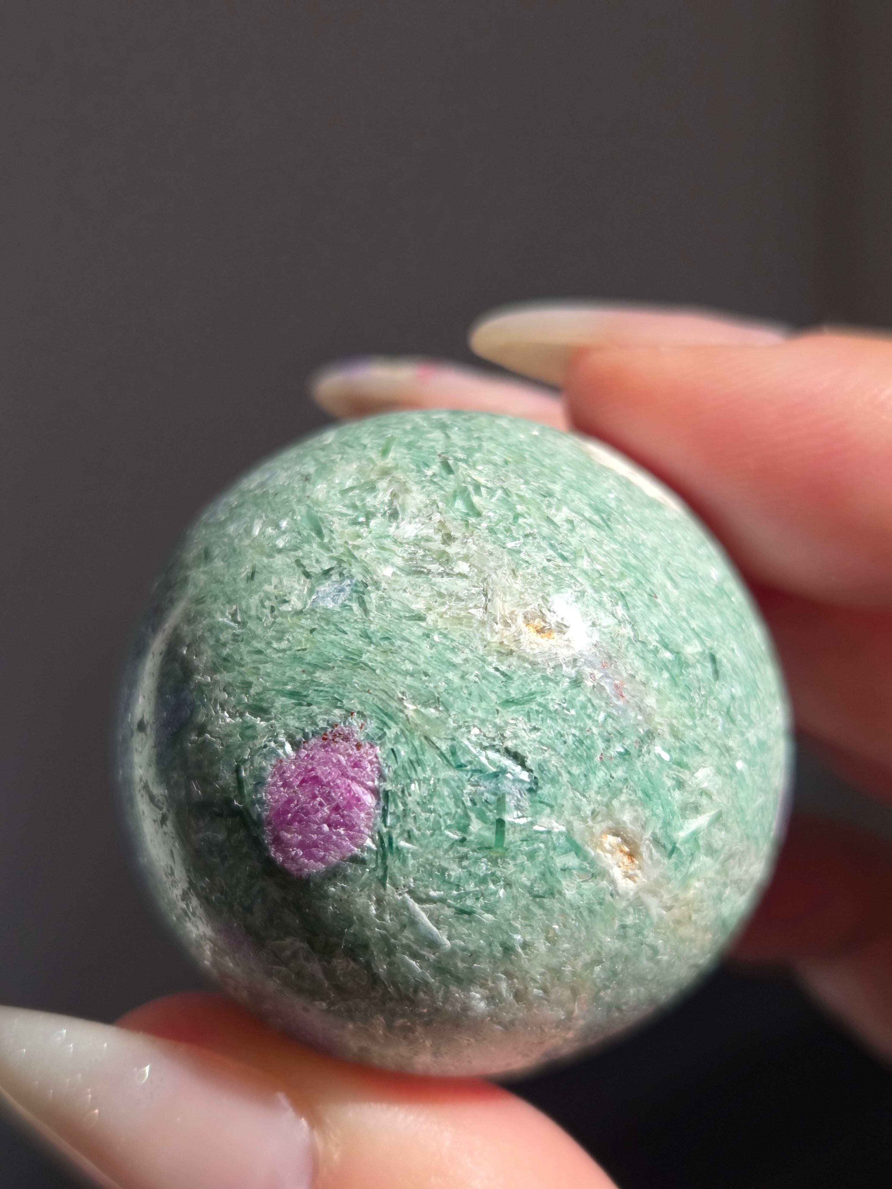 含浸処理をしていない原石スフィアです。今回のルビーインフックサイトは、マイカが多くキラキラしているぶん自然の凹み部分もあります。