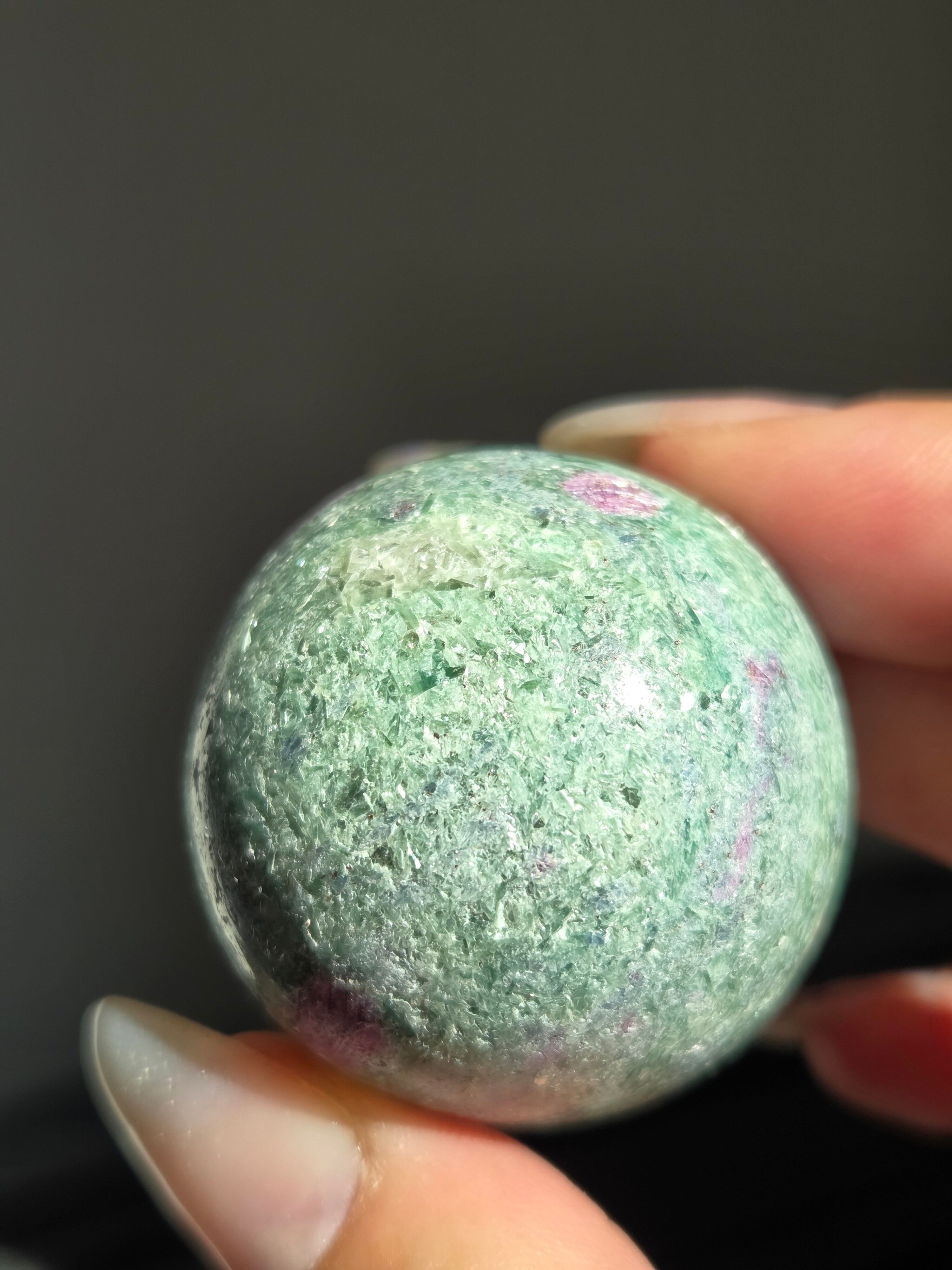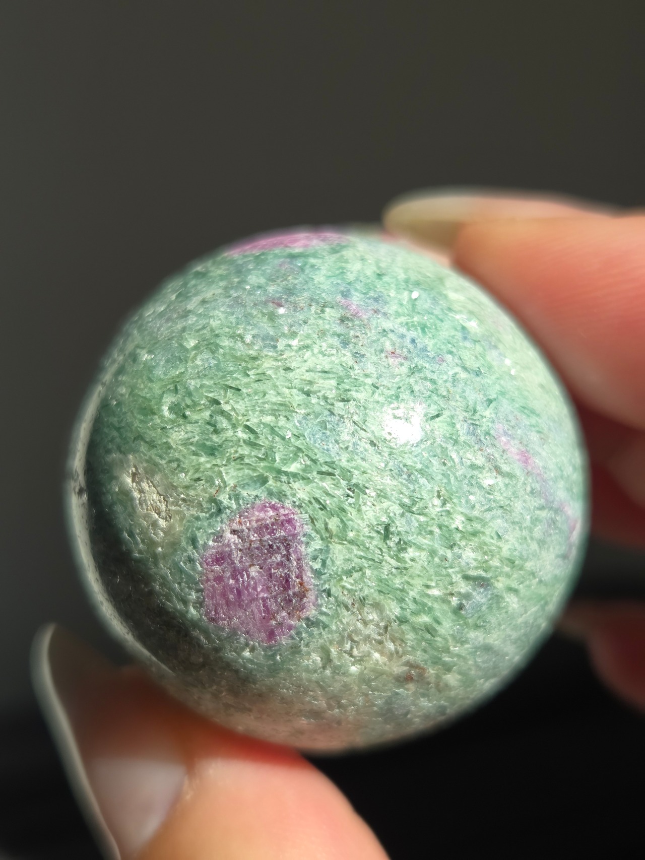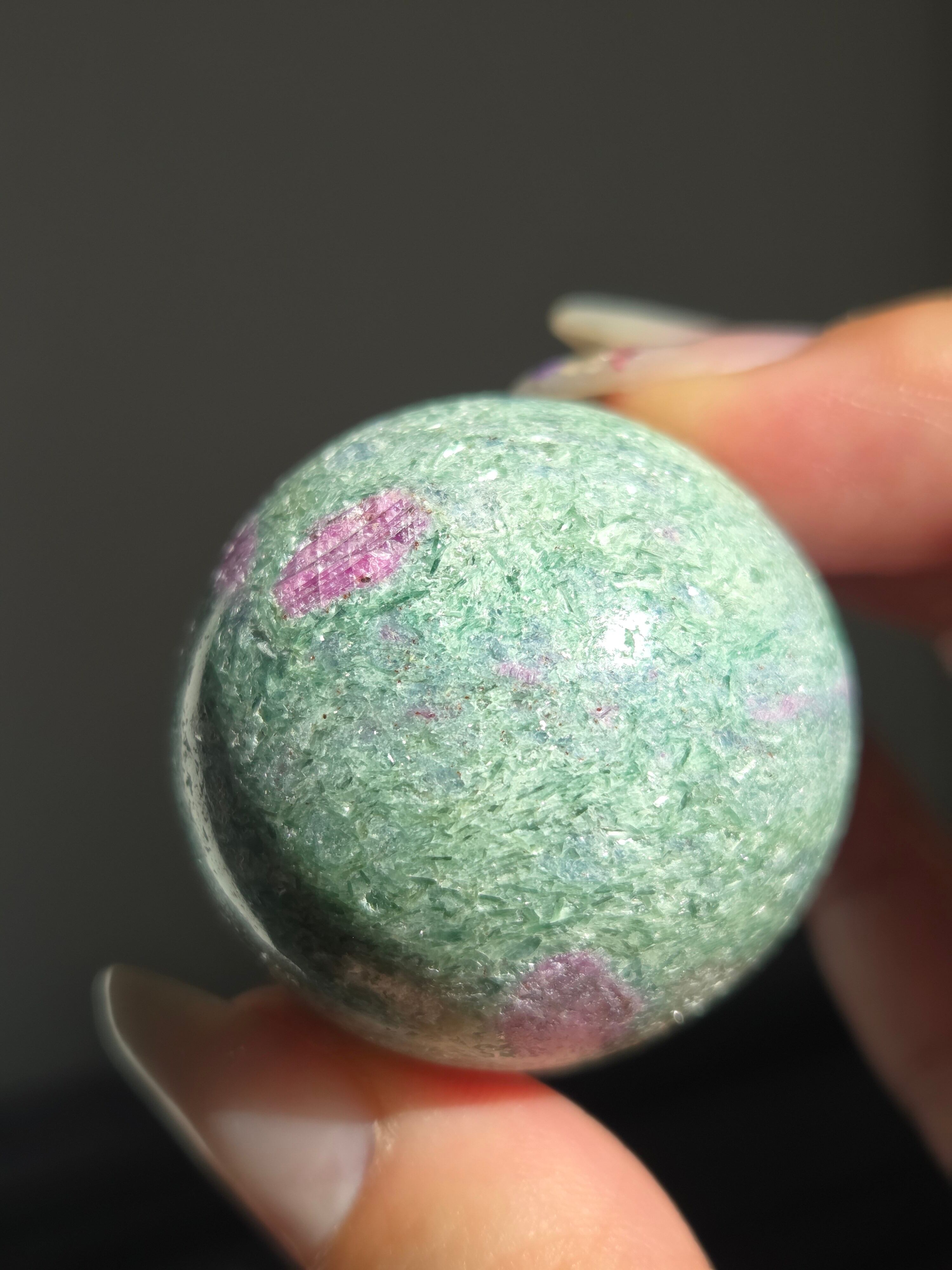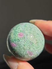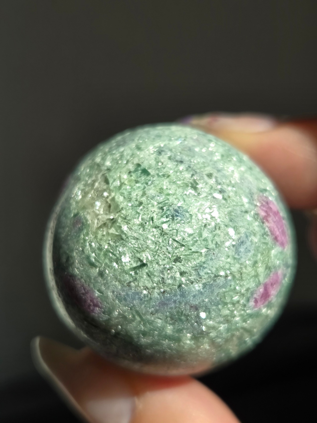 含浸処理をしていない原石スフィアです。今回のルビーインフックサイトは、マイカが多くキラキラしているぶん自然の凹み部分もあります。