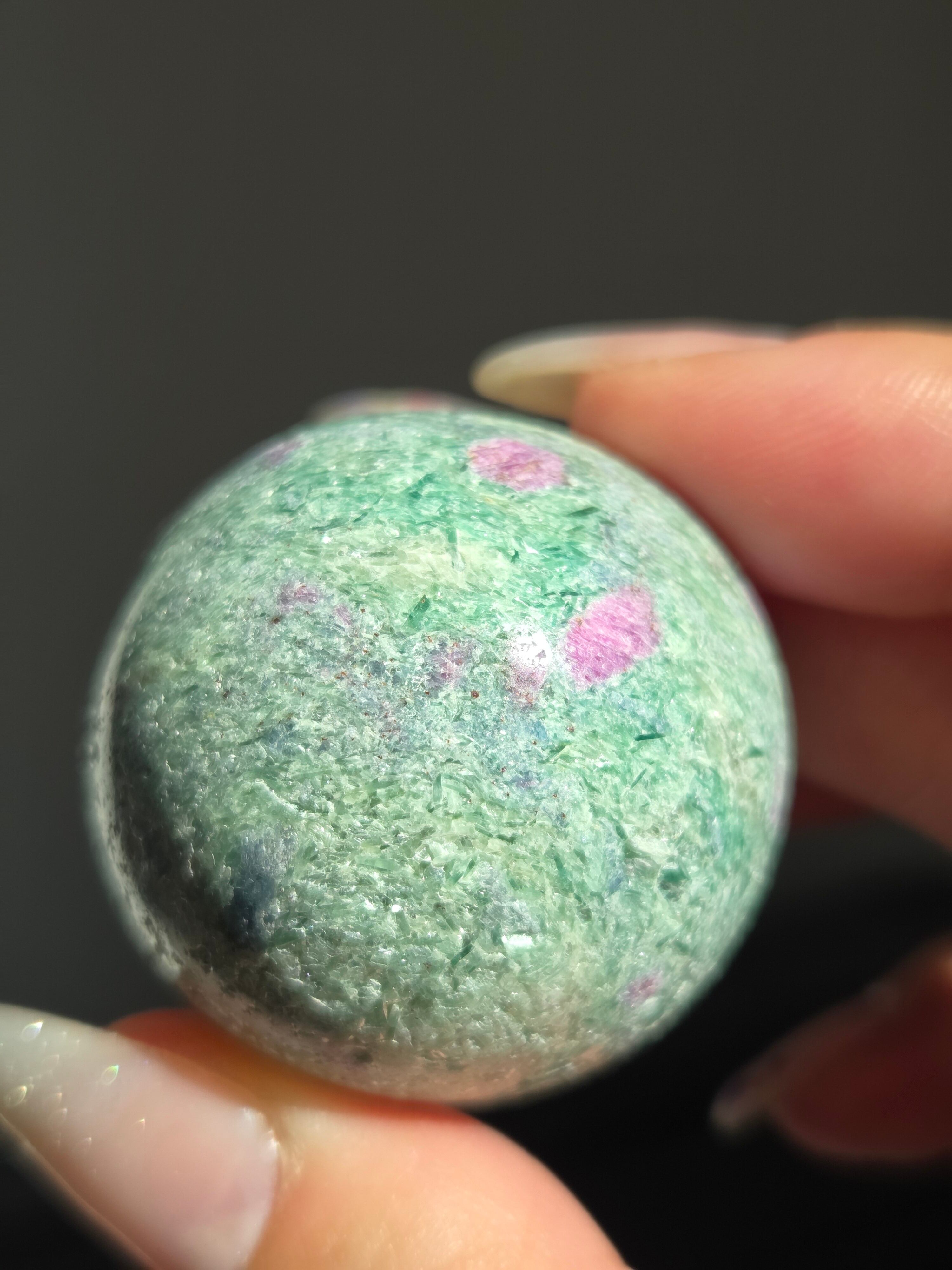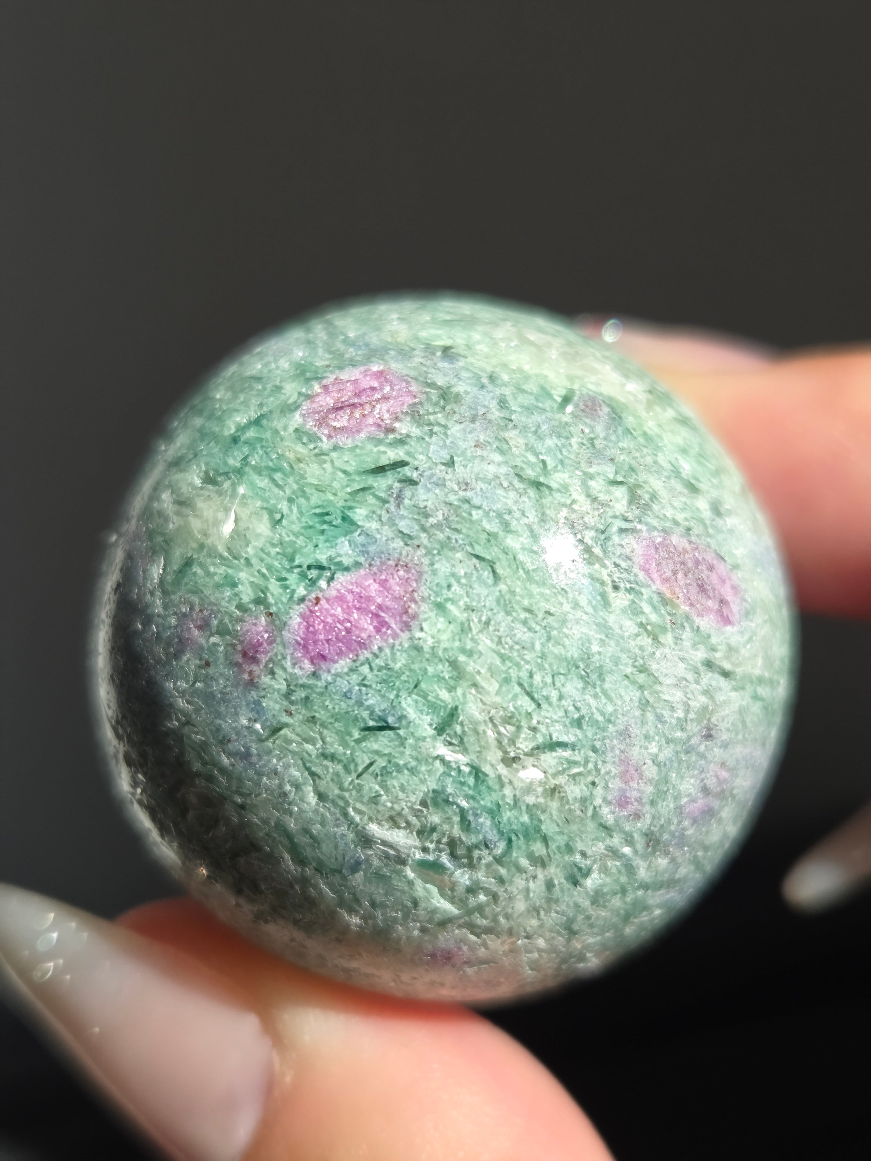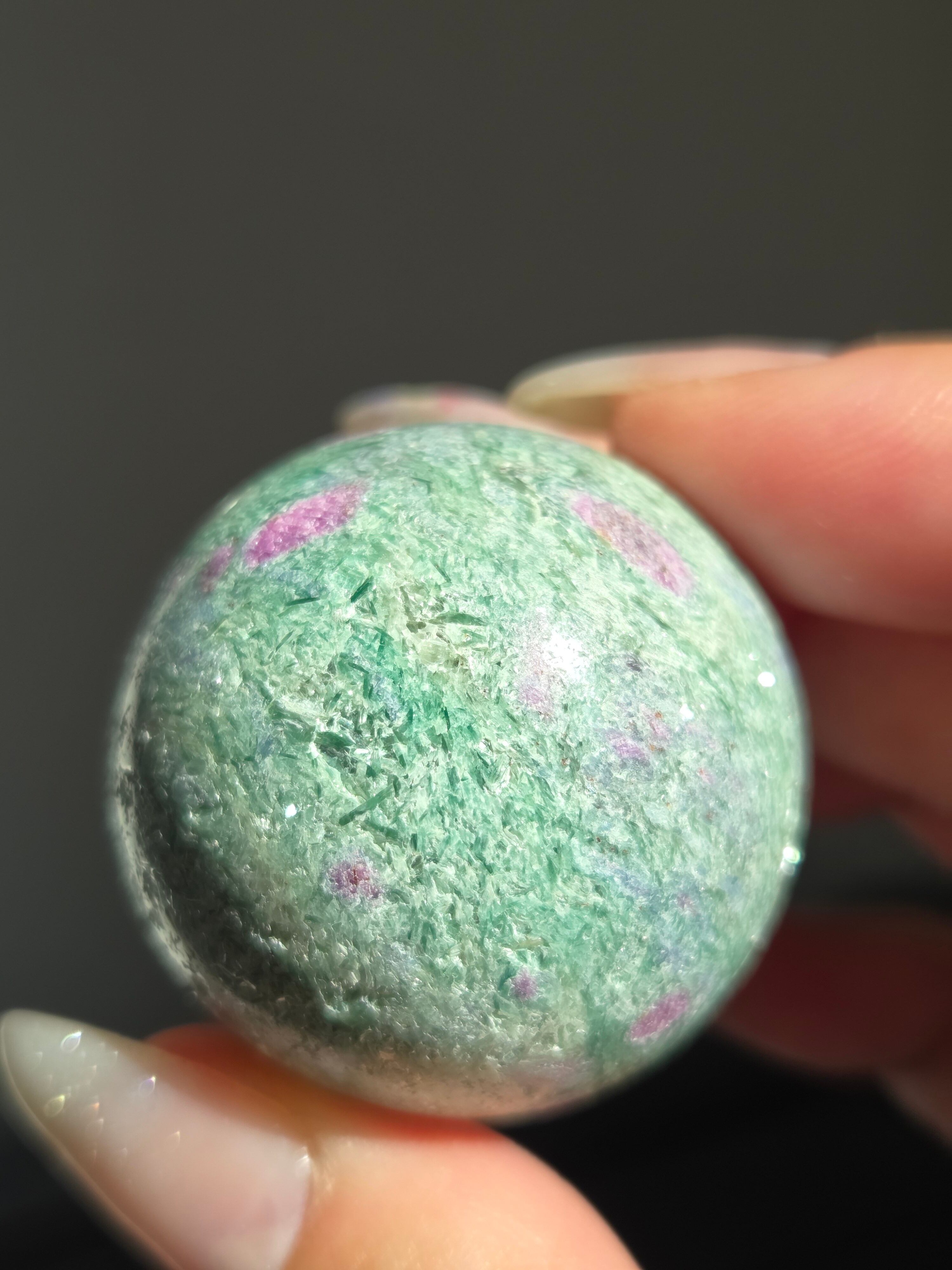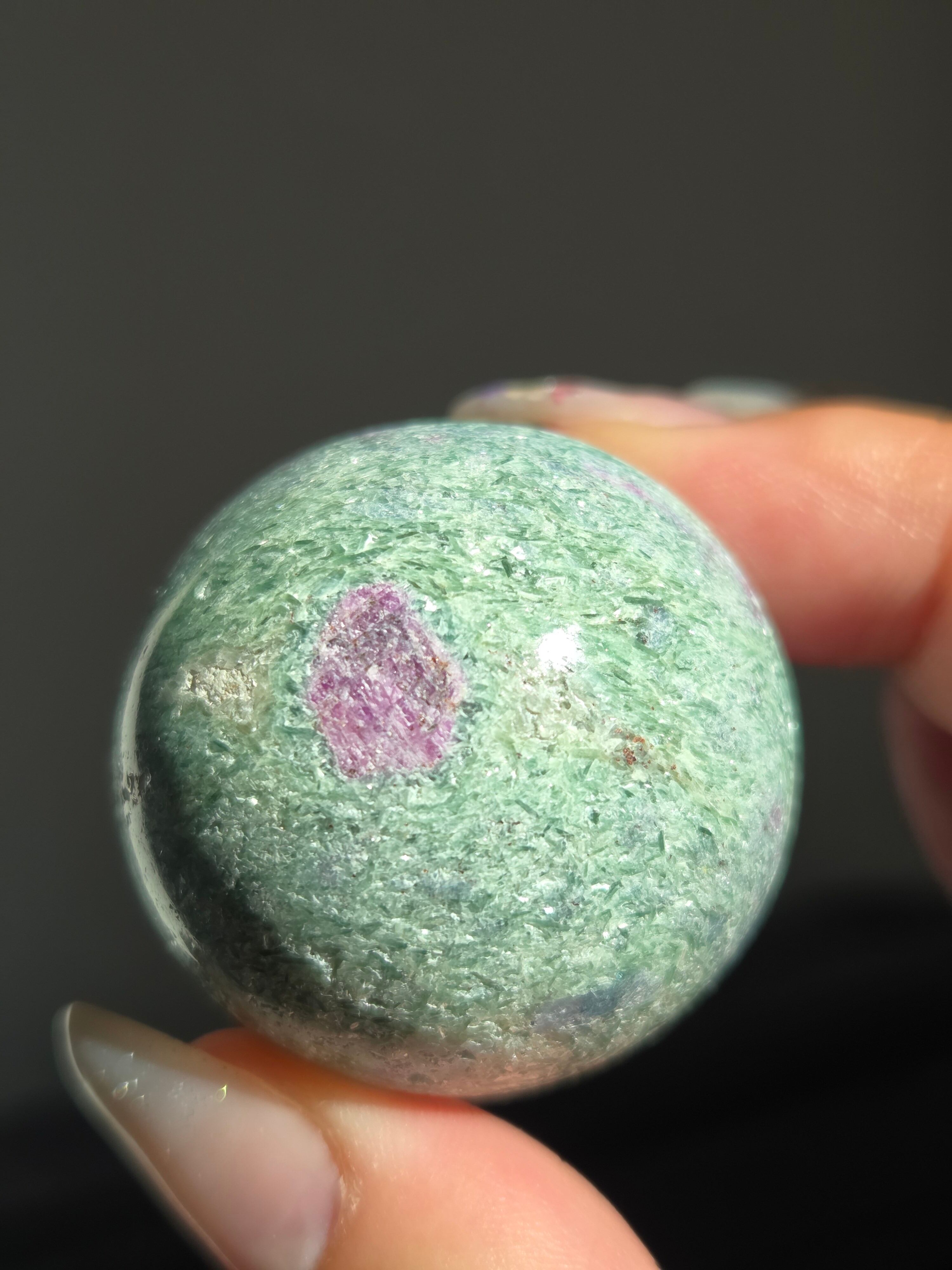 含浸処理をしていない原石スフィアです。今回のルビーインフックサイトは、マイカが多くキラキラしているぶん自然の凹み部分もあります。