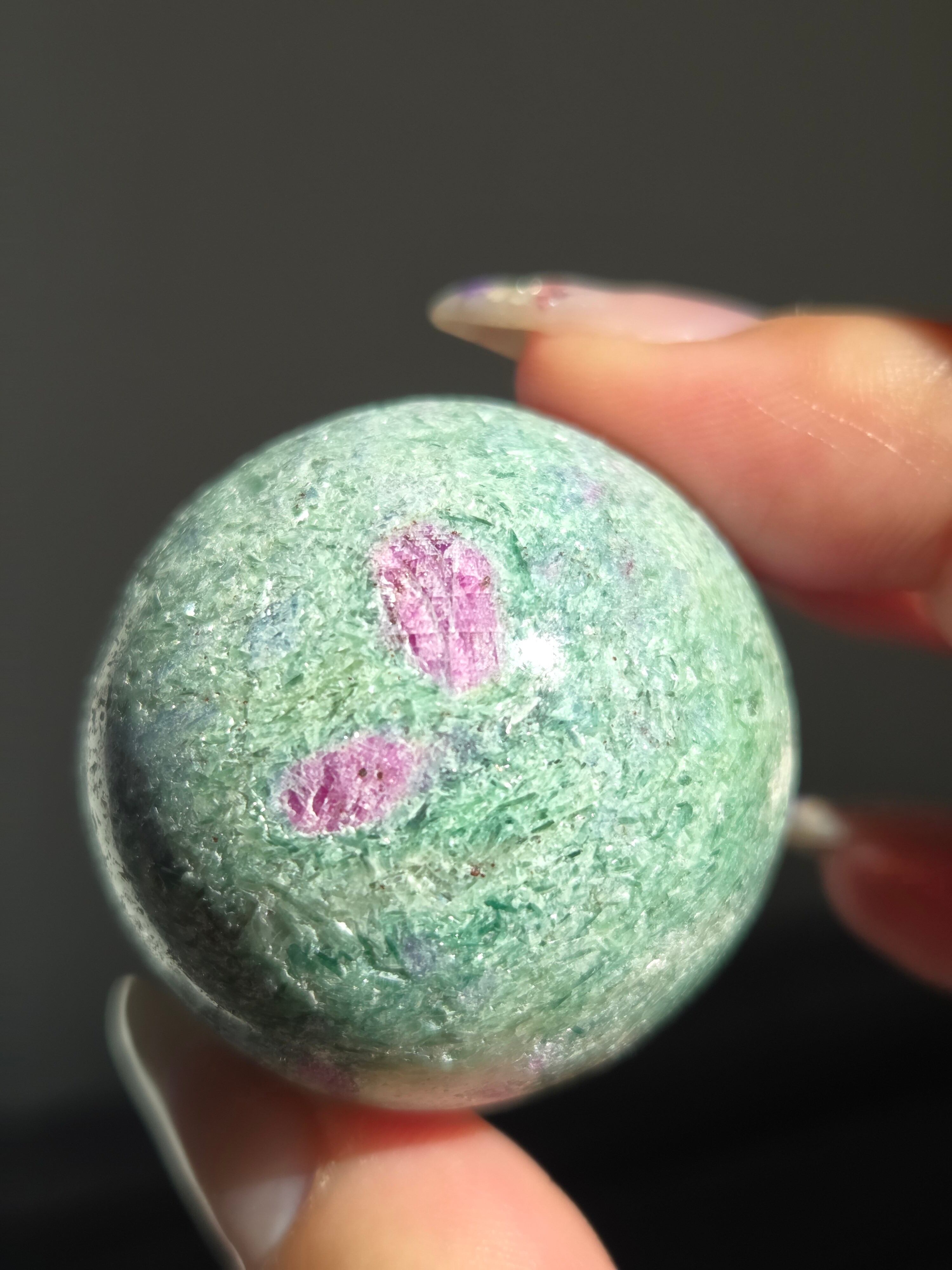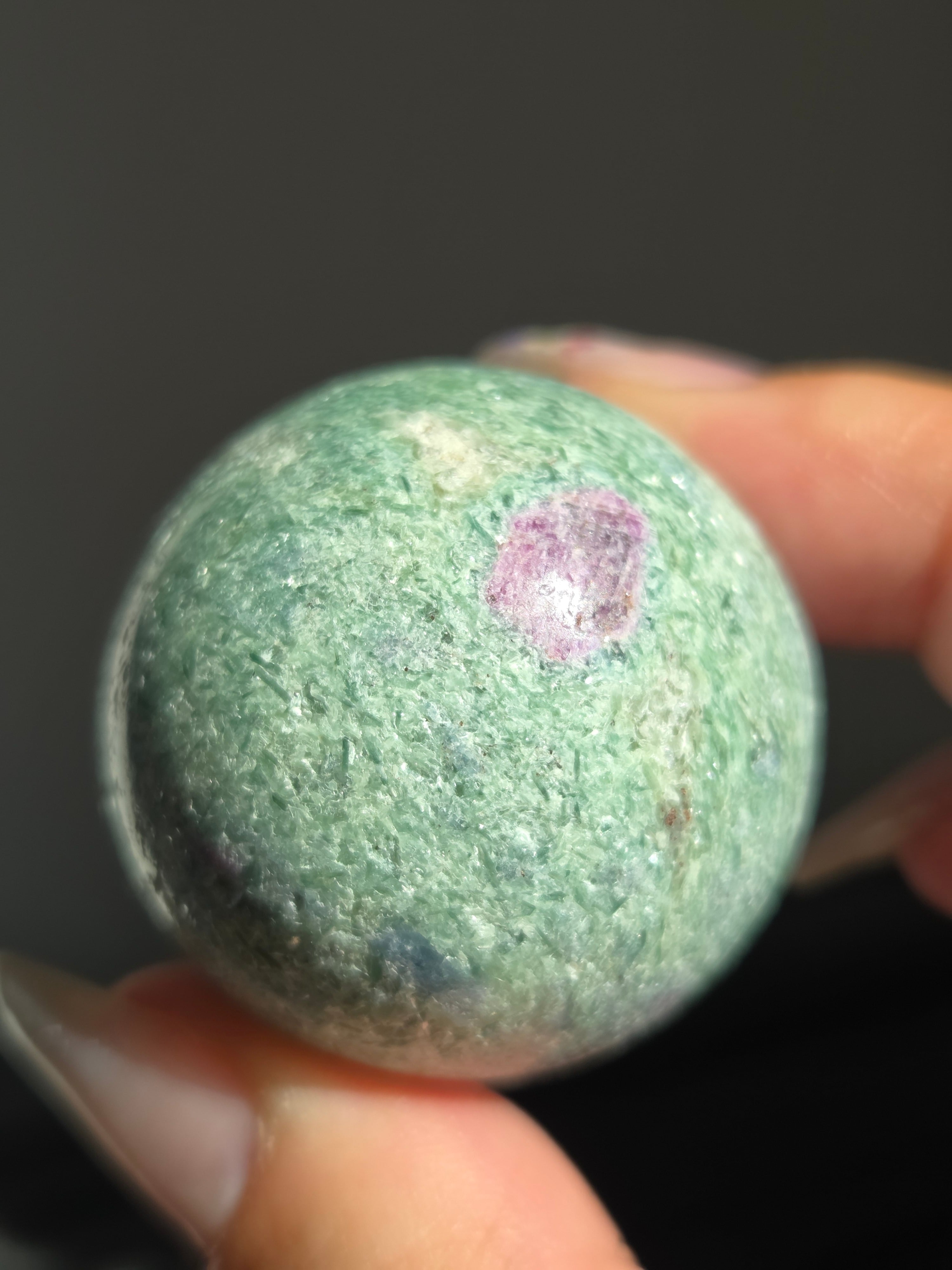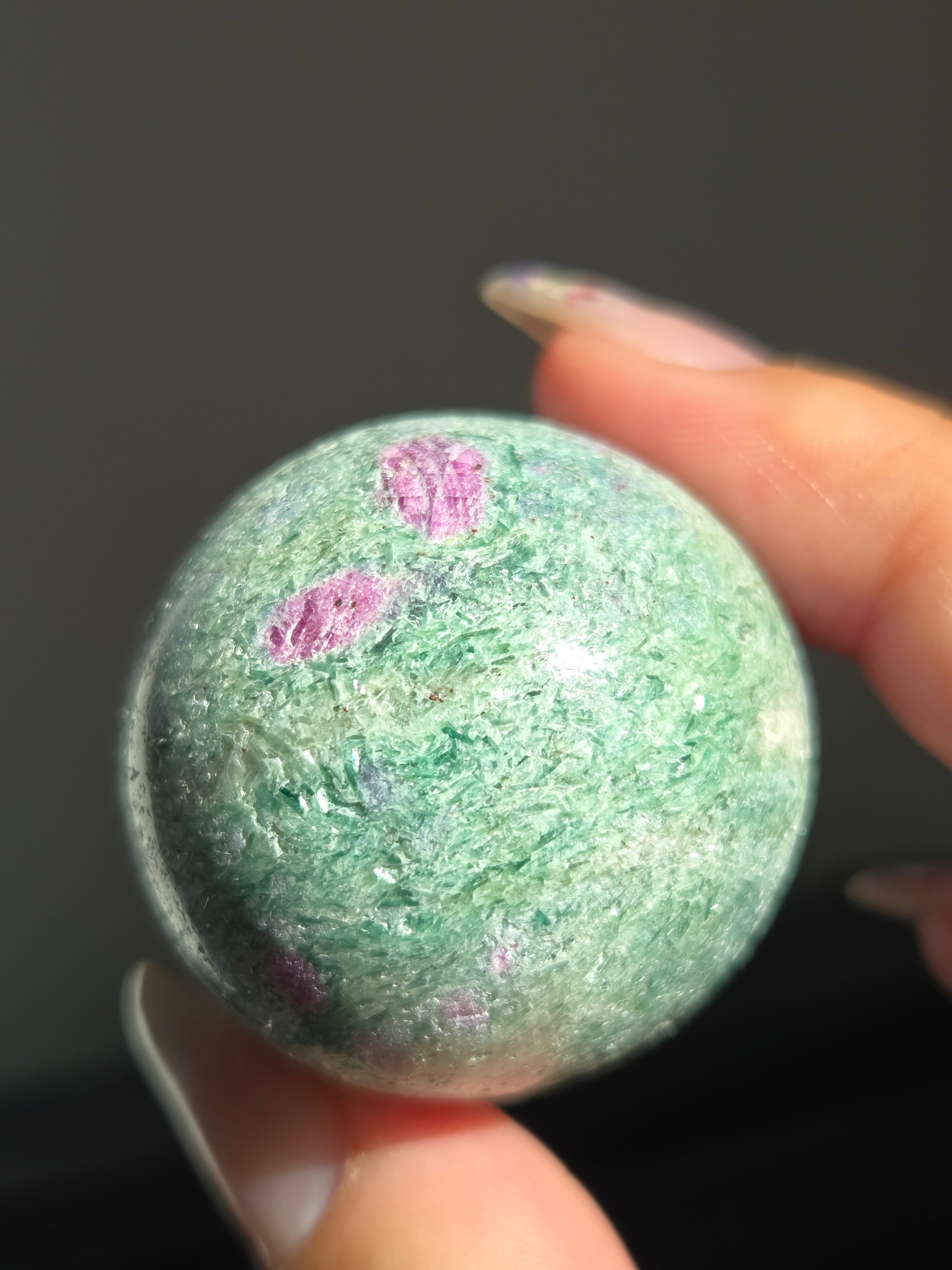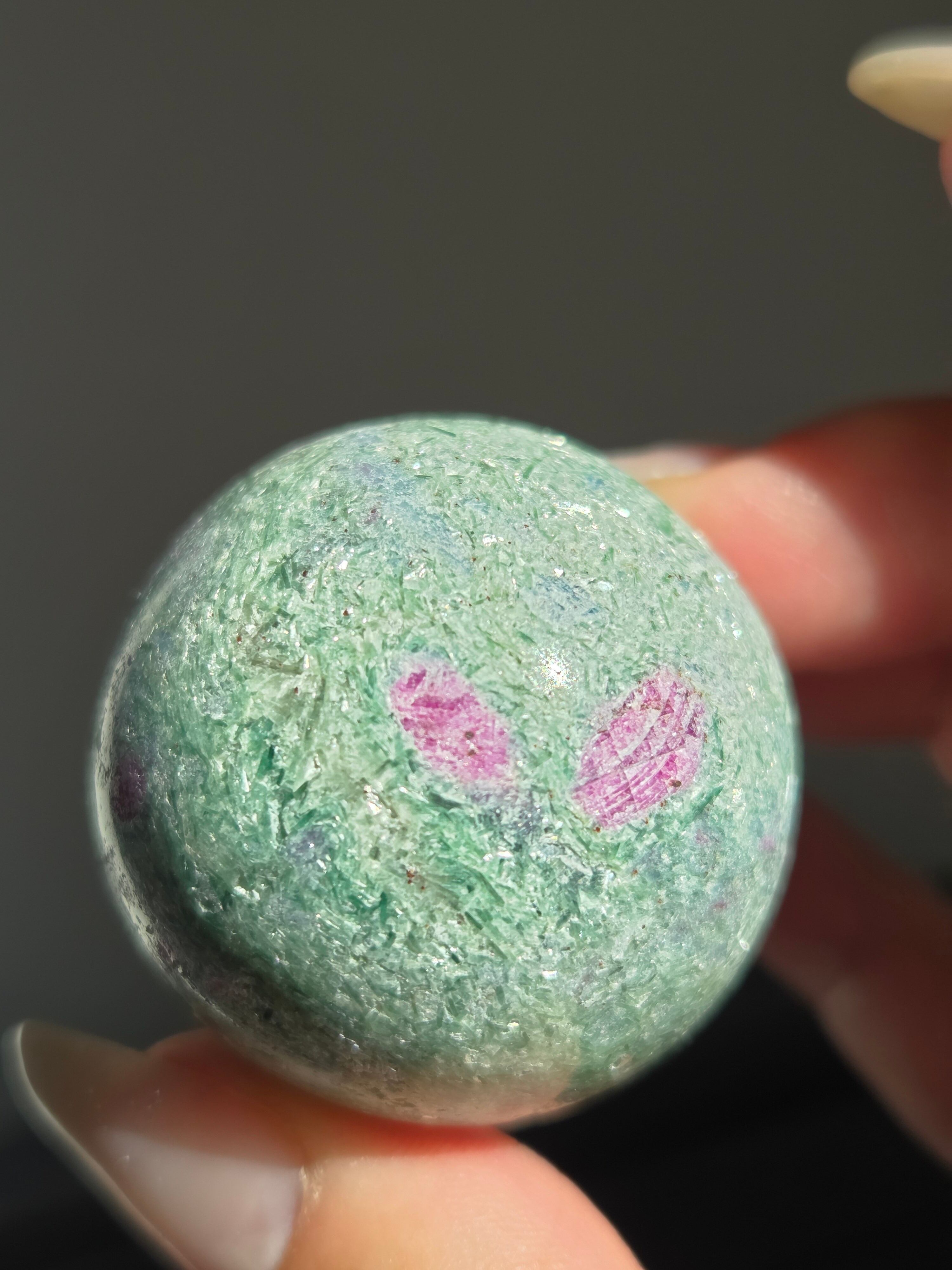 含浸処理をしていない原石スフィアです。今回のルビーインフックサイトは、マイカが多くキラキラしているぶん自然の凹み部分もあります。