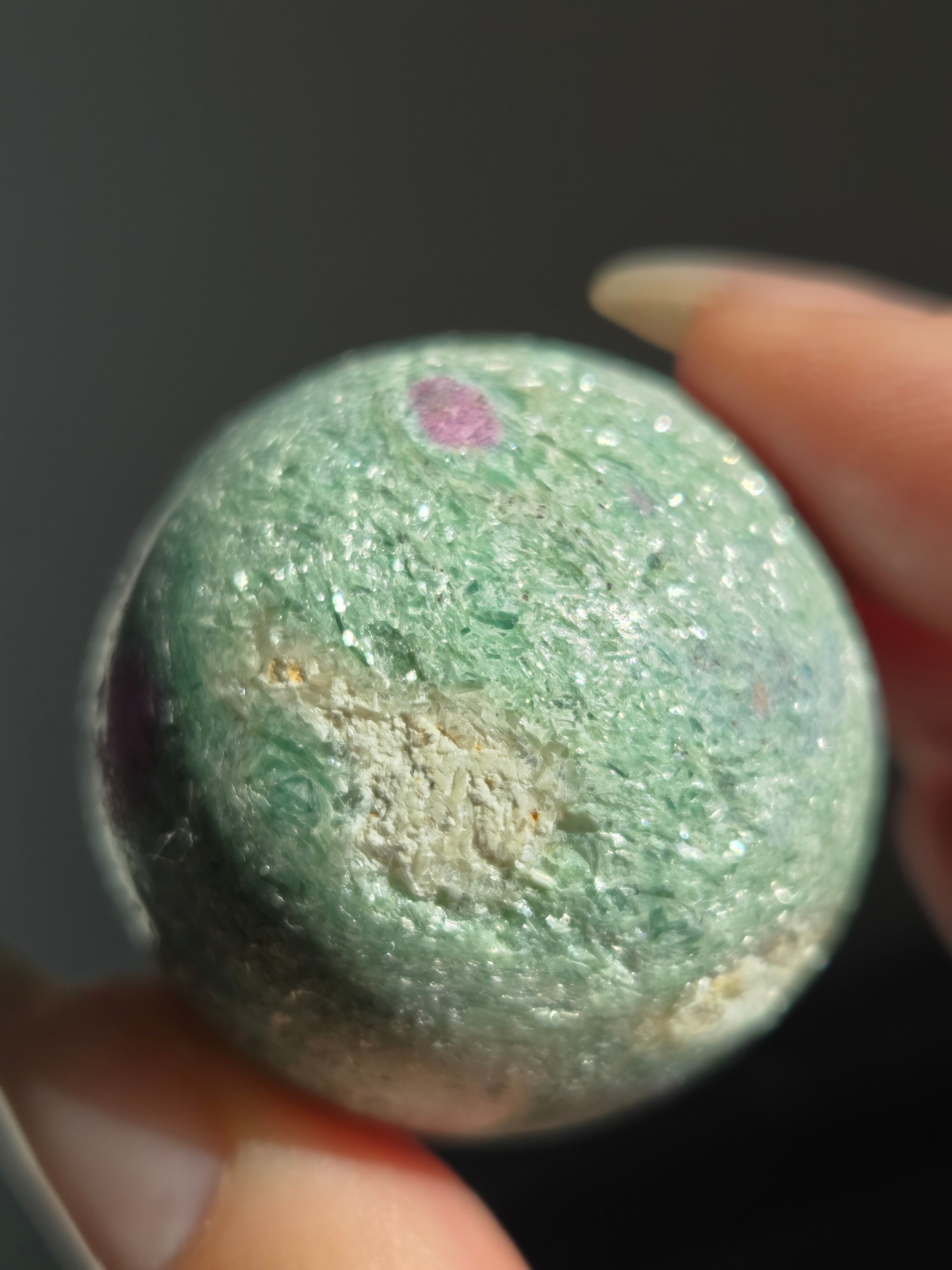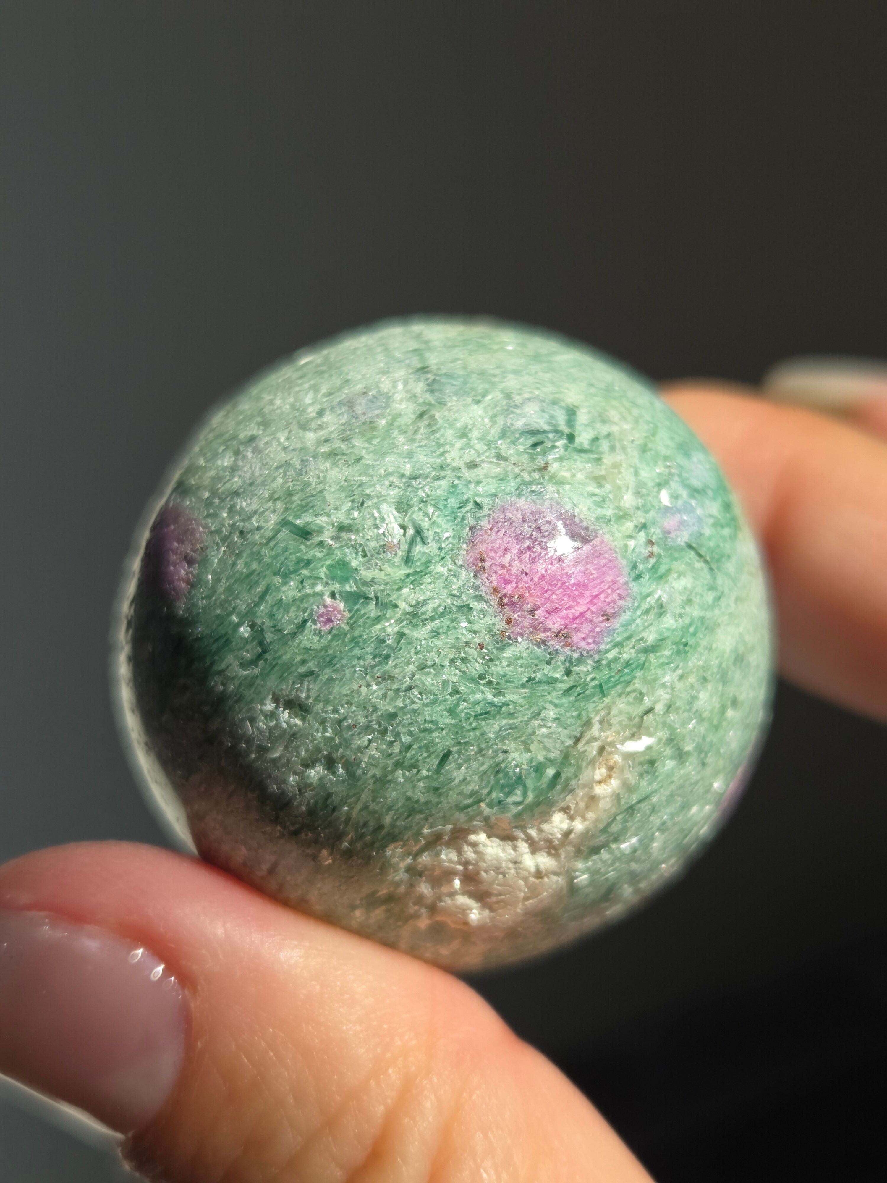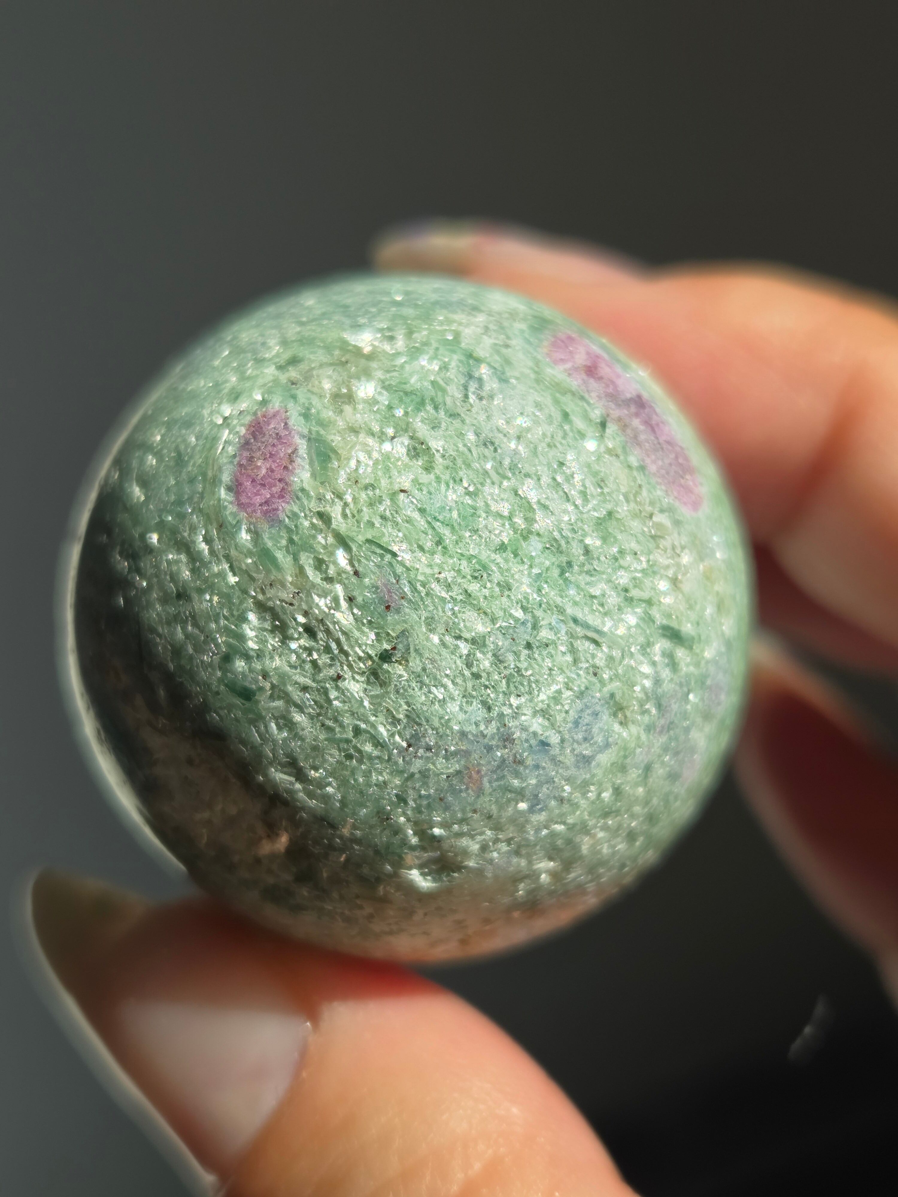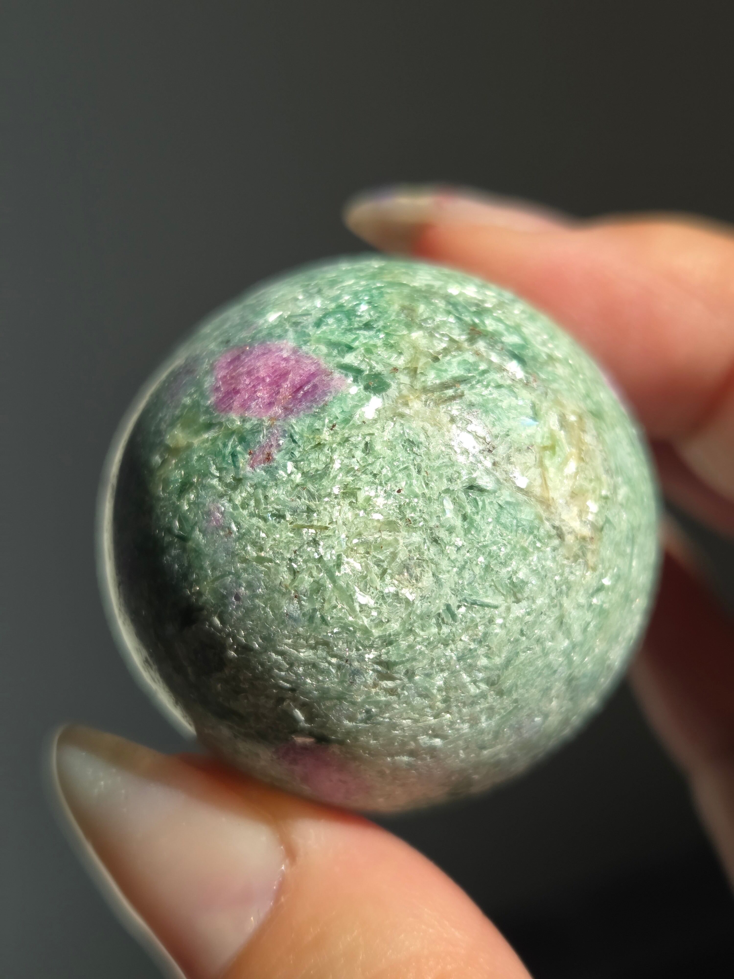 含浸処理をしていない原石スフィアです。今回のルビーインフックサイトは、マイカが多くキラキラしているぶん自然の凹み部分もあります。