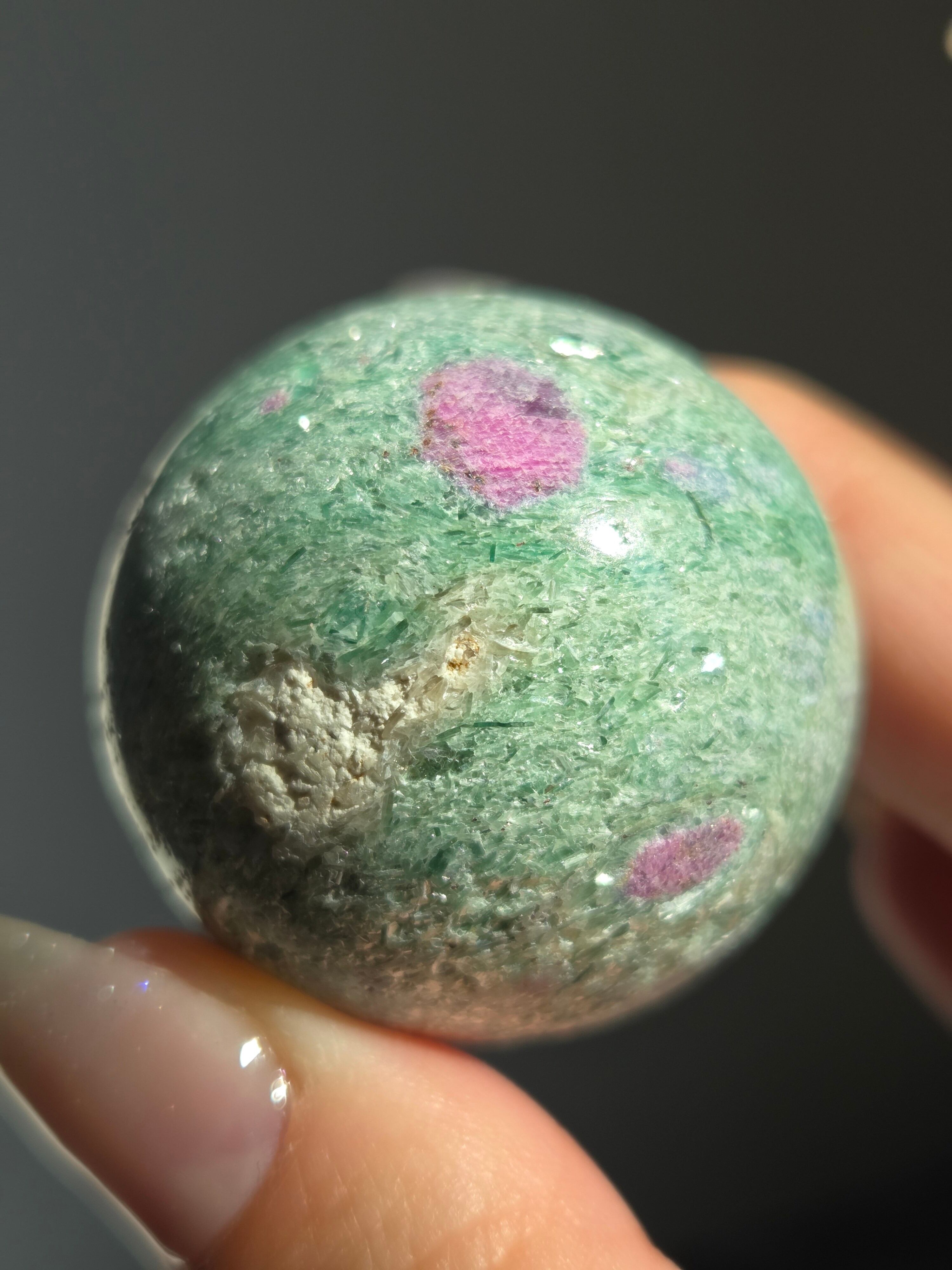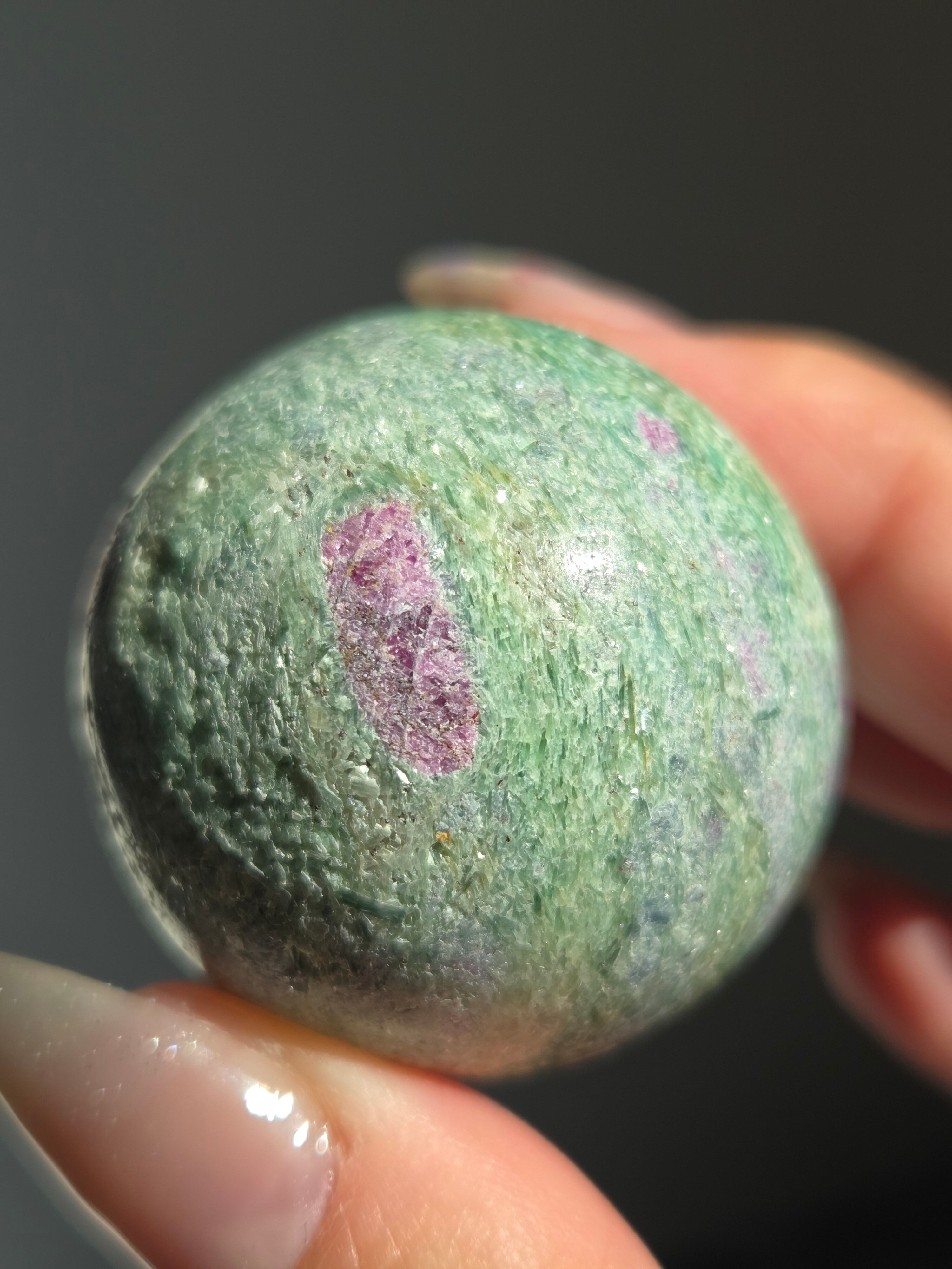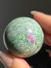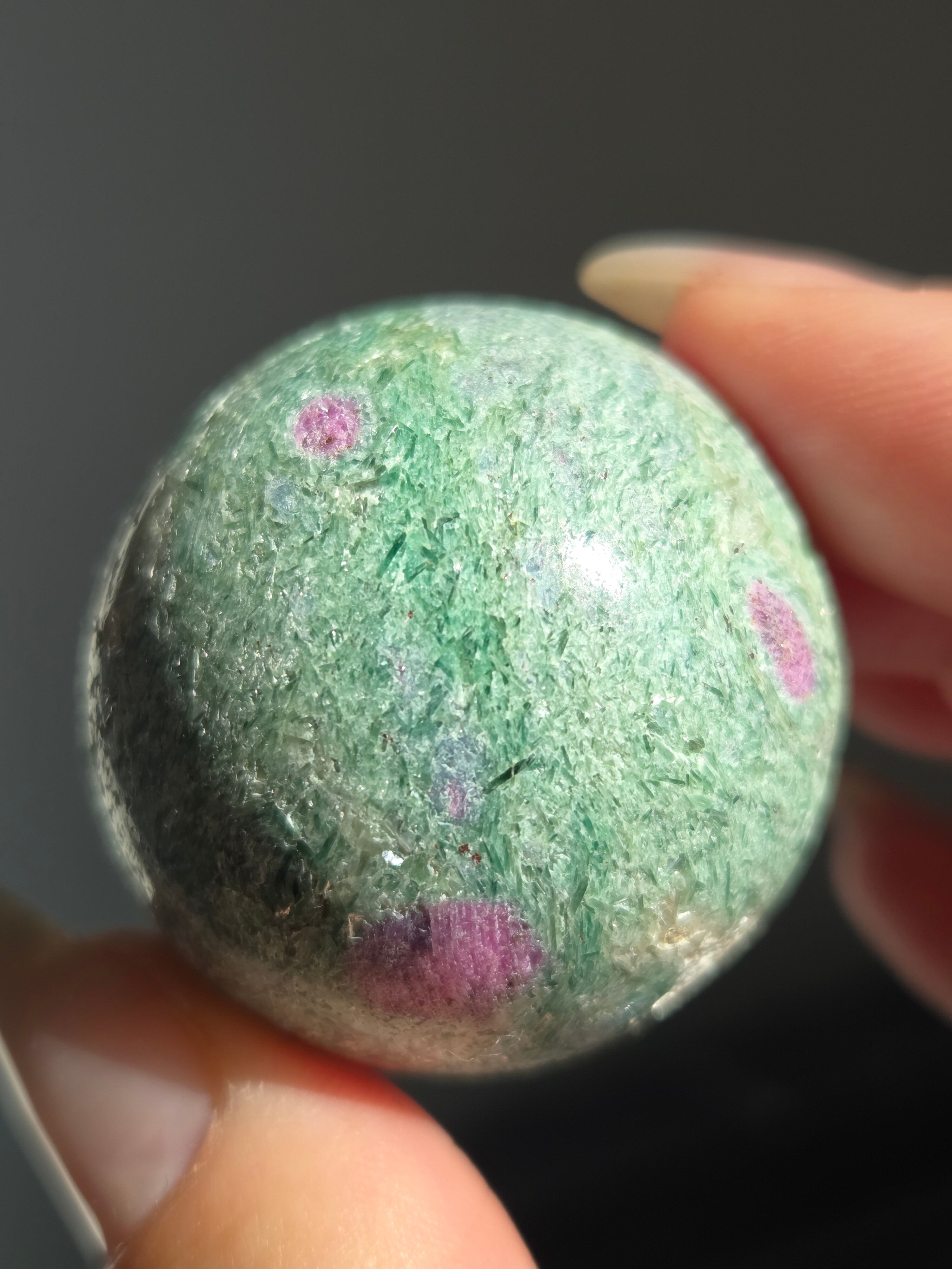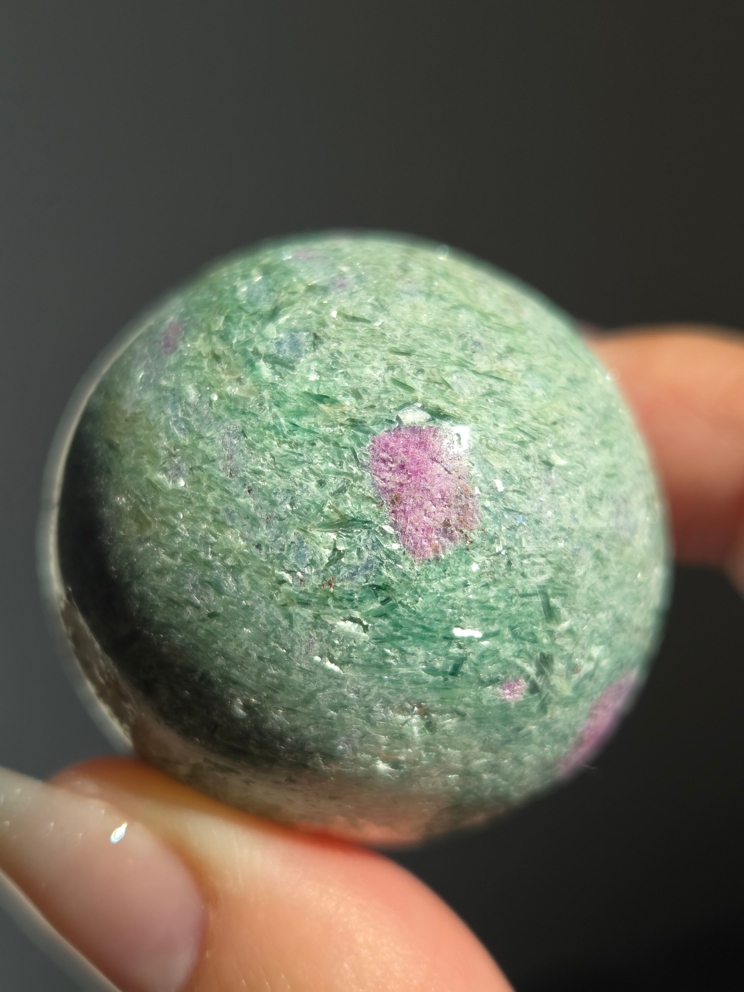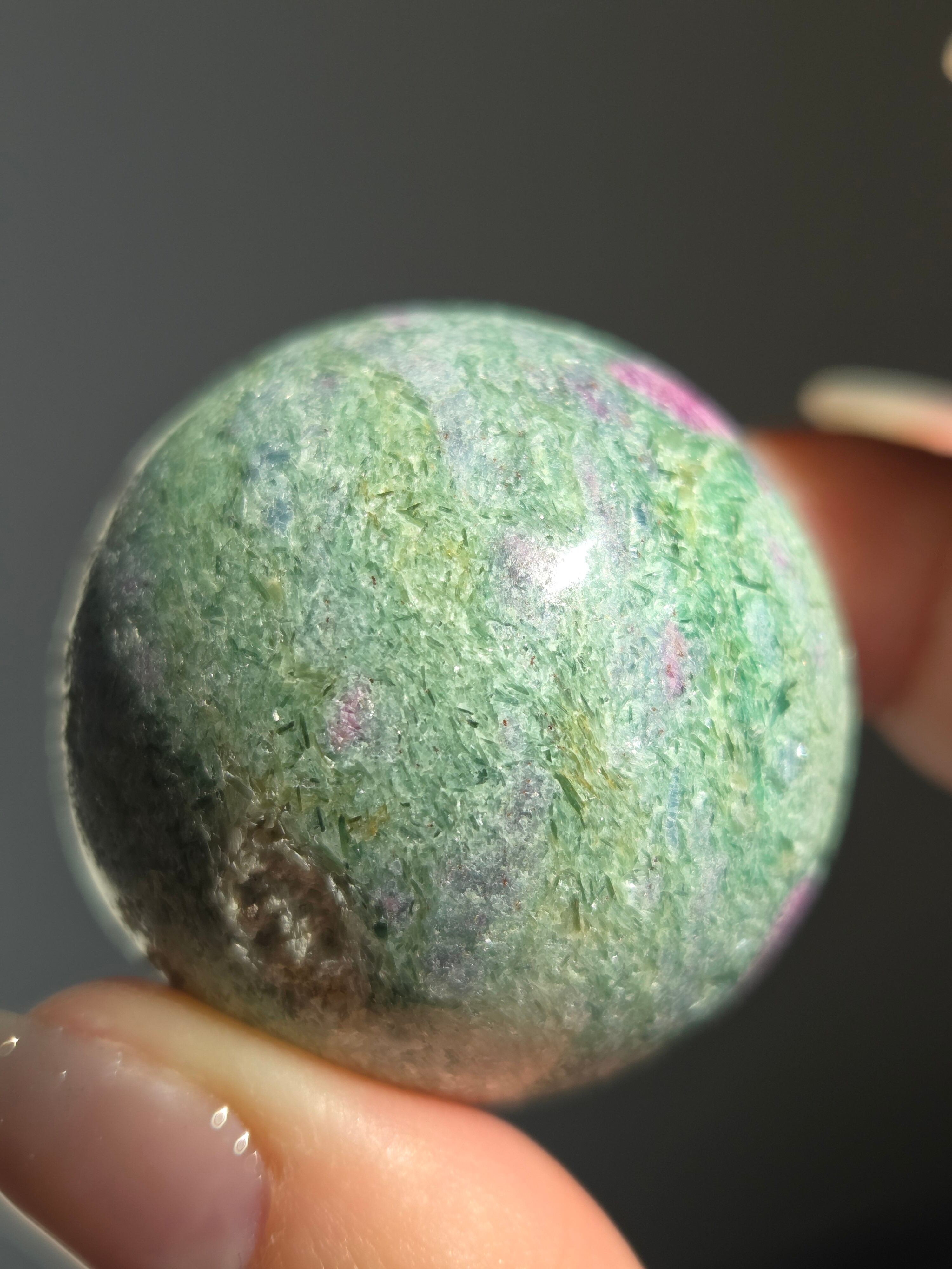 含浸処理をしていない原石スフィアです。今回のルビーインフックサイトは、マイカが多くキラキラしているぶん自然の凹み部分もあります。
