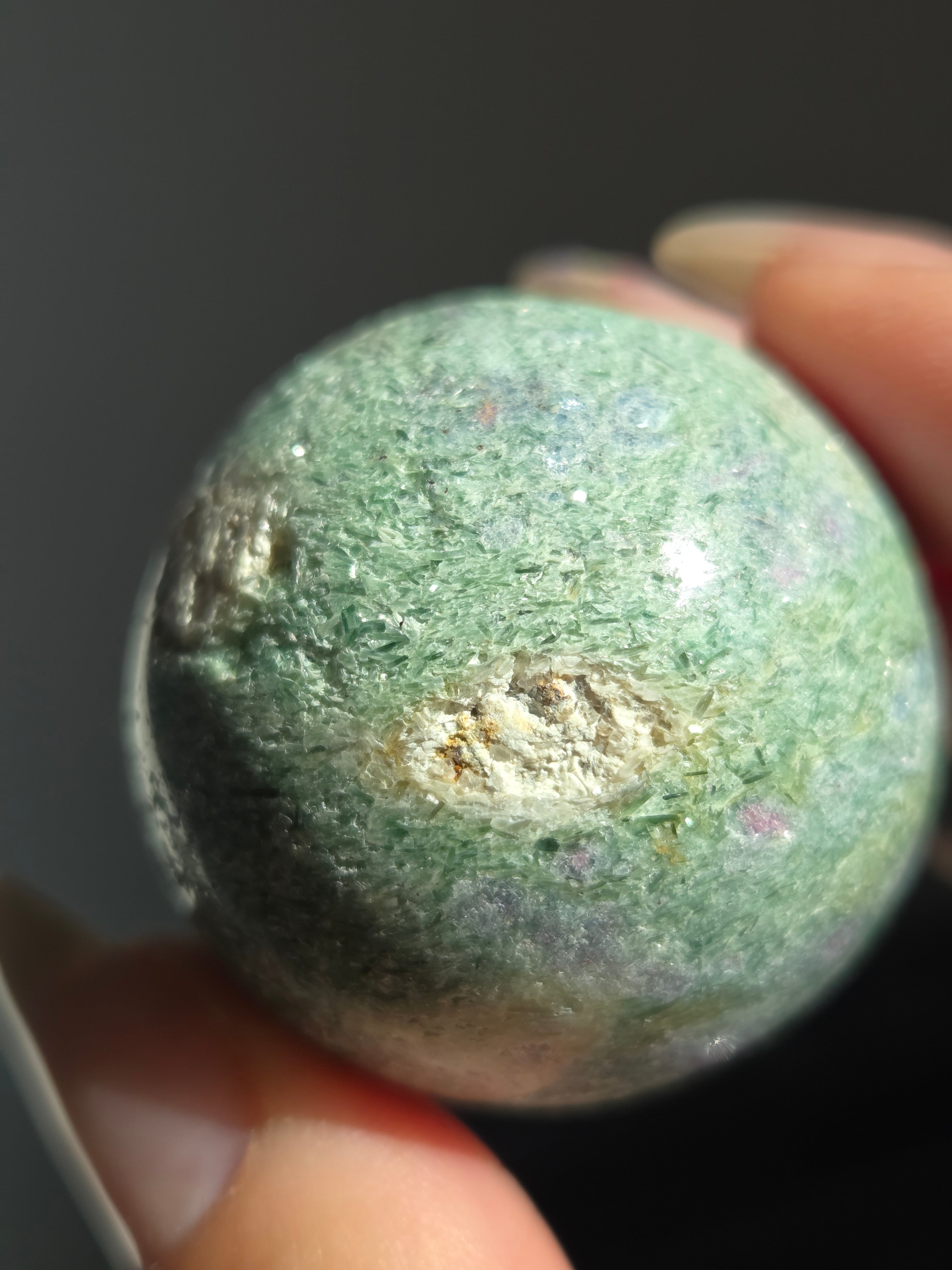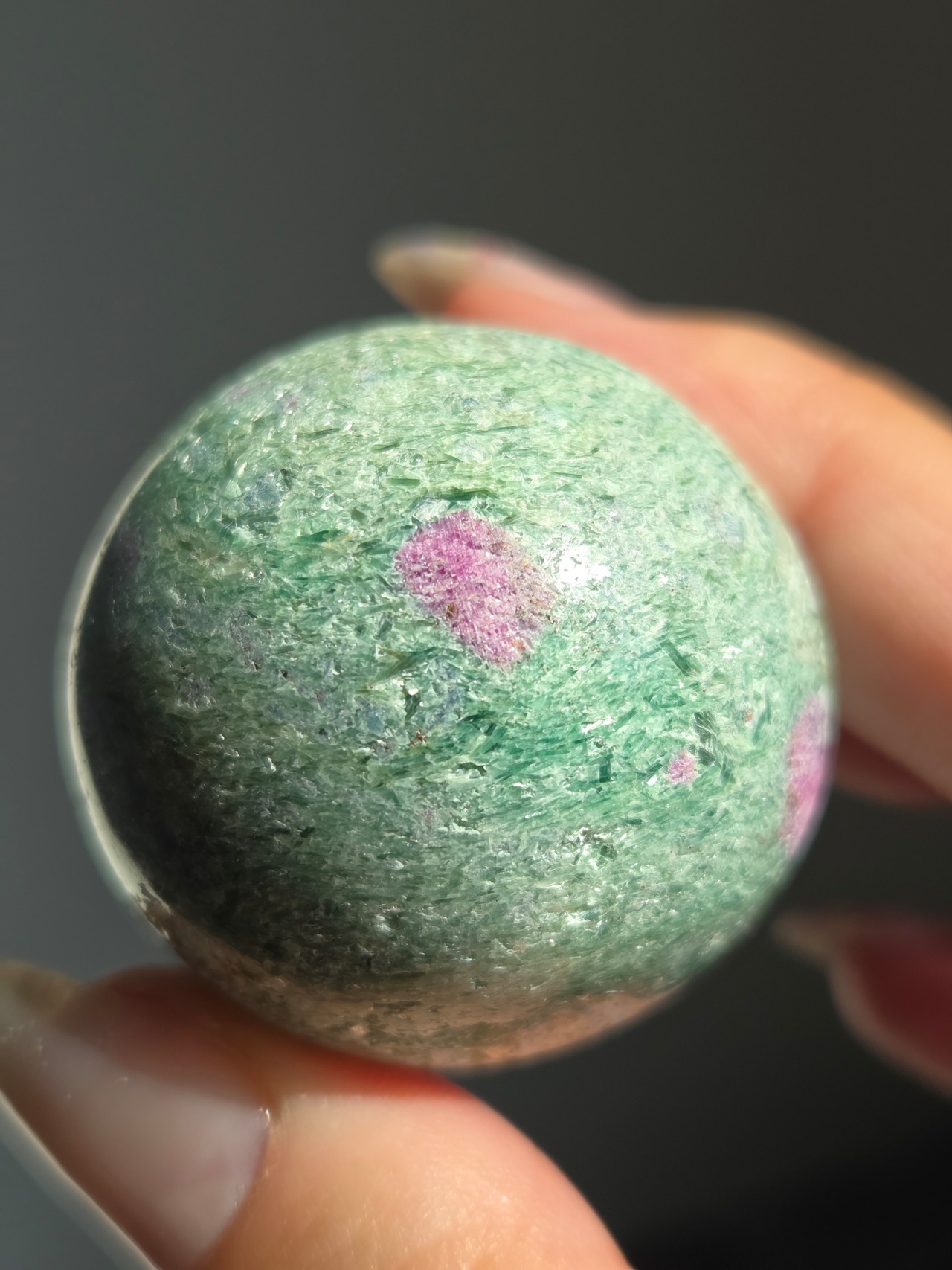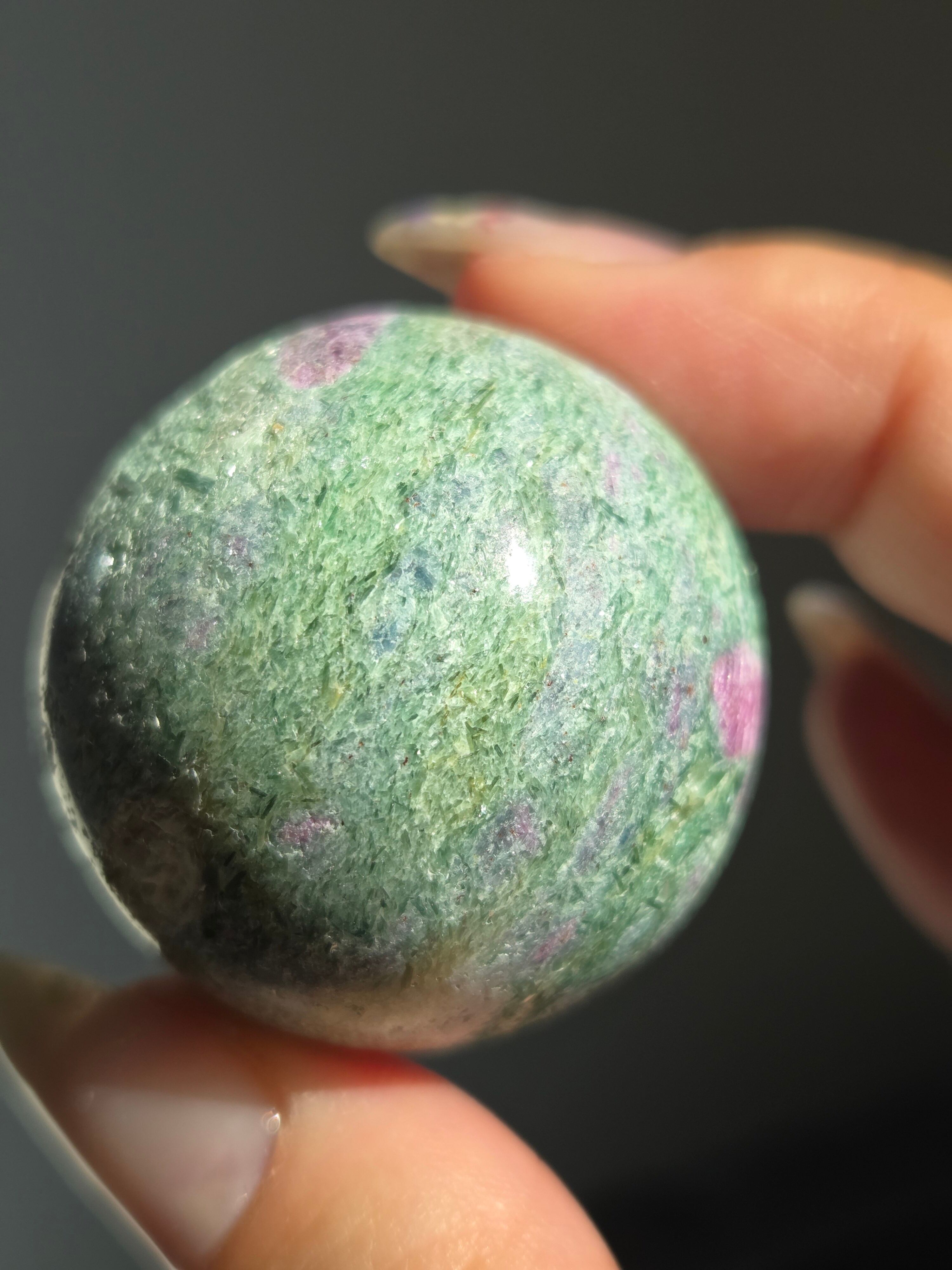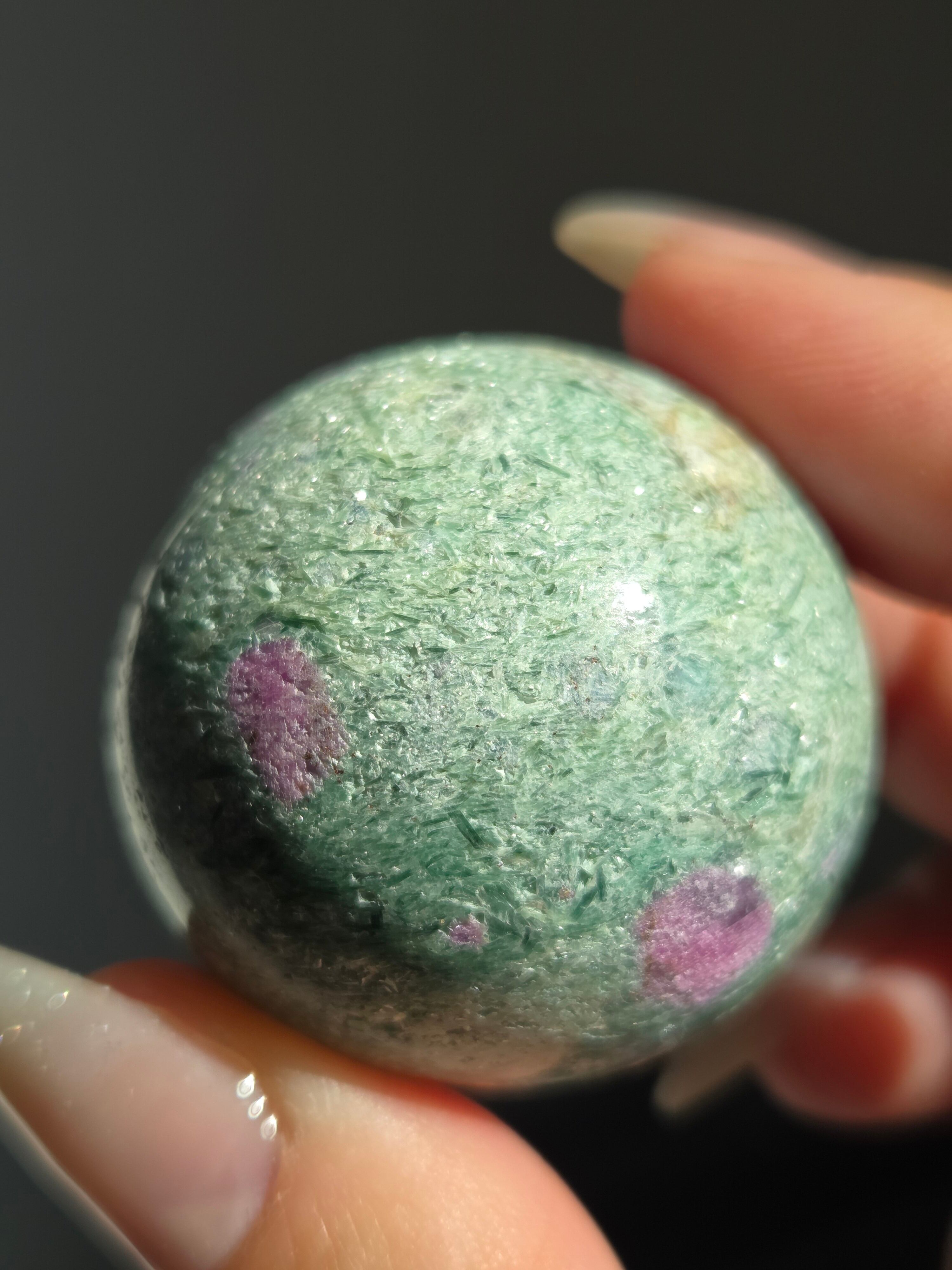 含浸処理をしていない原石スフィアです。今回のルビーインフックサイトは、マイカが多くキラキラしているぶん自然の凹み部分もあります。