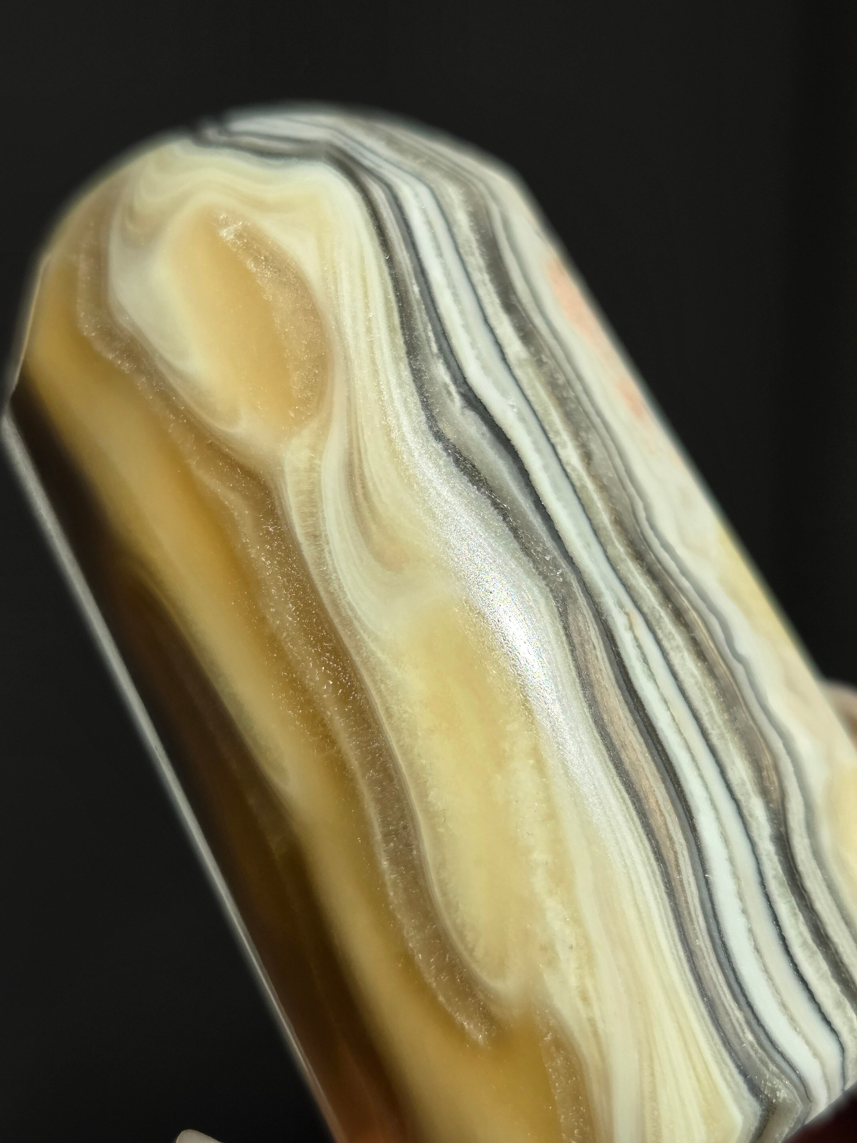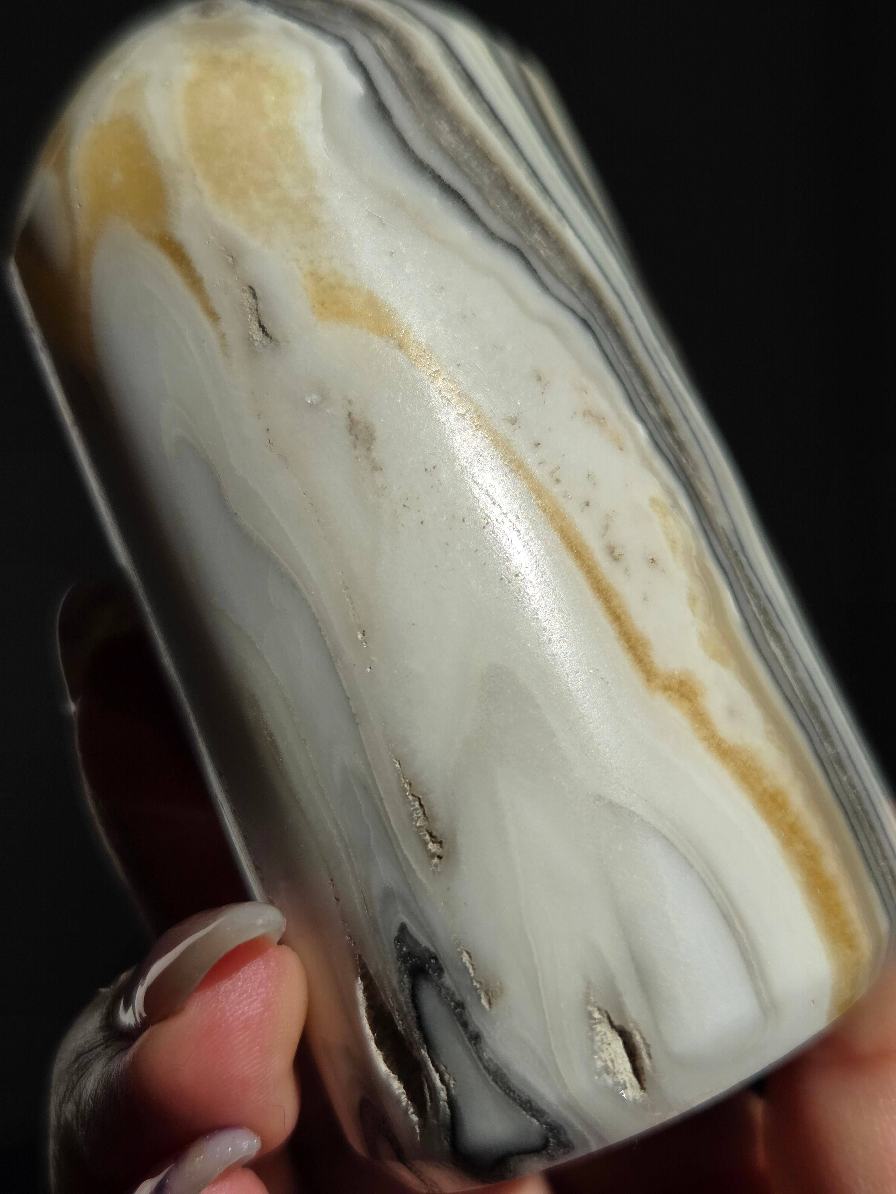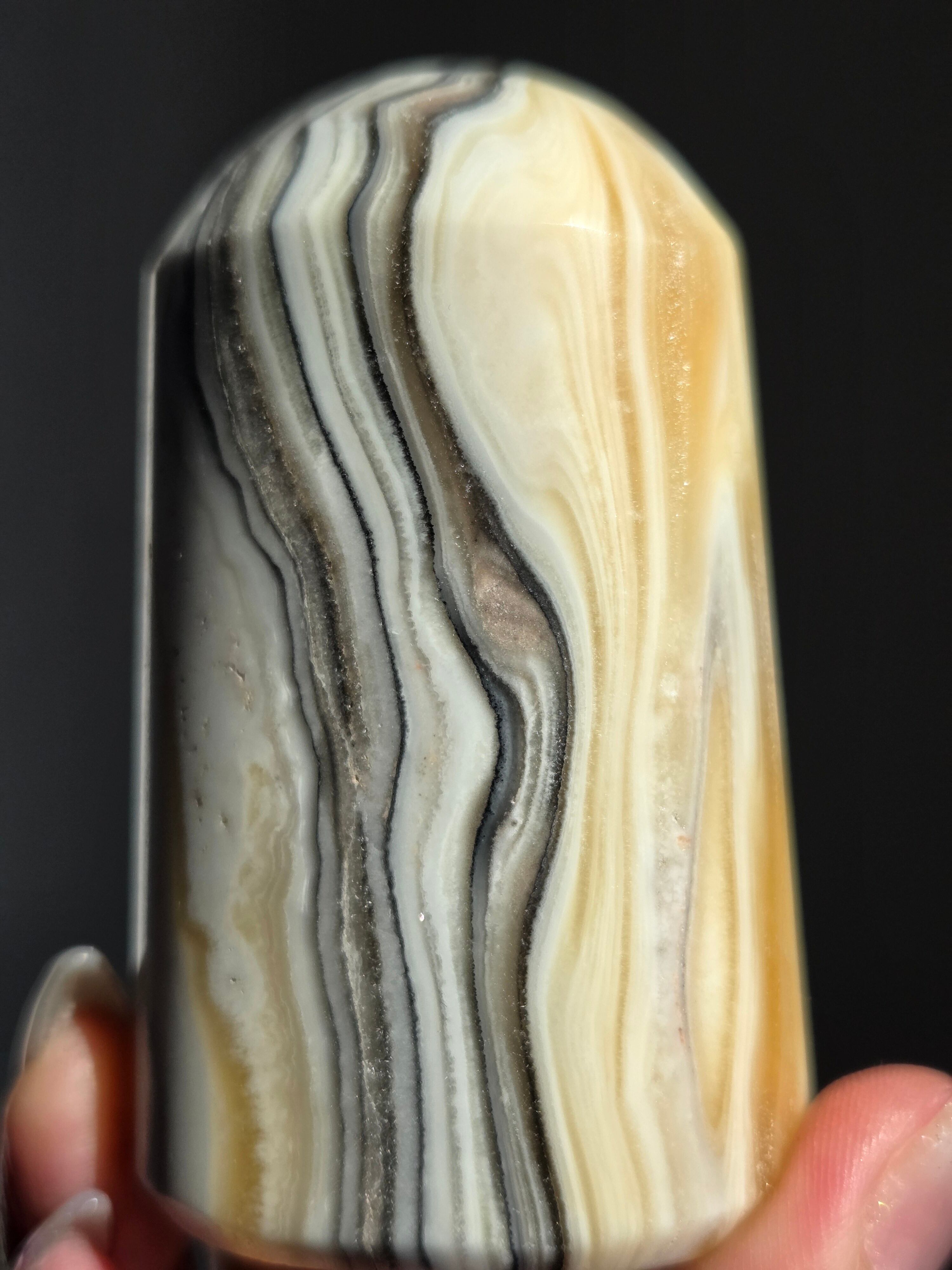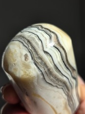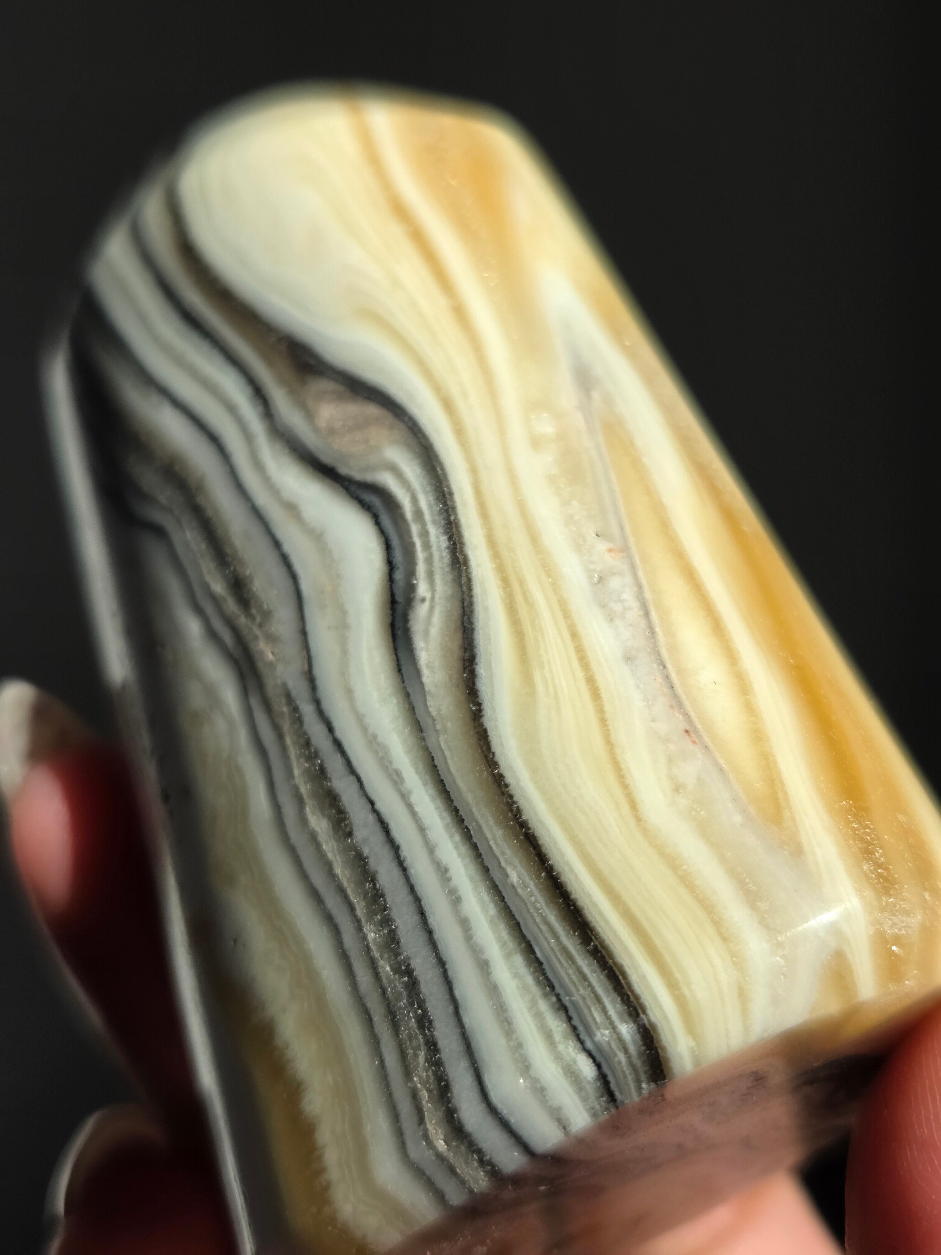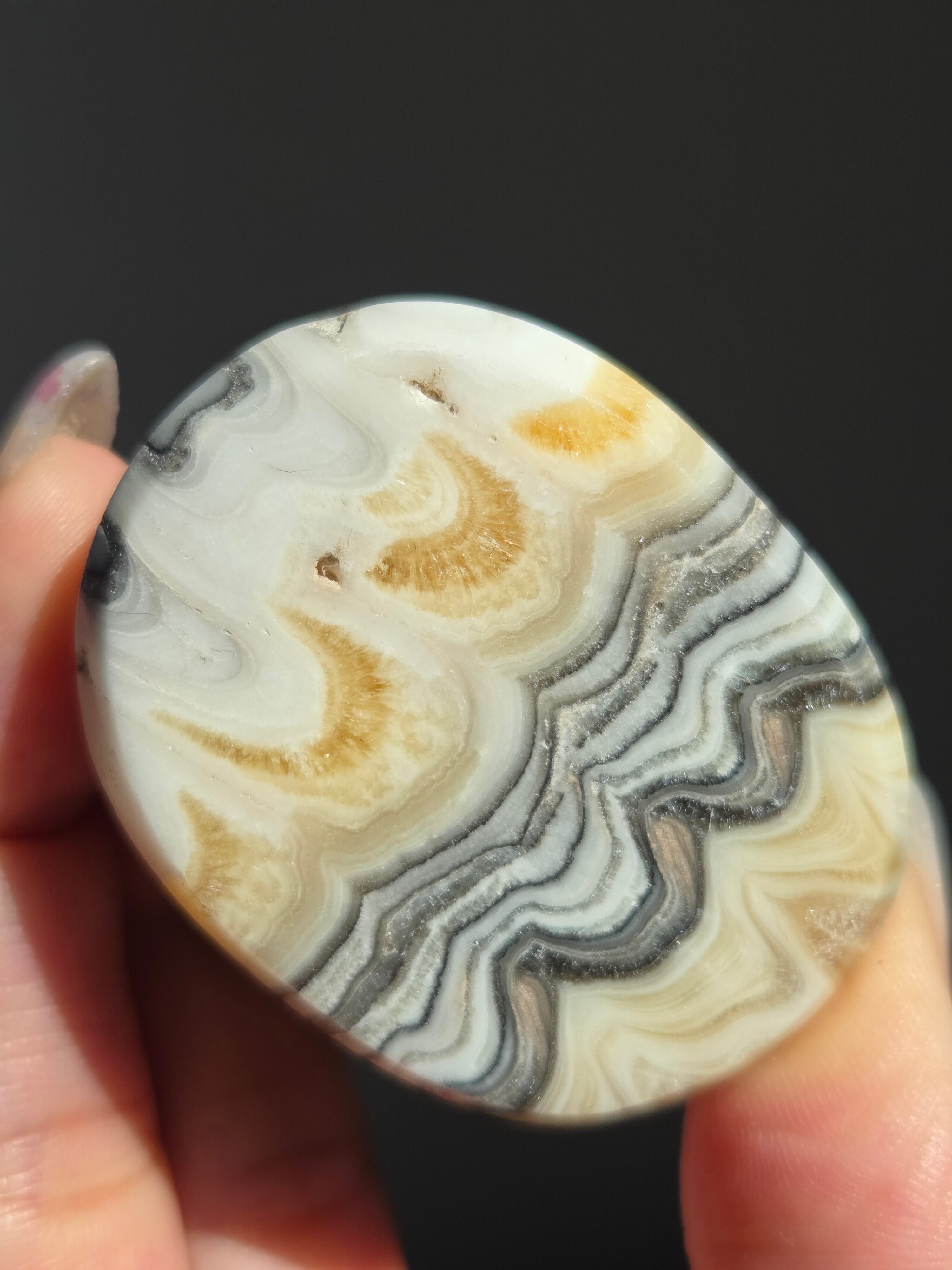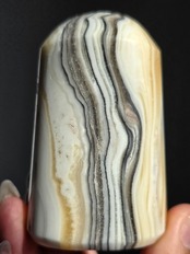 白(カルサイト)と黒(不純物)が縞模様を描く、個性的でモノトーンな表情が魅力の天然石です。