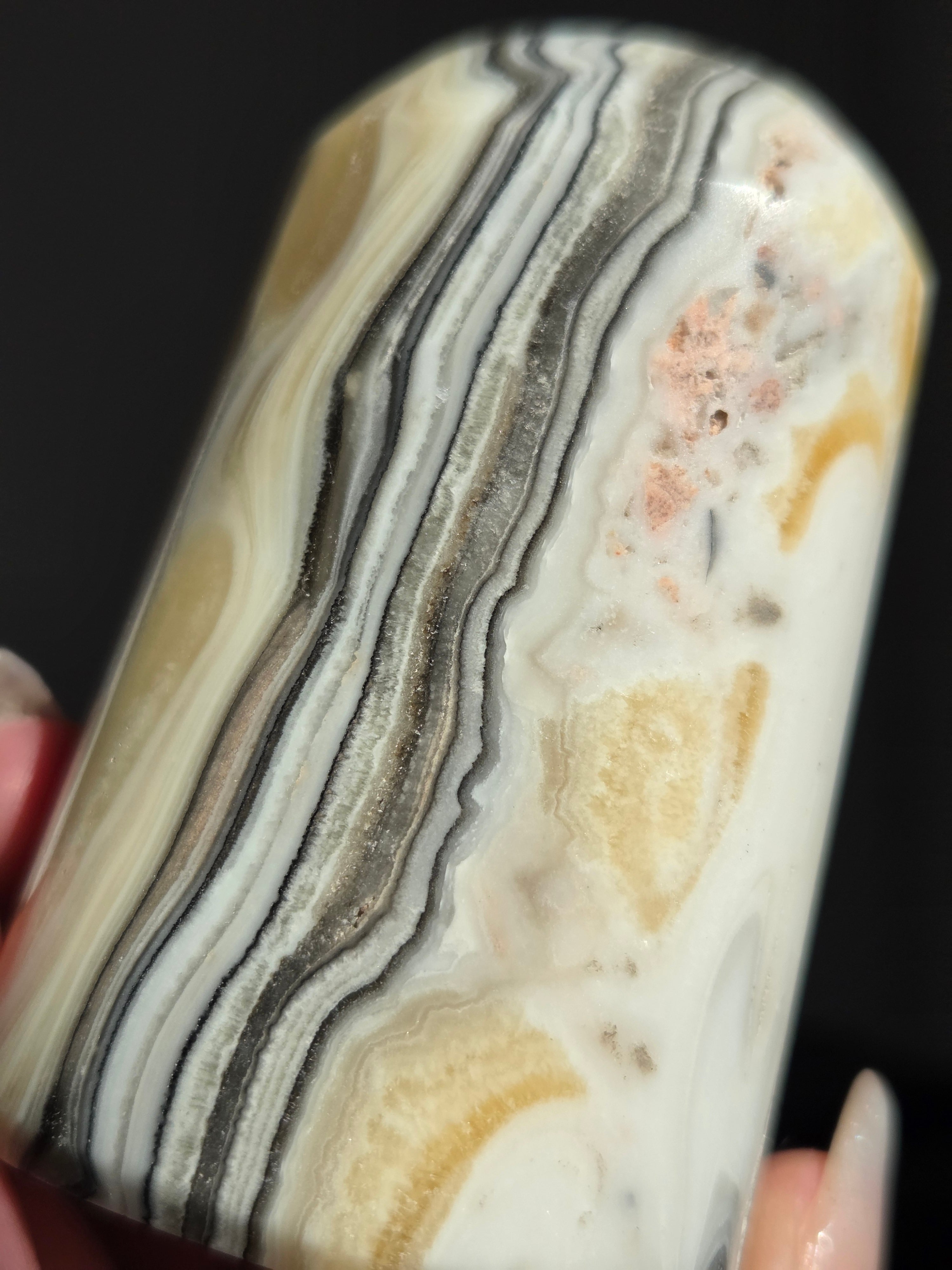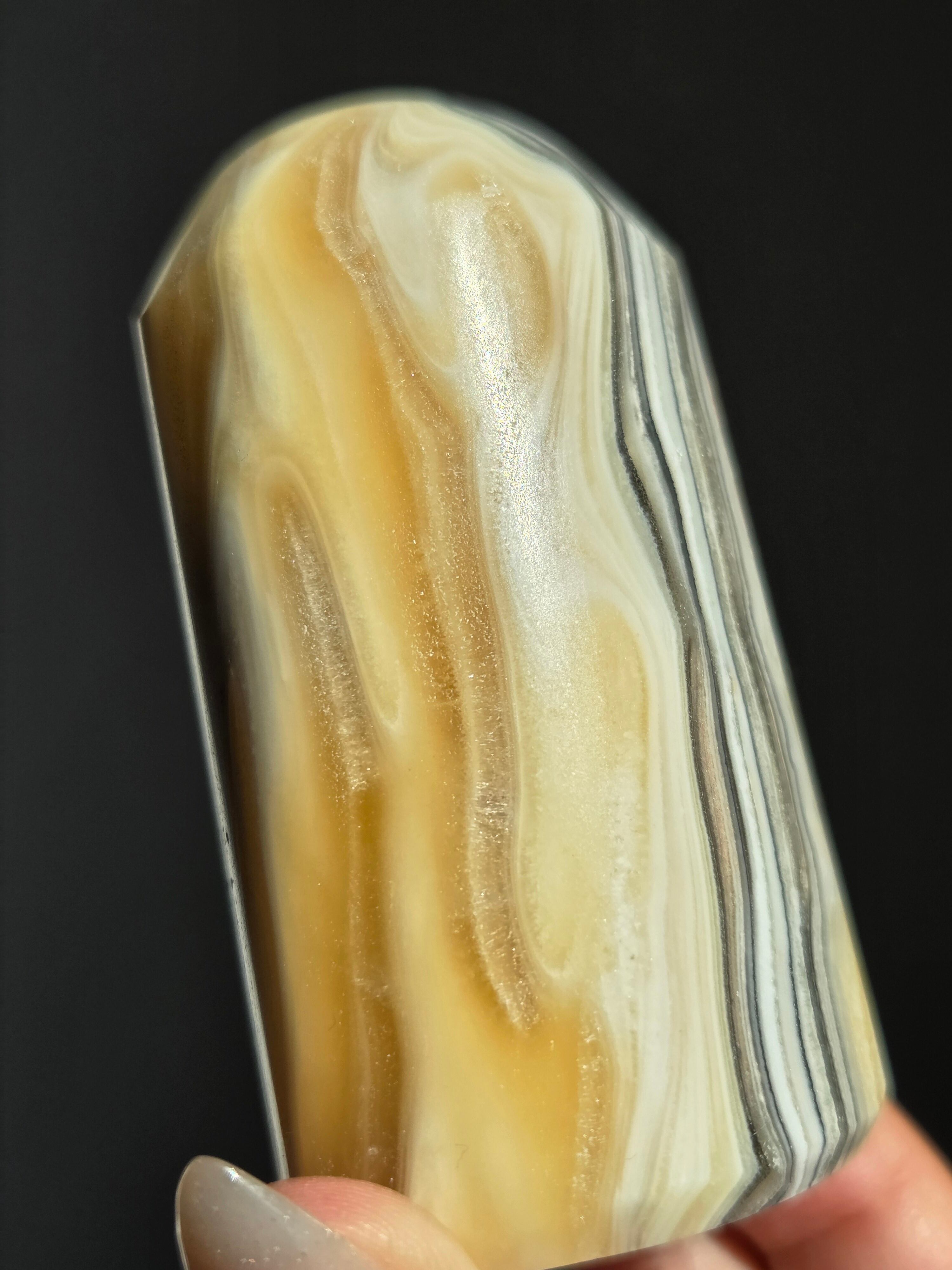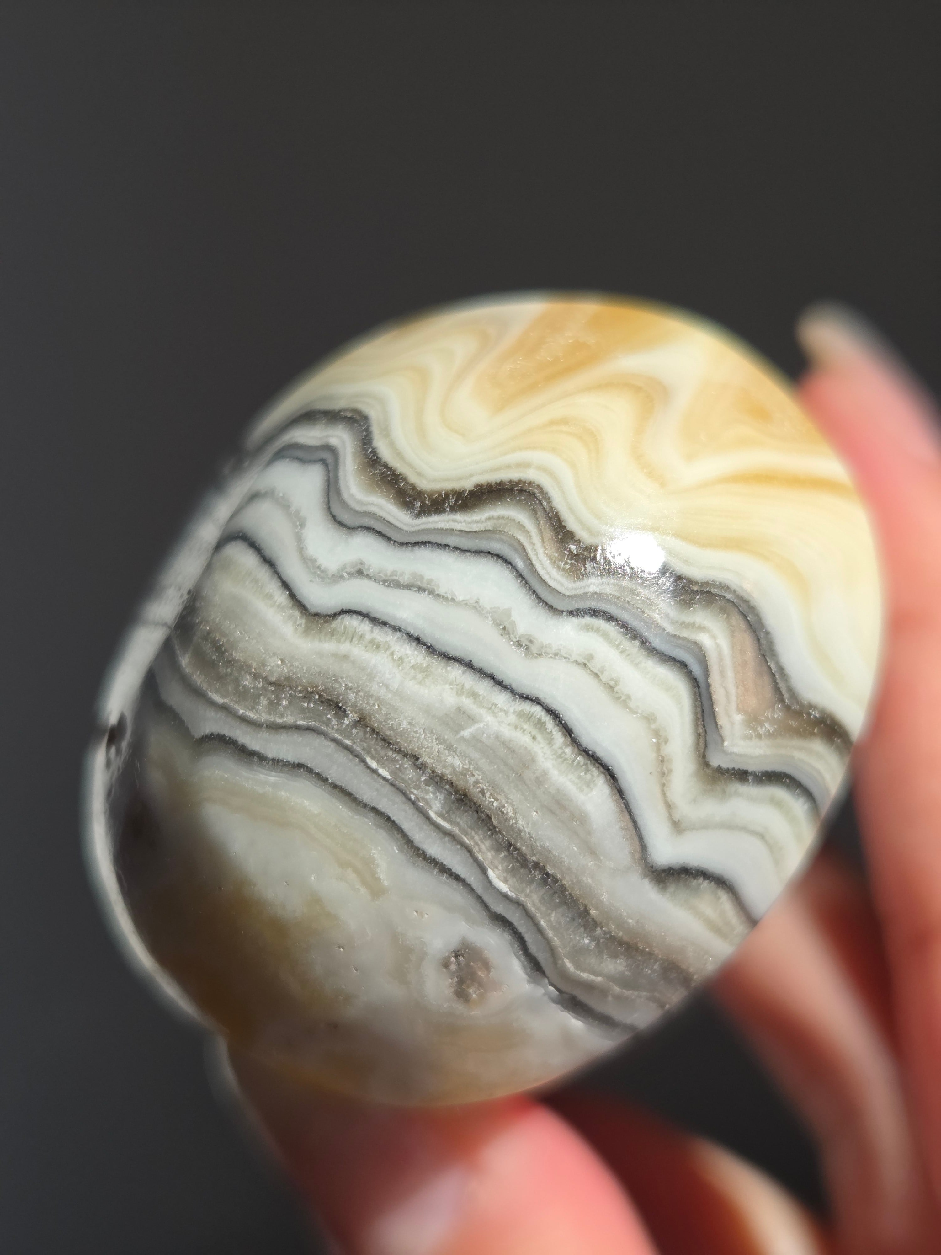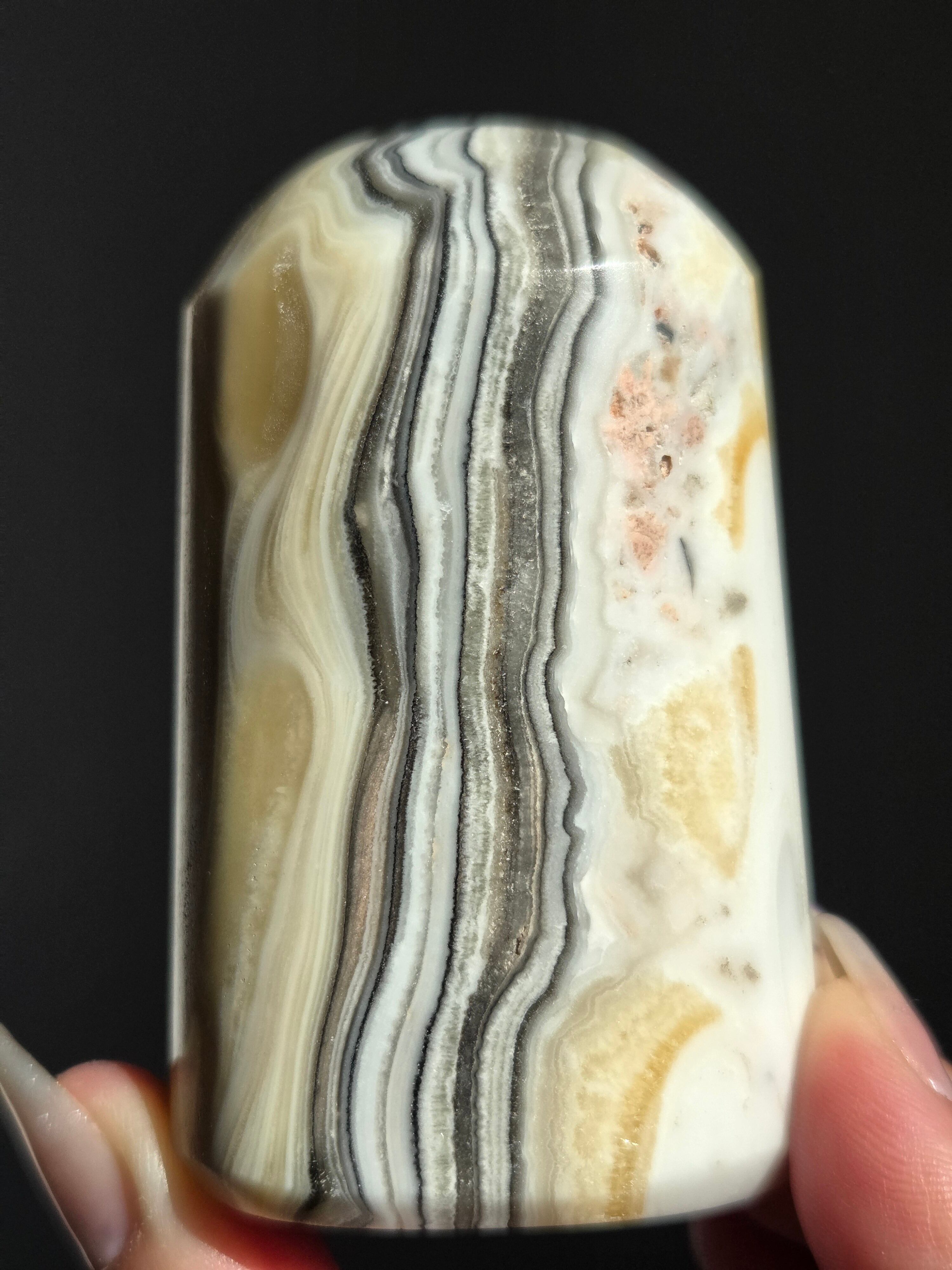 白(カルサイト)と黒(不純物)が縞模様を描く、個性的でモノトーンな表情が魅力の天然石です。