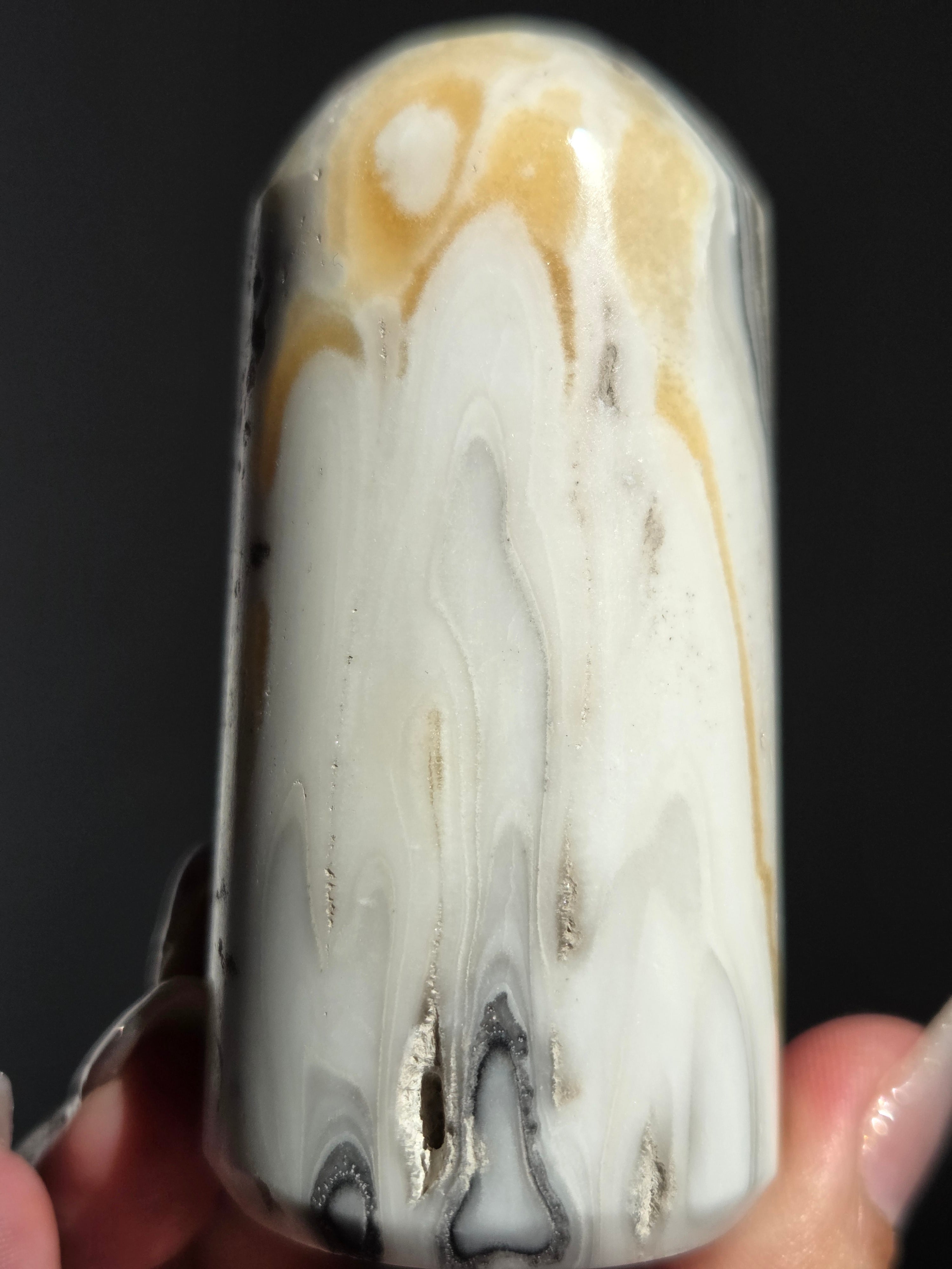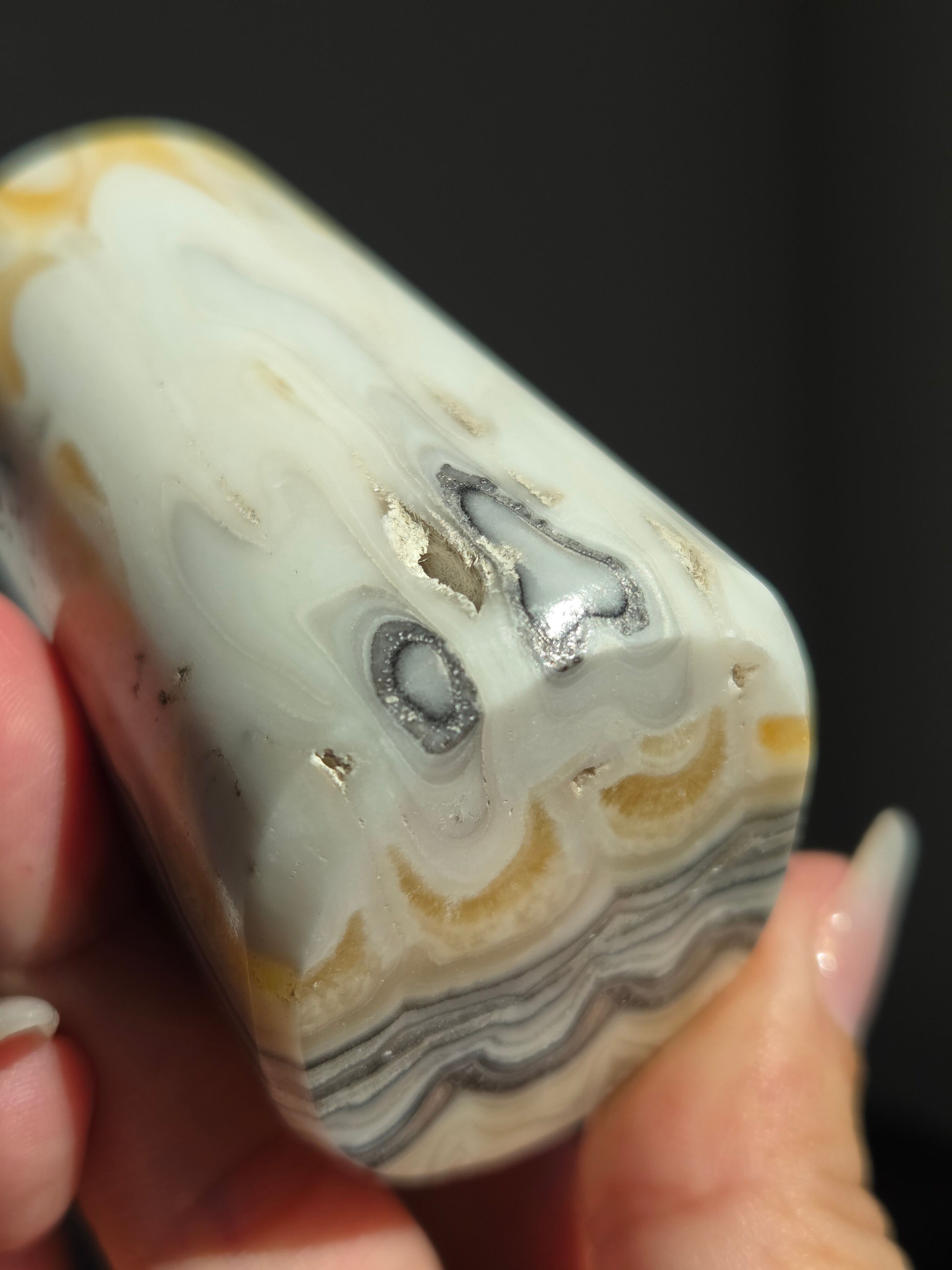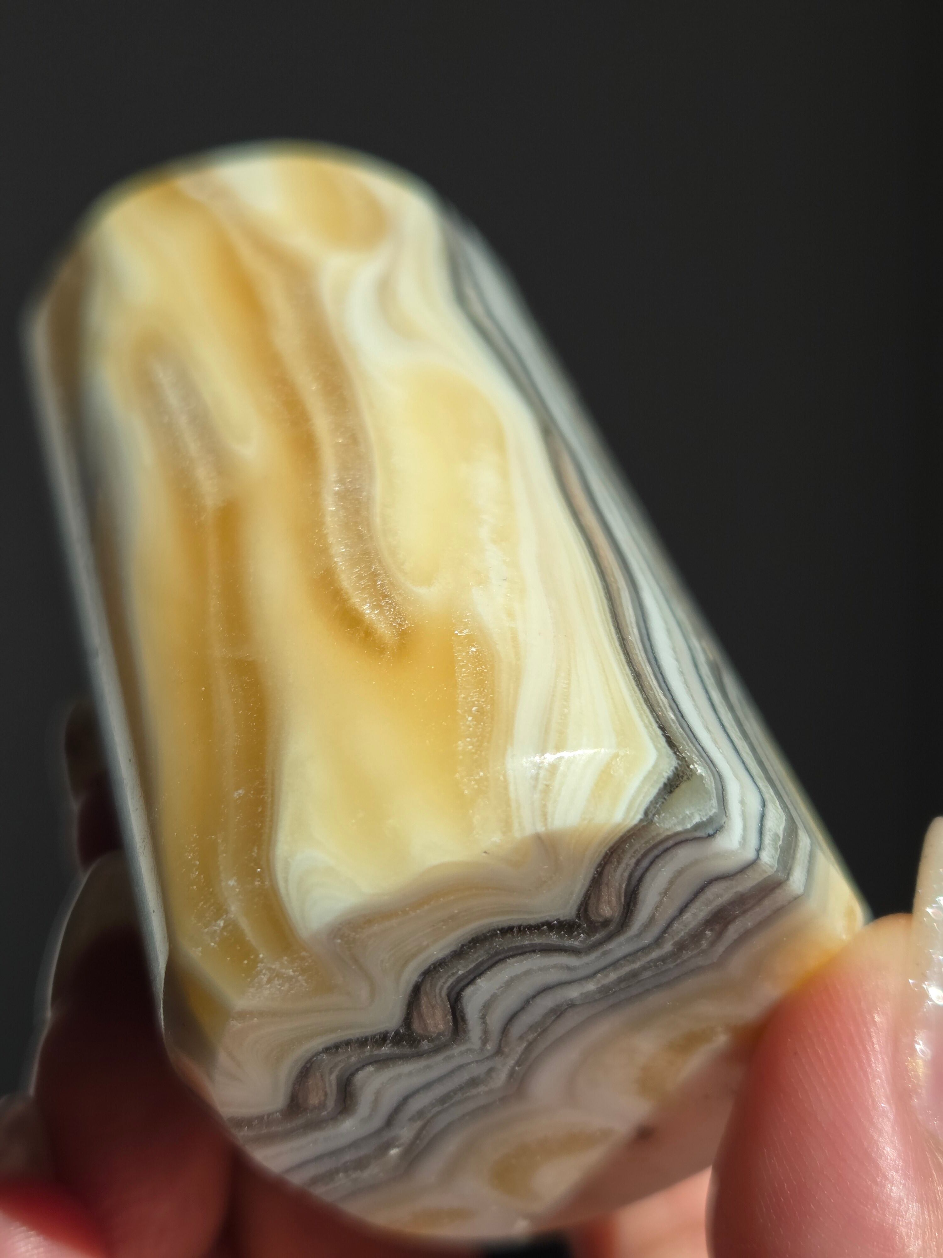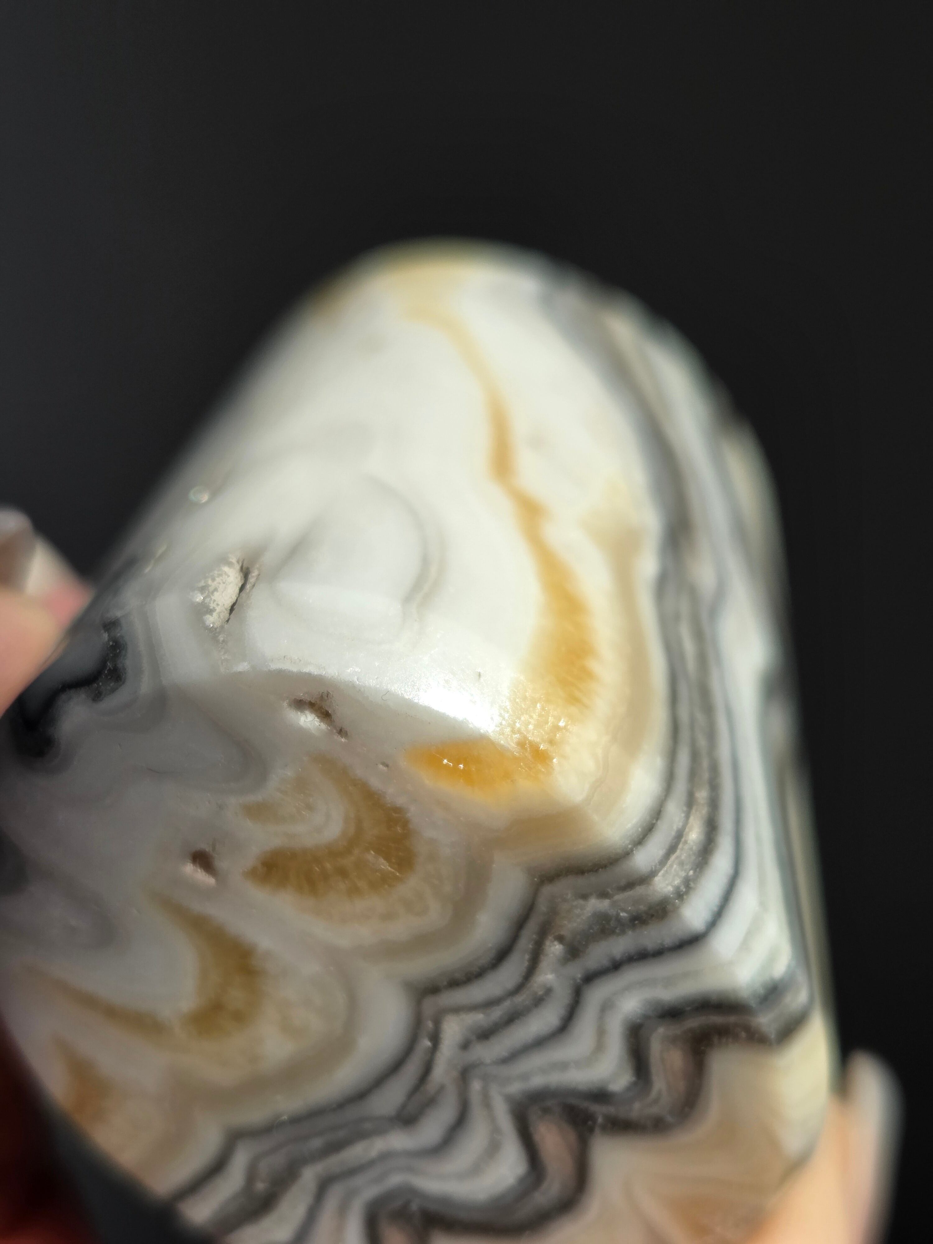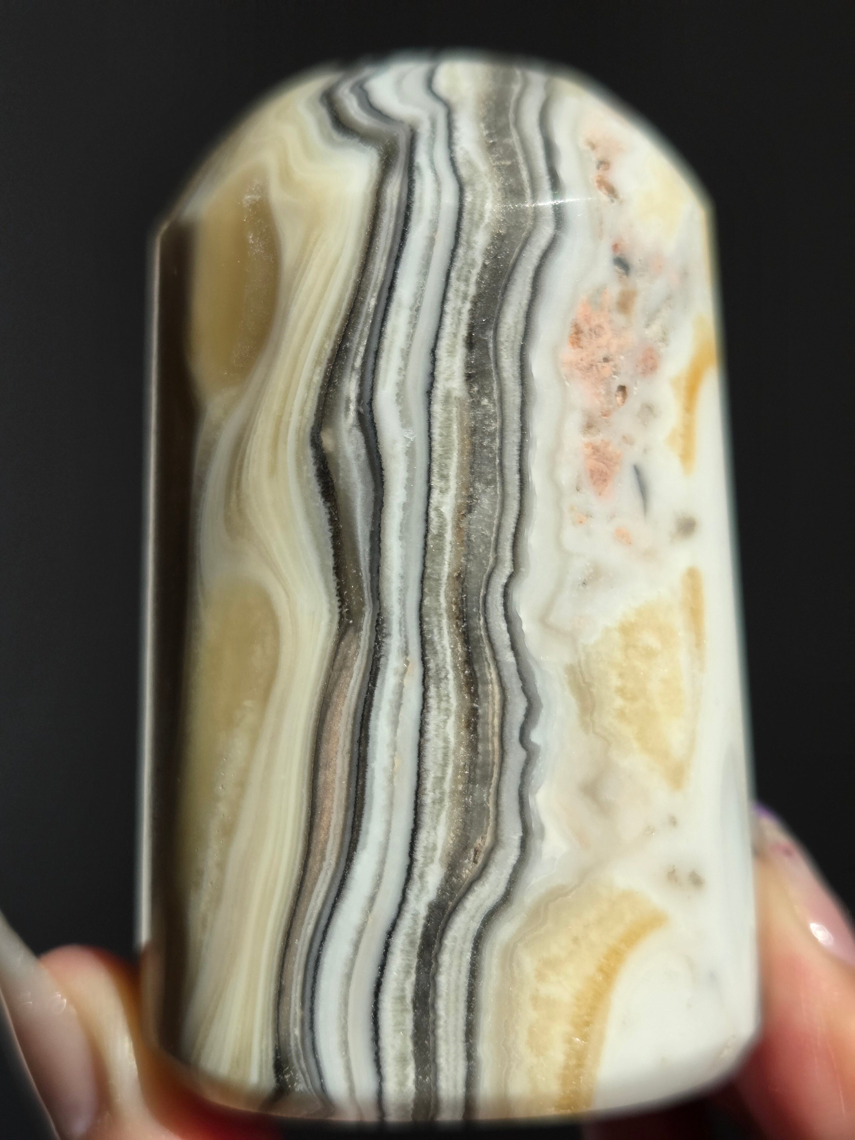 白(カルサイト)と黒(不純物)が縞模様を描く、個性的でモノトーンな表情が魅力の天然石です。