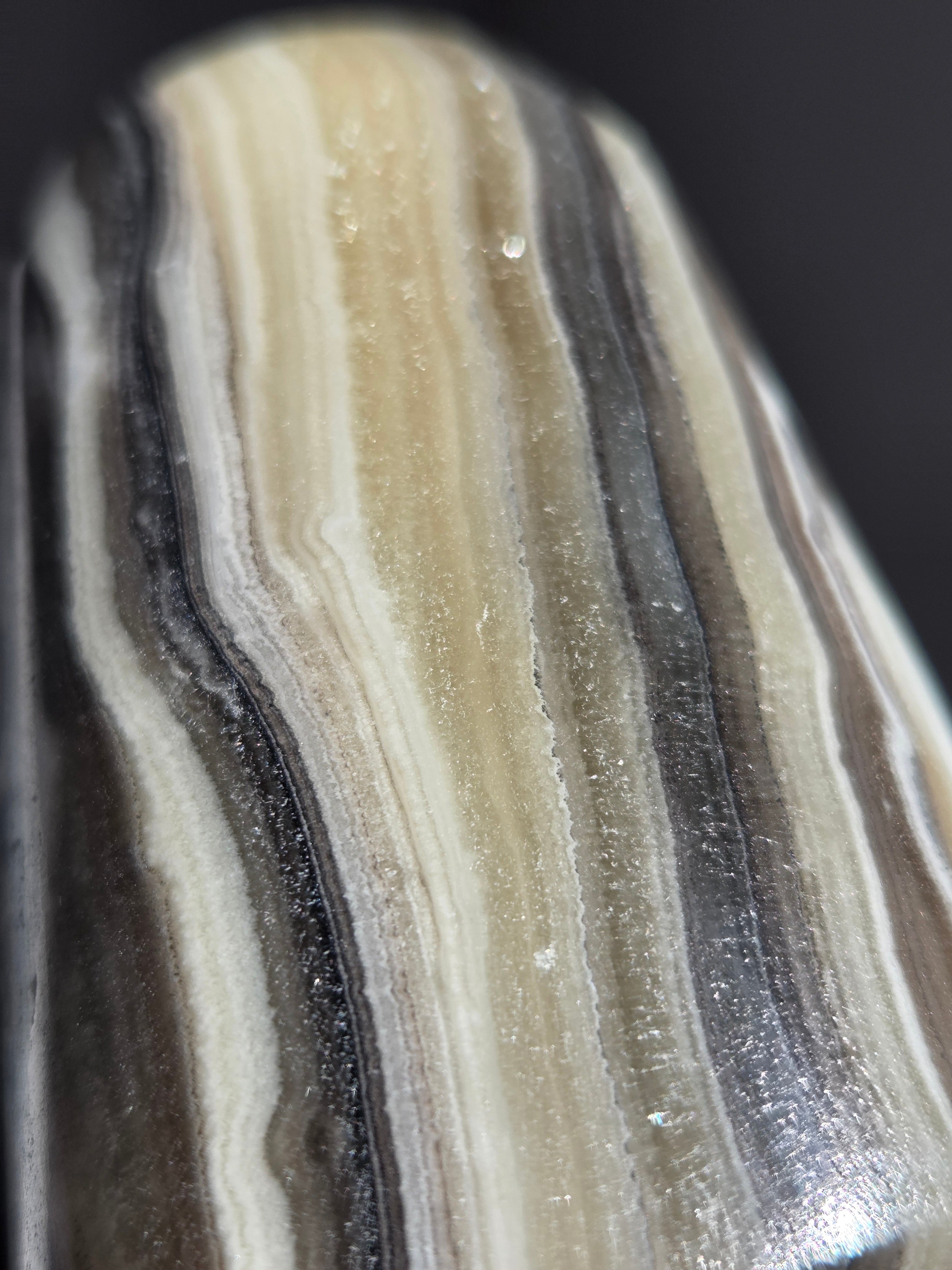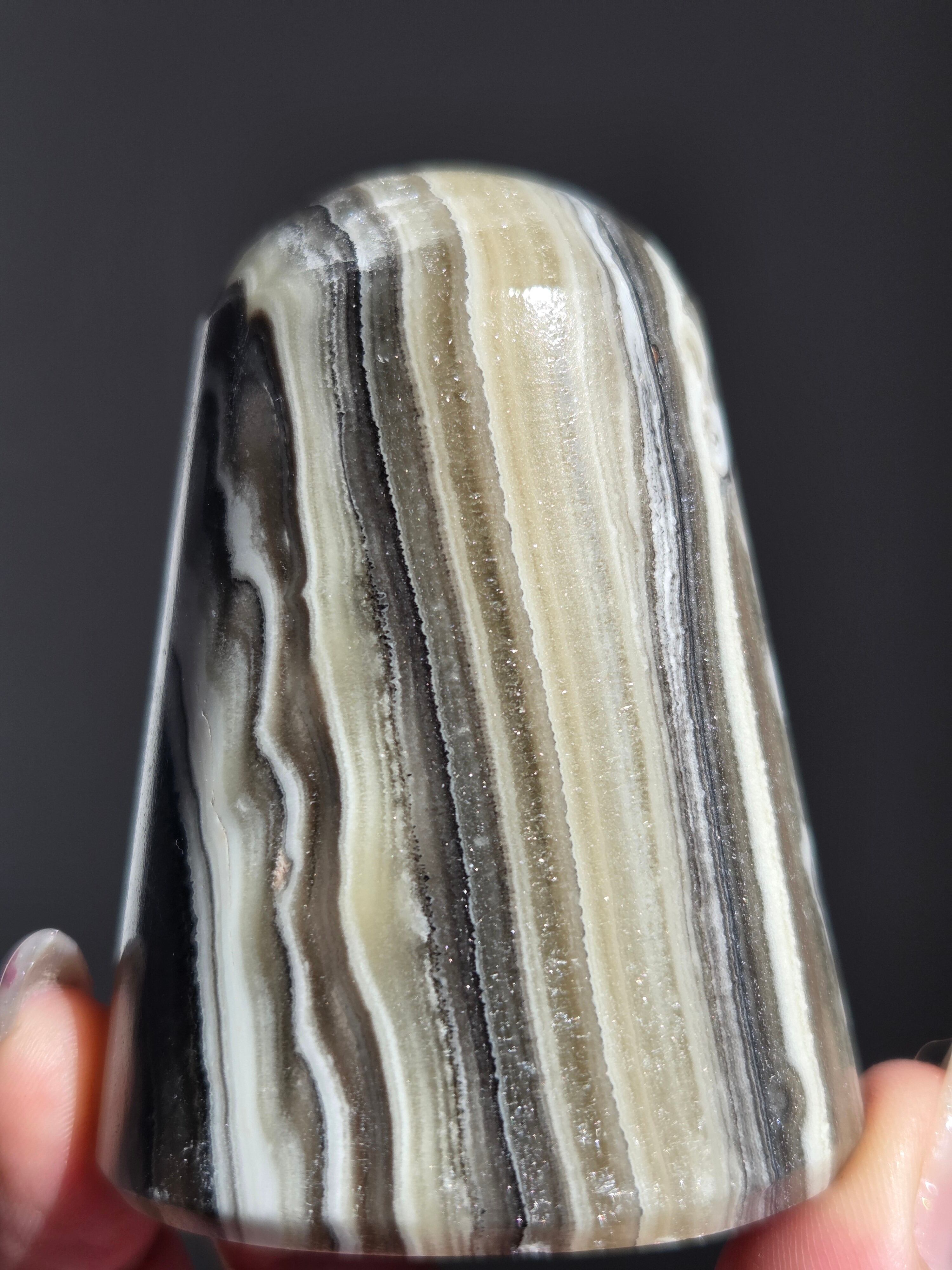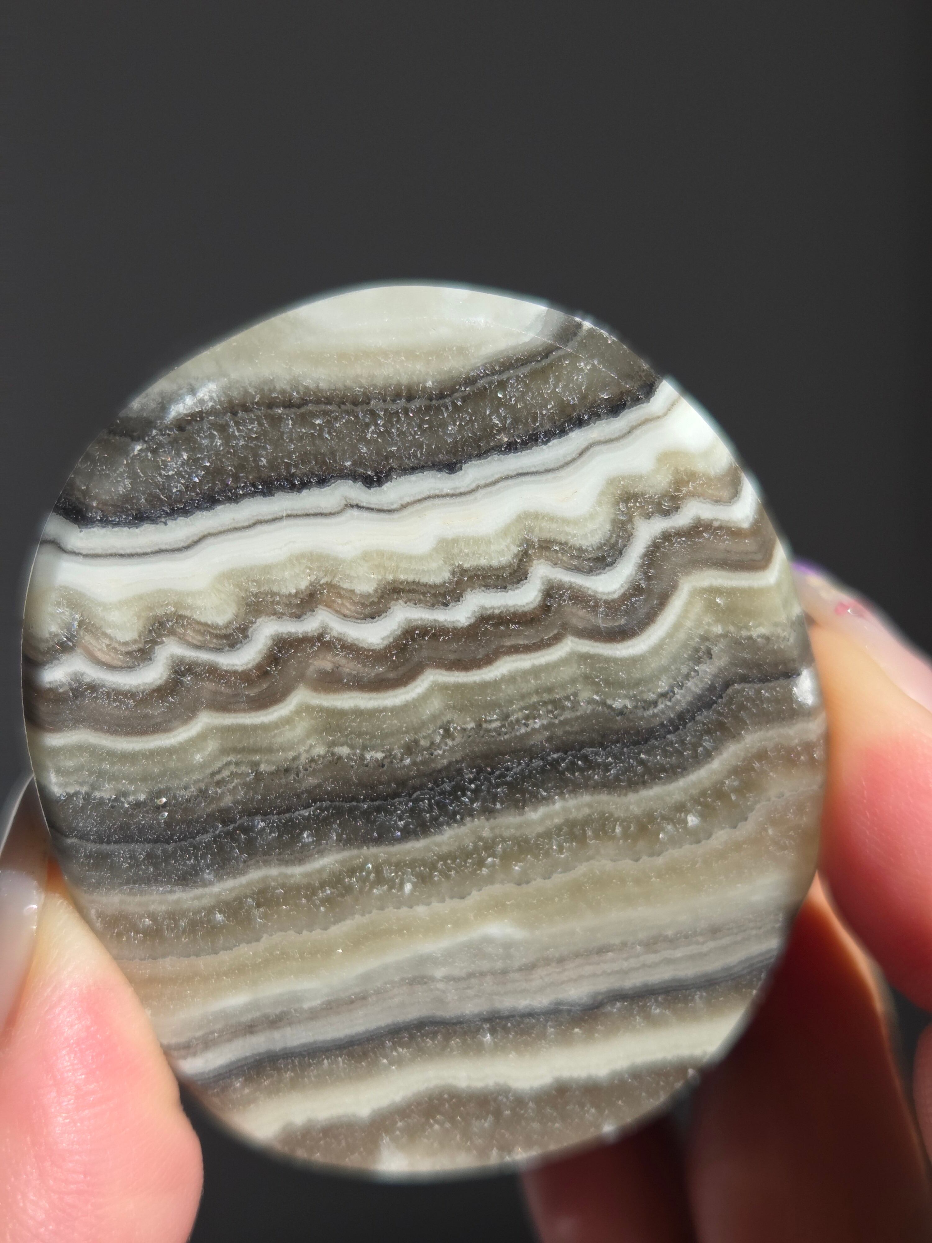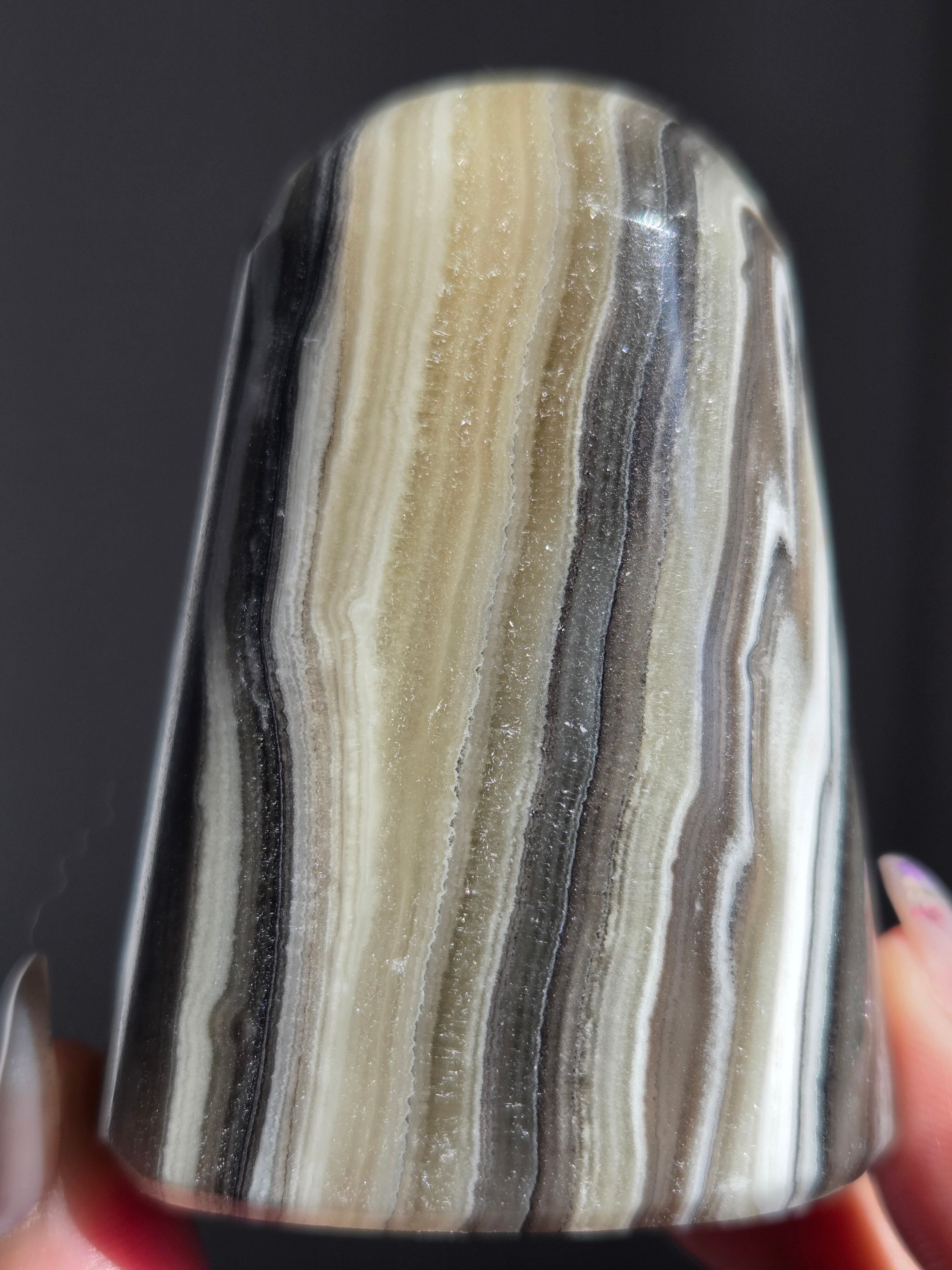白(カルサイト)と黒(不純物)が縞模様を描く、個性的でモノトーンな表情が魅力の天然石です。
