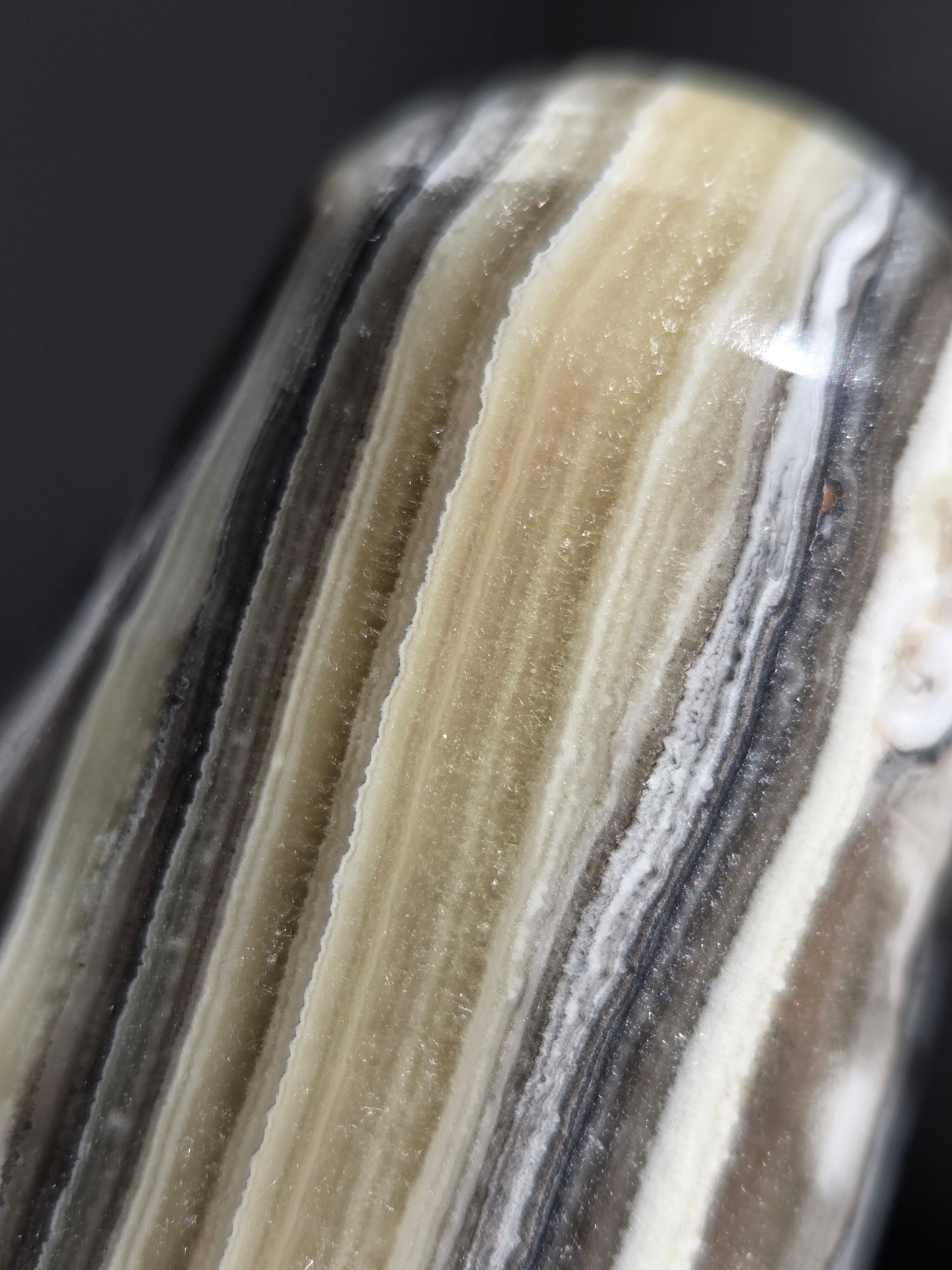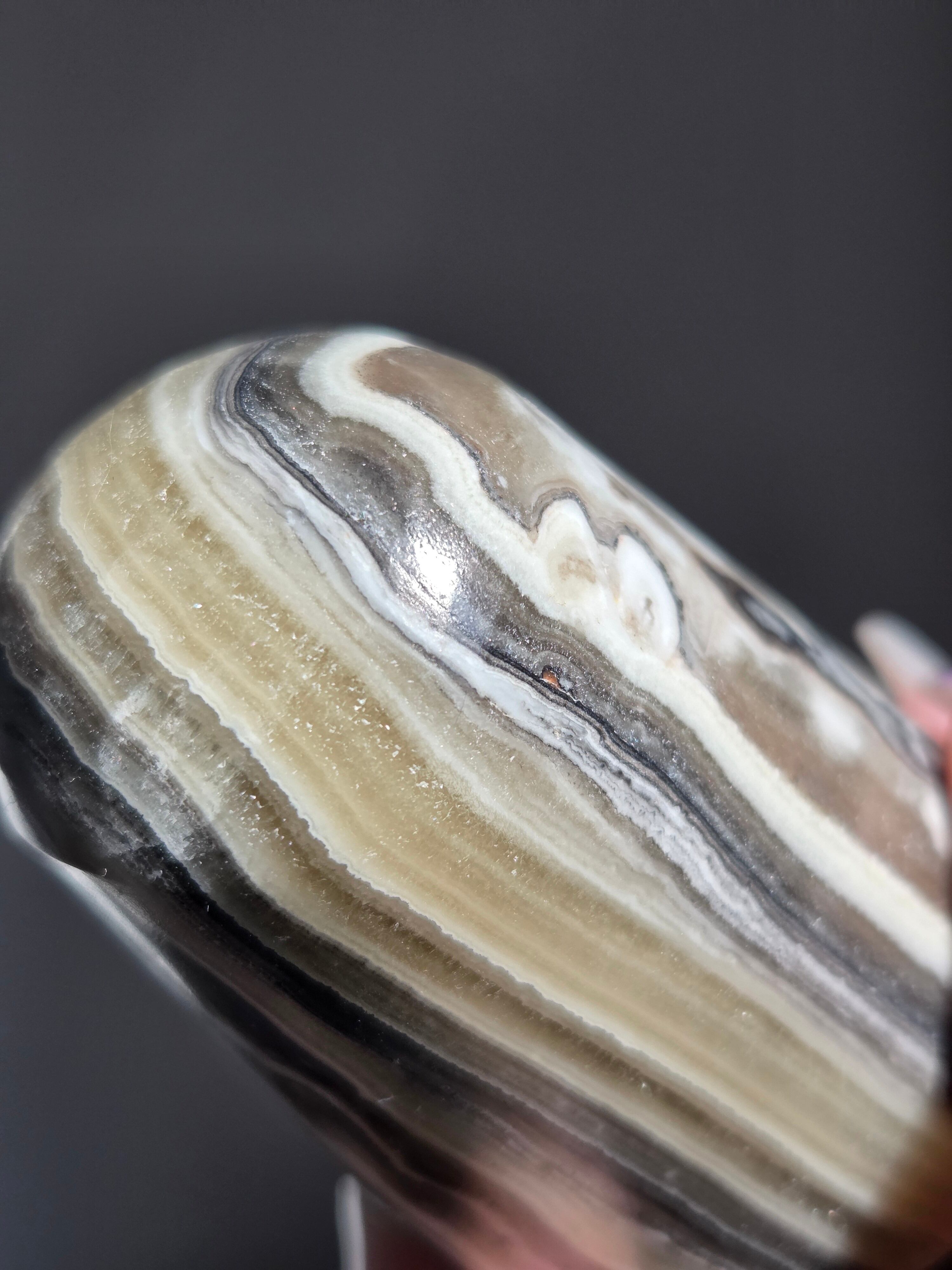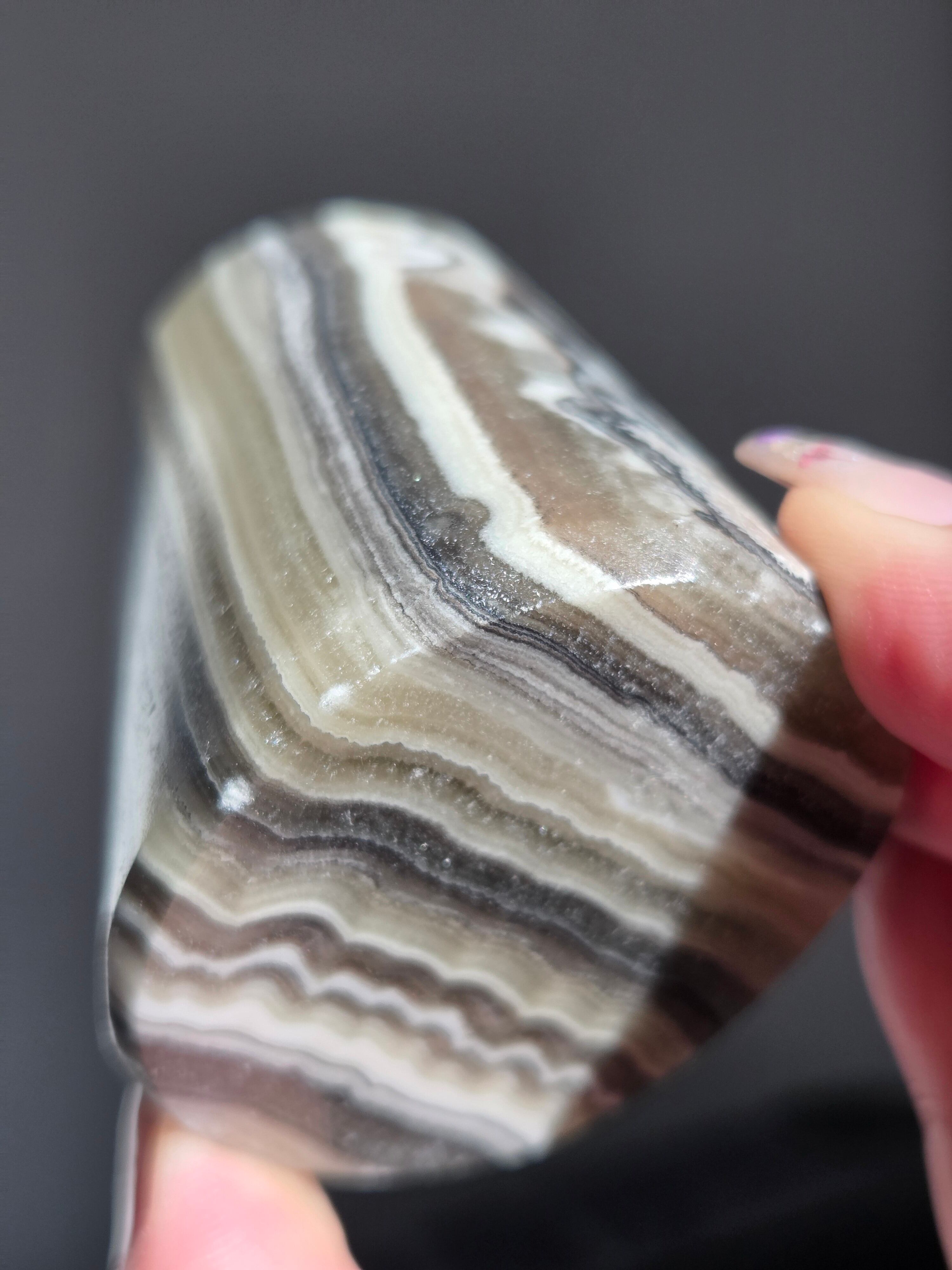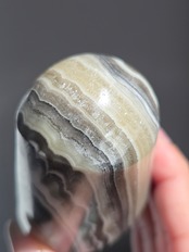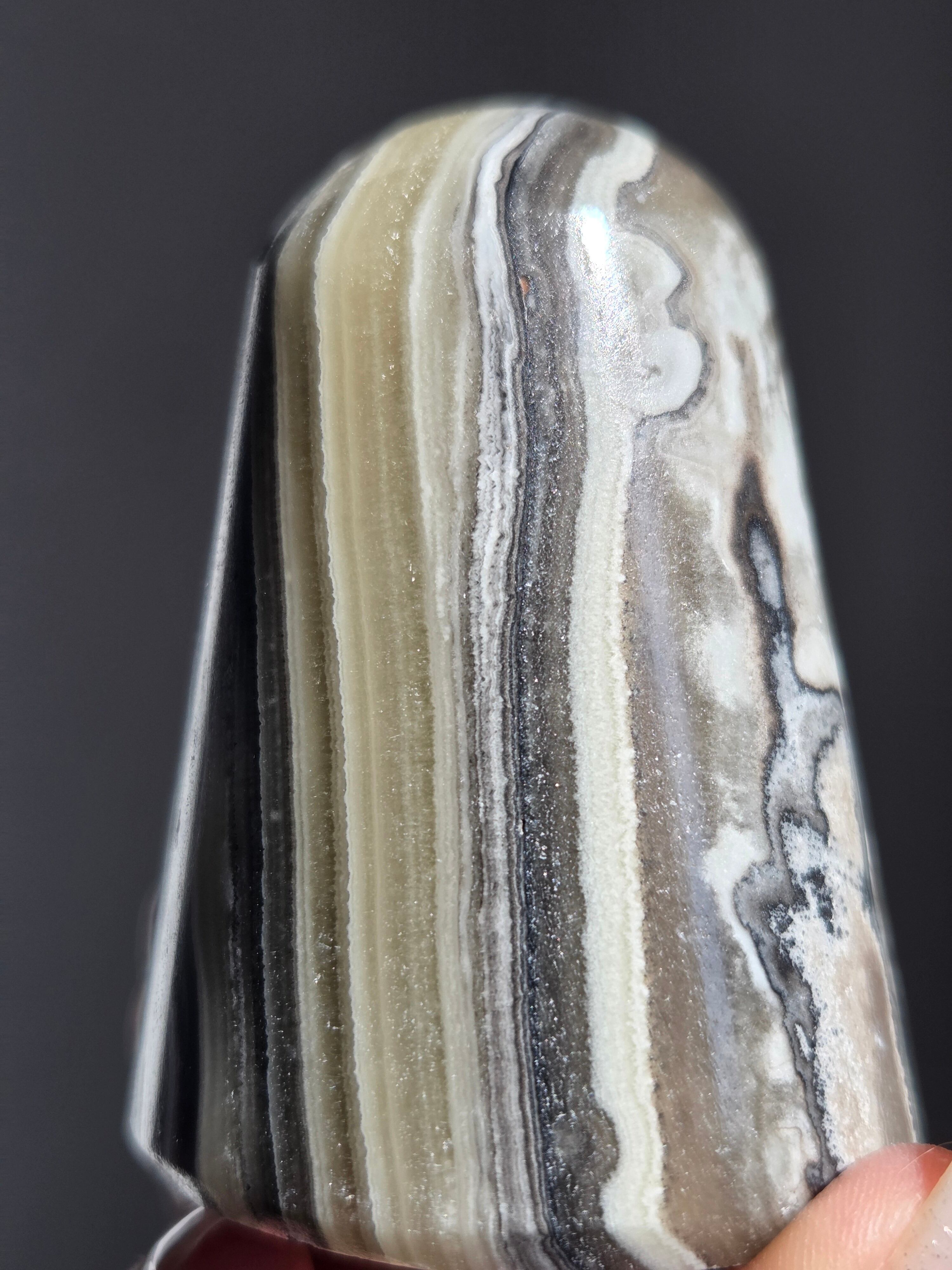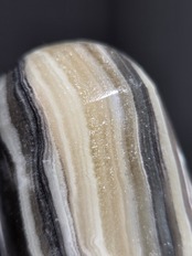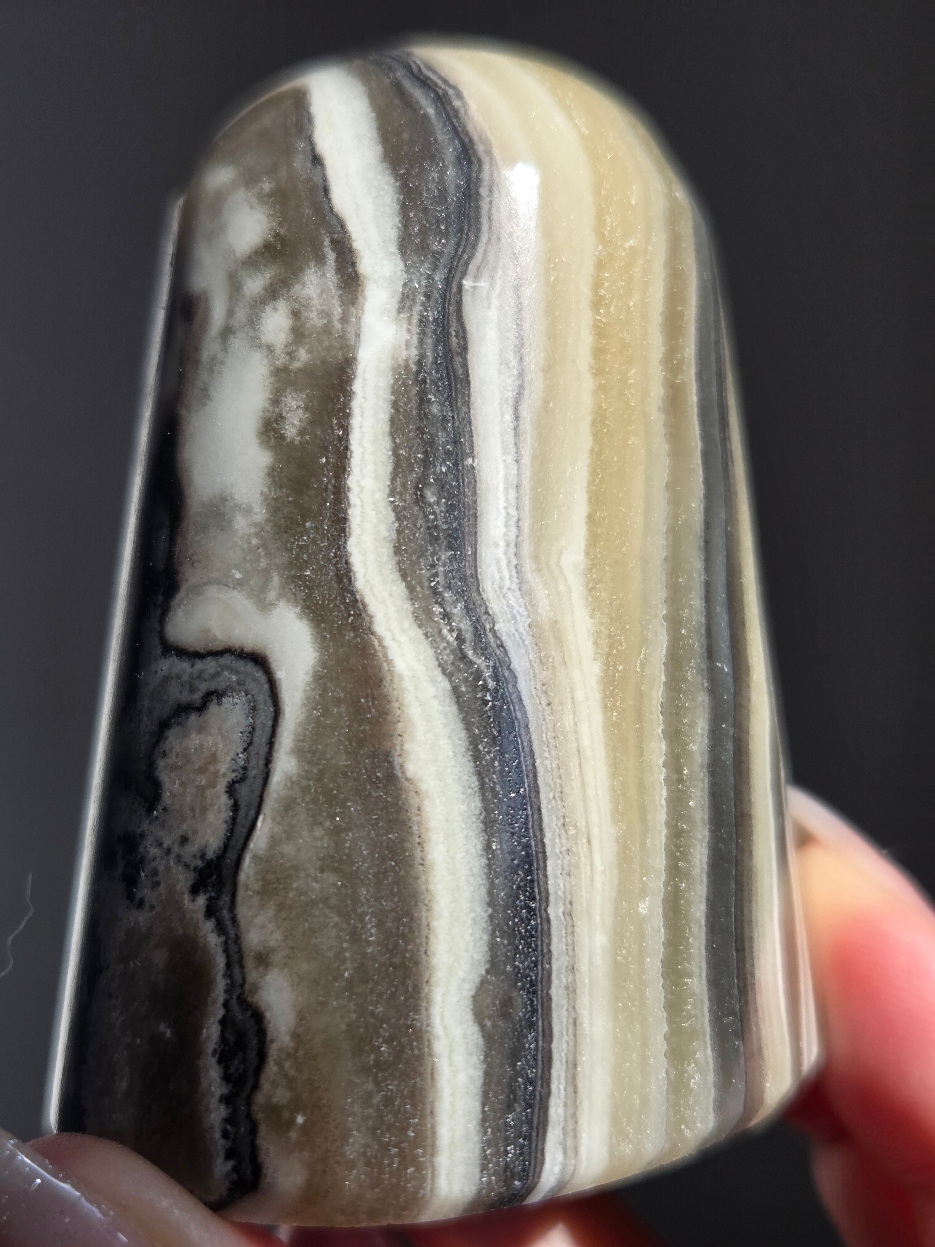 白(カルサイト)と黒(不純物)が縞模様を描く、個性的でモノトーンな表情が魅力の天然石です。