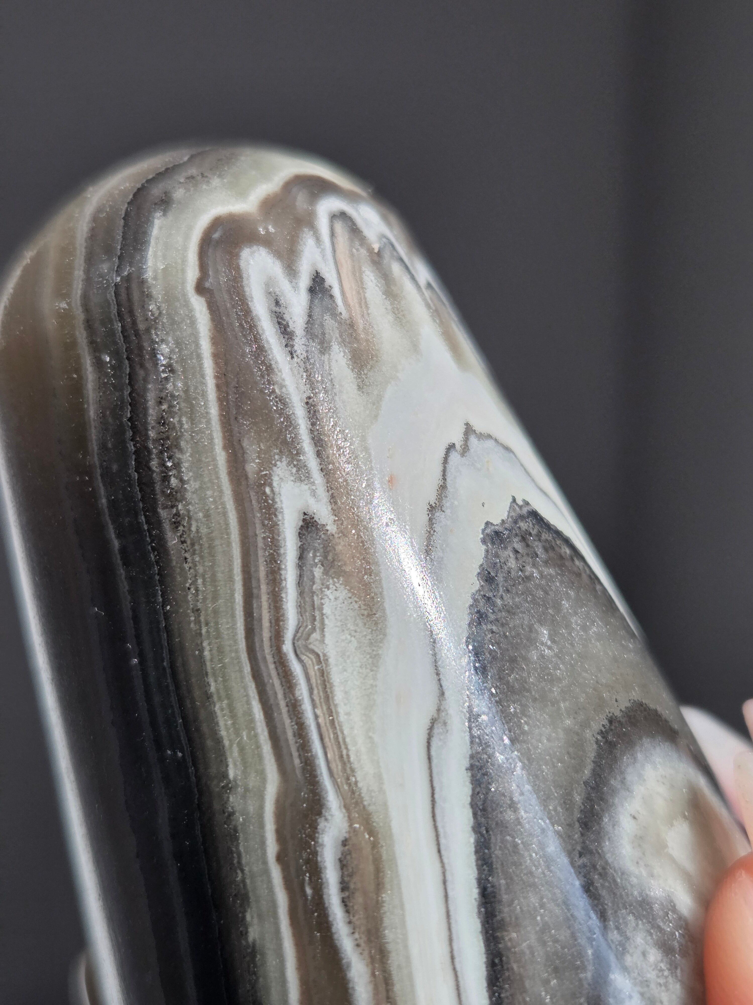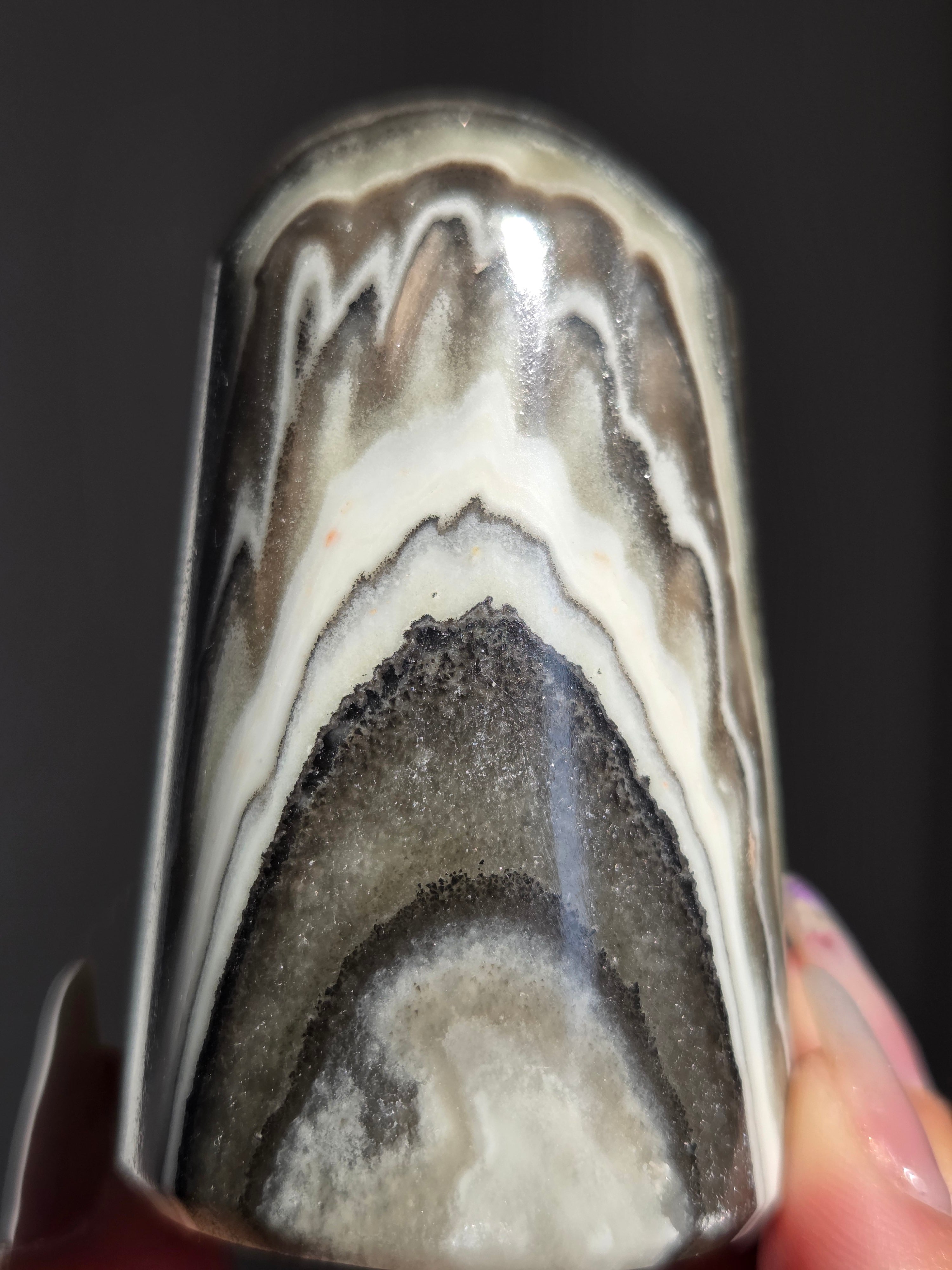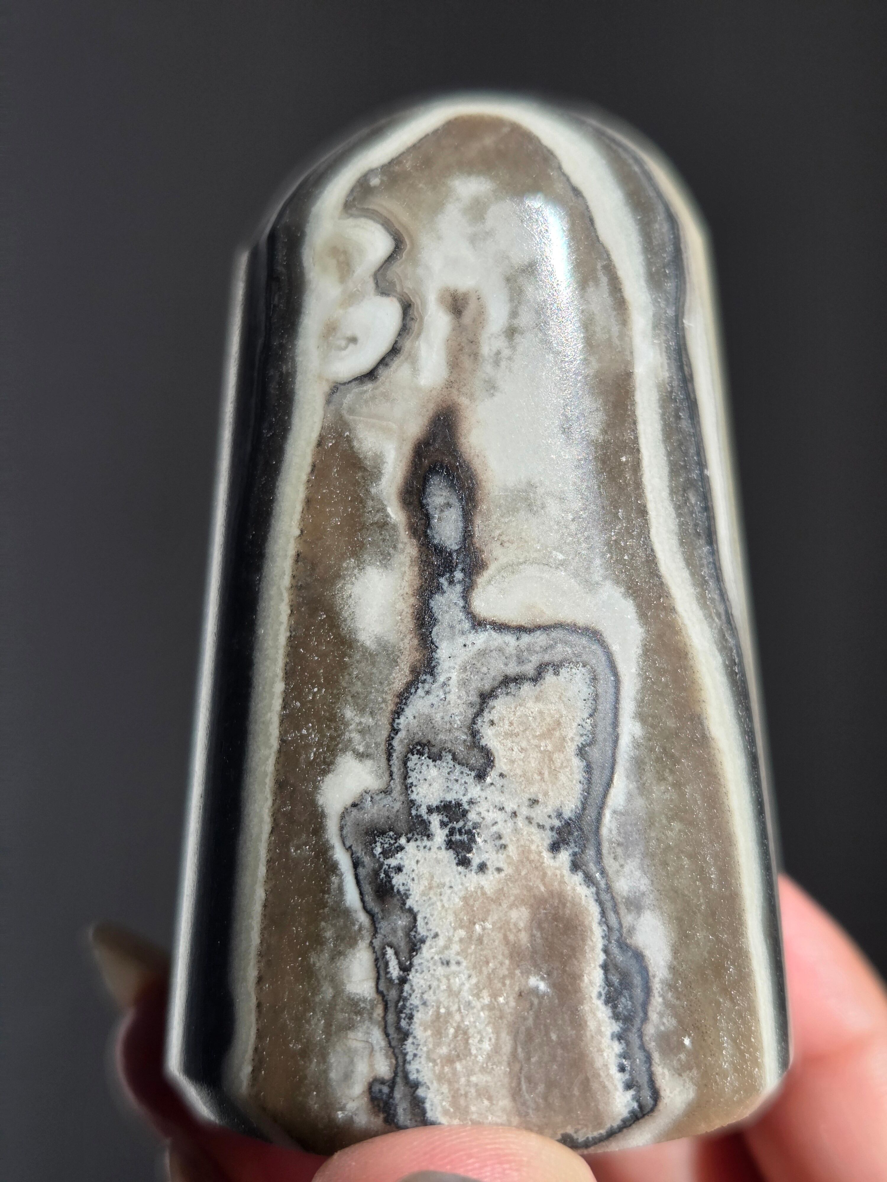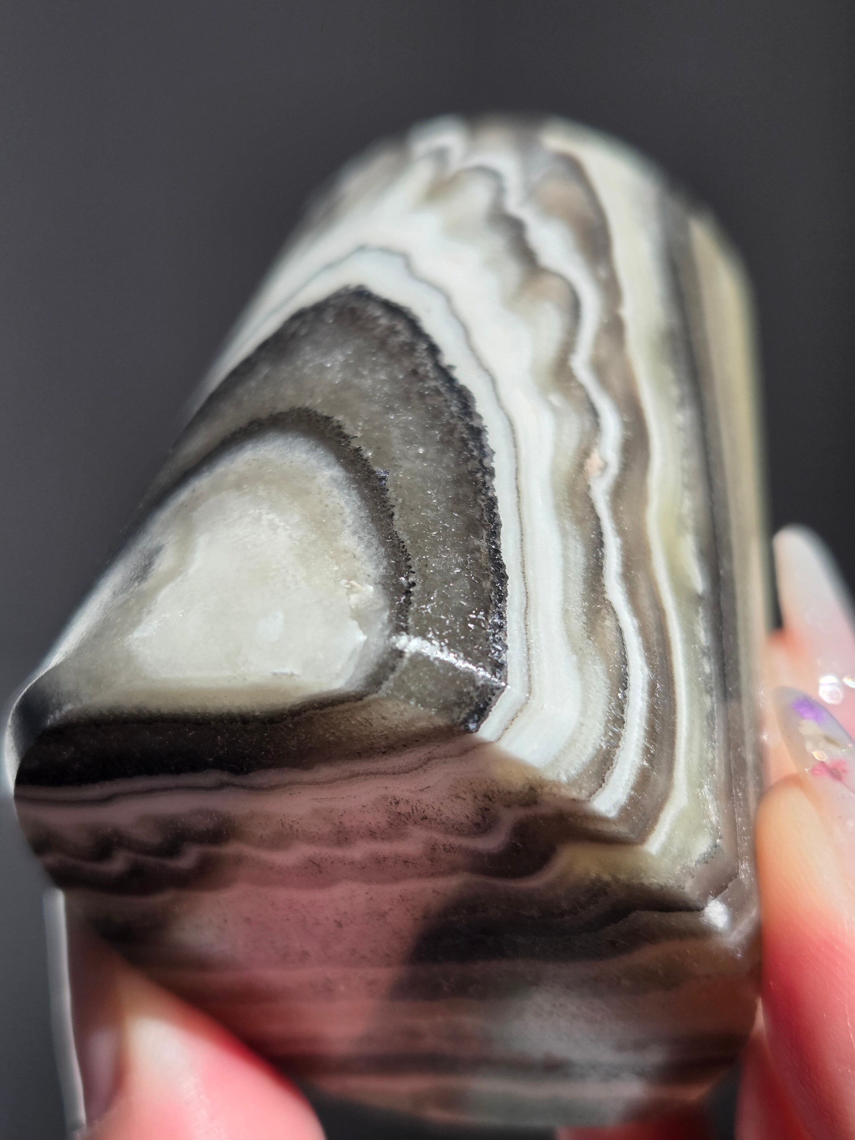 白(カルサイト)と黒(不純物)が縞模様を描く、個性的でモノトーンな表情が魅力の天然石です。