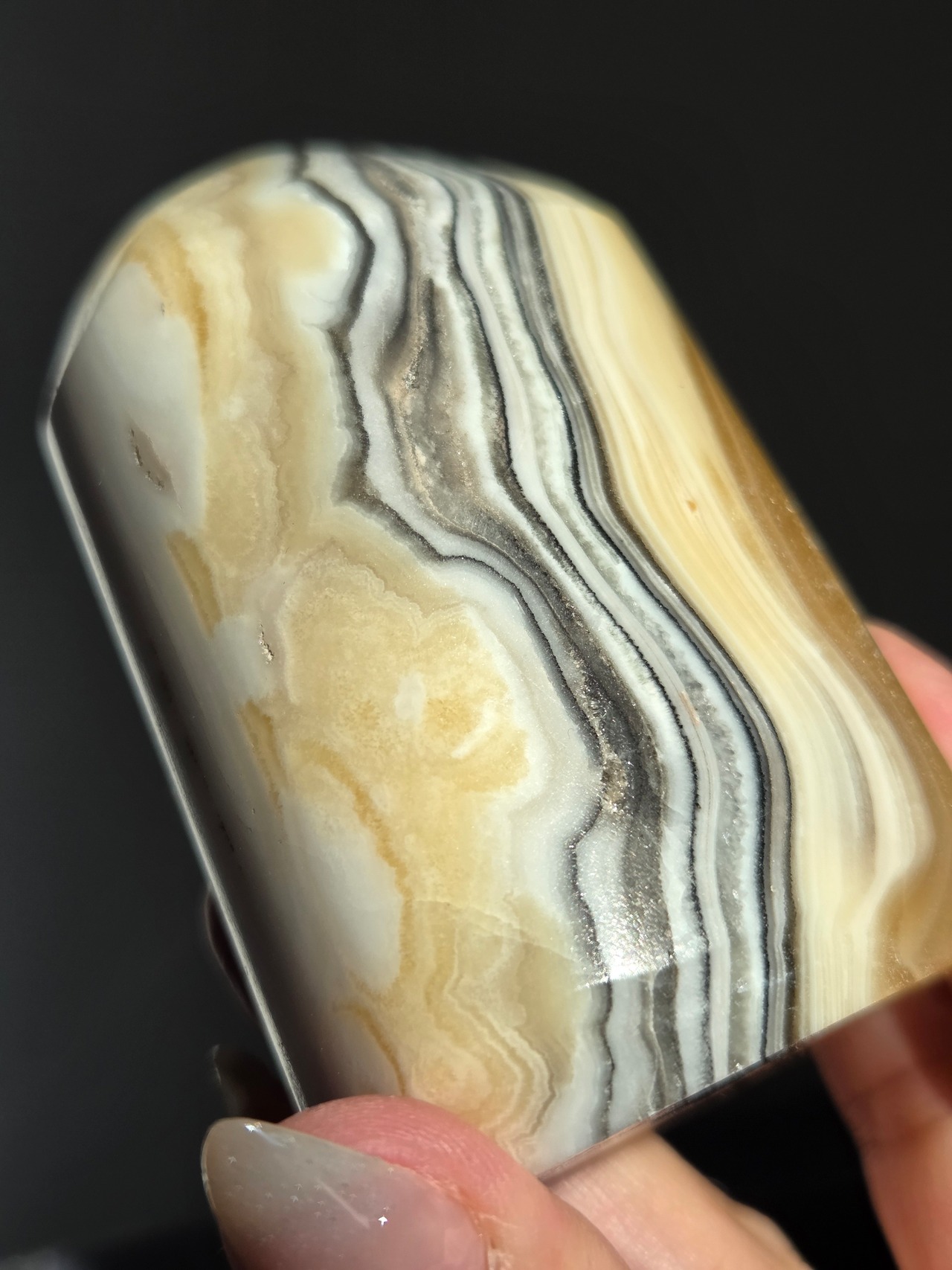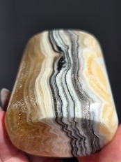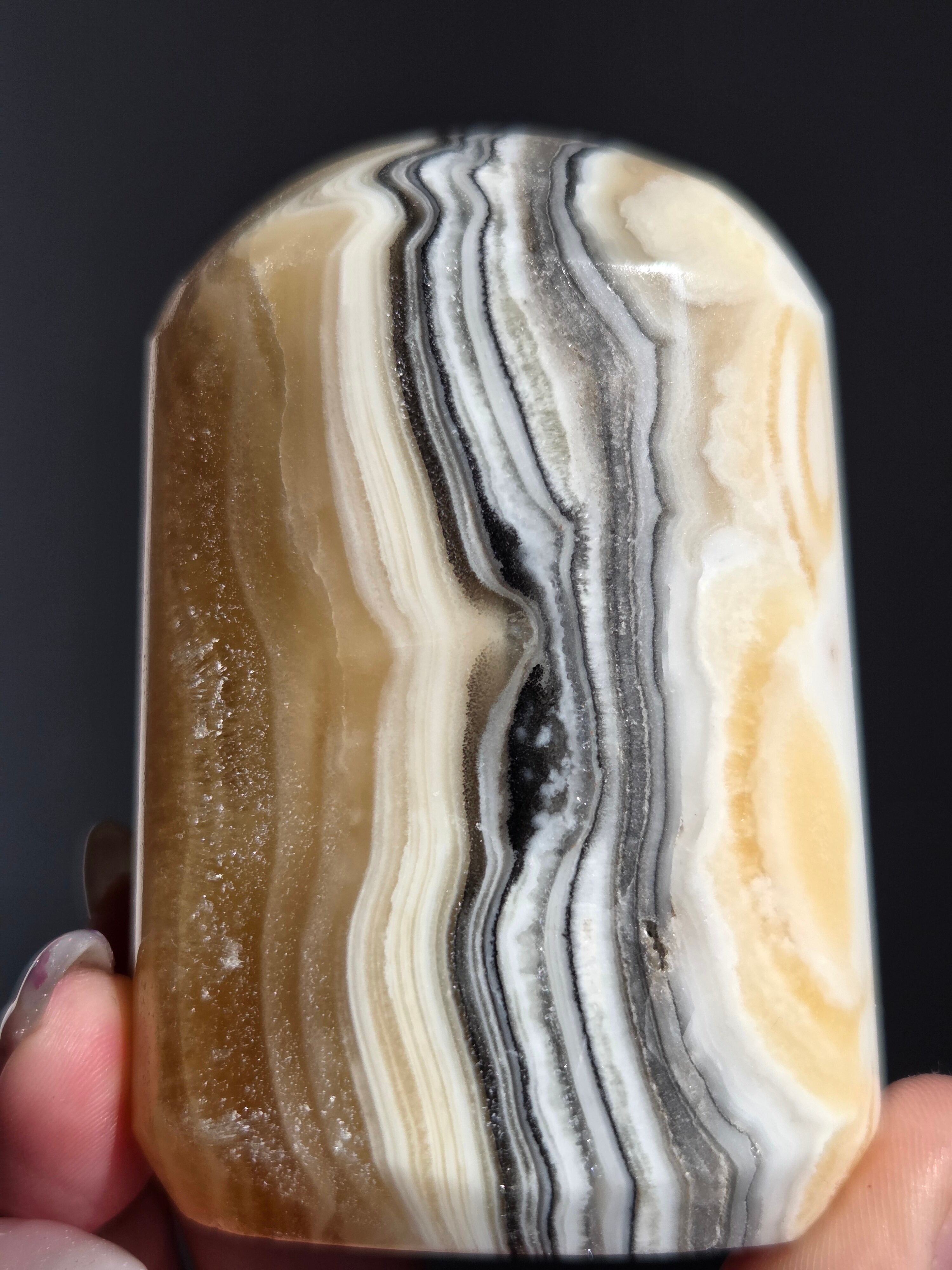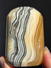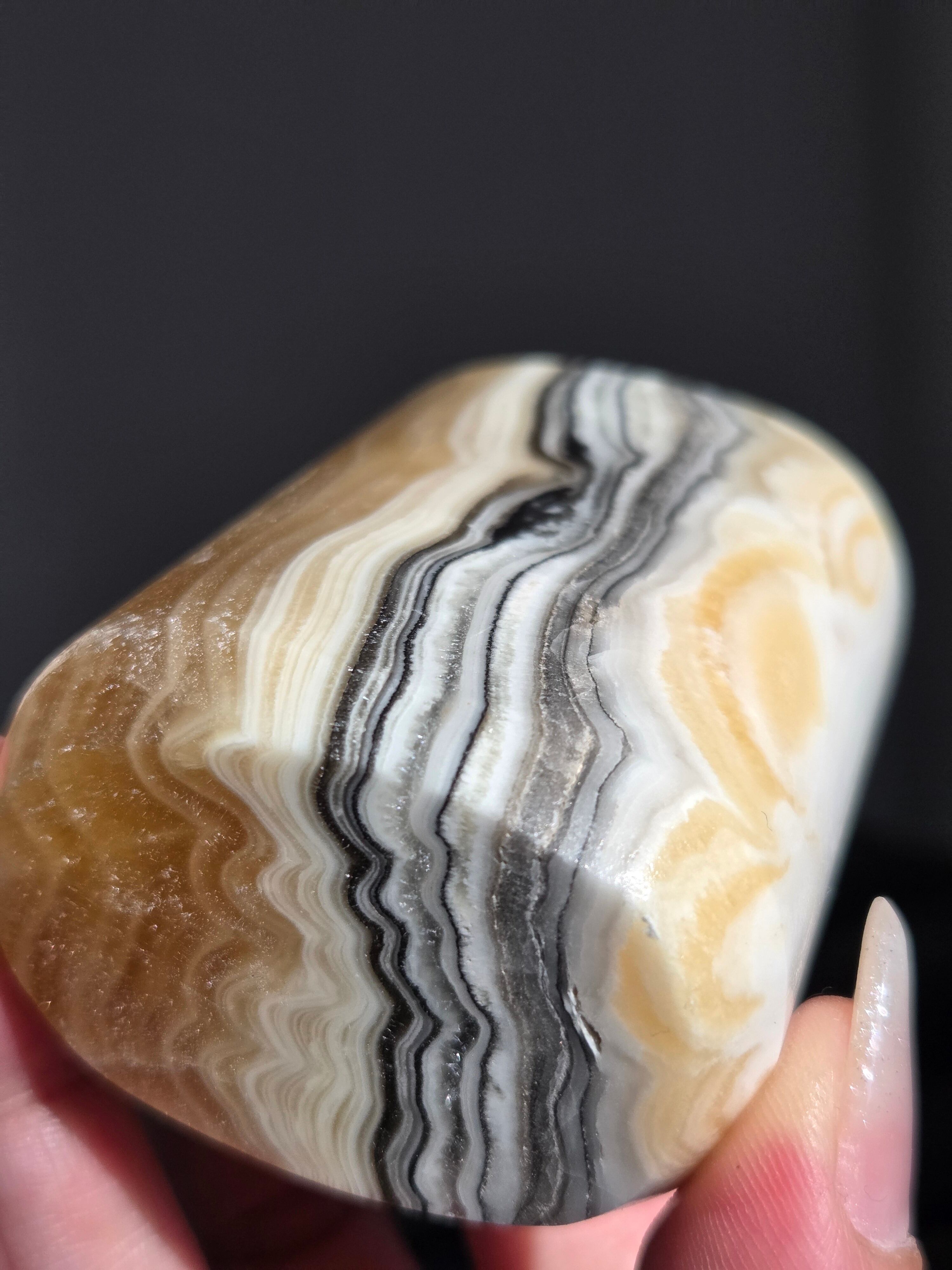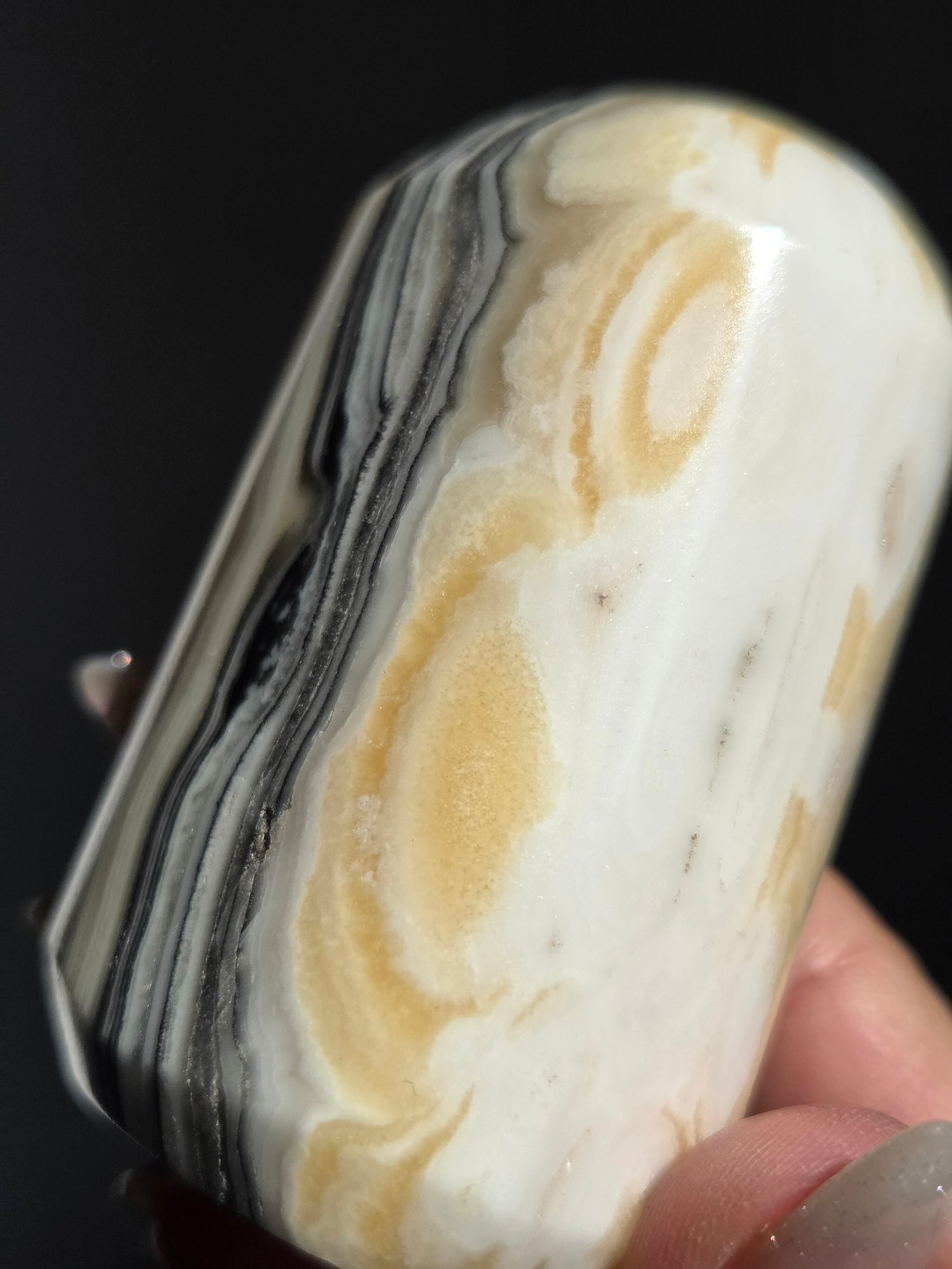 白(カルサイト)と黒(不純物)が縞模様を描く、個性的でモノトーンな表情が魅力の天然石です。