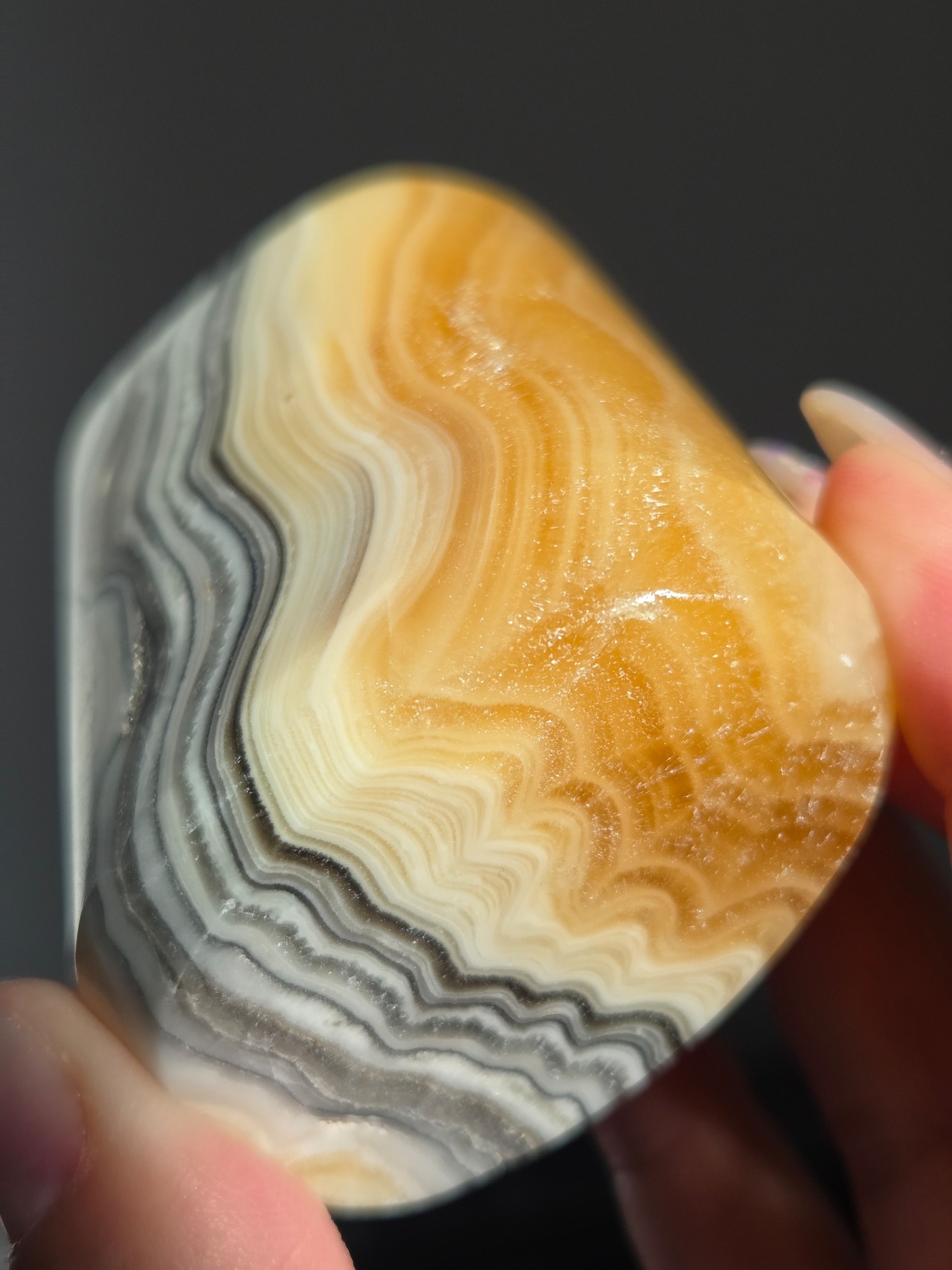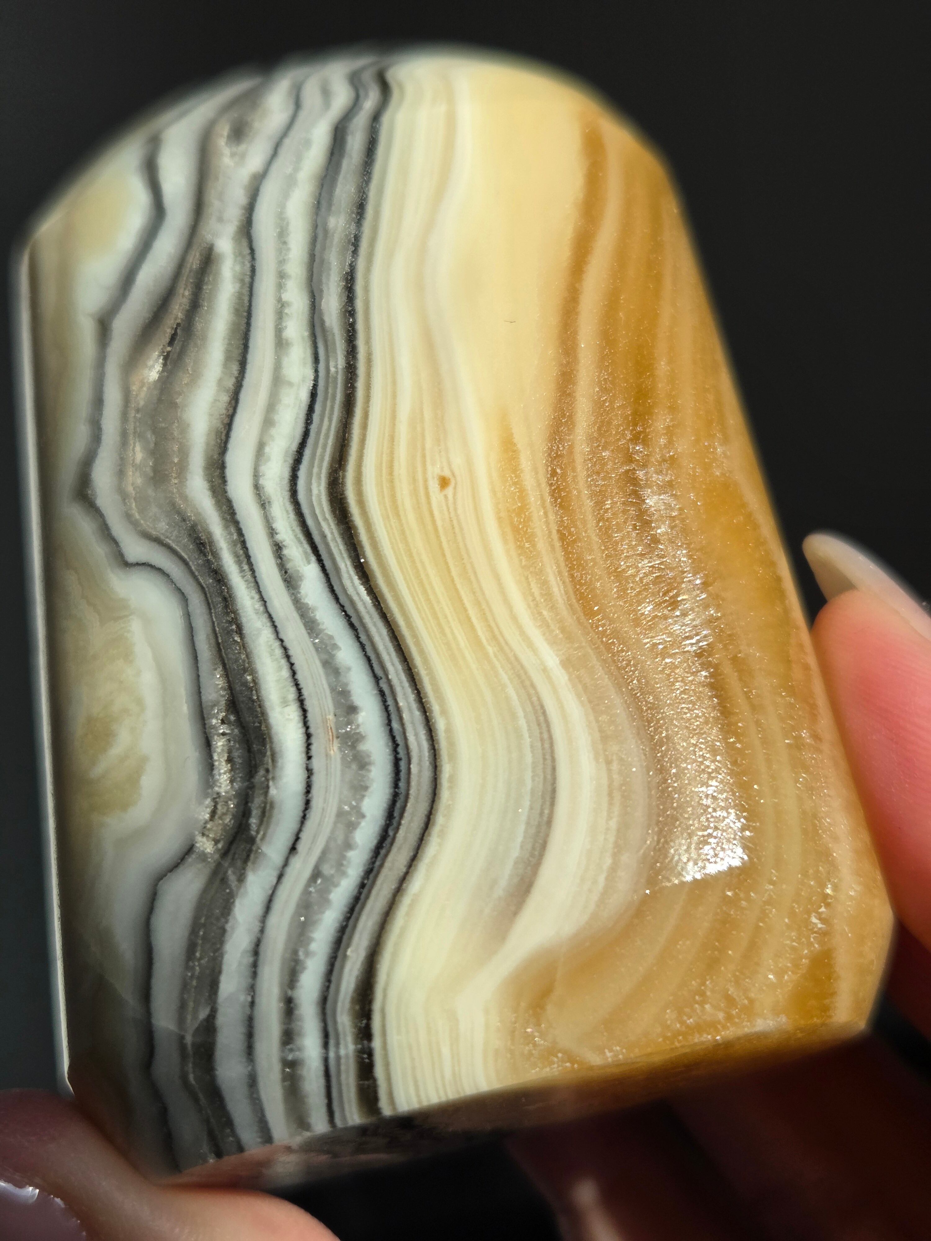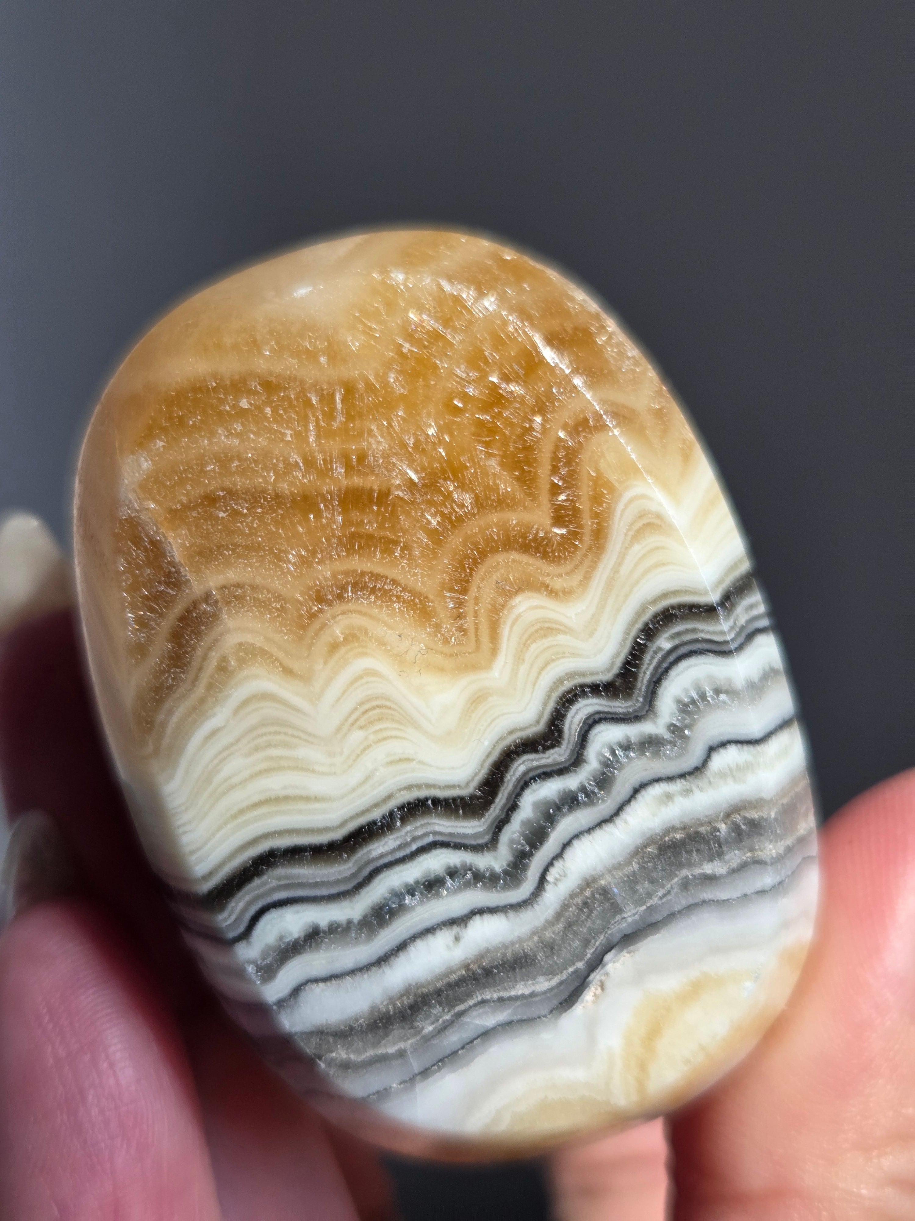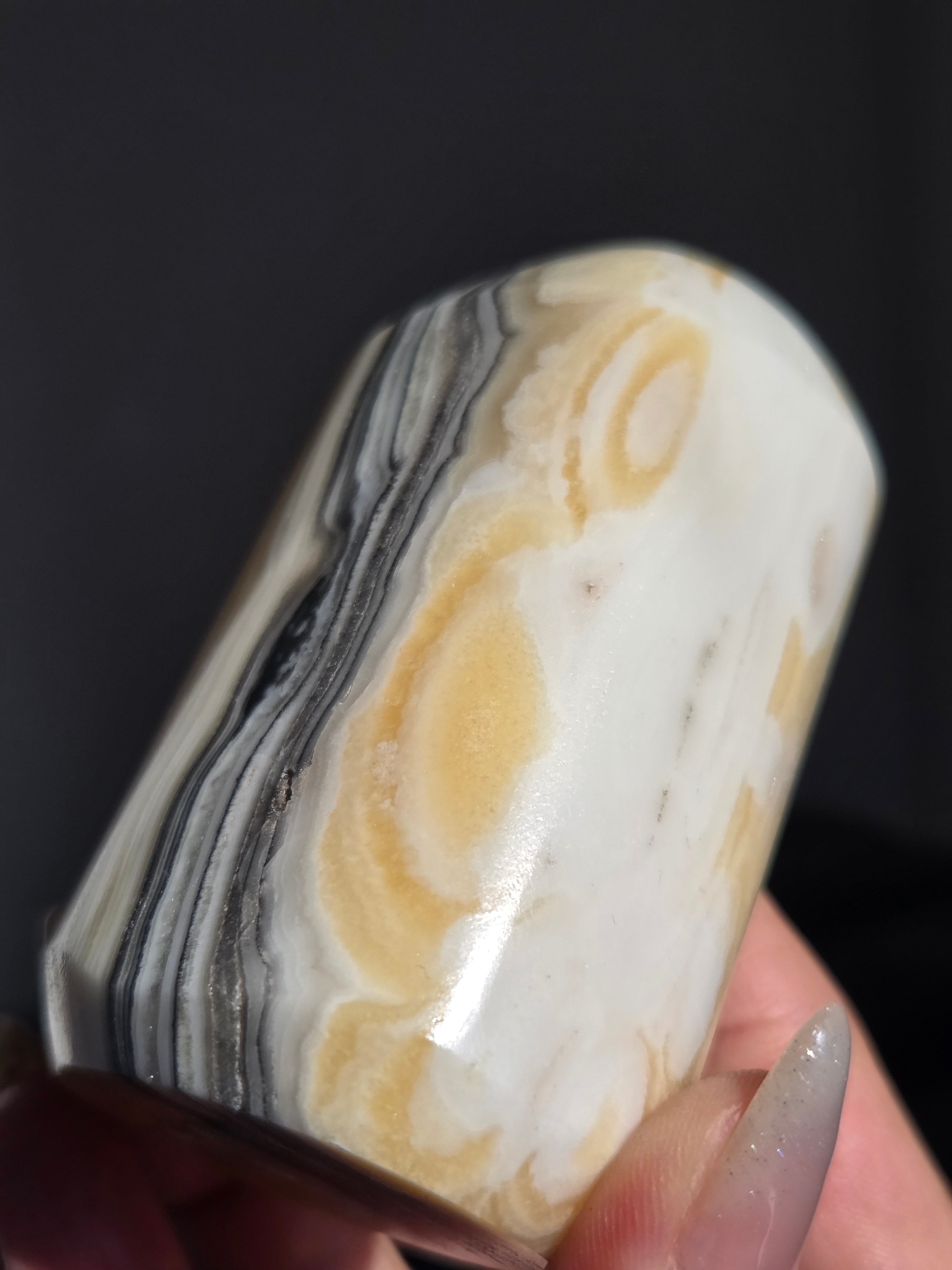 白(カルサイト)と黒(不純物)が縞模様を描く、個性的でモノトーンな表情が魅力の天然石です。
