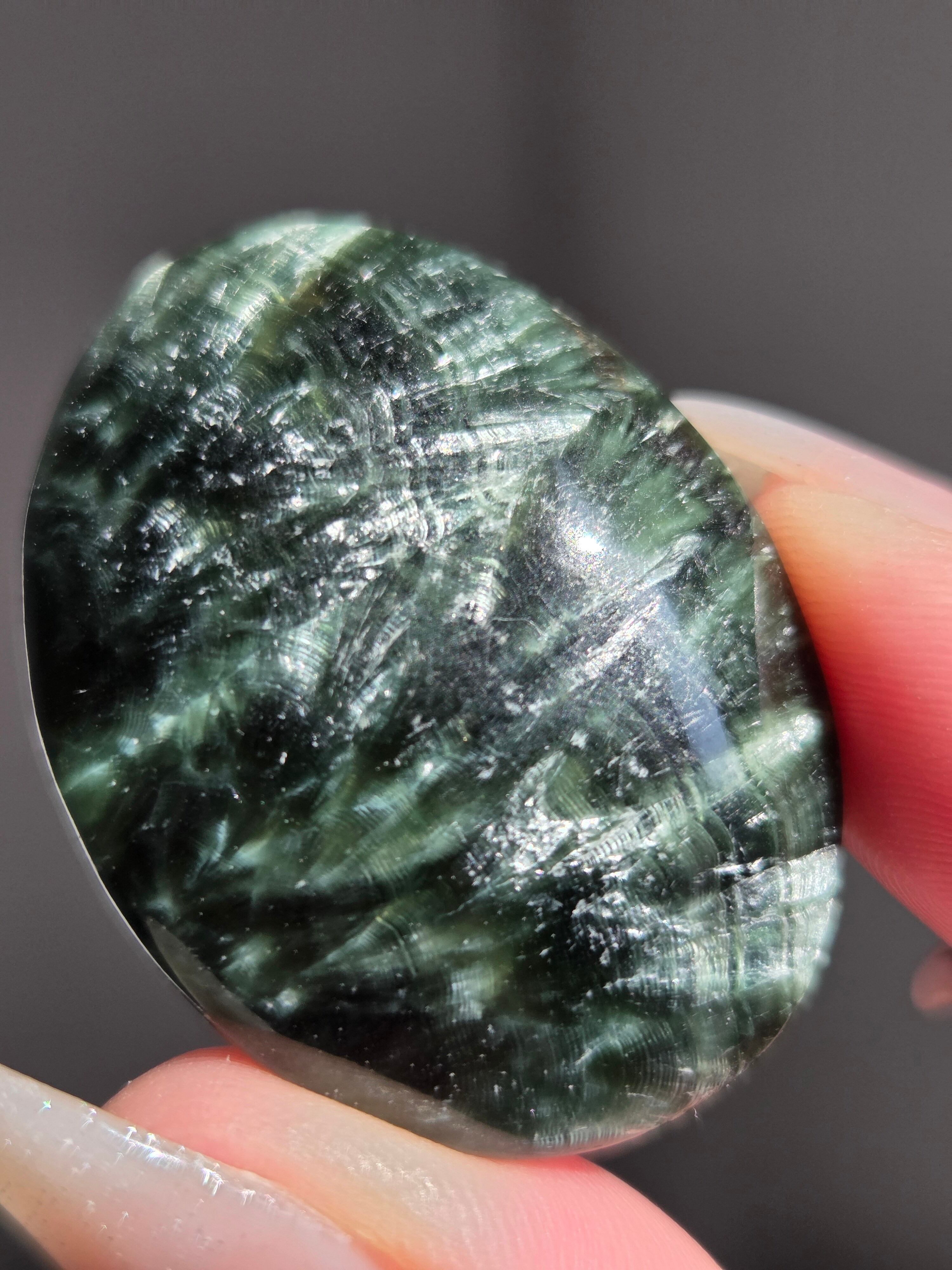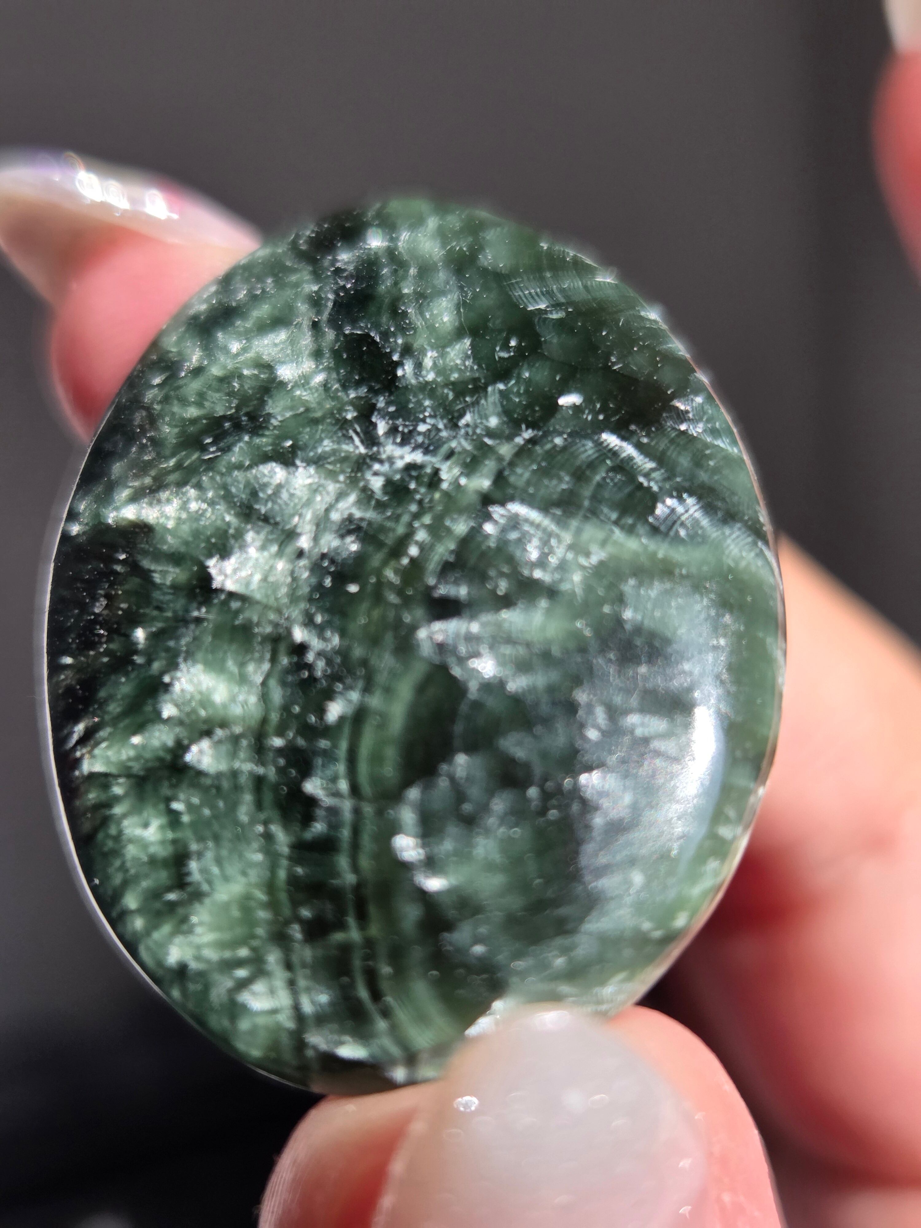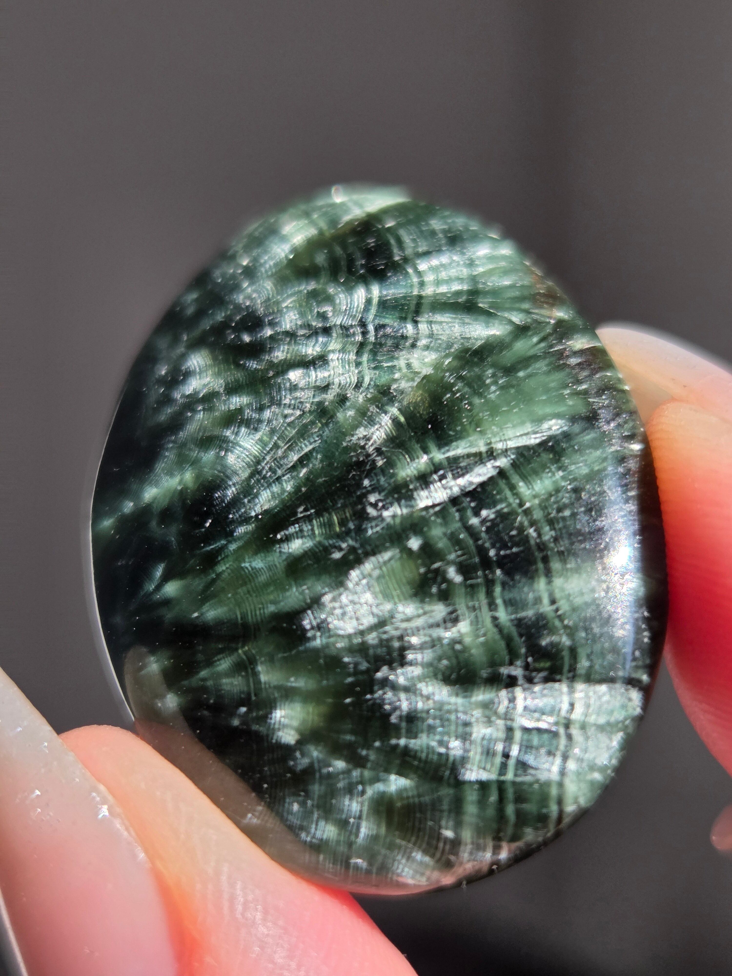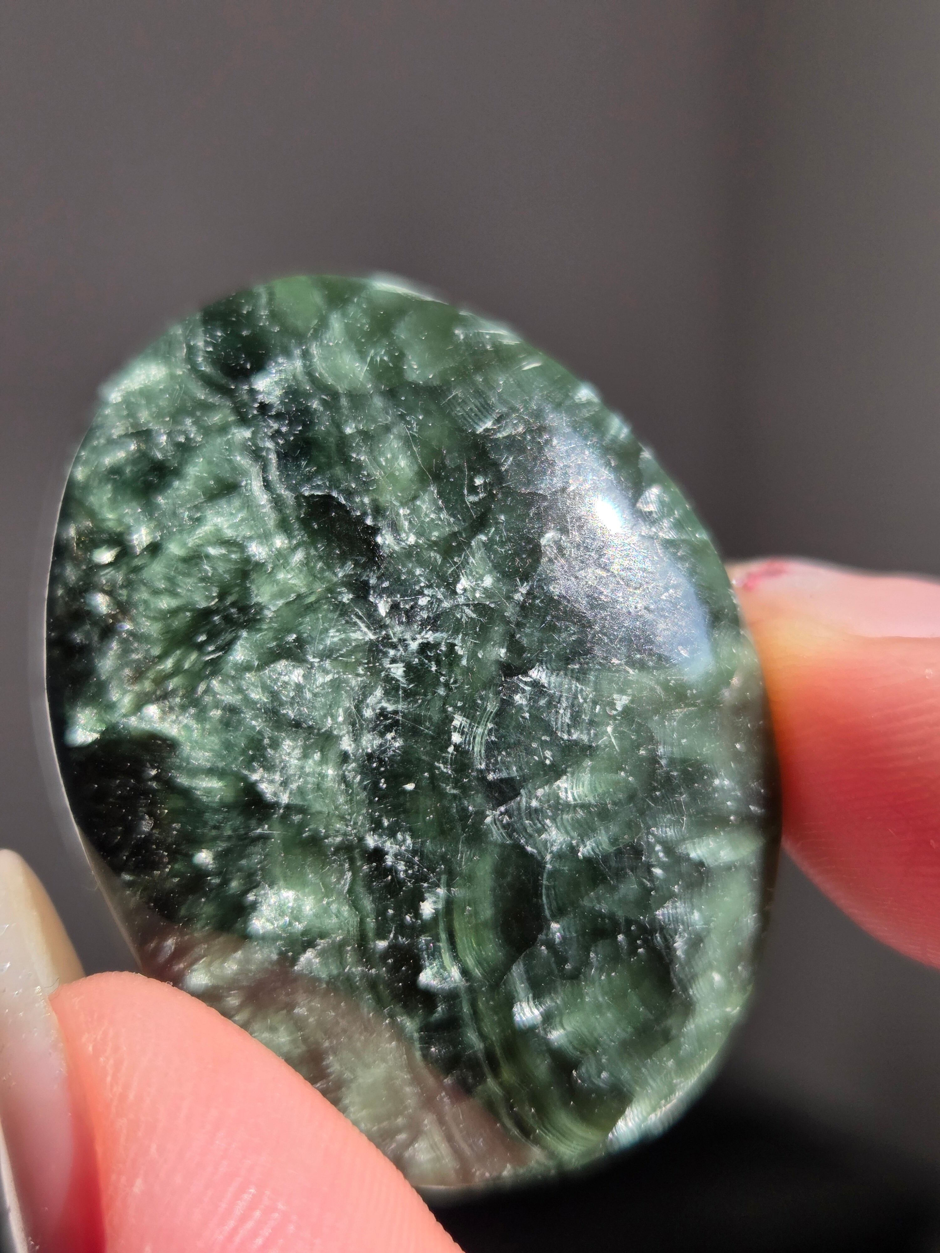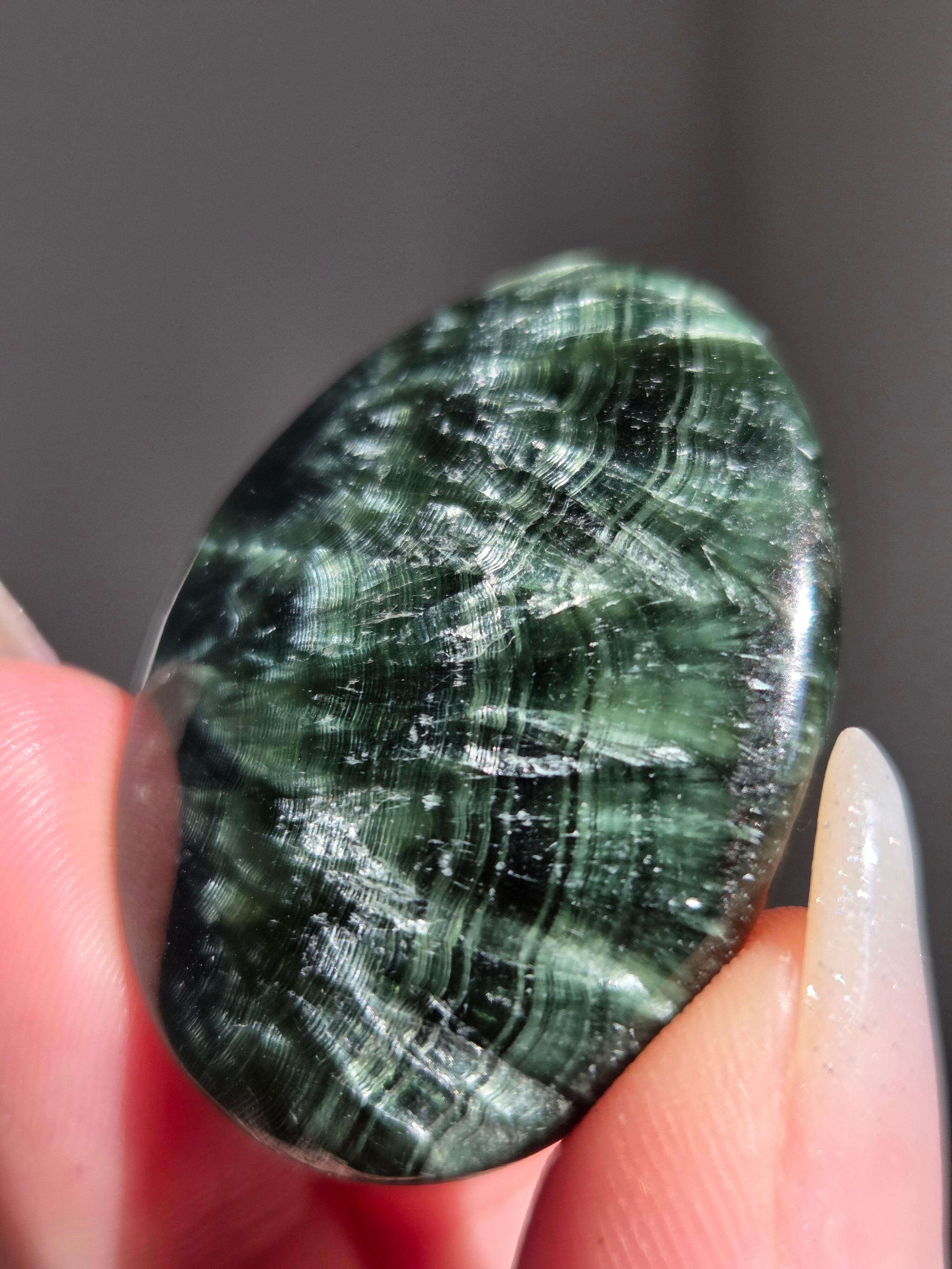 セラフィナイトは、深いグリーンに白い絹糸状の模様が浮かび、天使の羽のように見えることから名付けられた、強力な「癒やし」と「人脈・調和」のパワーを持つ天然石(クリノクロア)です。持ち主に心の静けさと深い癒やしを与えるとされ 精神的なバランスを整え、内面的な変化を促す意味を持つといわれています。