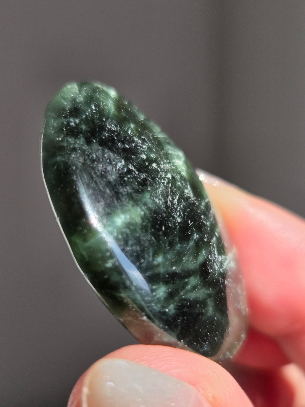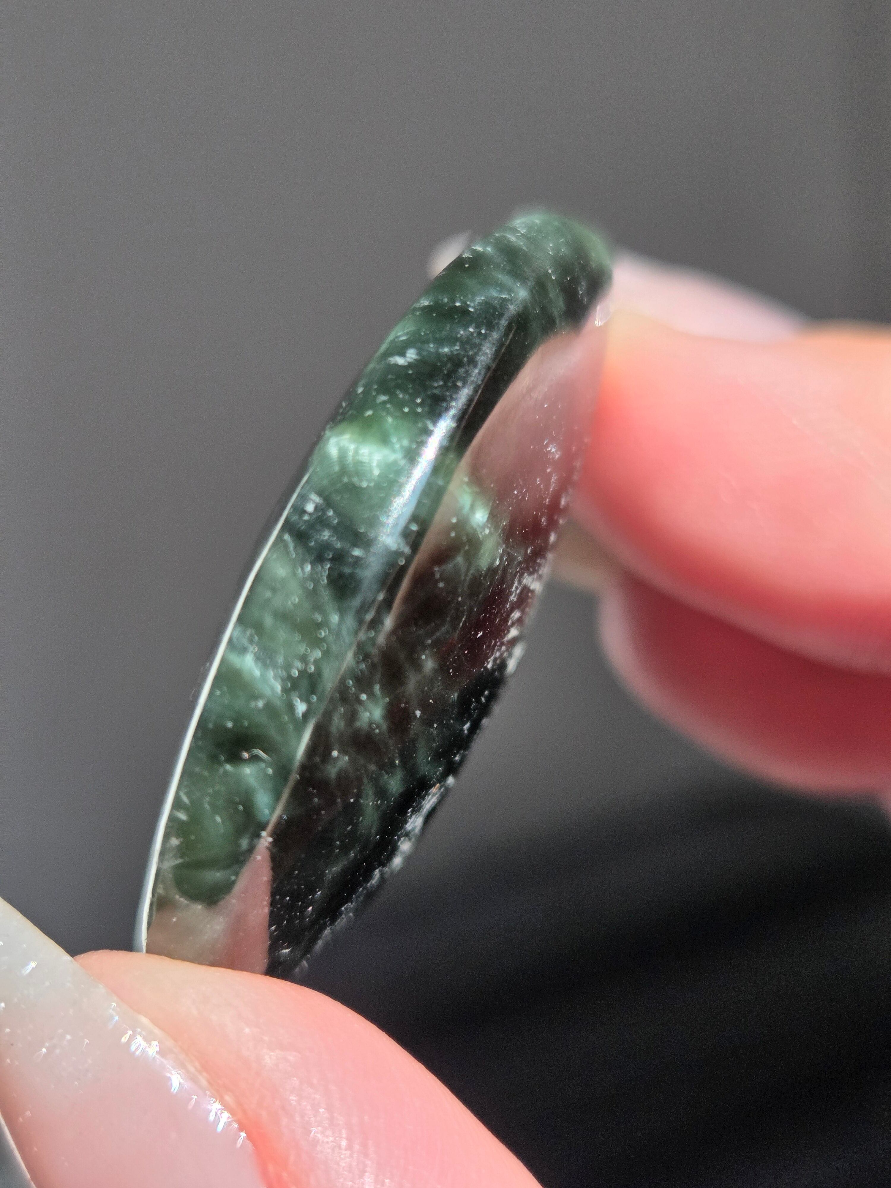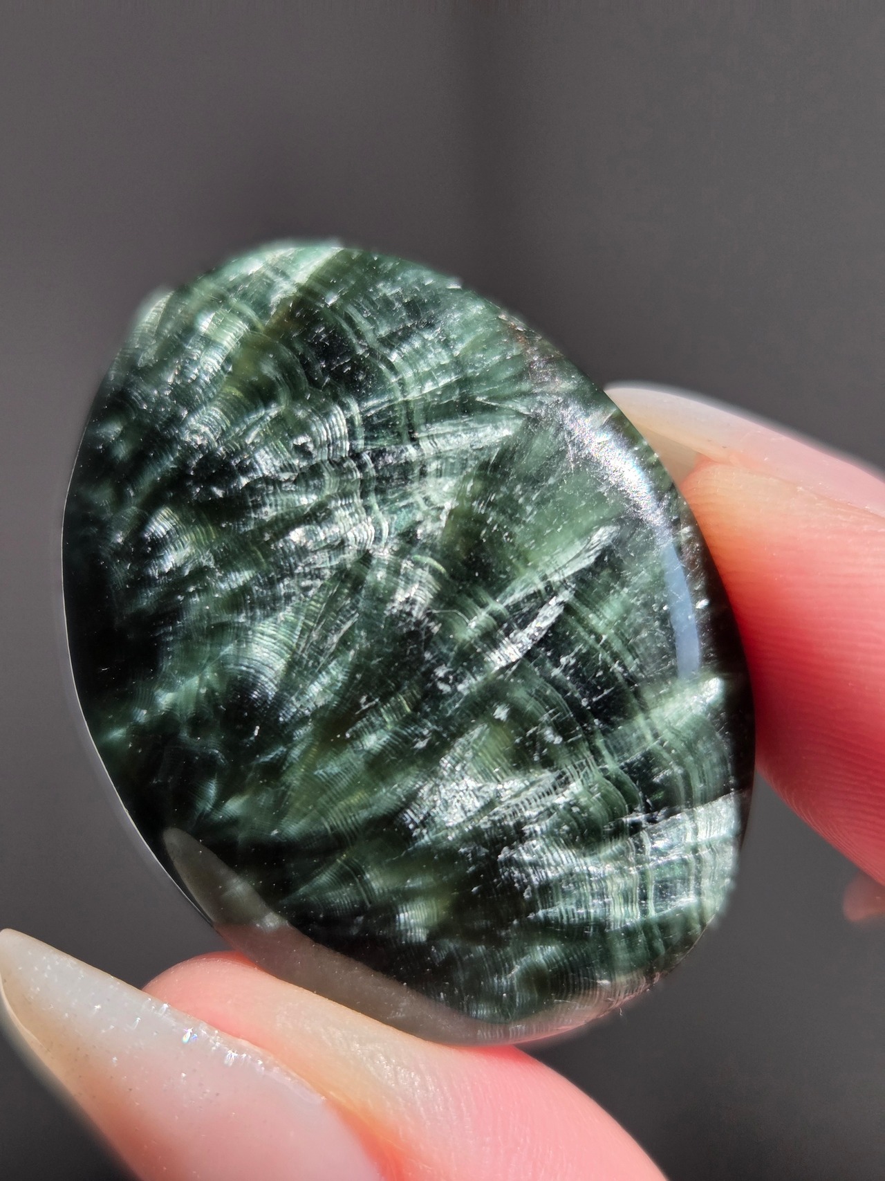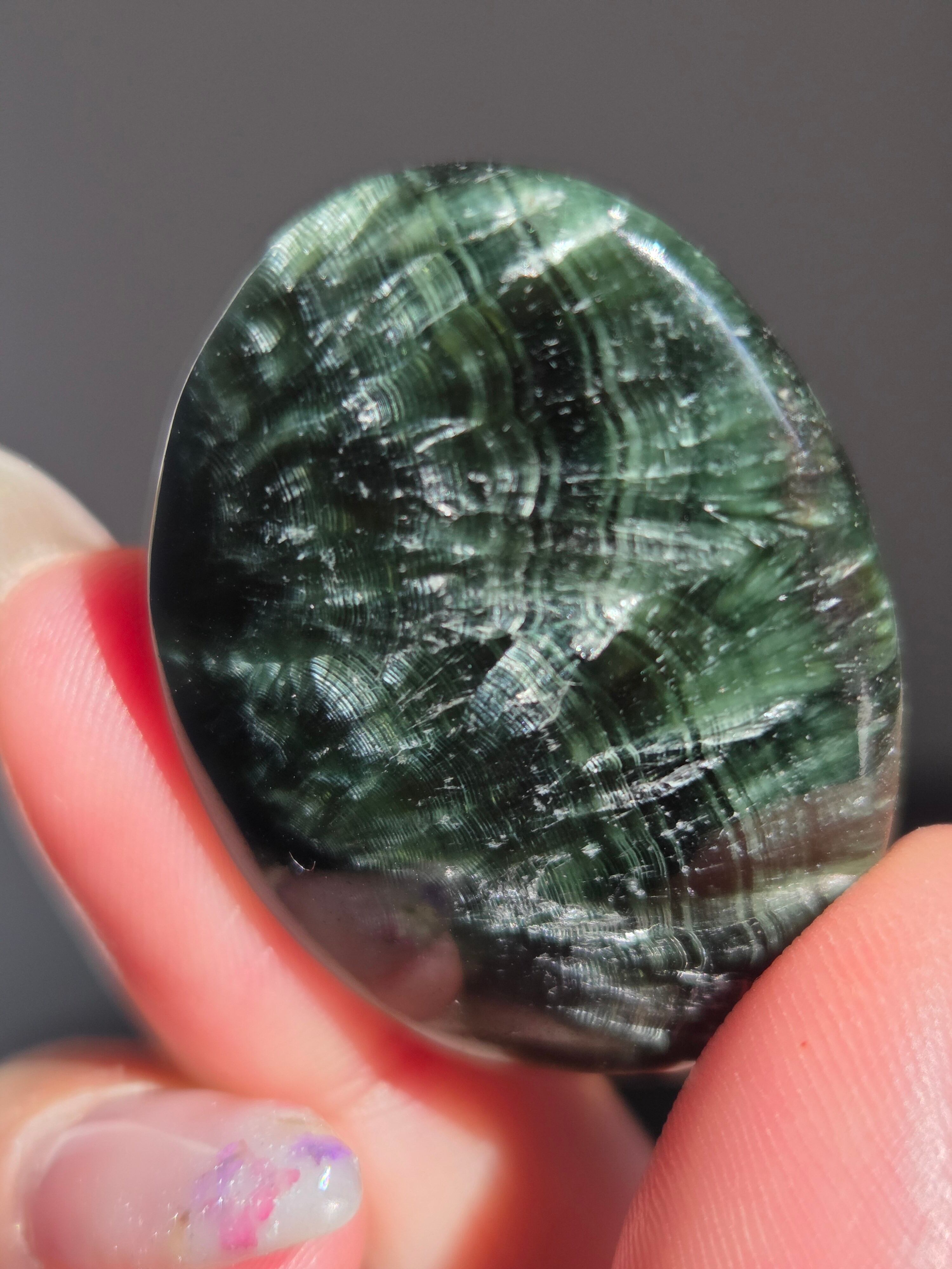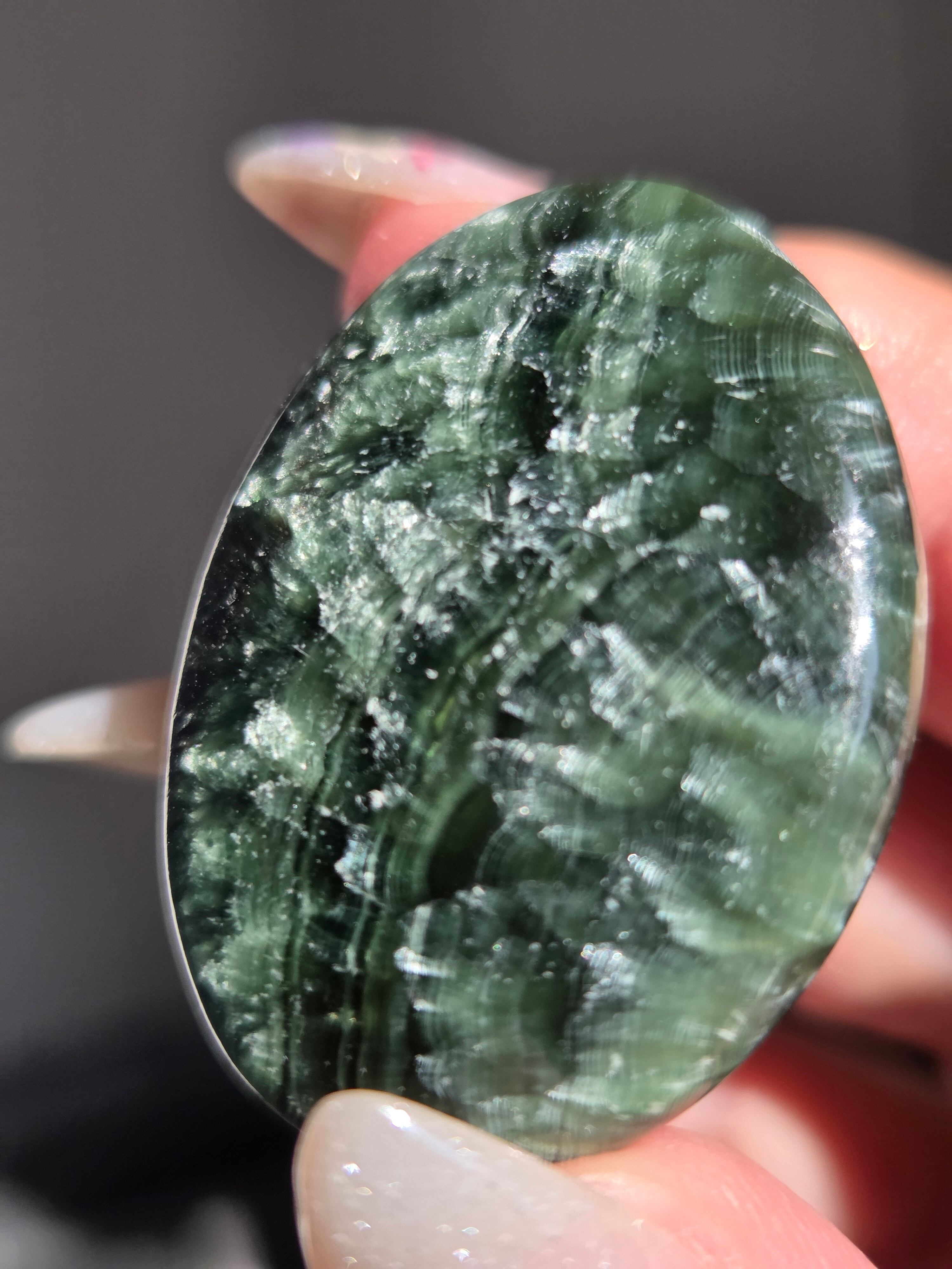 セラフィナイトは、深いグリーンに白い絹糸状の模様が浮かび、天使の羽のように見えることから名付けられた、強力な「癒やし」と「人脈・調和」のパワーを持つ天然石(クリノクロア)です。持ち主に心の静けさと深い癒やしを与えるとされ 精神的なバランスを整え、内面的な変化を促す意味を持つといわれています。