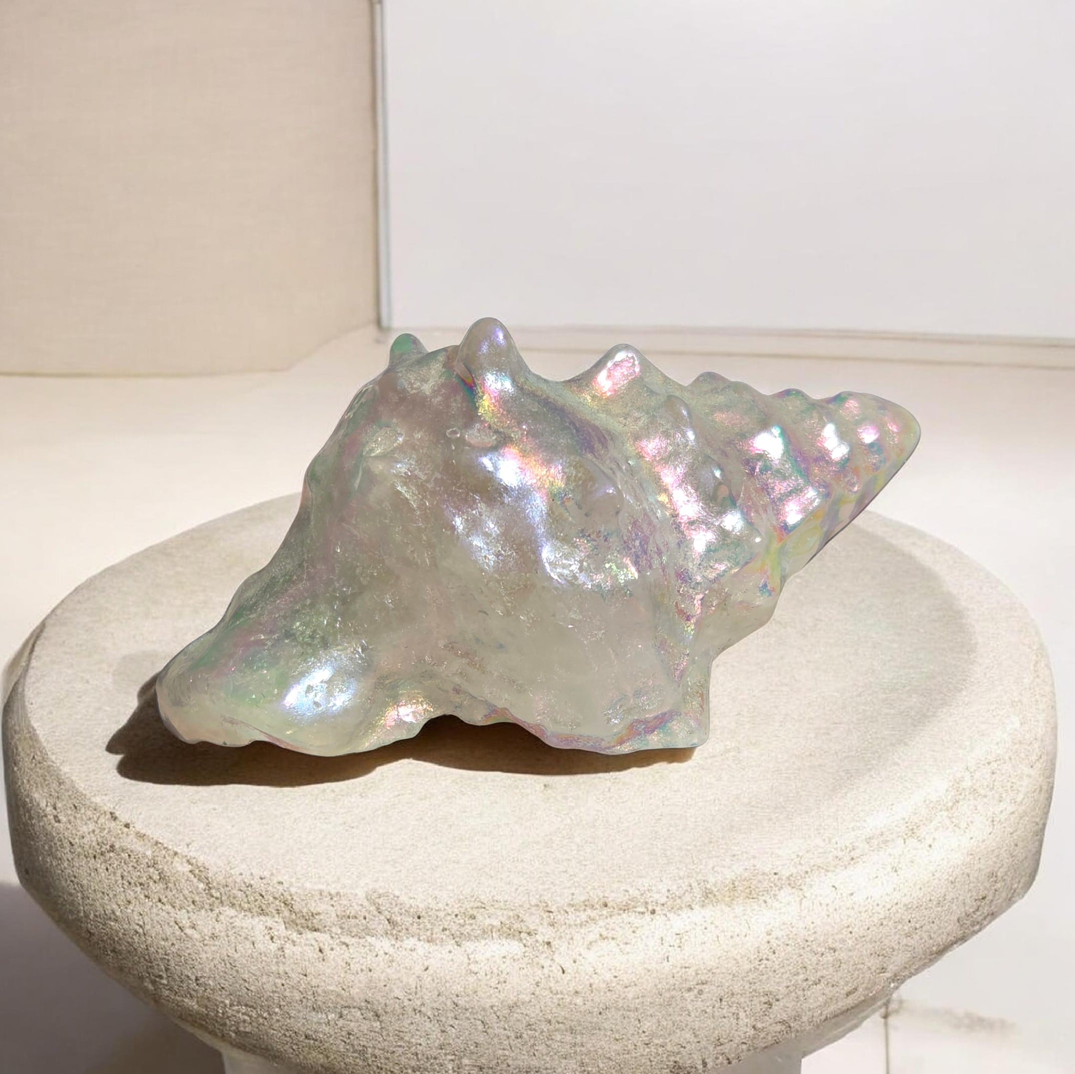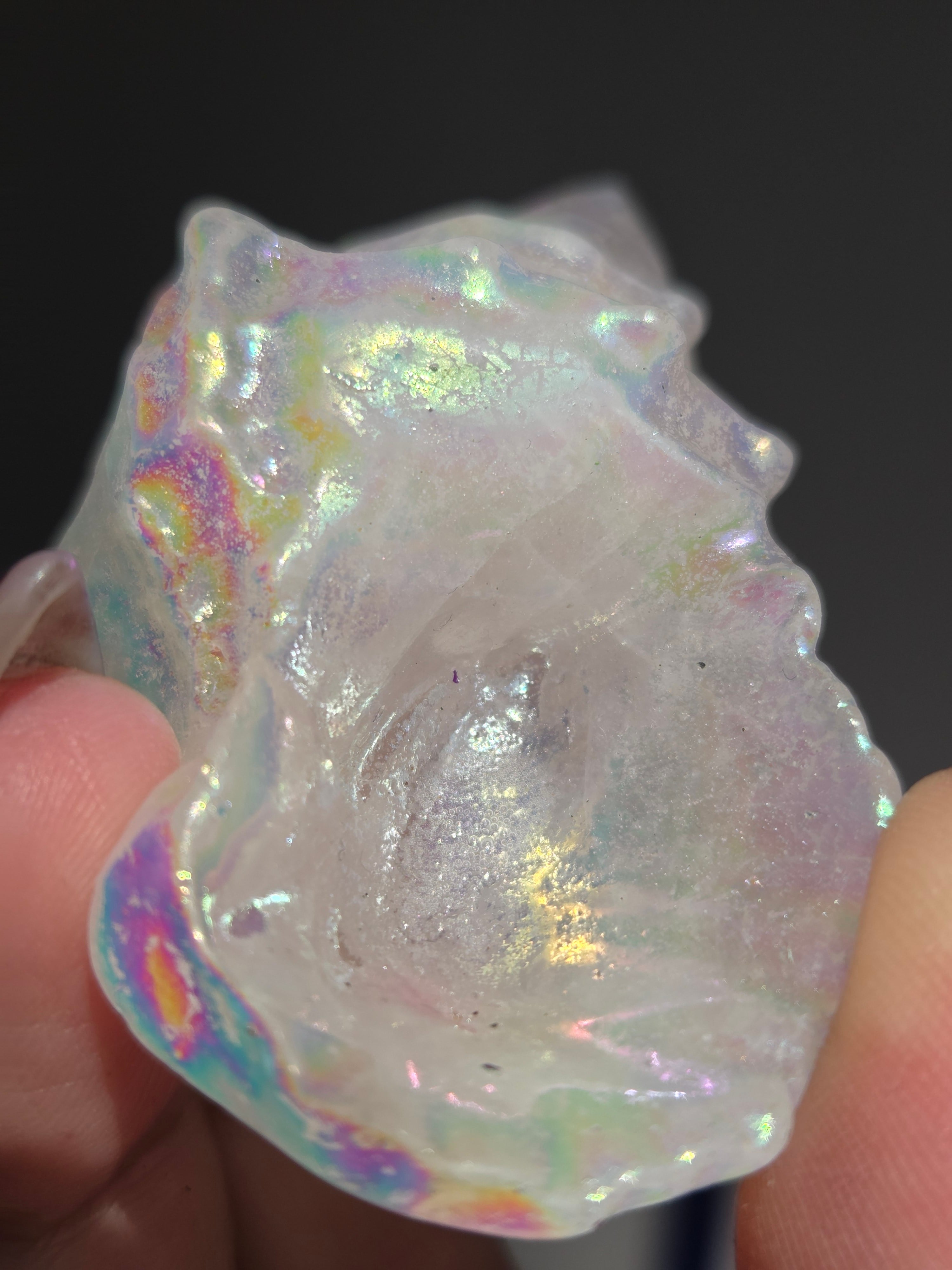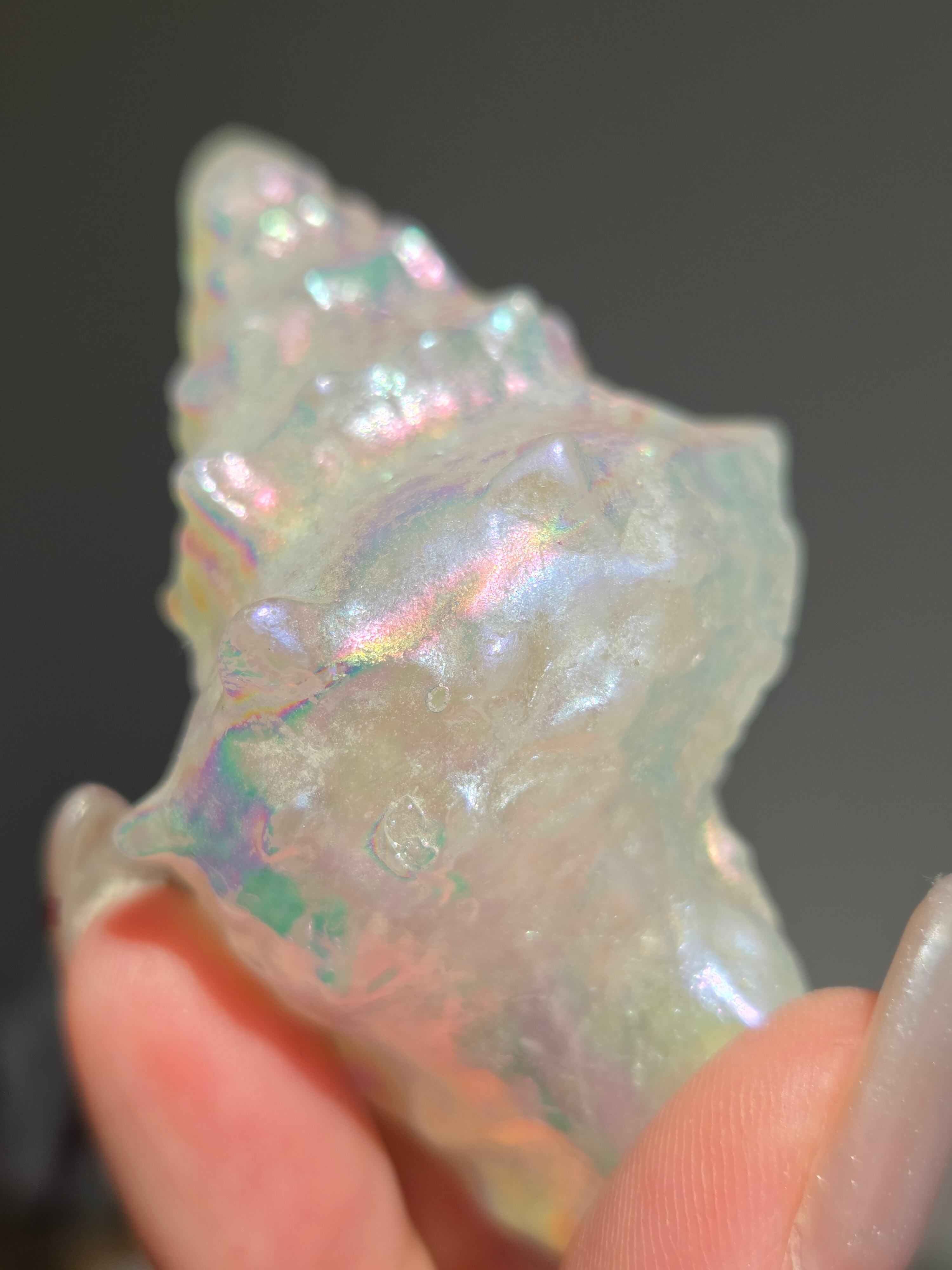 ローズクォーツにオーラ加工を施し、貝殻形にカービングされています。