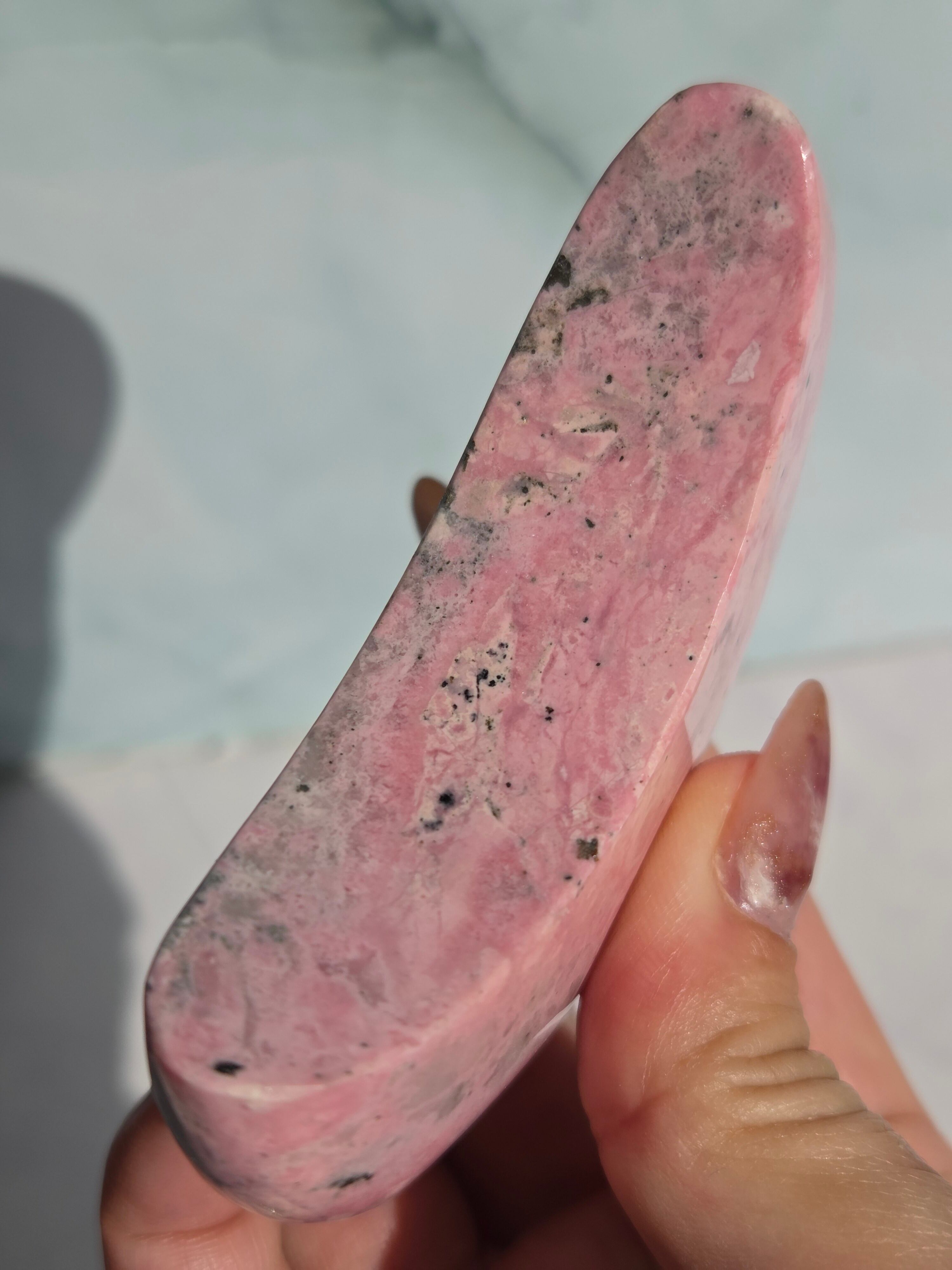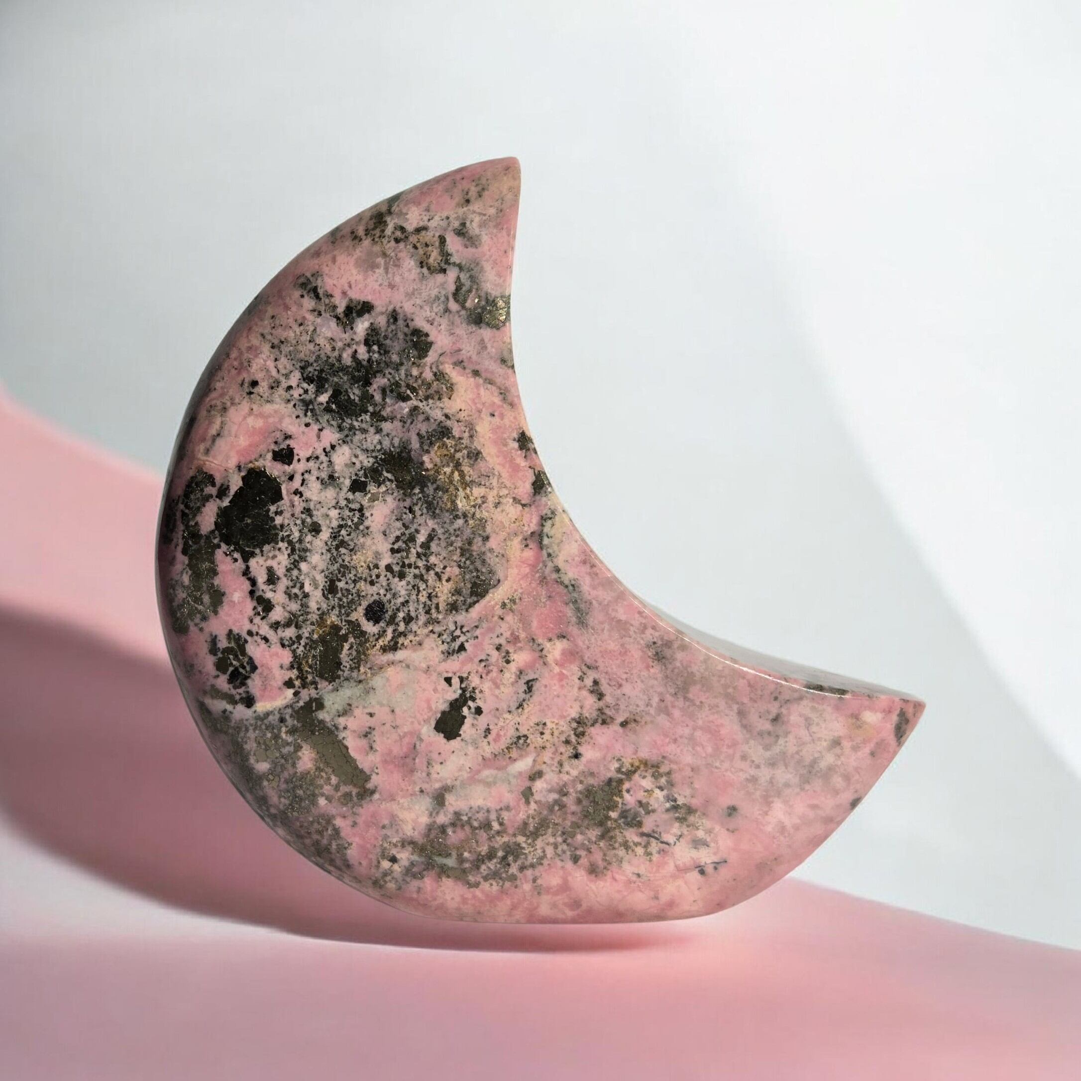 苺ミルクのような色合いがとても可愛い、月形のオブジェです。自立してそのままインテリア出来るようカービングしてます。