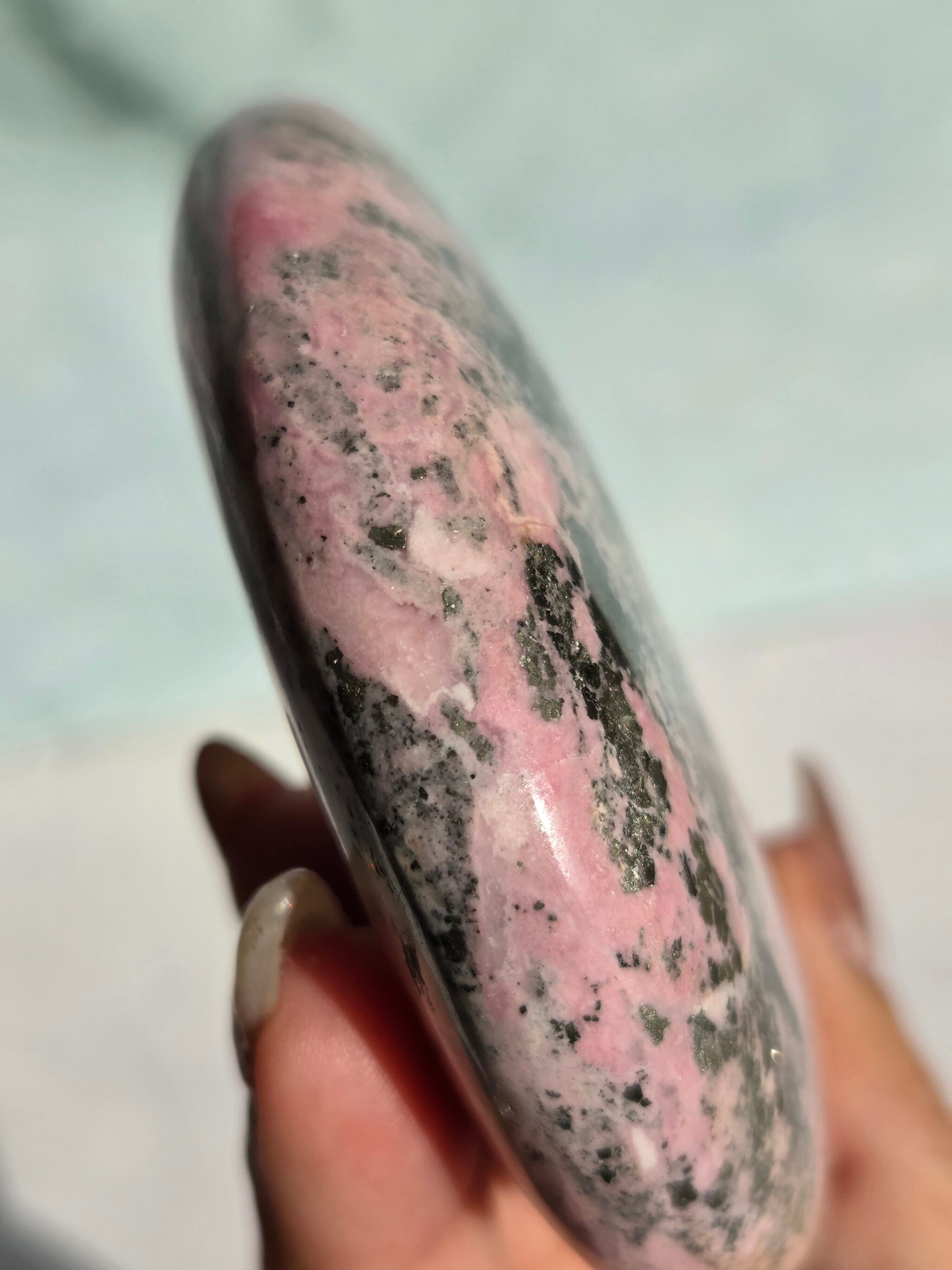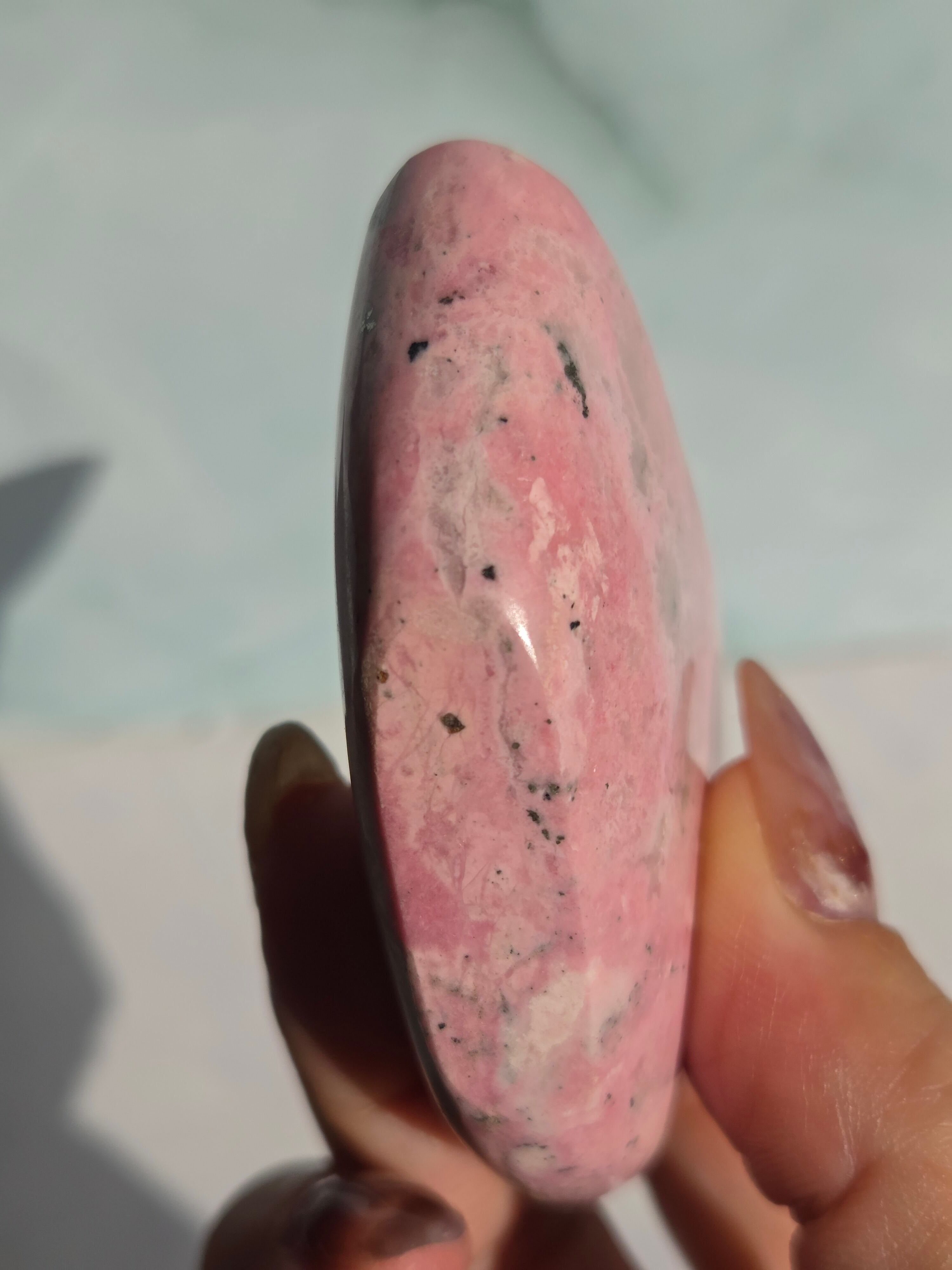 ロードナイト(和名:バラ輝石)は、ギリシャ語の「バラ(rhodon)」に由来する、ピンク〜赤色に黒い模様が入るマンガン系のケイ酸塩鉱物です。愛情や友情、癒やしを象徴するパワーストーンとして親しまれ、心身のバランスを整え、対人関係を円滑にする効果があると言われています。またその優しい色合いから「持ち主に自信を与え、愛に対して心を開く」効果があるとされ、日常的なお守りとして非常に人気があります。
