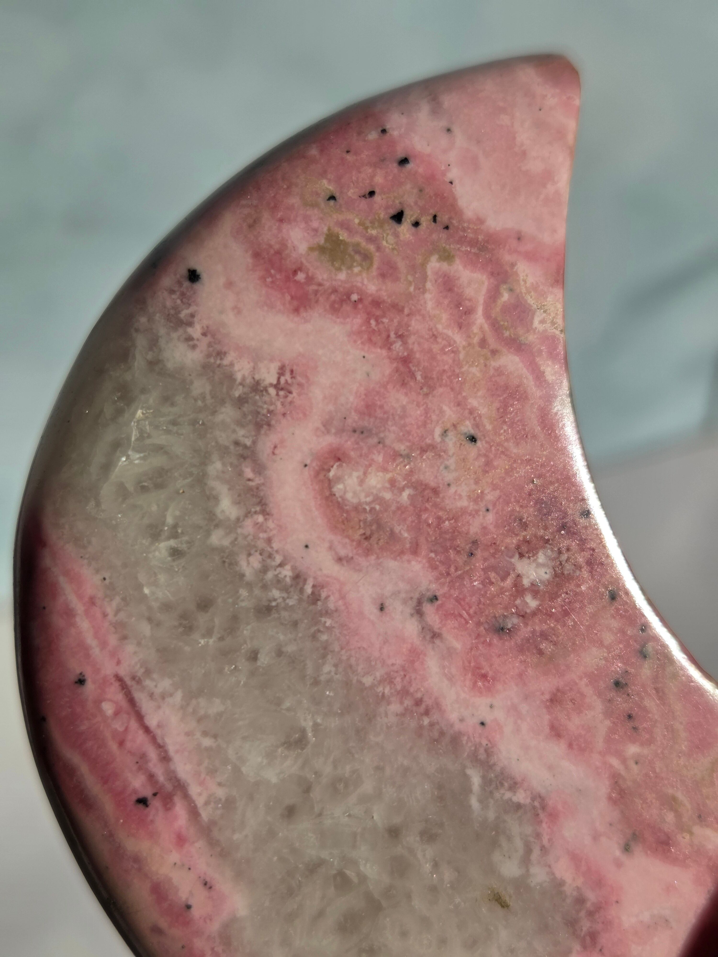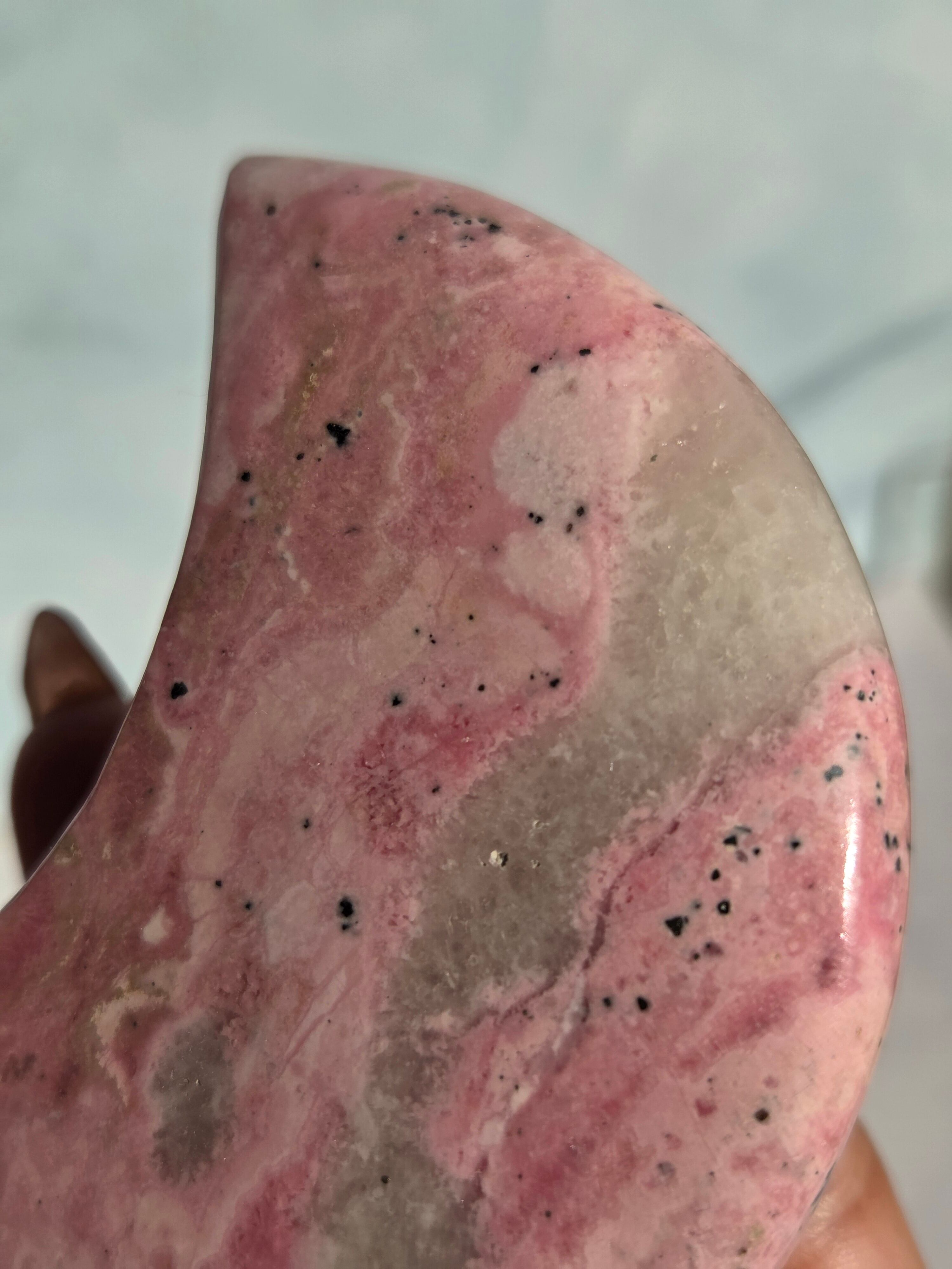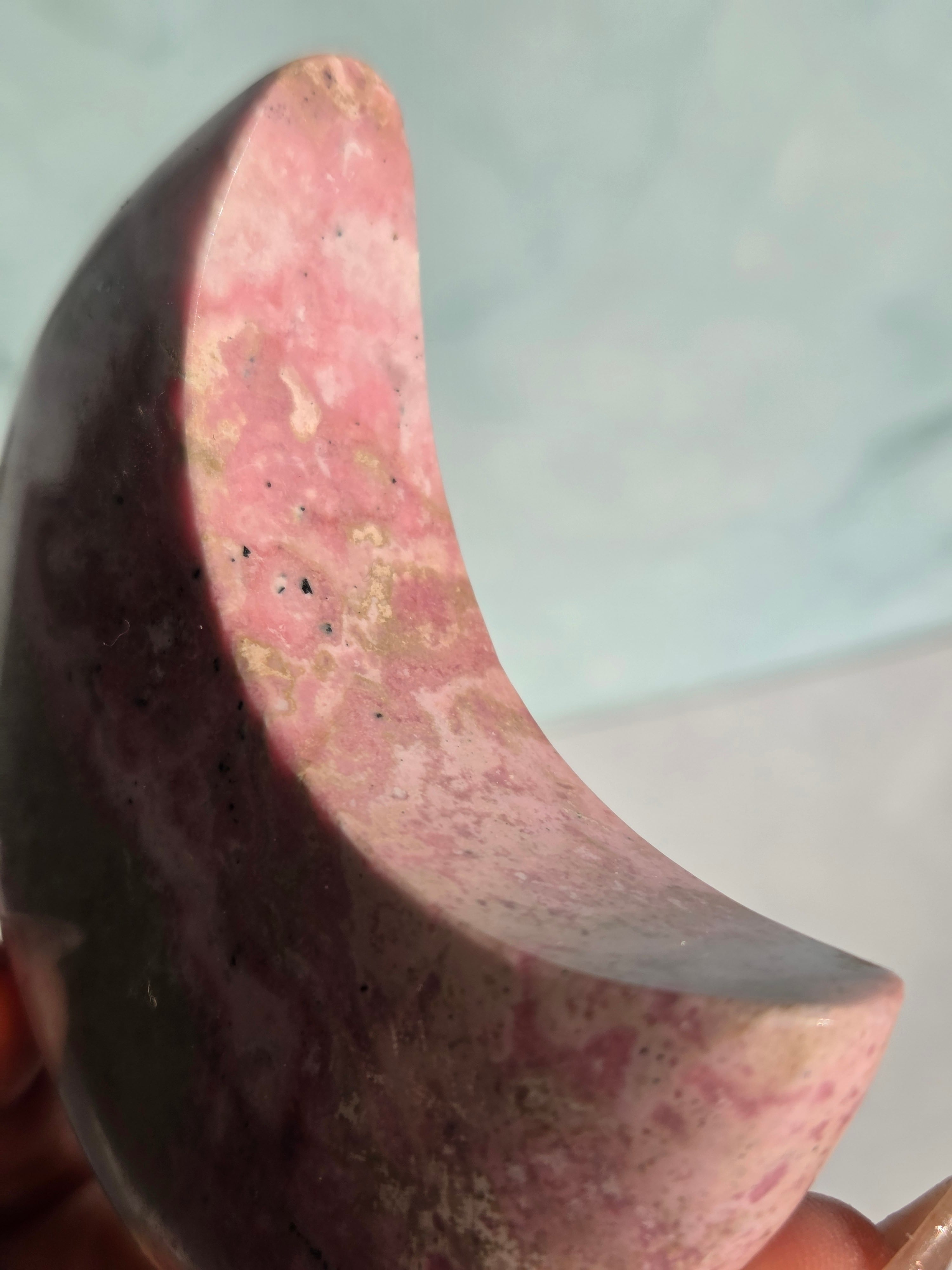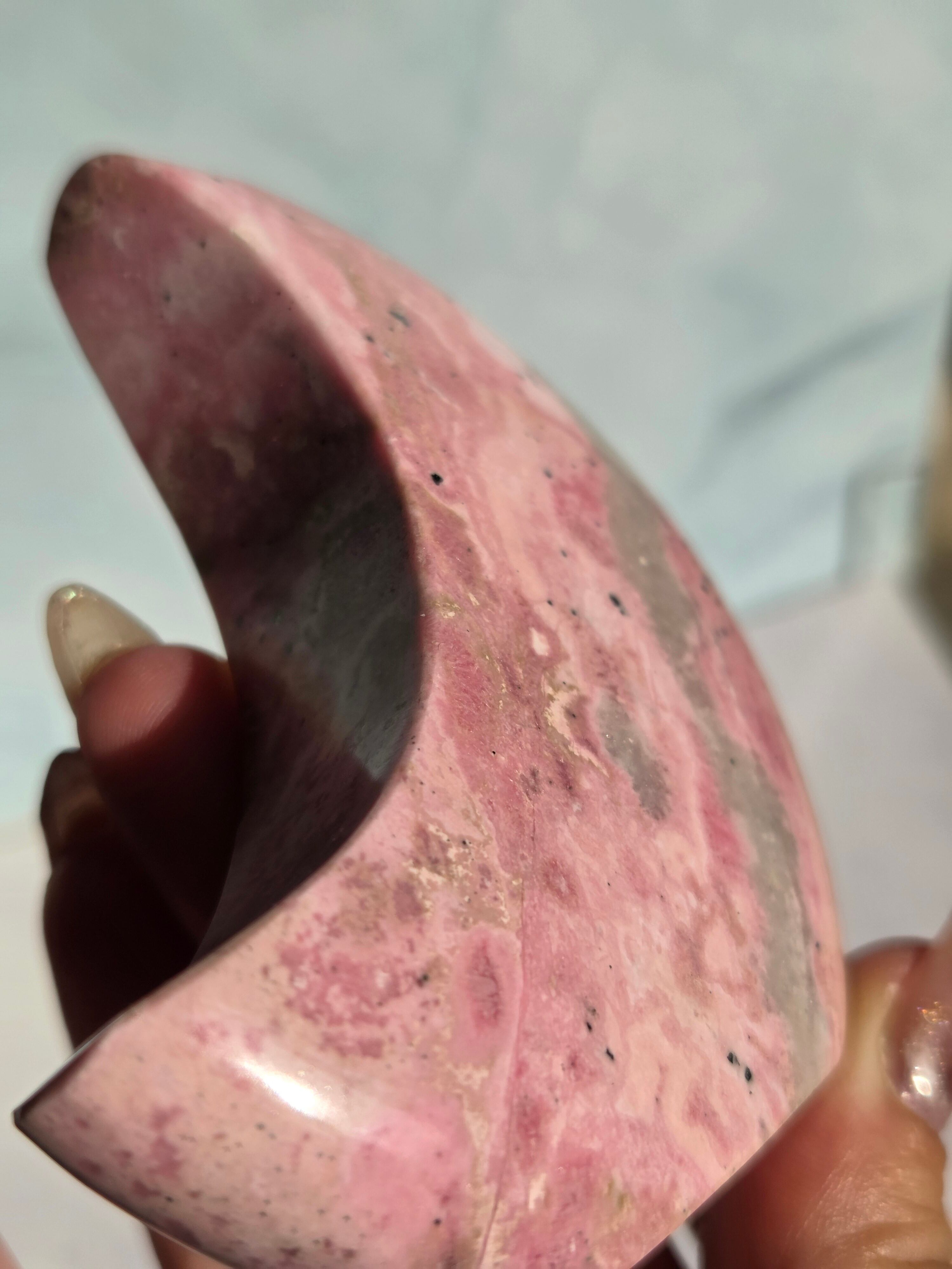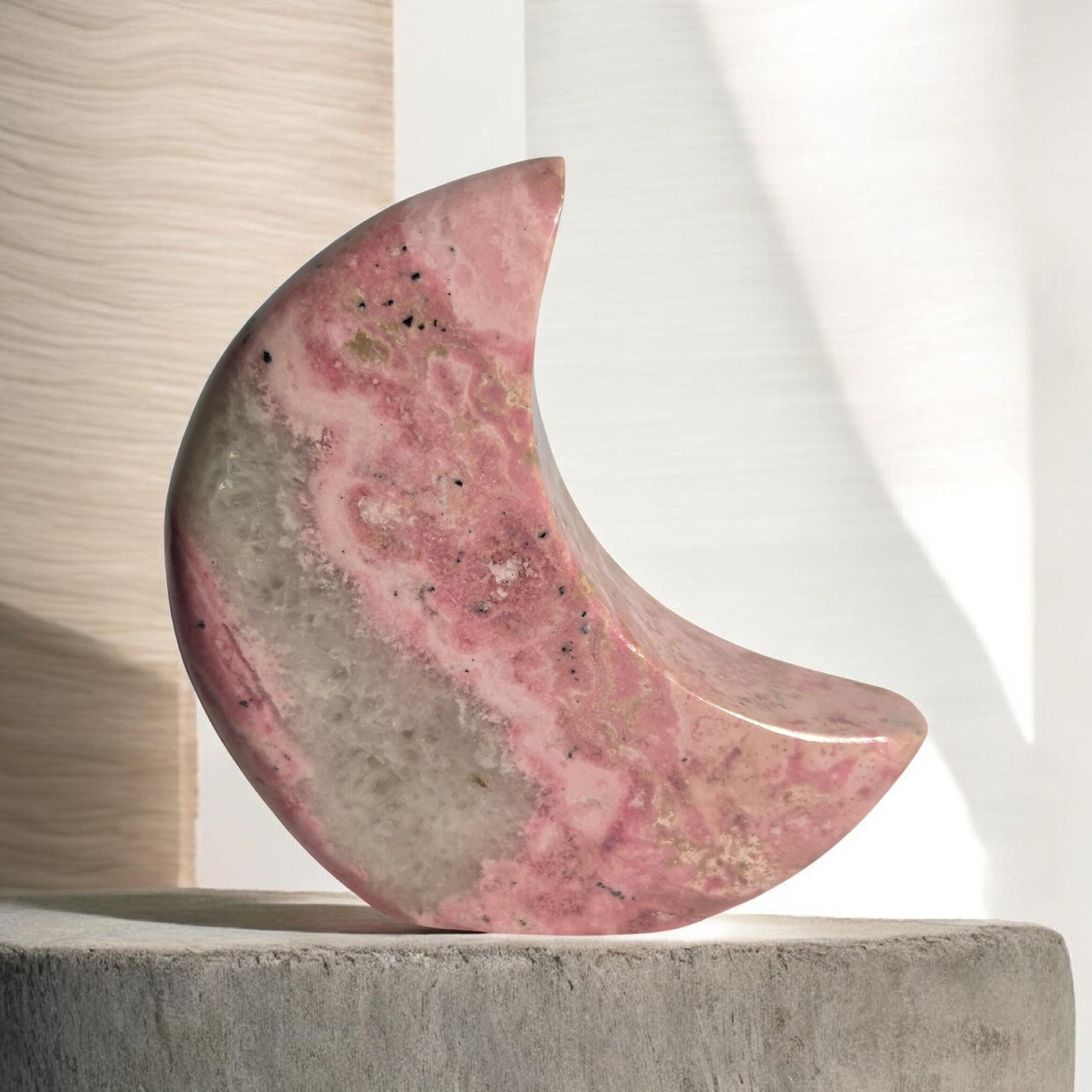 苺ミルクのような色合いがとても可愛い、月形のオブジェです。自立してそのままインテリア出来るようカービングしてます。